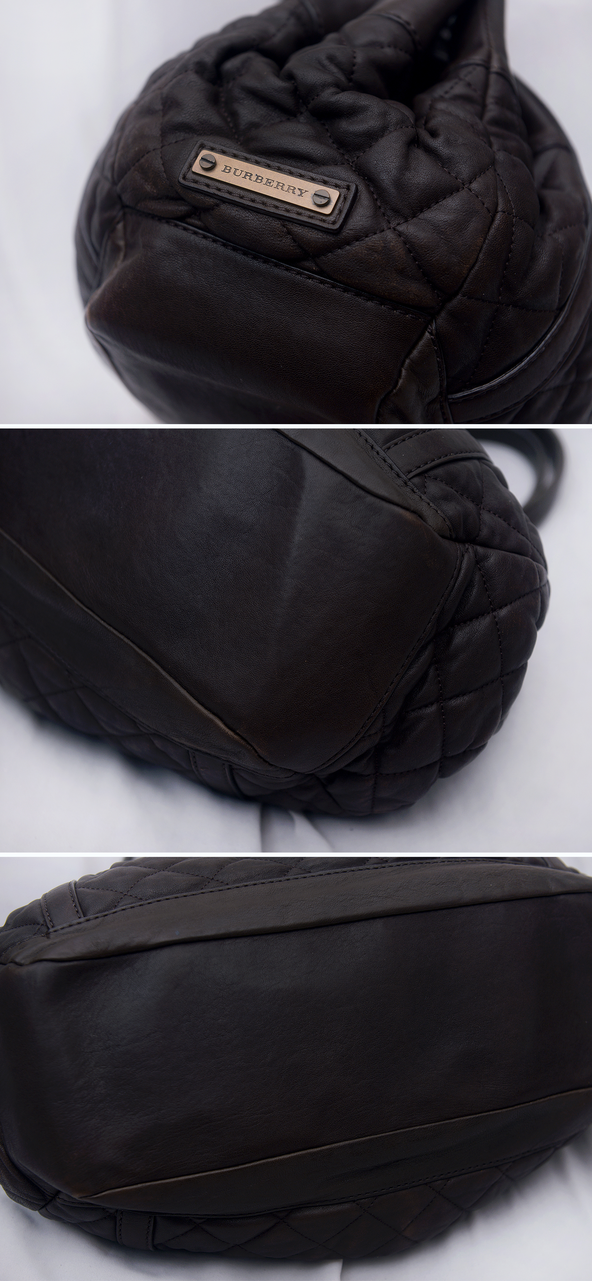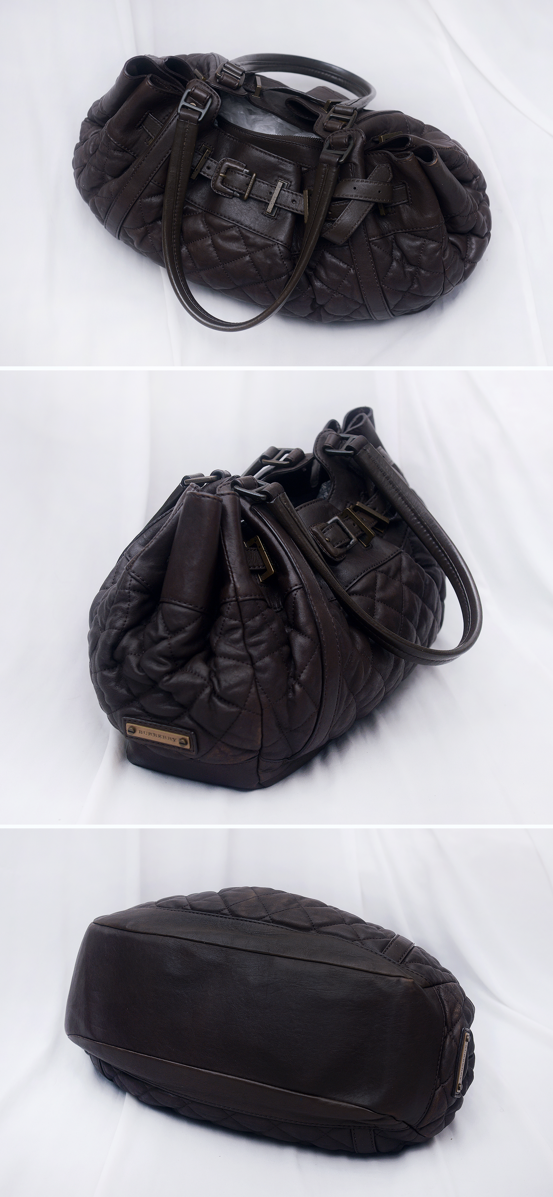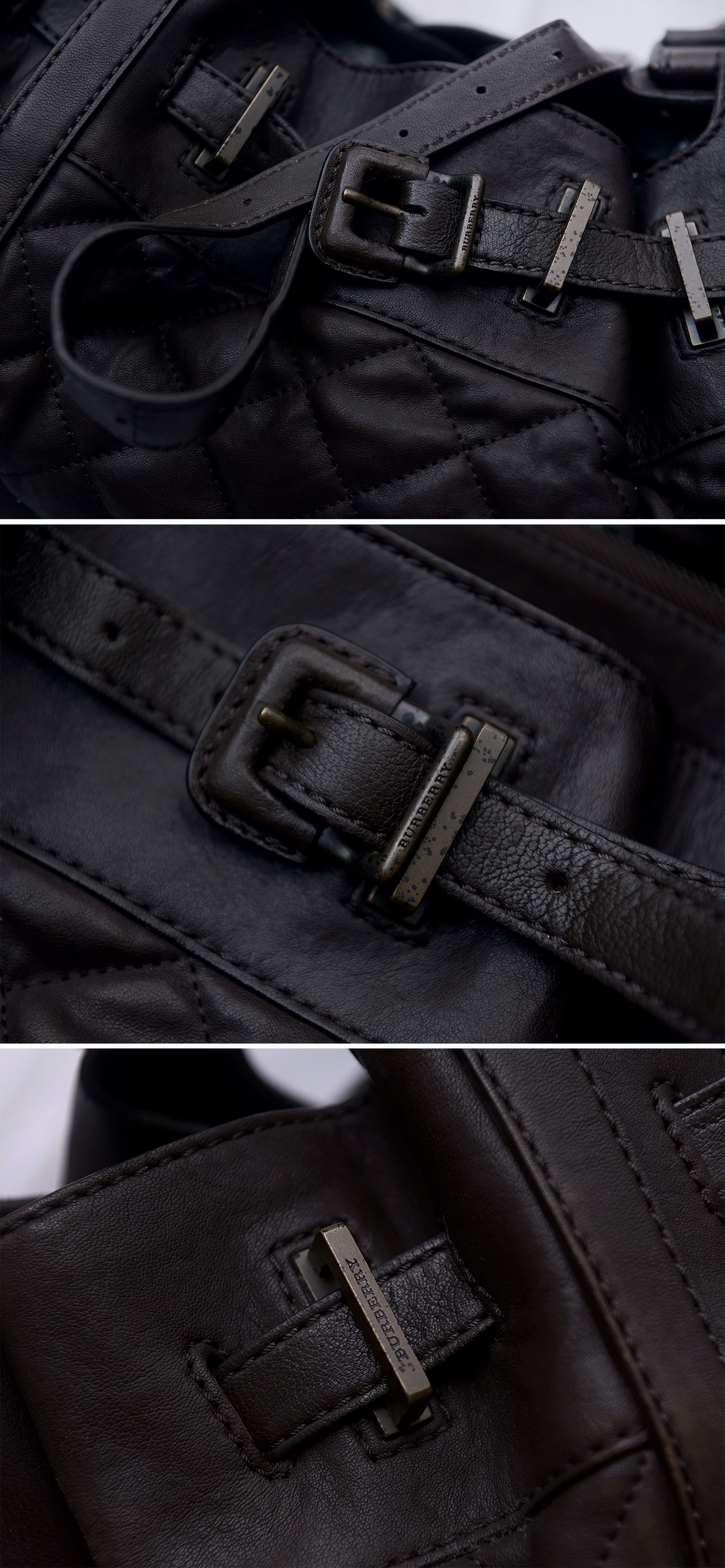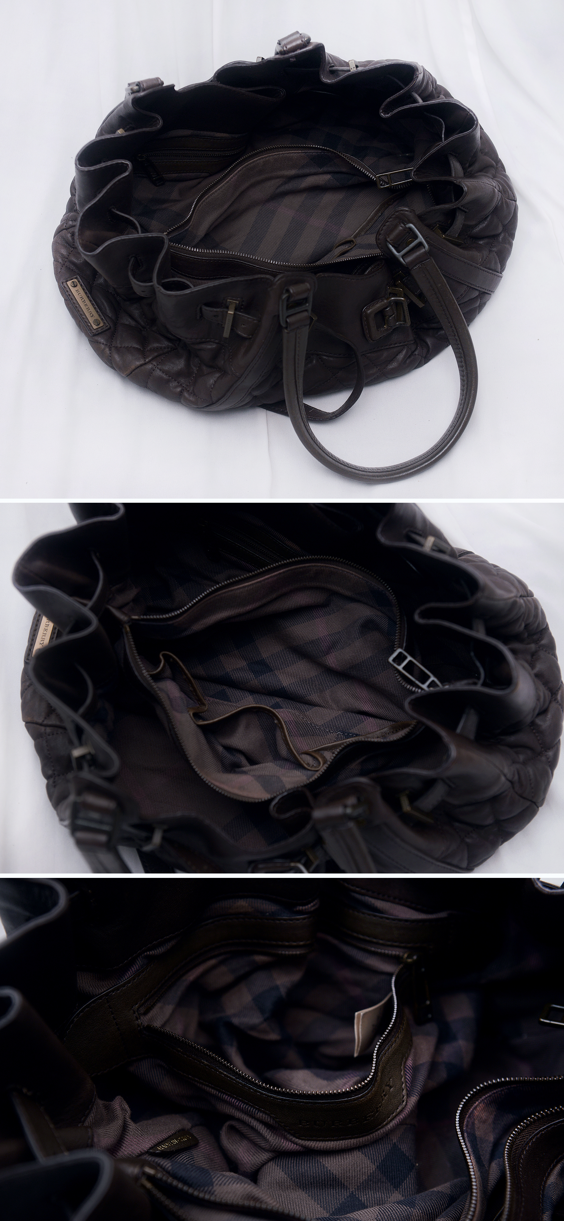 다크 초코 컬러의 부드럽고 촉감 좋은 최상급 램스킨 소재 퀼팅 가죽 바디에 가죽 벨티드 스트랩 조리개 타입의 입구 여밈 방식에 엔틱한 황동 금속 장식의 클래식하고 멋스러운 빅토트.숄더 호보백 입니다. 내부 가운데에 넓은 지퍼 포켓으로 구획 구분하여 효율적인 수납 가능하고 내부 안감 버버리 시그니쳐 클래식 체크패턴 멋스럽습니다.