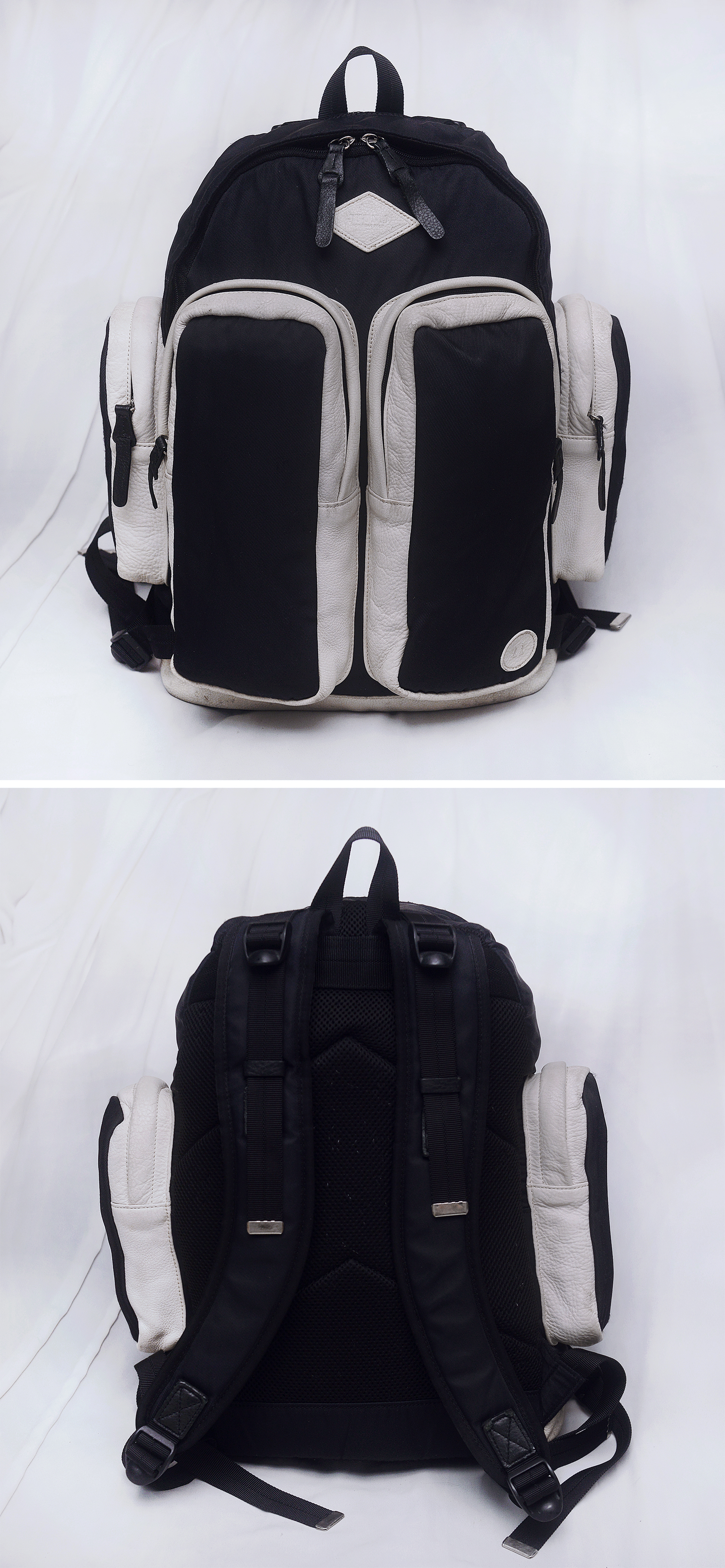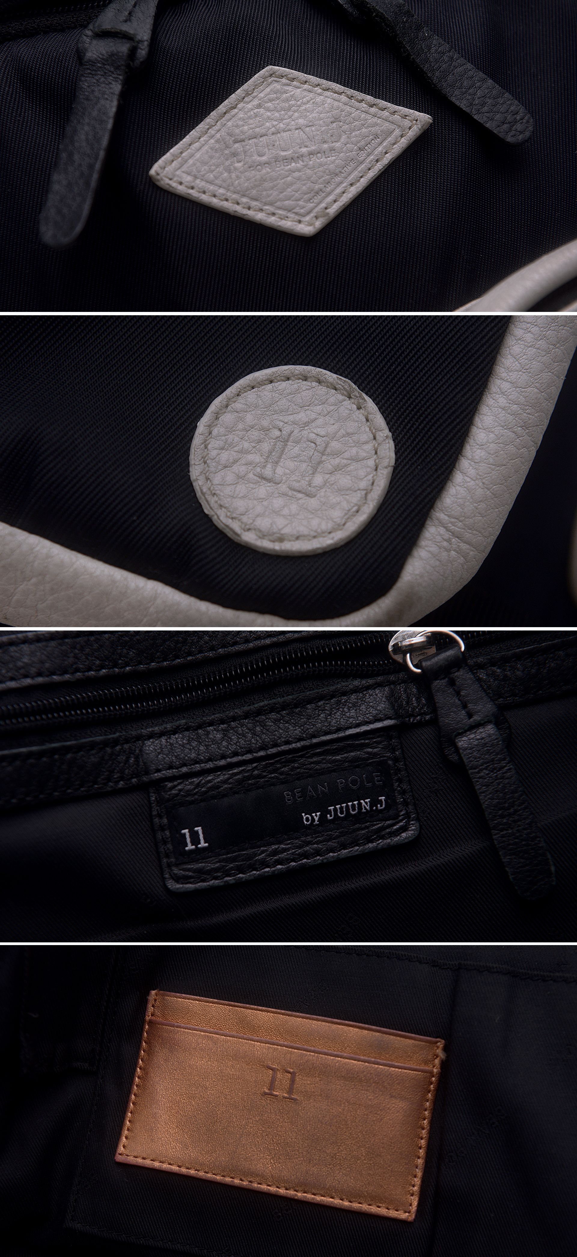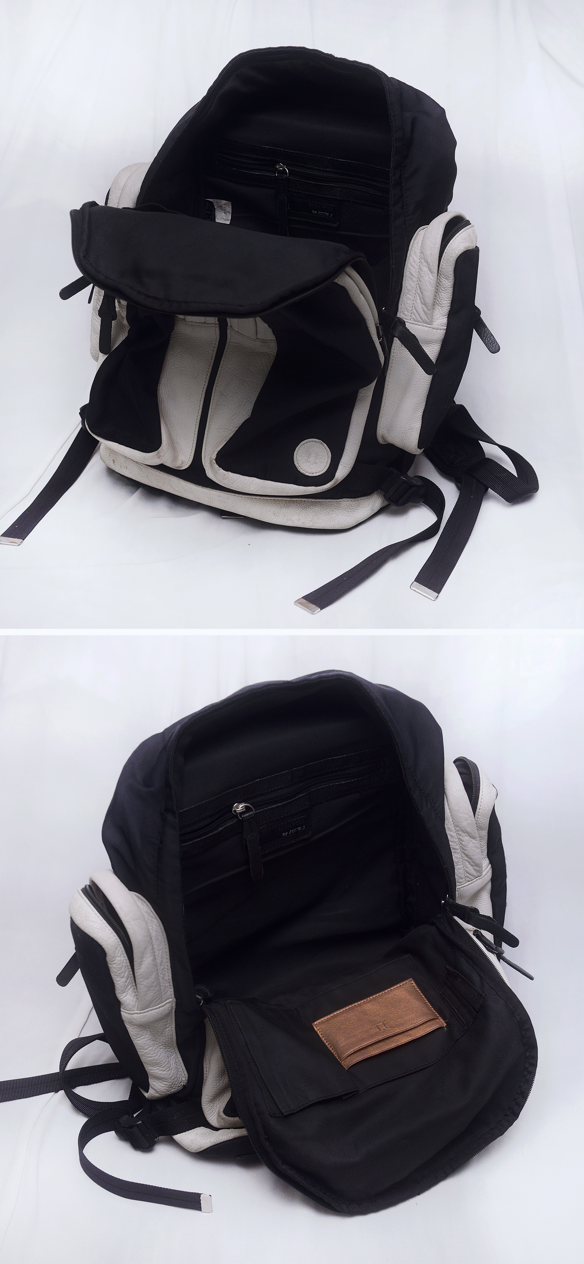 우영미와 함께 우리나라를 대표하는 세계적인 남성복 패션 디자이너 정욱준의 명품 브랜드 준지 (JUUN.J) 와 빈폴 브랜드의 콜라보레이션으로 선보인 11 BY JUUN.J 리미티드 에디션 시리즈 백팩 입니다. 스탠다드 클래식 스타일의 빈폴 브랜드에 준지다운 특유의 힙한 스타일 더해져 지나치게 튀지 않으면서도 유니크한 멋스러운 스타일 입니다. 블랙 색상 방수 나일론 캔버스에 포켓 부위등에 크림화이트 색상 가죽 트림으로 되어 있어 블랙&화이트 컬러매치 멋스럽고 외부에 밀리터리 전술백 유틸리티백 스타일의 크고 깊은 4개의 지퍼 포켓 있어 매우 실용적입니다. 포켓 부분등에 사용된 가죽은 에르메스.펜디 셀러리아 라인등 최고급 제품들에서나 사용되는 끌라망스.로만 가죽 소재로 가죽 촉감 매우 부드럽고 특유의 자연적인 그레인 엠보 무늬 멋스럽습니다. 개인적으로 다양한 여러 가방들 사용해 봤지만 백팩같은 활동성 많은 제품에 가죽 트림이라고 해도 이 가죽을 사용한건 처음본거 같습니다. 각잡히지 않은 플렉서블한 형태라 수납량이나 드는 방식에 따라 자연스럽게 잡히는 쉐입 매우 멋스러워 어떤 차림에도 잘 어울리고 남여공용 멋스러운 데일리백부터 간단한 출장.여행용 가방등 다용도로 두루 사용하기 좋습니다.