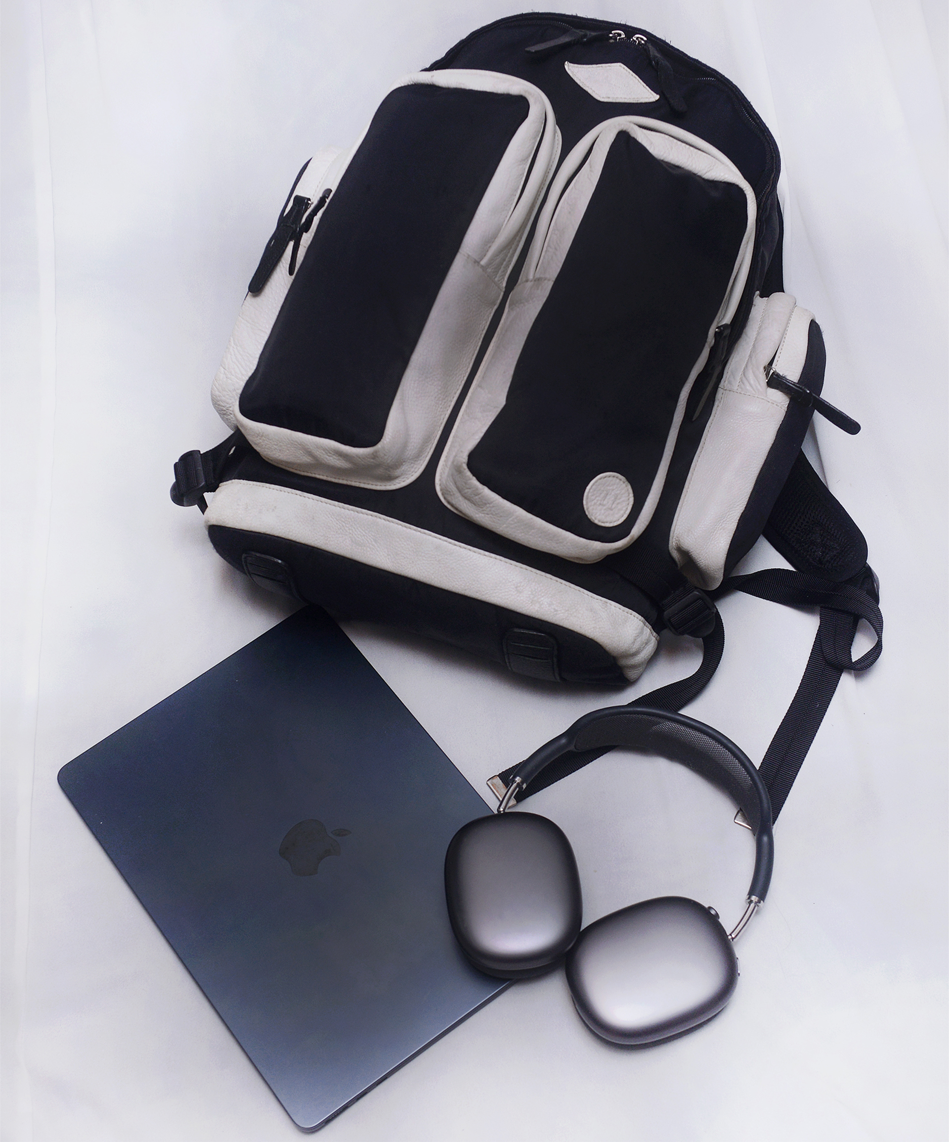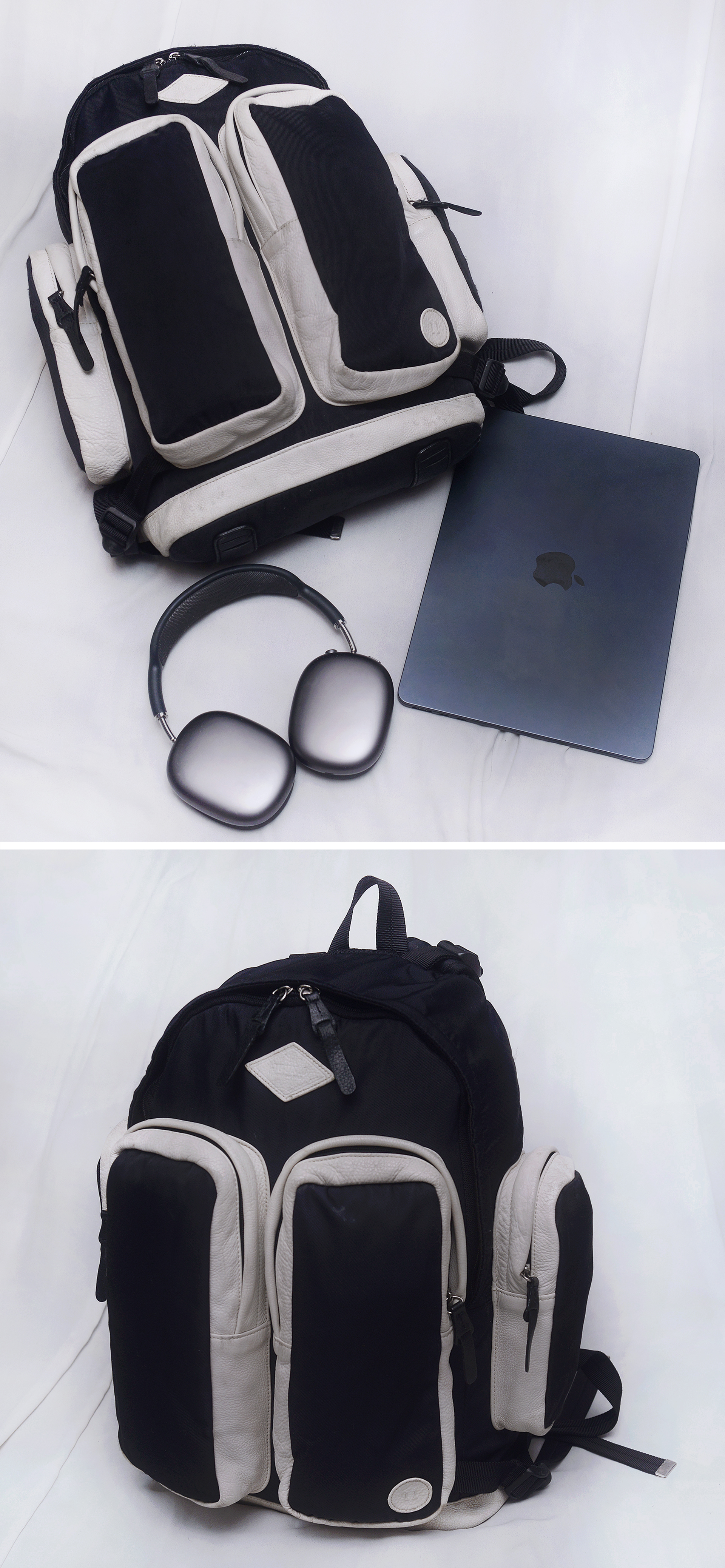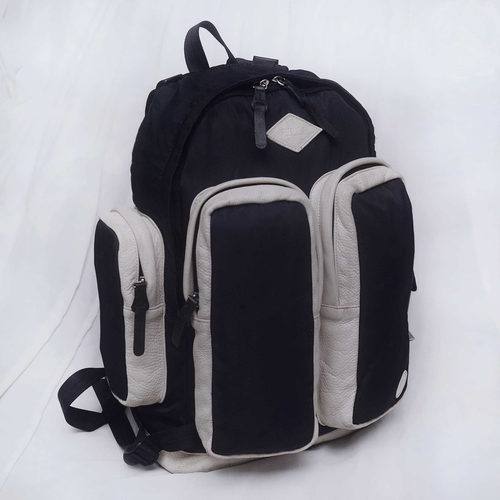 우영미와 함께 우리나라를 대표하는 세계적인 남성복 패션 디자이너 정욱준의 명품 브랜드 준지 (JUUN.J) 와 빈폴 브랜드의 콜라보레이션으로 선보인 11 BY JUUN.J 리미티드 에디션 시리즈 백팩 입니다. 스탠다드 클래식 스타일의 빈폴 브랜드에 준지다운 특유의 힙한 스타일 더해져 지나치게 튀지 않으면서도 유니크한 멋스러운 스타일 입니다. 블랙 색상 방수 나일론 캔버스에 포켓 부위등에 크림화이트 색상 가죽 트림으로 되어 있어 블랙&화이트 컬러매치 멋스럽고 외부에 밀리터리 전술백 유틸리티백 스타일의 크고 깊은 4개의 지퍼 포켓 있어 매우 실용적입니다. 포켓 부분등에 사용된 가죽은 에르메스.펜디 셀러리아 라인등 최고급 제품들에서나 사용되는 끌라망스.로만 가죽 소재로 가죽 촉감 매우 부드럽고 특유의 자연적인 그레인 엠보 무늬 멋스럽습니다. 개인적으로 다양한 여러 가방들 사용해 봤지만 백팩같은 활동성 많은 제품에 가죽 트림이라고 해도 이 가죽을 사용한건 처음본거 같습니다. 각잡히지 않은 플렉서블한 형태라 수납량이나 드는 방식에 따라 자연스럽게 잡히는 쉐입 매우 멋스러워 어떤 차림에도 잘 어울리고 남여공용 멋스러운 데일리백부터 간단한 출장.여행용 가방등 다용도로 두루 사용하기 좋습니다.