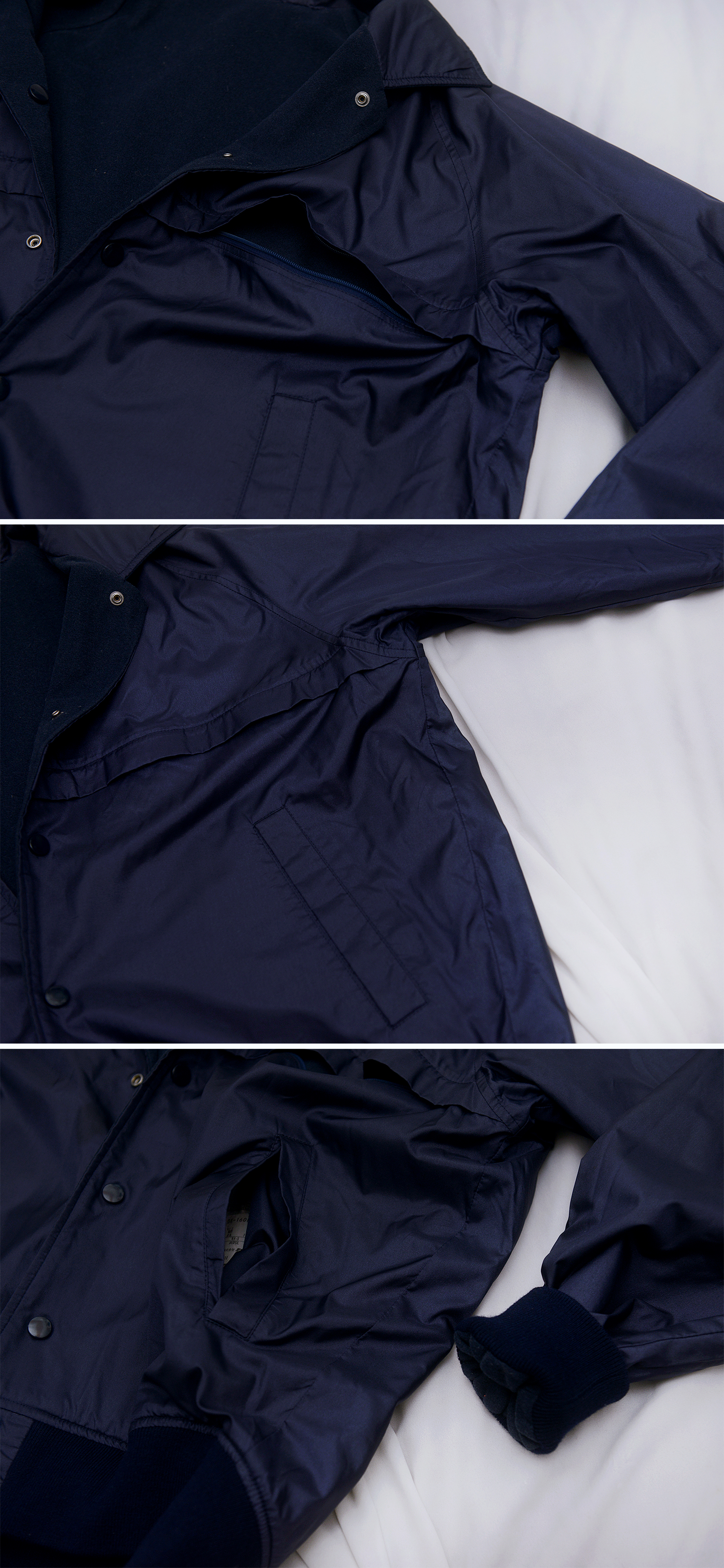 데상트 재팬 오리지널 라이프 스타일 라인 자켓으로 울블렌드 소재와 네글런 어깨 형태의 깔끔한 짙은 네이비 컬러 블루종 스타일 버튼 스태디움 자켓과 방수 나일론 소재의 바람막이 우븐자켓 스타일 두가지로 입을 수 있는 양면 리버시블 자켓 입니다. 깔끔한 스타일에 용도나 코디에 따라 다르게 활용할 수 있어 한벌로 두벌처럼 입을 수 있어 유용합니다. 적당한 두께감의 봄.가을 간절기 자켓으로 편하게 입기 좋습니다.