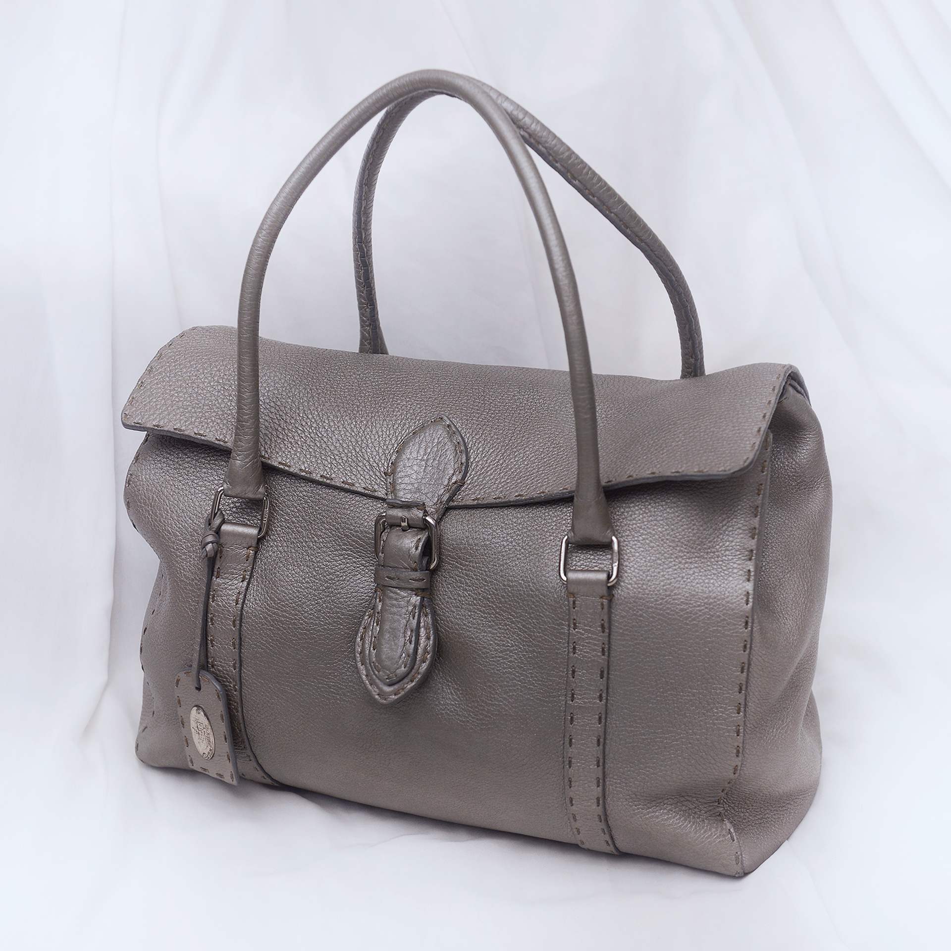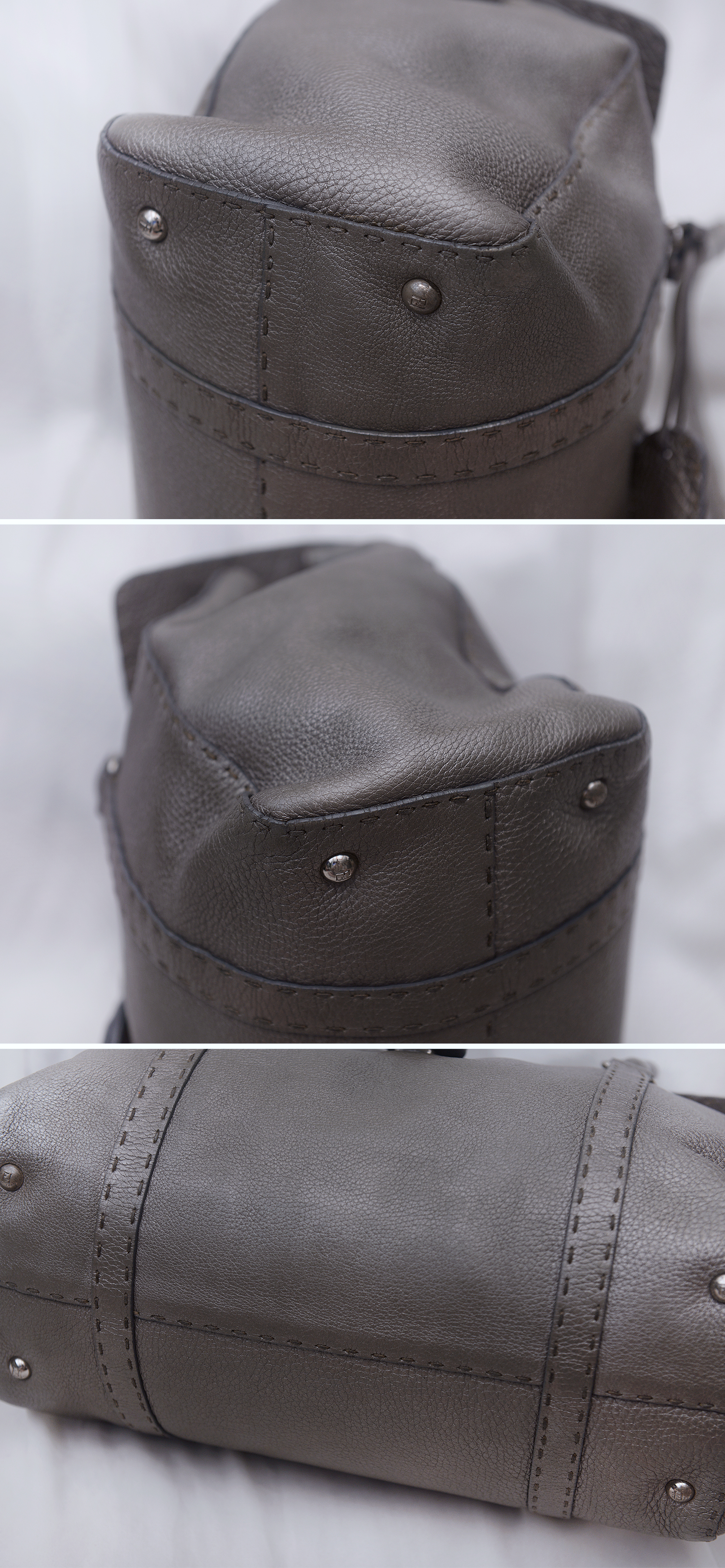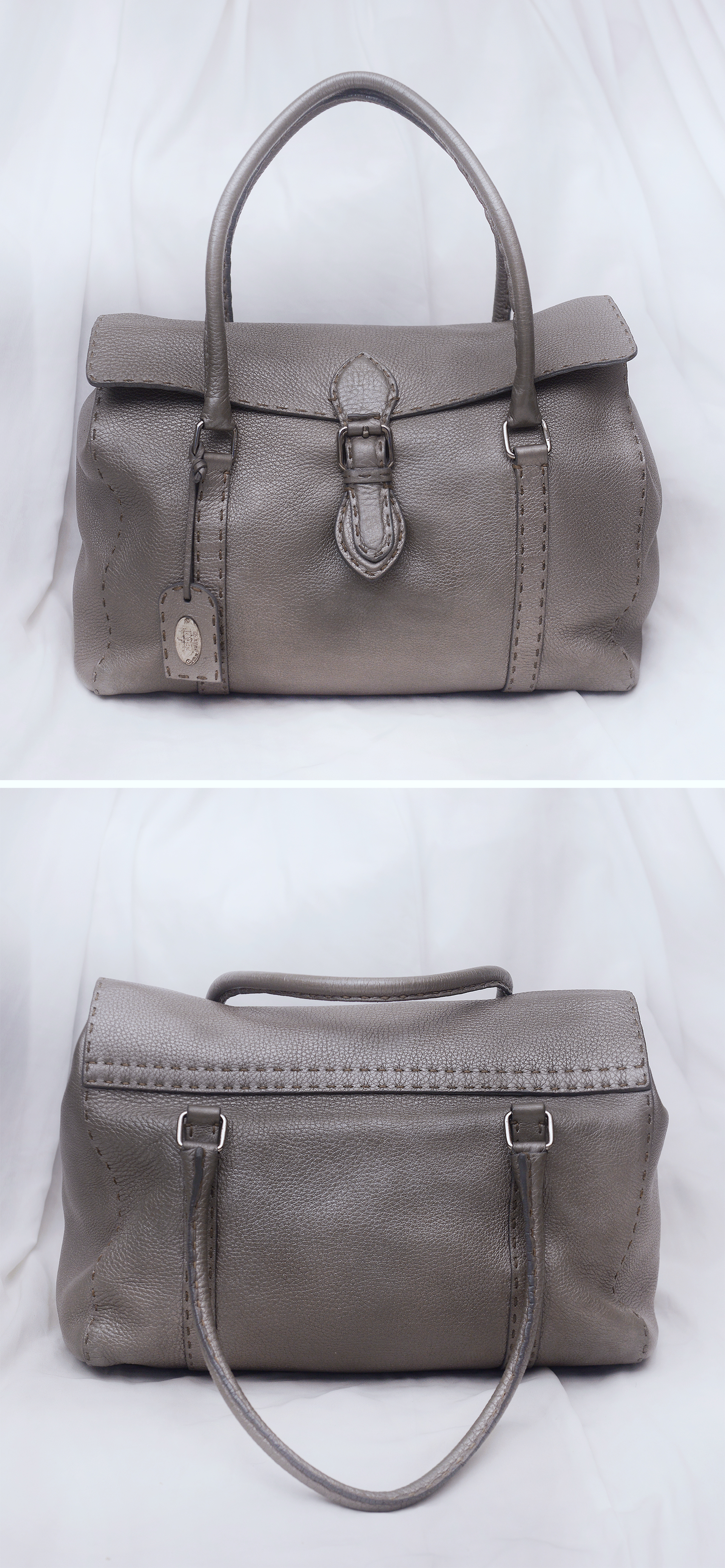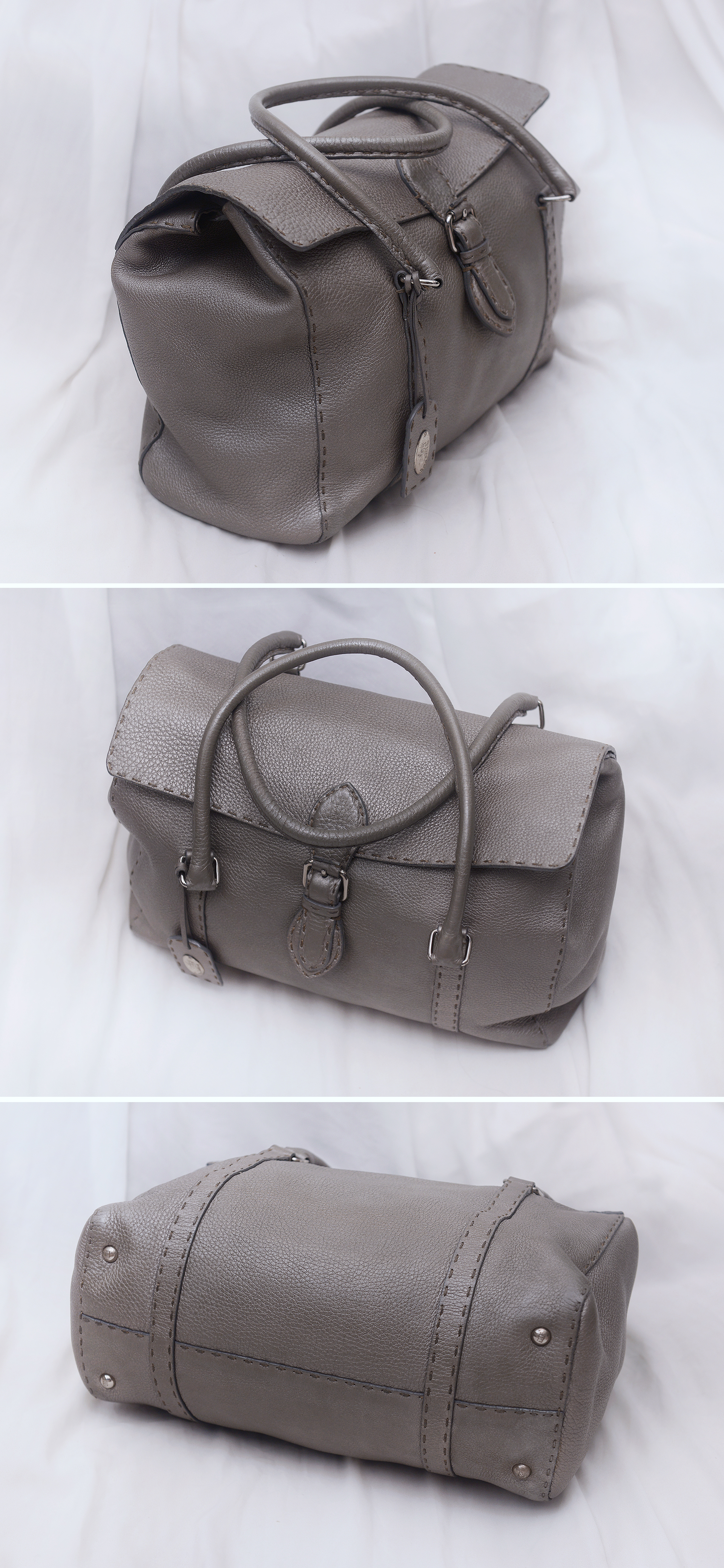 펜디 최고급 가죽 제품 라인으로 에르메스 끌라망스 가죽과 함께 최고급 가죽으로 유명한 이태리 로만 가죽 소재의 촉감과 고급스러운 가죽 엠보 무늬 아주 좋습니다. 별다른 로고 플레이 없이 만듬새와 최고급 소재만으로 명품의 존재감을 보여주는 펜디 최고급 라인 가방입니다. 메탈릭한 느낌의 실버톤 그레이 색상으로 지나치게 튀지 않으면서도 멋스럽고 고급스럽습니다.
