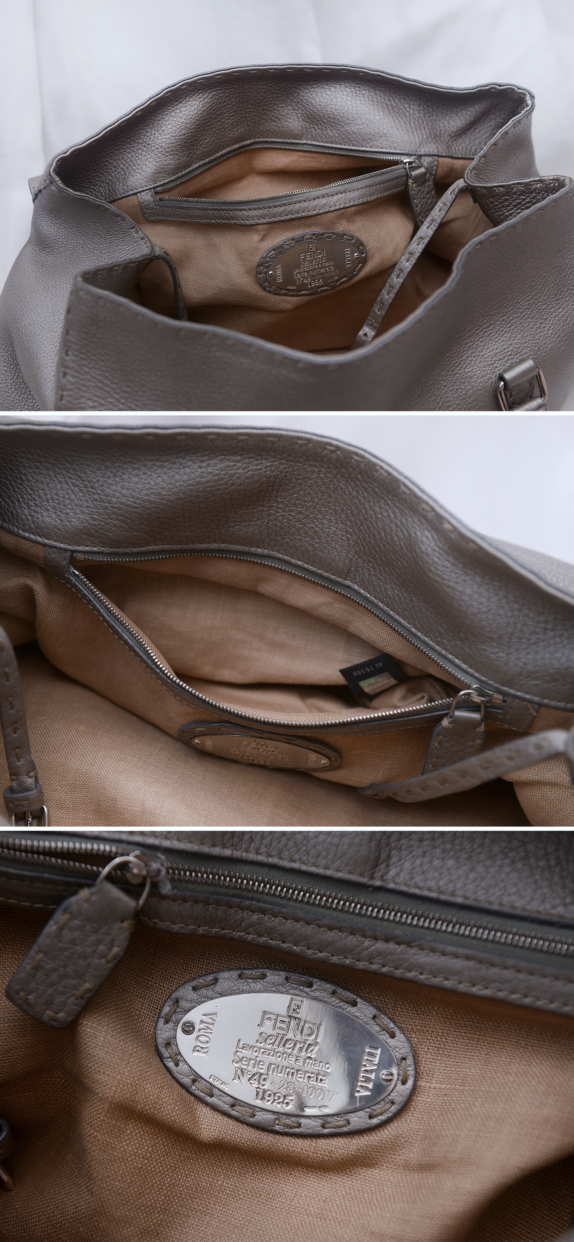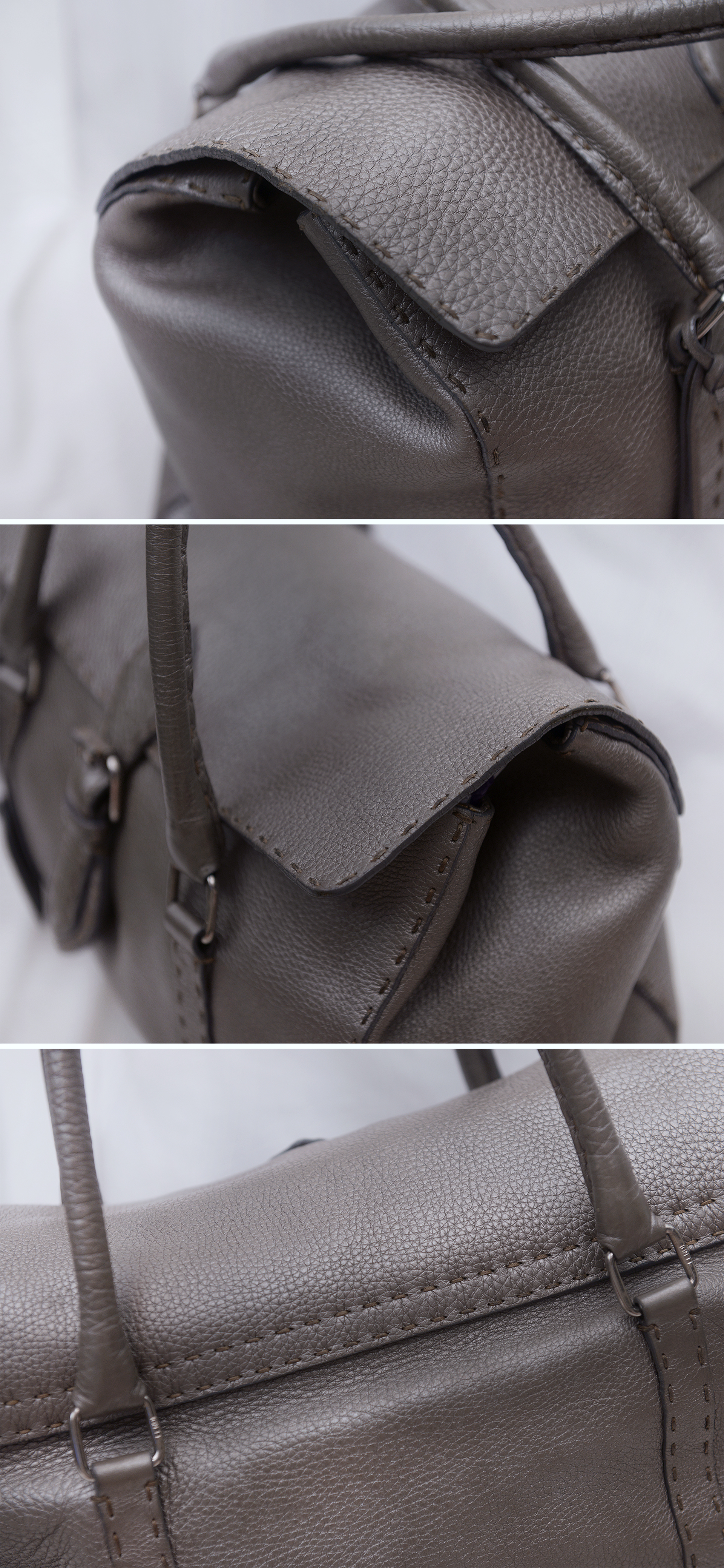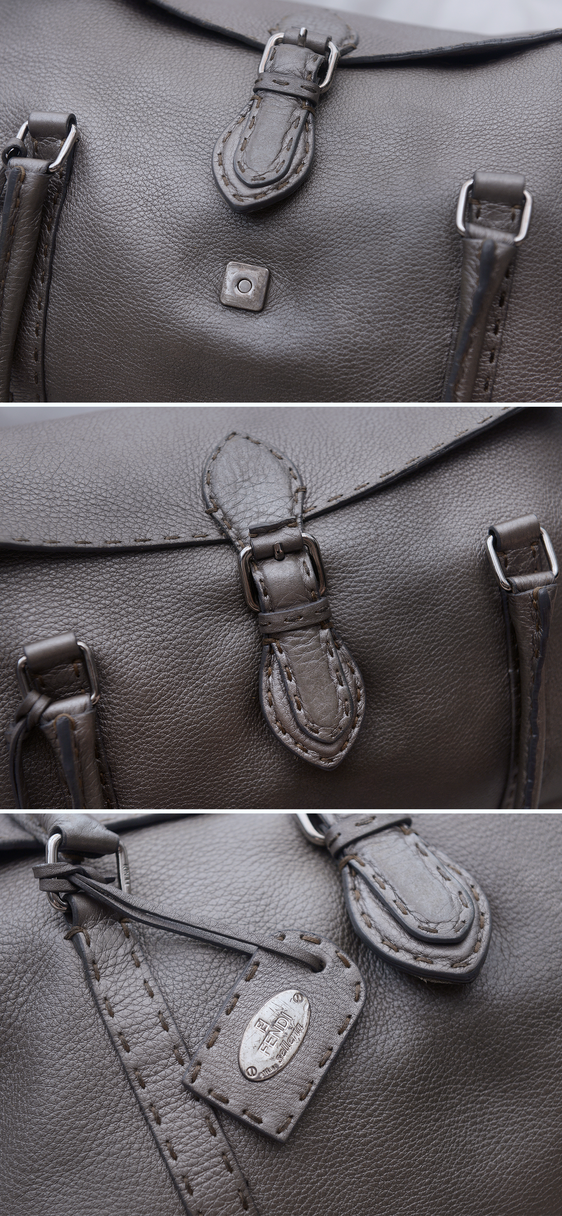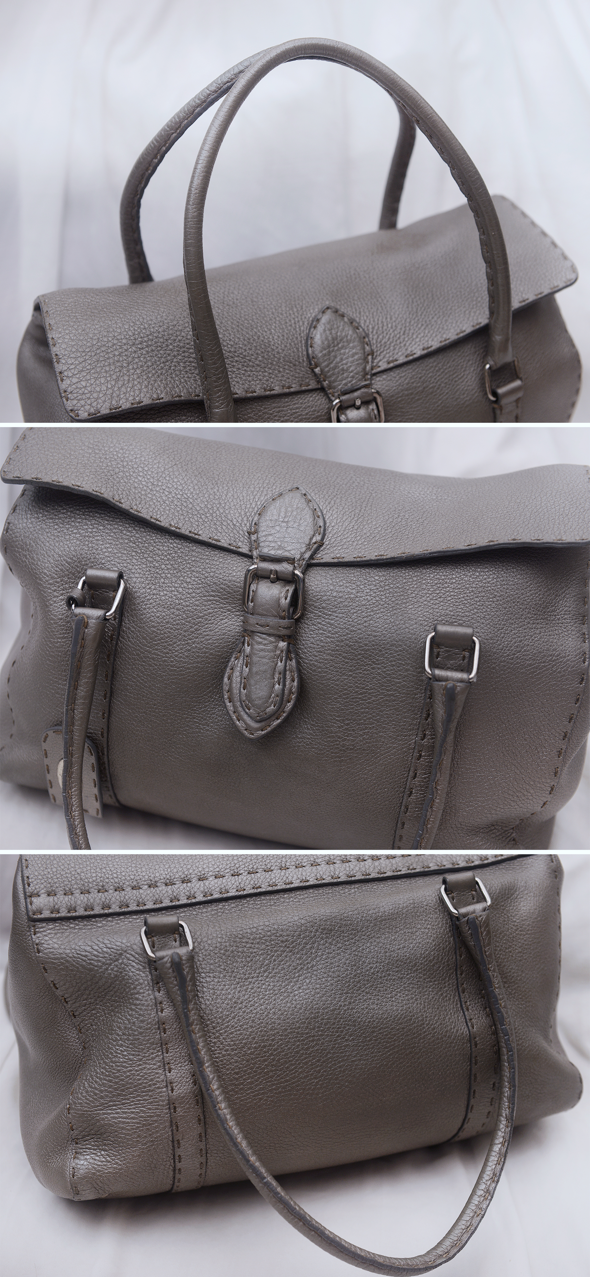 펜디 최고급 가죽 제품 라인으로 에르메스 끌라망스 가죽과 함께 최고급 가죽으로 유명한 이태리 로만 가죽 소재의 촉감과 고급스러운 가죽 엠보 무늬 아주 좋습니다. 별다른 로고 플레이 없이 만듬새와 최고급 소재만으로 명품의 존재감을 보여주는 펜디 최고급 라인 가방입니다. 메탈릭한 느낌의 실버톤 그레이 색상으로 지나치게 튀지 않으면서도 멋스럽고 고급스럽습니다.