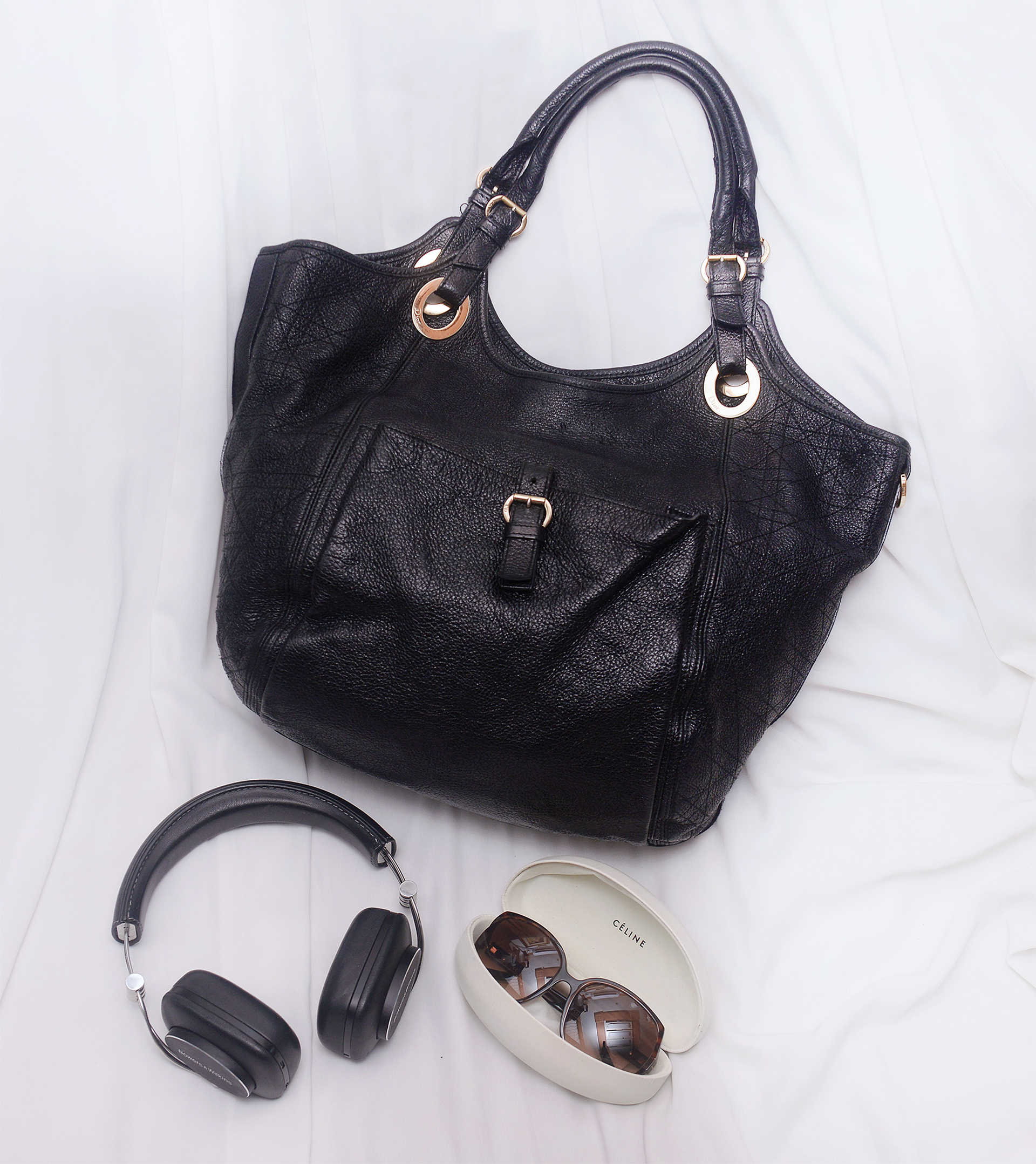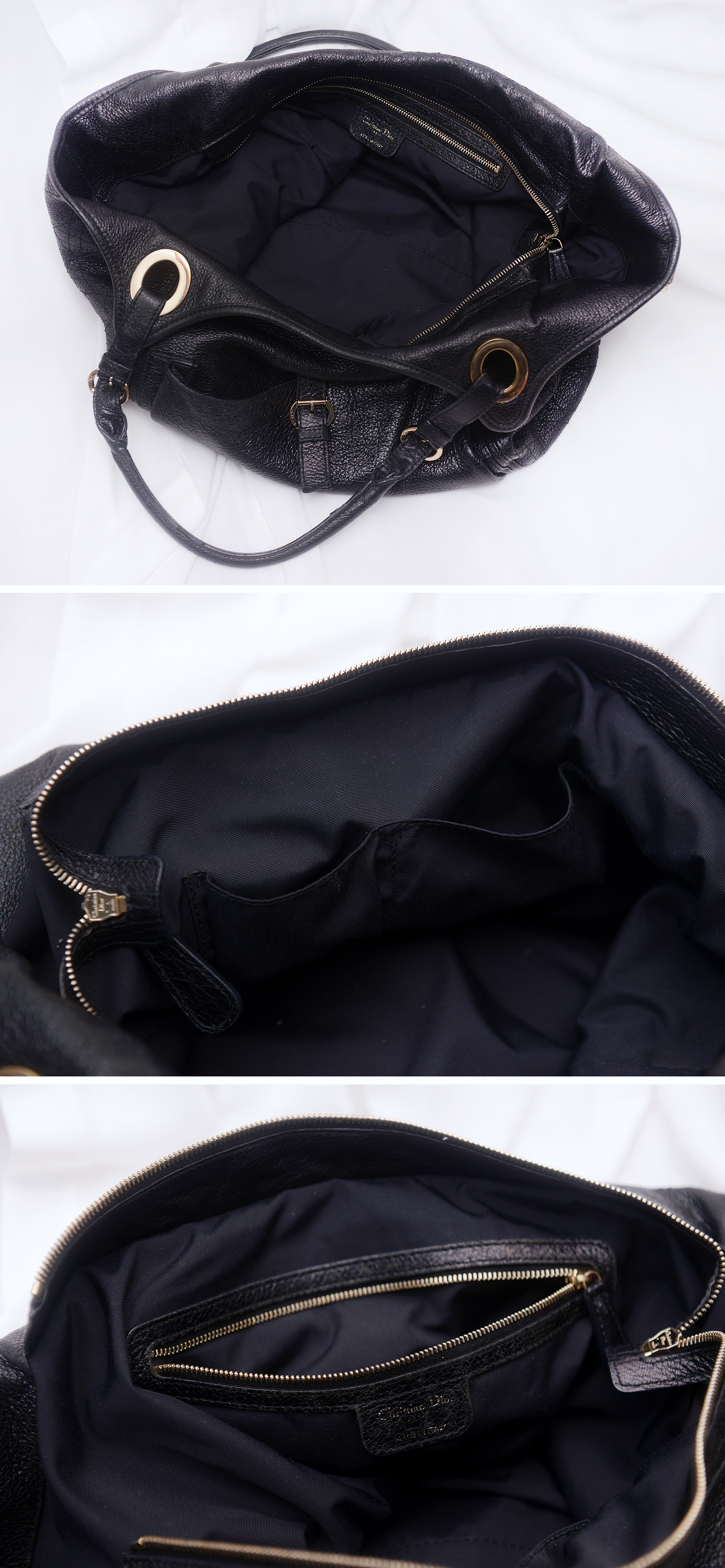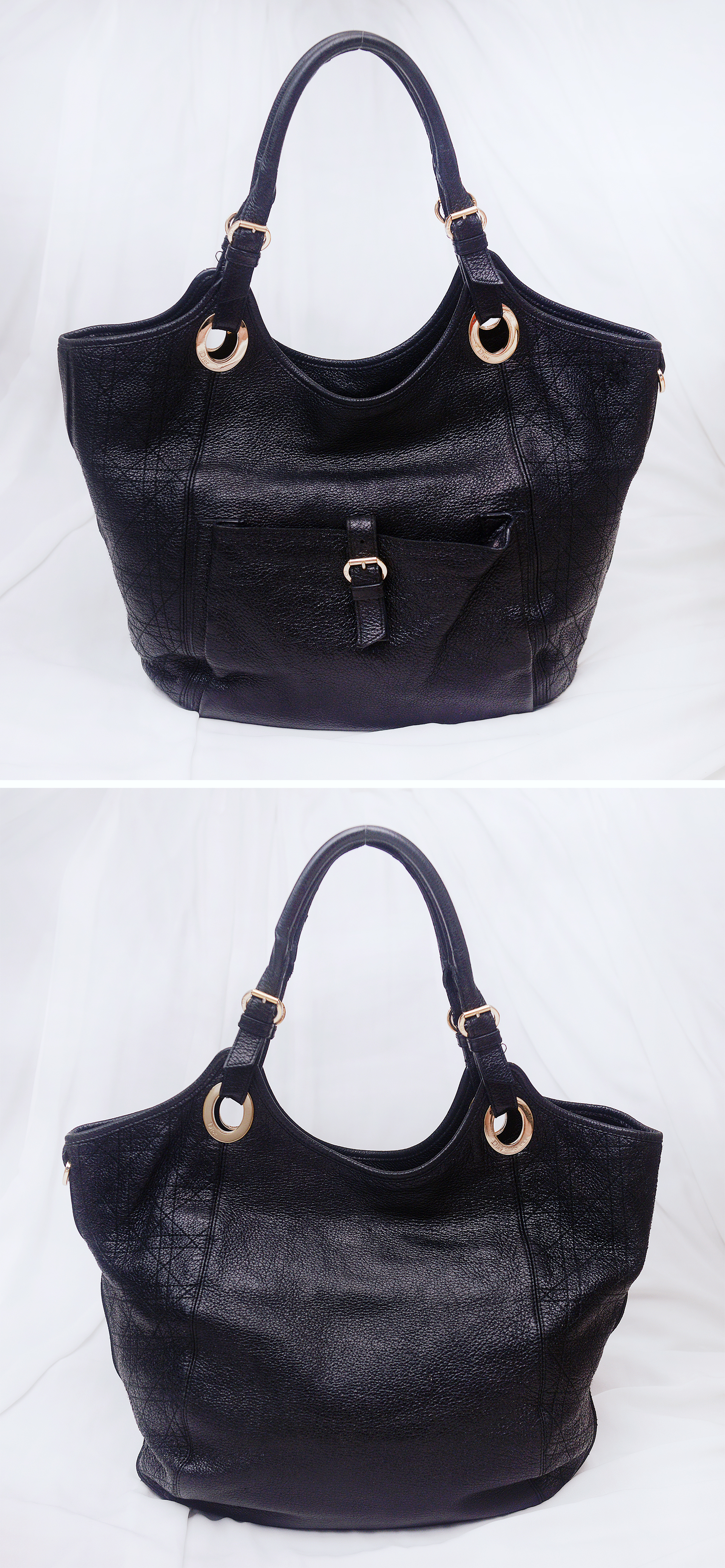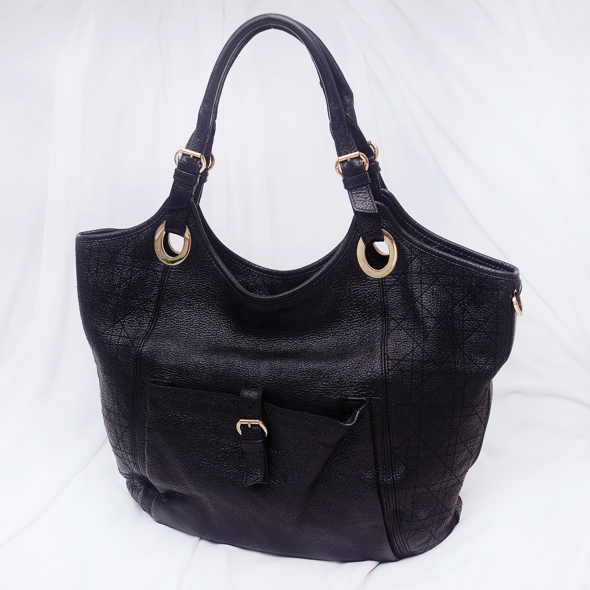 블랙 컬러의 최고급 사슴 가죽 소재에 금장 장식 조합으로 깔끔하고 우아한 스타일입니다. 각 잡히지 않고 수납량이나 드는 방식에 따라 자연스럽게 쉐입 잡히는 부드러운 실루엣에 측면부 디올 시그니쳐 까나쥬 탑스티칭 되어 있어 너무 쳐지지 않고 모양 잘 잡아줍니다. 전면에 자석 오픈식 넓은 퀵 포켓 있어 휴대폰등 자주 사용하는 것들 편하게 넣고 뺄 수 있습니다.