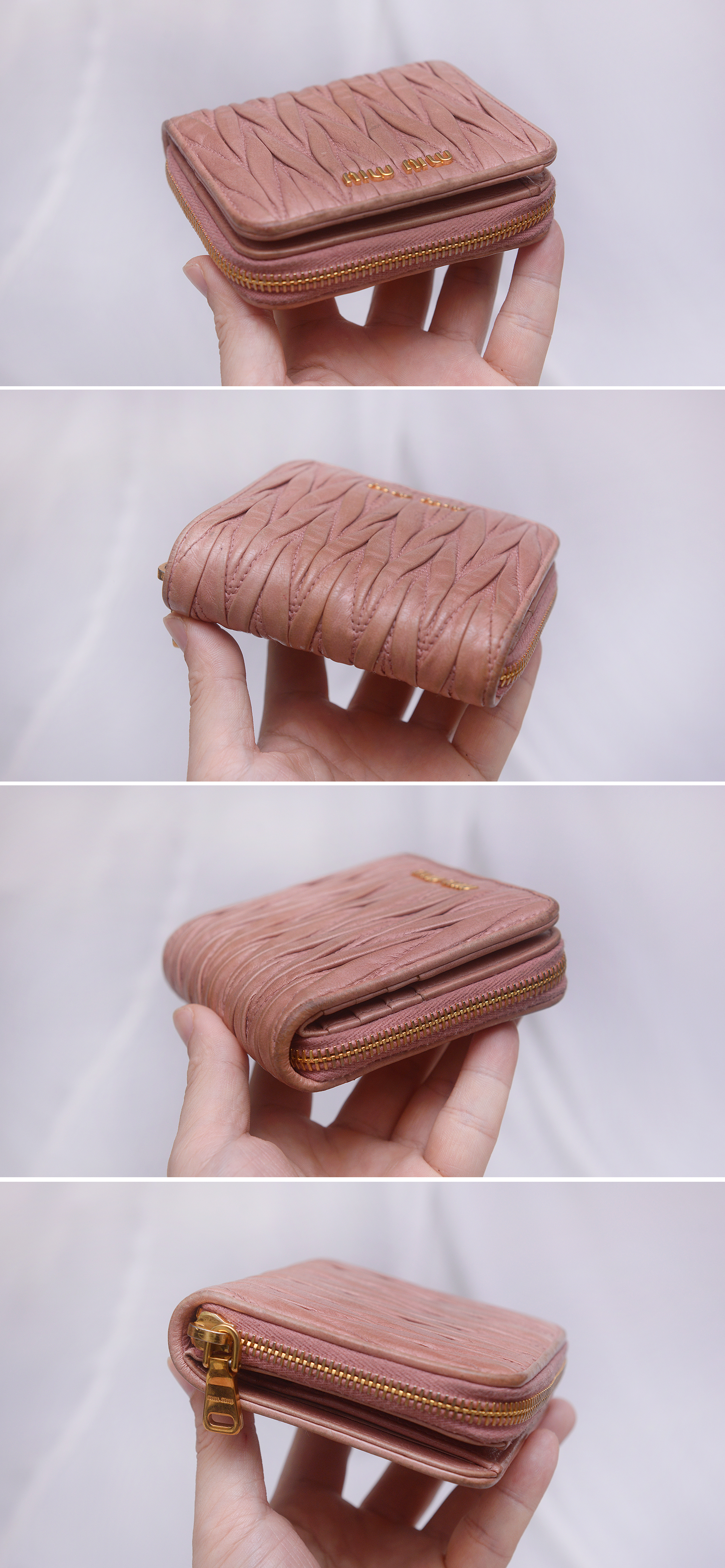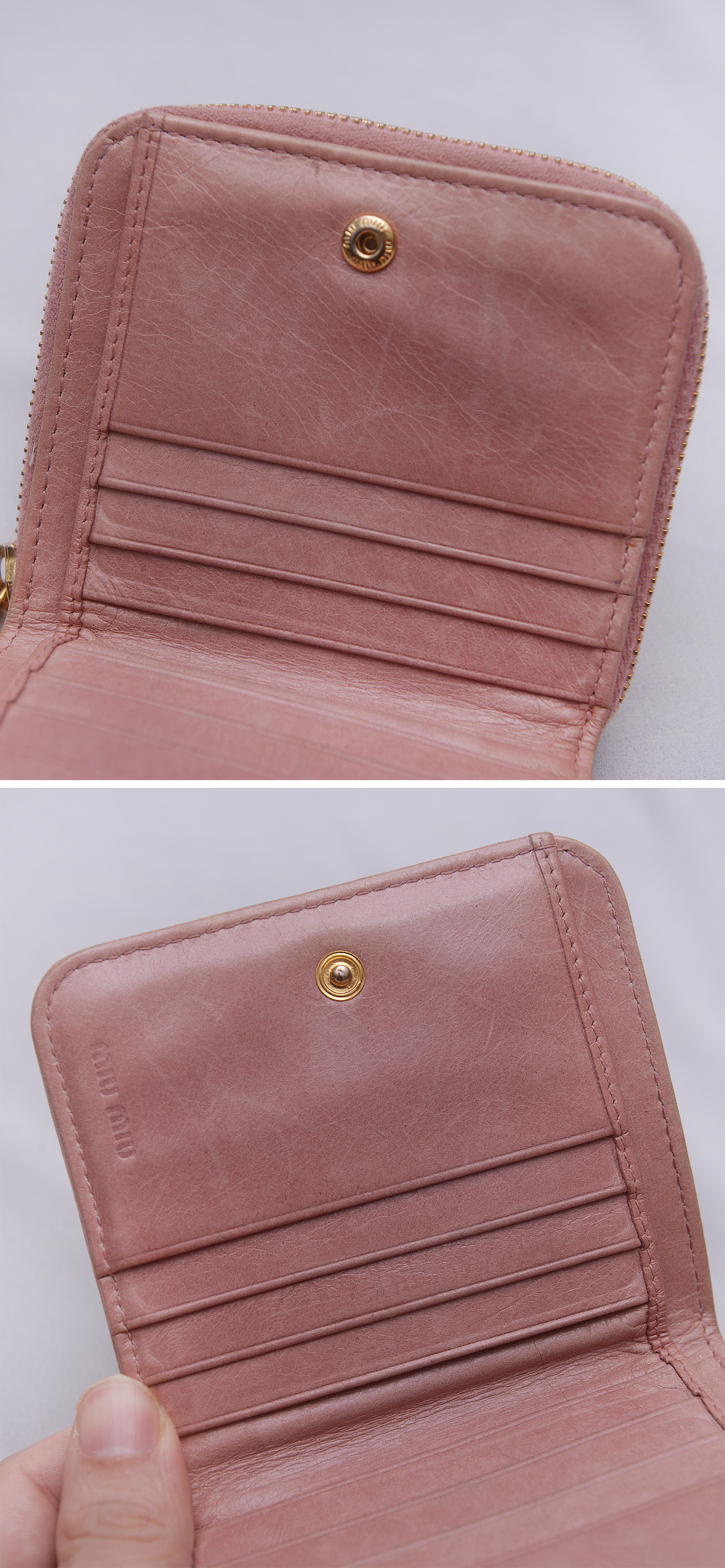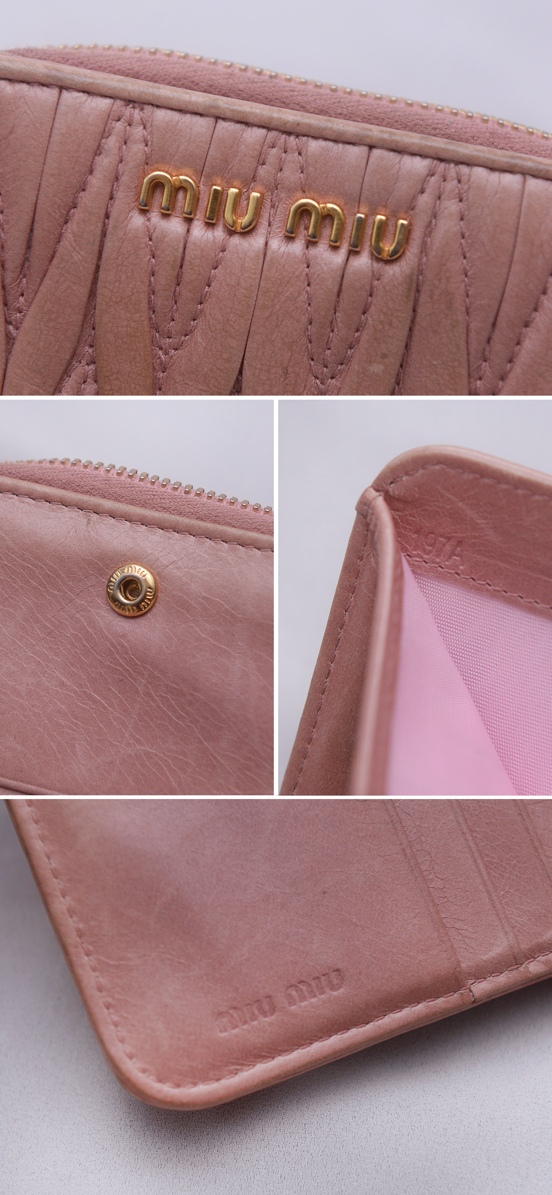 미우미우다운 러블리한 스타일에 고급스러운 최상급 양가죽 램스킨 소재의 마틀라쎄 퀼팅으로 인디핑크 컬러 (표기 컬러명 loto = 행운) 에 금장 장식조합 너무 지나치지 않게 차분하면서 화려해 포인트 아이템으로 좋습니다. 겉면에 마틀라쎄 라인 특유의 가죽 퀼팅 매우 아름답고 미우미우 프라다 비텔로 럭스 라인 특유의 멋스러운 크랙레더 엠보로 되어 있어 빈티지하게 멋스럽습니다. 스냅 버튼 오픈되는 메인 섹션 내부에는 카드슬롯 6 히든슬롯 2 지폐칸 1 로 구성되어 있고 별도 지퍼라운드로 오픈되는 큰 다용도 포켓 2섹션으로 구분되어 있어 메인 섹션 오픈 없이도 자주 사용하는 카드나 간단한 지폐등 넣고 쓰기 좋습니다. 소재.형태 특성상 가죽 손때등 자연스러운 사용감 정도 있으나 다른 지갑들 많아 돌려가며 쓰는 편이라 눈에 띄는 큰 파손.훼손 없이 상태 양호합니다.