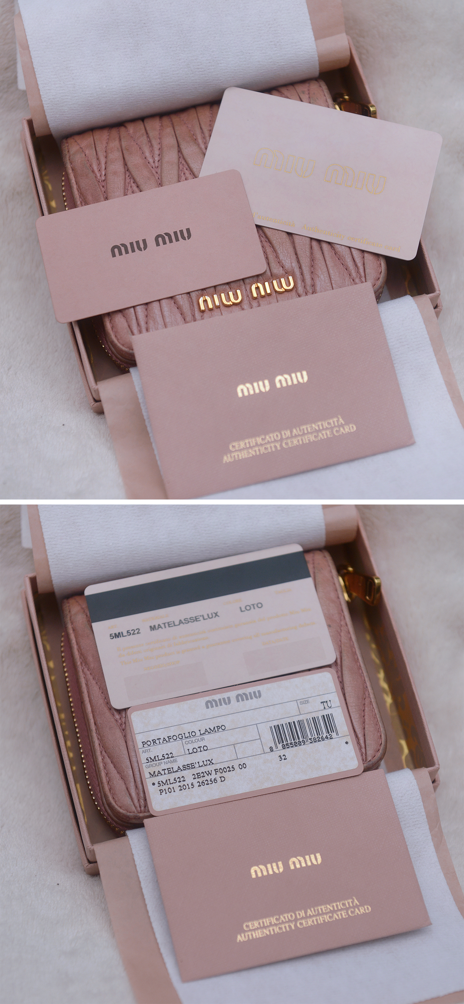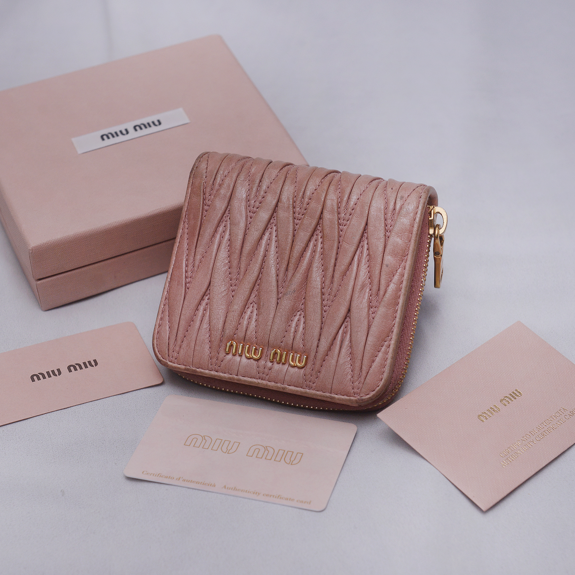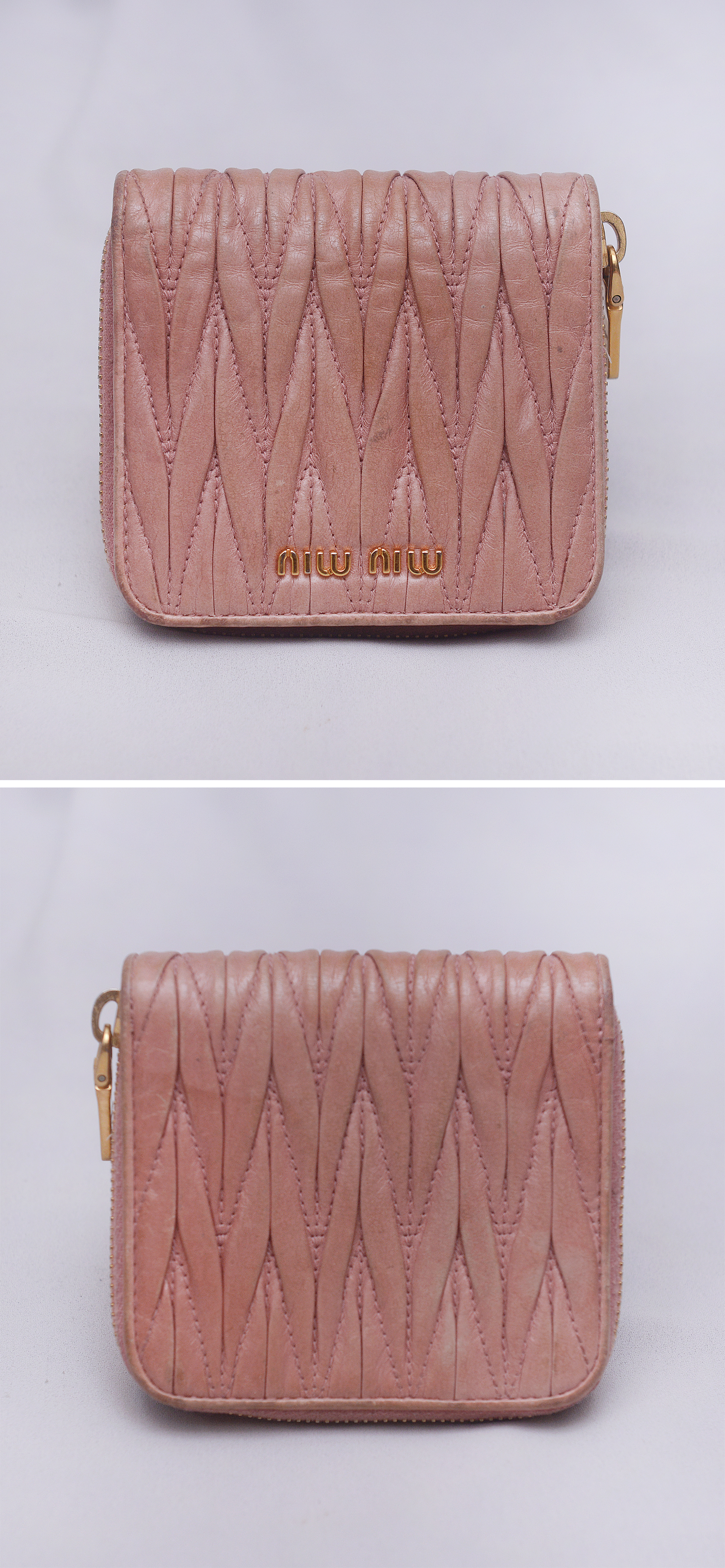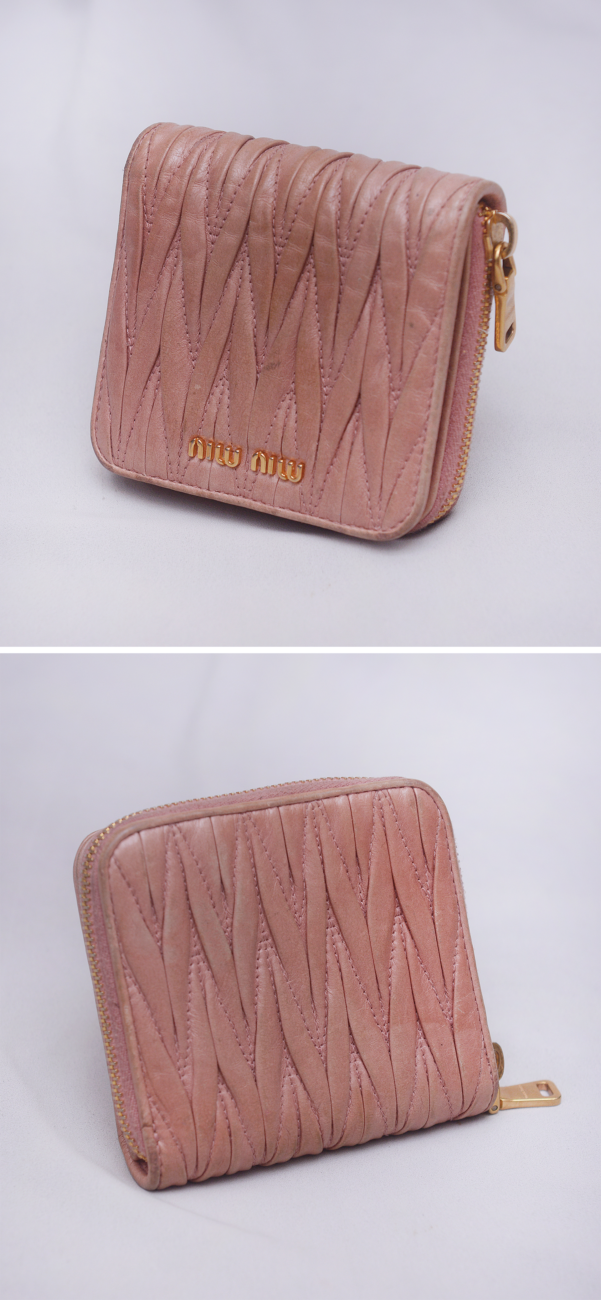 미우미우다운 러블리한 스타일에 고급스러운 최상급 양가죽 램스킨 소재의 마틀라쎄 퀼팅으로 인디핑크 컬러 (표기 컬러명 loto = 행운) 에 금장 장식조합 너무 지나치지 않게 차분하면서 화려해 포인트 아이템으로 좋습니다. 겉면에 마틀라쎄 라인 특유의 가죽 퀼팅 매우 아름답고 미우미우 프라다 비텔로 럭스 라인 특유의 멋스러운 크랙레더 엠보로 되어 있어 빈티지하게 멋스럽습니다. 스냅 버튼 오픈되는 메인 섹션 내부에는 카드슬롯 6 히든슬롯 2 지폐칸 1 로 구성되어 있고 별도 지퍼라운드로 오픈되는 큰 다용도 포켓 2섹션으로 구분되어 있어 메인 섹션 오픈 없이도 자주 사용하는 카드나 간단한 지폐등 넣고 쓰기 좋습니다. 소재.형태 특성상 가죽 손때등 자연스러운 사용감 정도 있으나 다른 지갑들 많아 돌려가며 쓰는 편이라 눈에 띄는 큰 파손.훼손 없이 상태 양호합니다.
