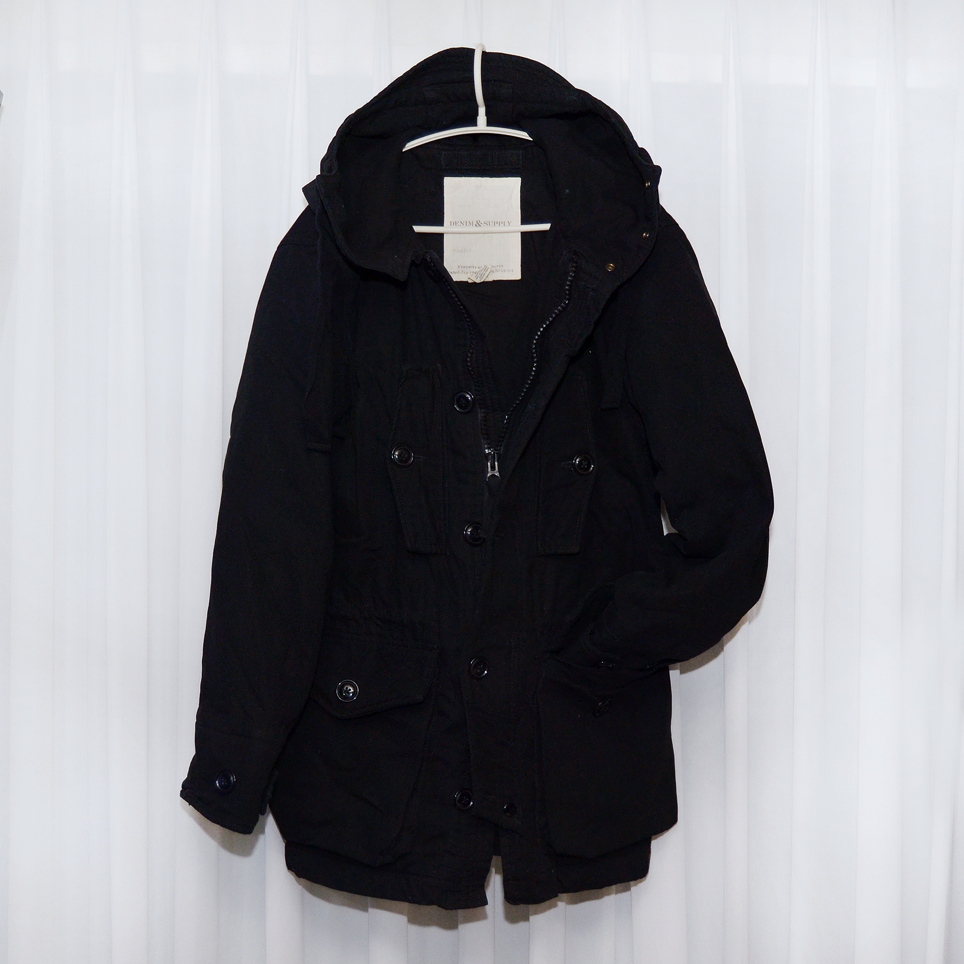 폴로 랄프로렌의 아메카지 빈티지 히피 스타일 라인업인 데님앤서플라이의 밀리터리 스타일 워싱코튼 야상 봄버자켓 입니다. 밀리터리 기반 디자인의 빈티지 히피 스타일 라인업답게 톤다운된 러프하고 러기지한 워싱처리 멋스럽고 아이디얼 (IDEAL) 콘마르 지퍼등 소재.부자재 좋습니다. 리바이스 칼하트 등의 워크웨어 자켓등에서 주로 사용하는 두께감 있고 탄탄한 트윌 코튼 캔버스 소재에 안쪽으로 패딩 처리되어 있고 얼굴까지 높게 채워지는 버튼 하이넥 스타일 후드 있어 봄.가을 간절기부터 초겨울 정도까지 멋스럽게 걸치는 아우터로 입기 좋습니다. 블랙컬러는 발매당시 카키색상에 비해 물량도 거의 없었던 인기 상품 전매장 품절되었던 제품으로 지금도 국내.외 중고 매물 거의 없습니다.
