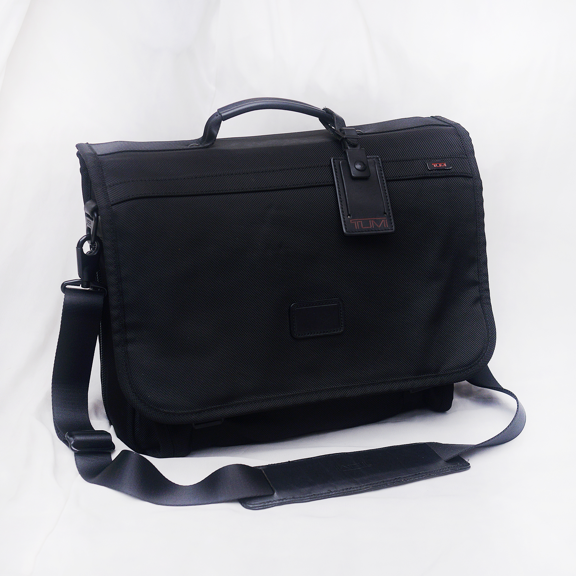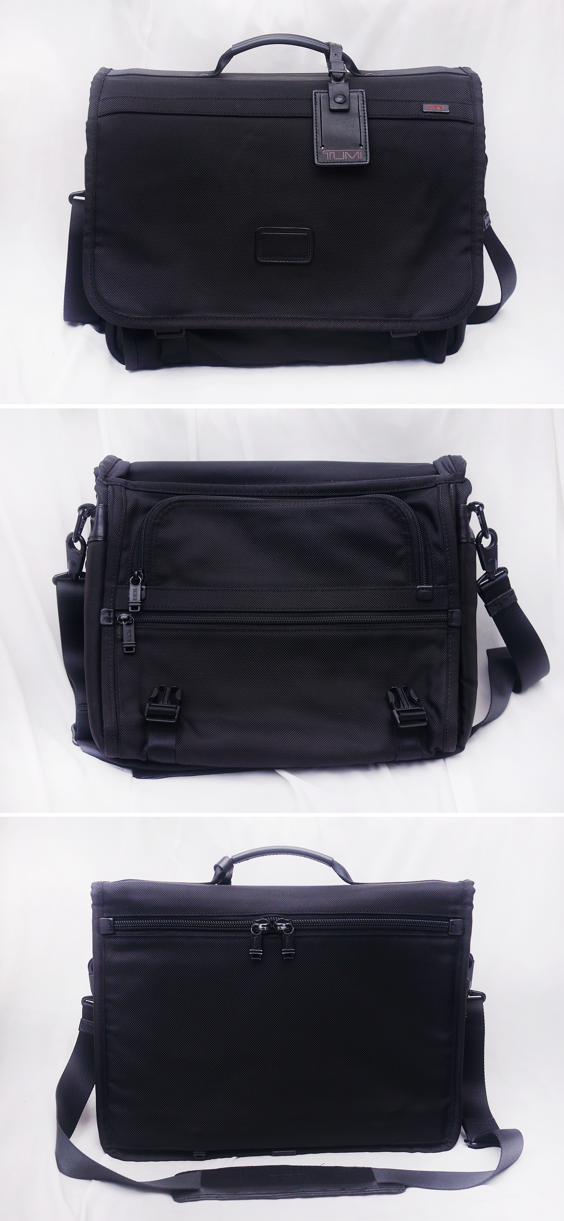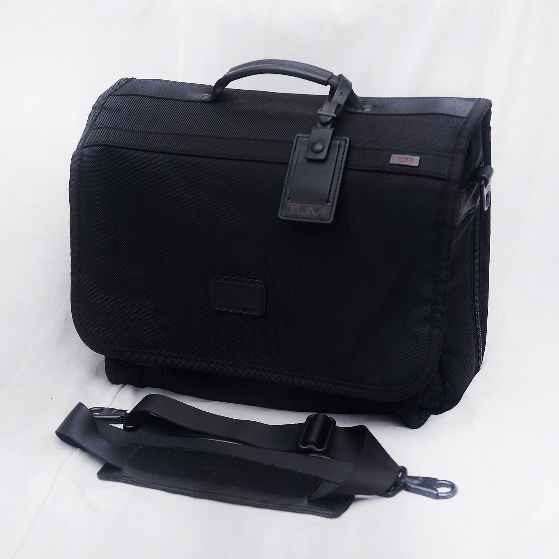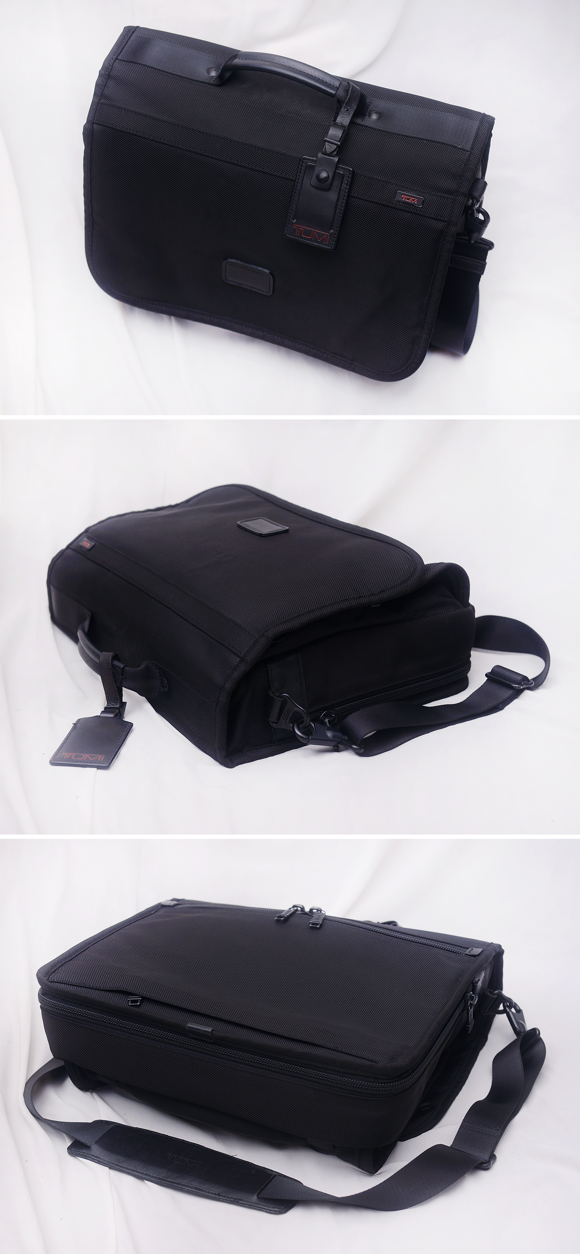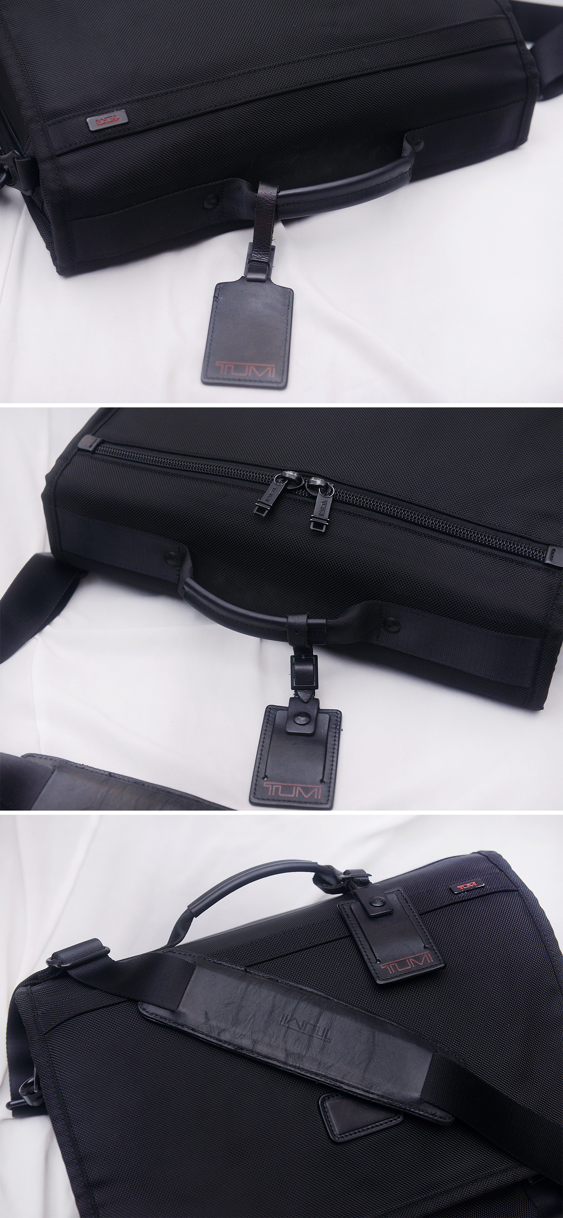 투미 고급형 빅 사이즈 랩탑 브리프케이스 메신저백으로 투미답게 가볍고 튼튼한 방탄 나일론 캔버스 소재에 핸들 및 주요부위에는 최고급 풀그레인 나파가죽 트림 되어 있고 후면 지퍼 포켓 열어서 캐리어 손잡이 결합 가능한 에드어백 시스템등 내.외부 포켓 구성 일일이 다 열거하기 힘들정도로 다채롭게 잘 되어있어 수납성.편의성 매우 좋습니다. A4 서류파일 및 15-16인치급 노트북 넉넉하게 수납 가능합니다.