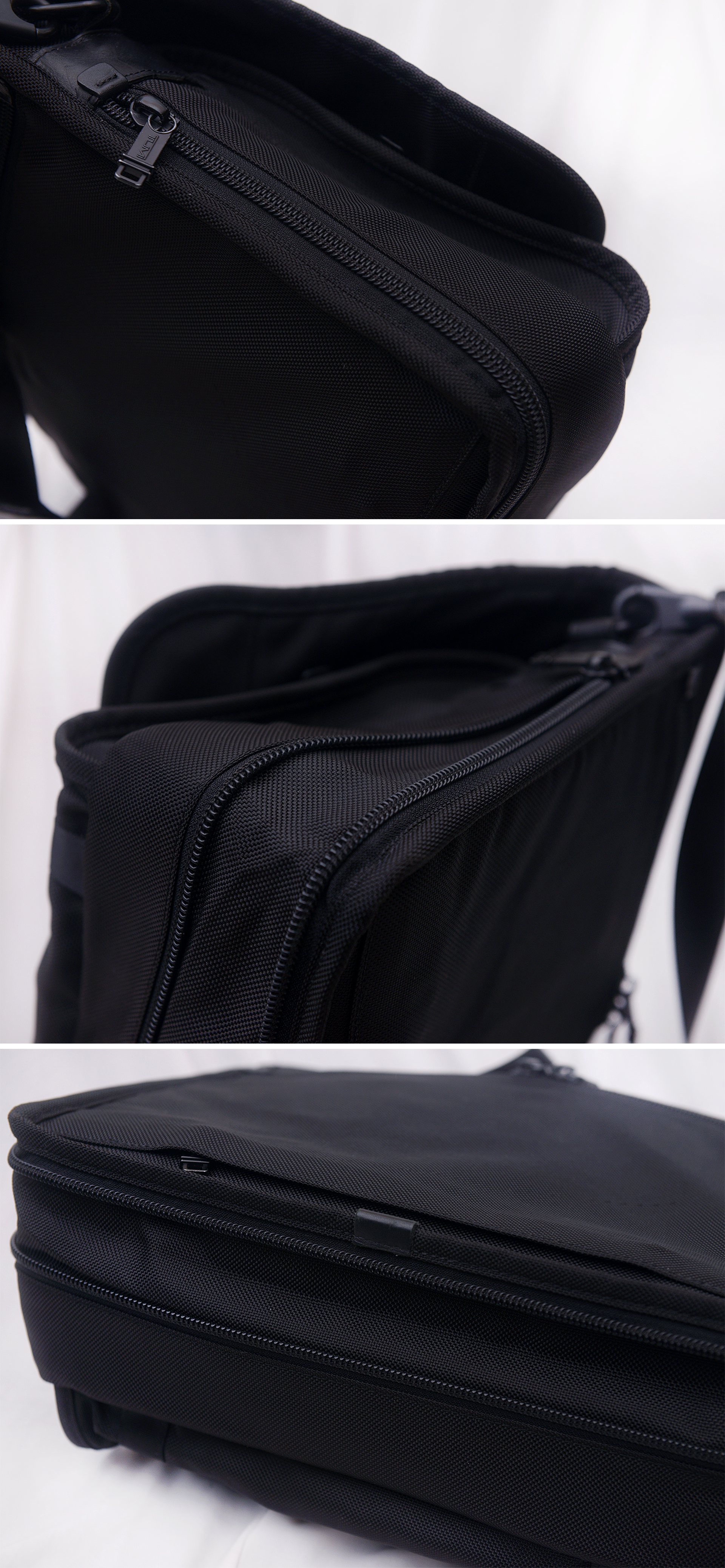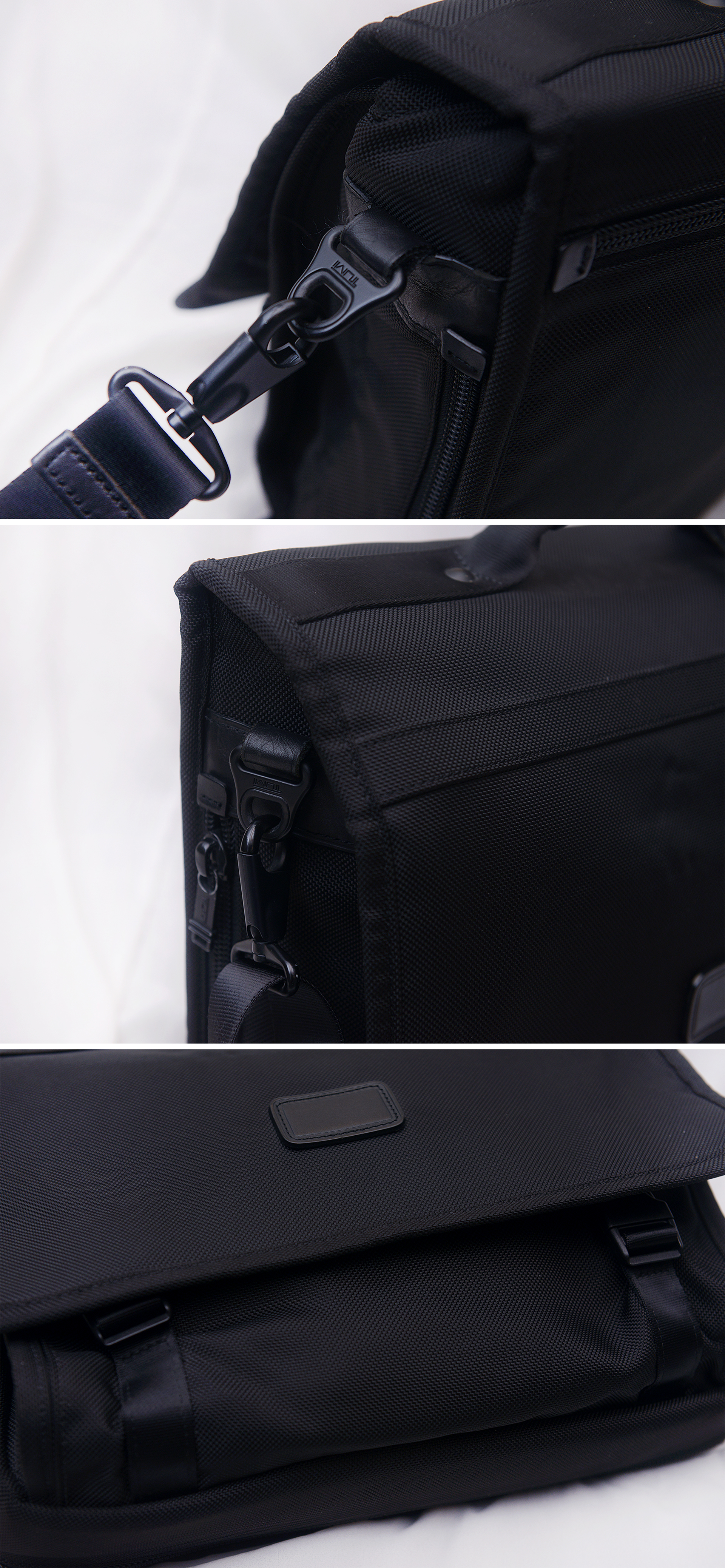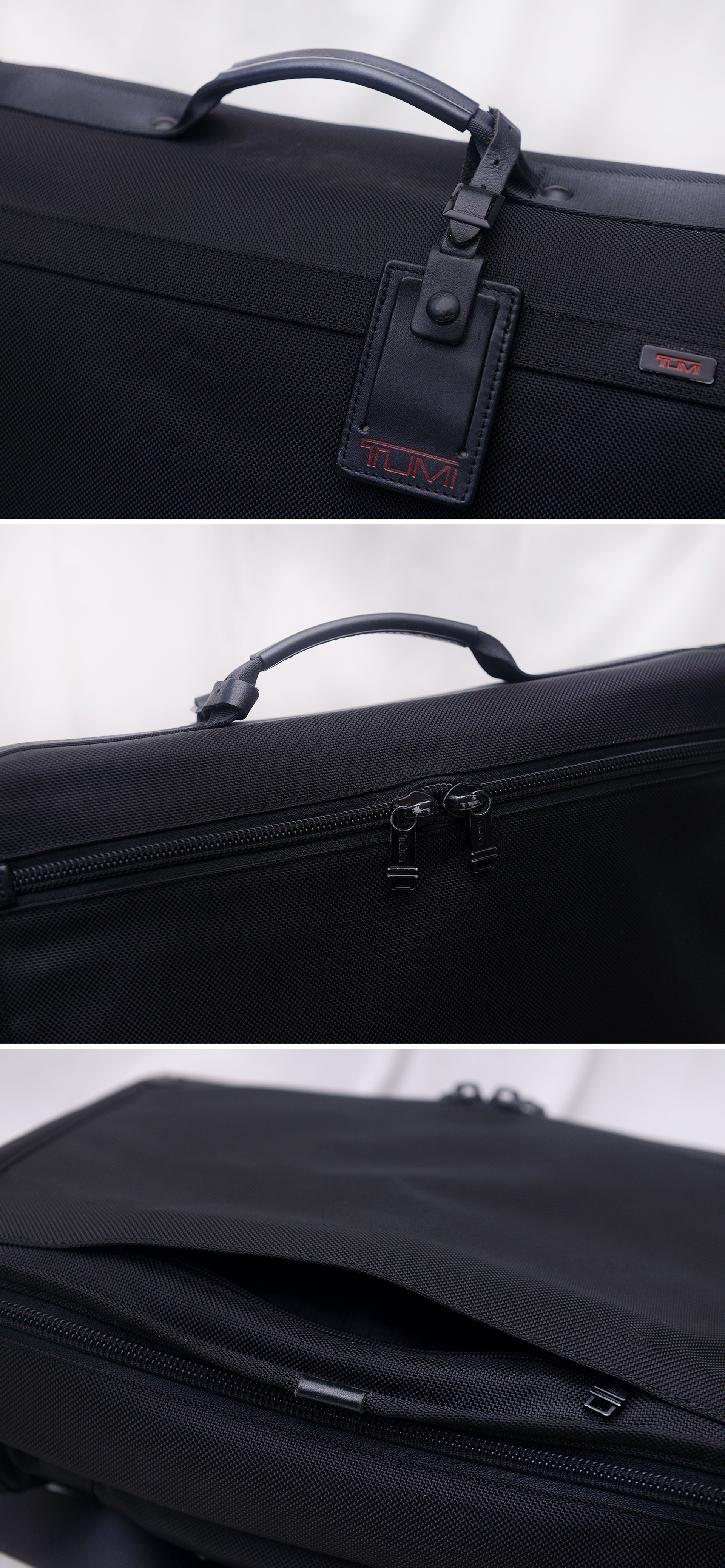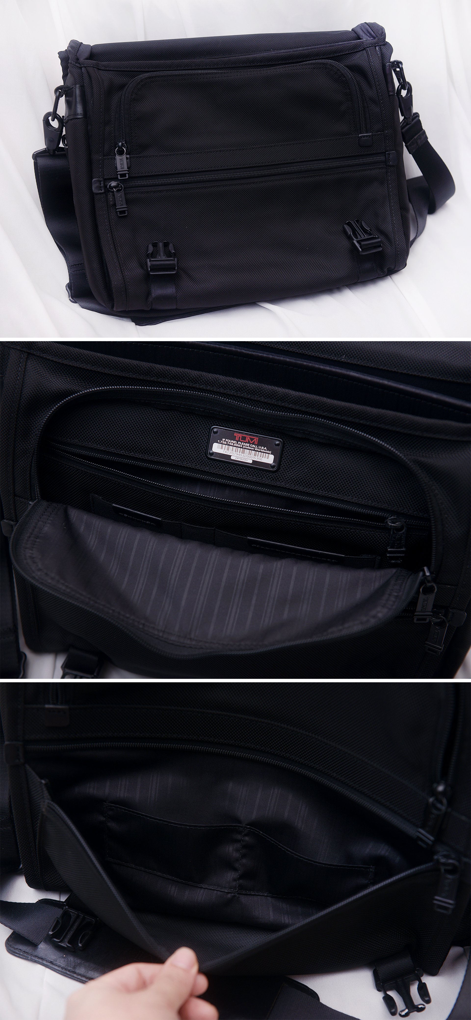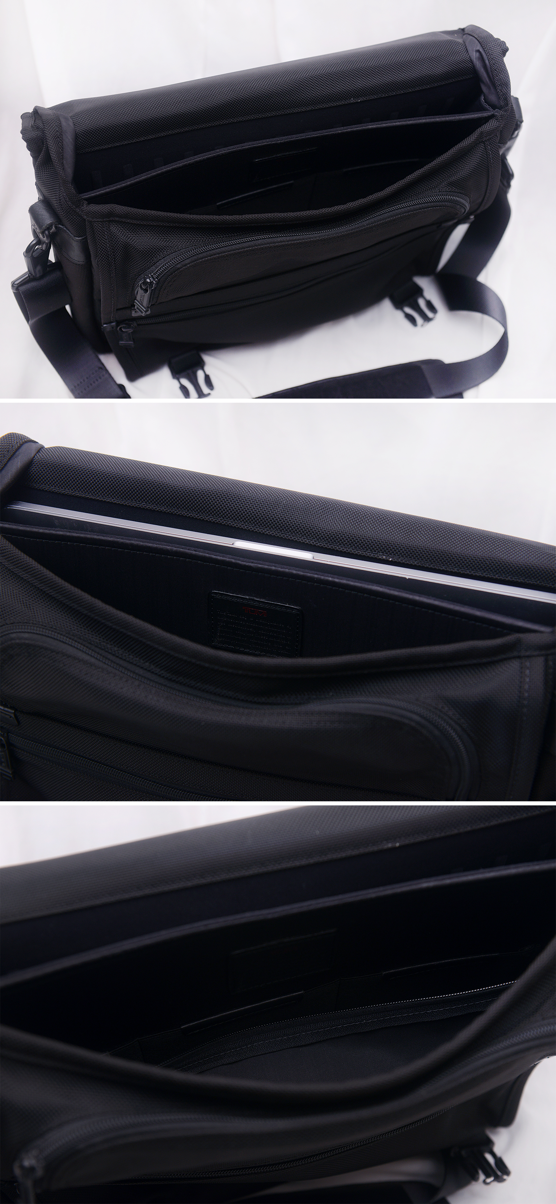 투미 고급형 빅 사이즈 랩탑 브리프케이스 메신저백으로 투미답게 가볍고 튼튼한 방탄 나일론 캔버스 소재에 핸들 및 주요부위에는 최고급 풀그레인 나파가죽 트림 되어 있고 후면 지퍼 포켓 열어서 캐리어 손잡이 결합 가능한 에드어백 시스템등 내.외부 포켓 구성 일일이 다 열거하기 힘들정도로 다채롭게 잘 되어있어 수납성.편의성 매우 좋습니다. A4 서류파일 및 15-16인치급 노트북 넉넉하게 수납 가능합니다.