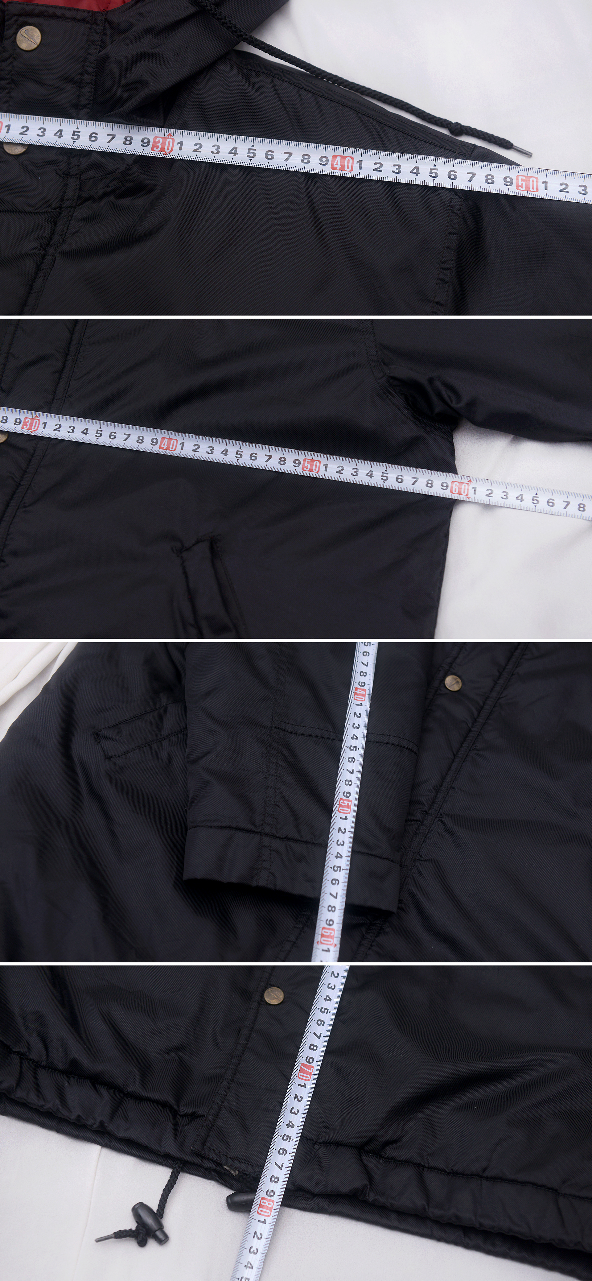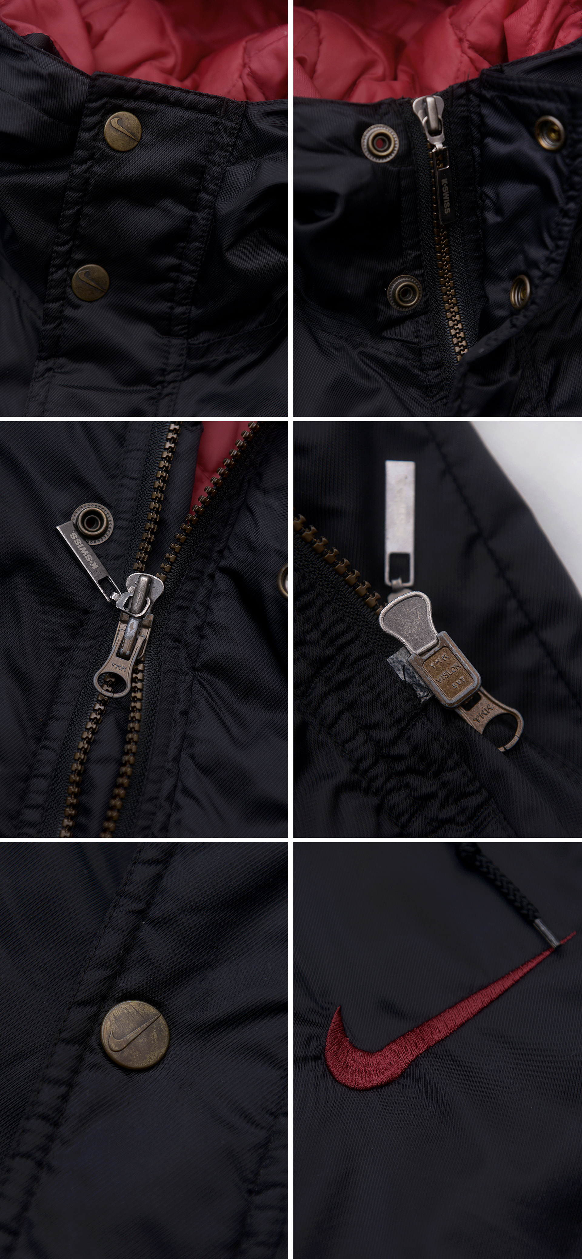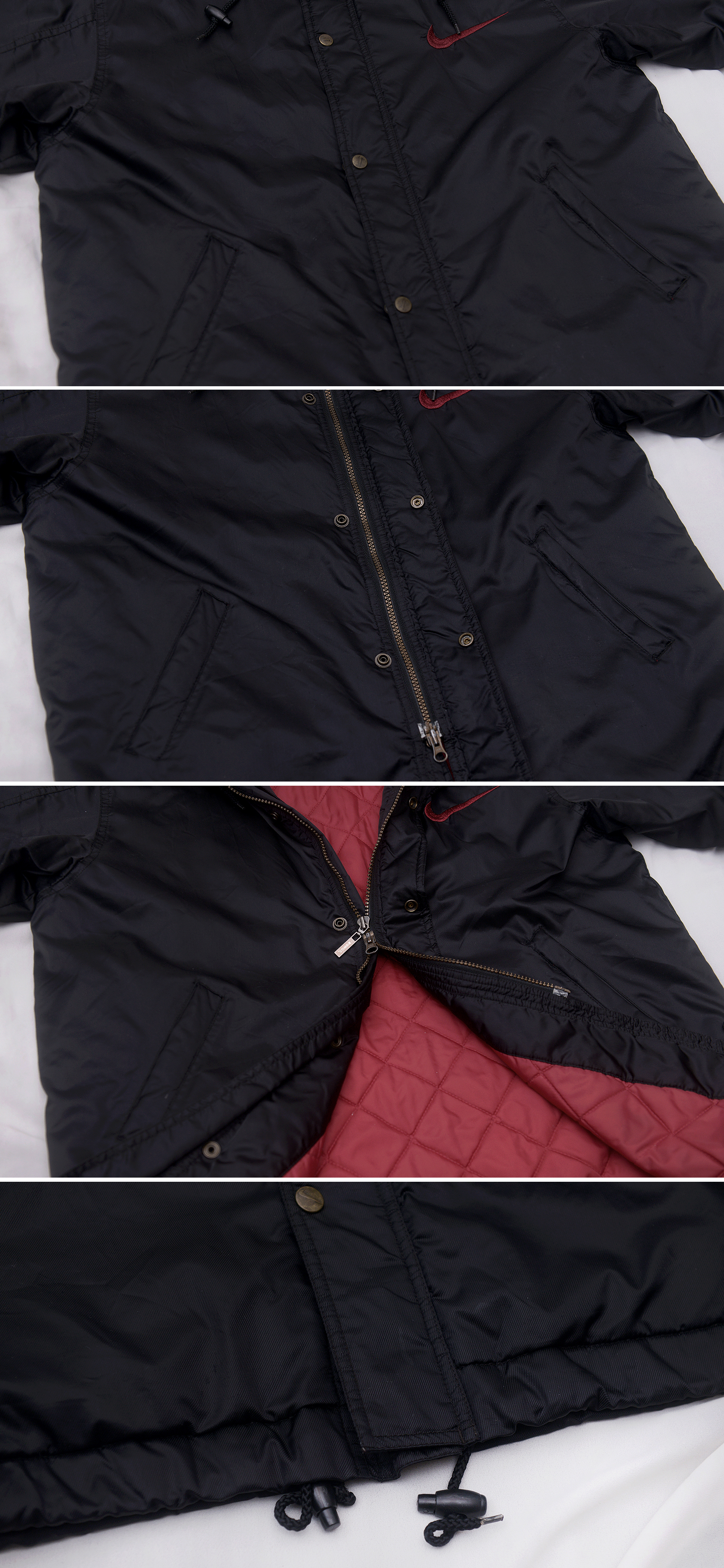 90년대 나이키 시그니쳐 컬러웨이 블랙.레드 컬러 일명 검빨 컬러 조합에 빅스우시 로고 들어간 멋스러운 올드스쿨 스타일 생활방수 나일론 소재 바람막이 코치 자켓 입니다. 요즘 나이키 제품들과 달리 품질.내구성 매우 좋게 나오던 90년대 제품이라 금속 단조 스냅버튼이나 YKK 비슬론 더블지퍼등 부자재 퀄리티와 만듬새 매우 좋습니다. 얇은 홑겹 아니고 안쪽으로 얇은 퀼팅 패딩 처리되어 있는 봄.가을 간절기부터 초겨울용 윈드 브레이커로 가벼우면서도 어느정도 보온성 좋아 편하게 걸치기 좋습니다.