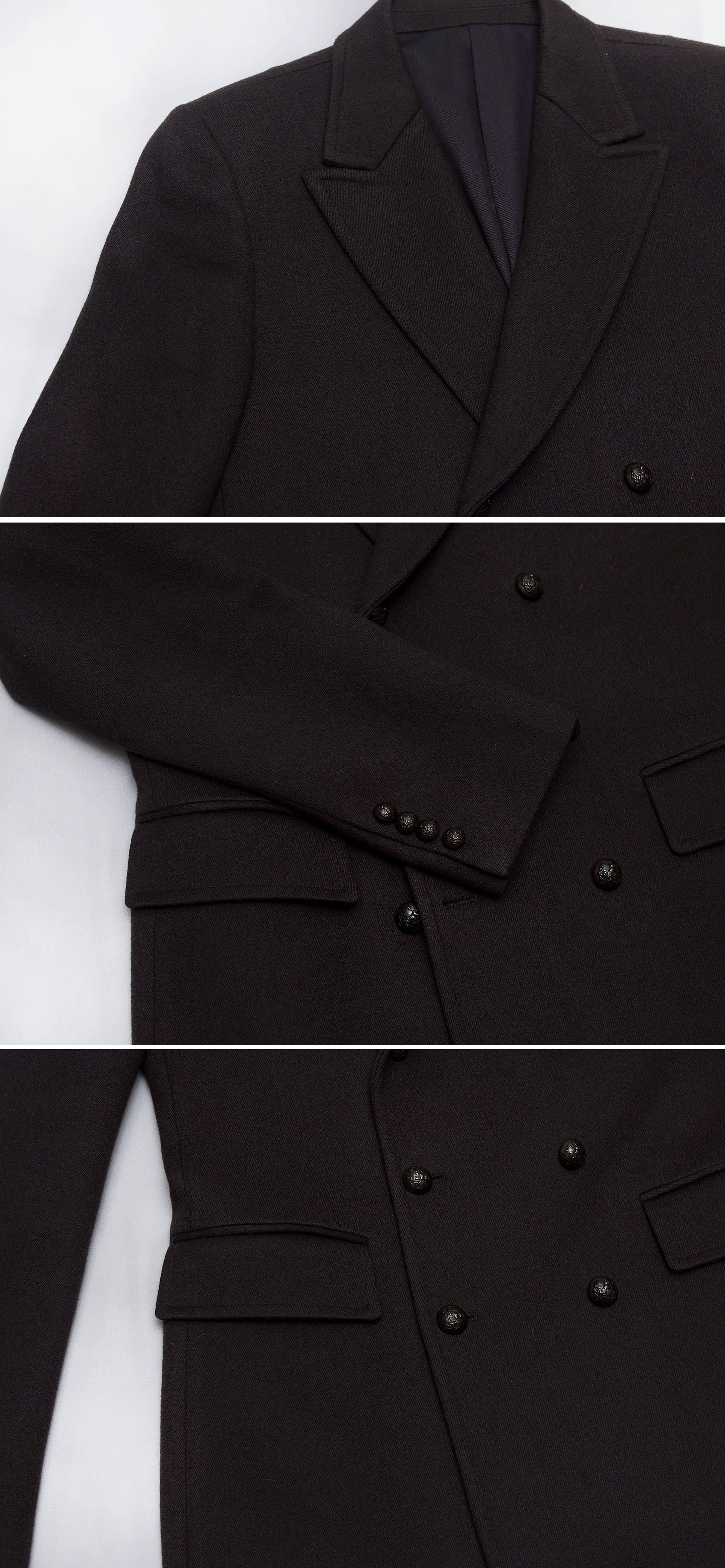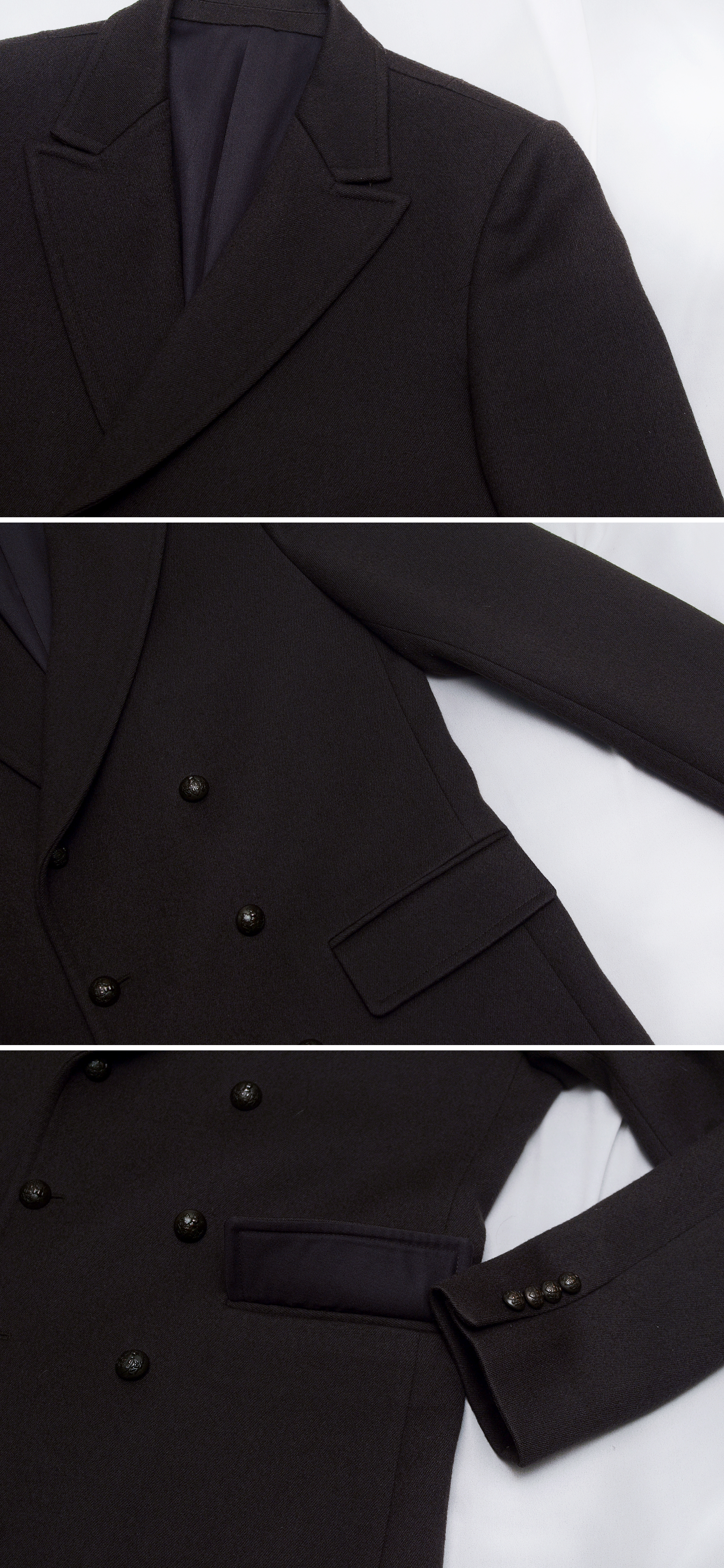 타임 옴므 퓨어울 더블 피코트 자켓입니다. 일명 탐망 (타임 발망) 코트라 불리는 타임옴므 FW 시즌 대표 시그니쳐 스타일 코트 자켓으로 짙은 암갈색 두툼한 두께감의 퓨어울 (울 100%) 소재로 탄탄하고 따듯합니다. 유러피안 클래식한 독일군 장교 제복 자켓처럼 딱 떨어지는 깔끔한 핏에 넓은 와이드 스타일 라펠과 클래식한 더블 단추 잠금 방식으로 카라 눕히고 단추 잠궈 클래식한 스타일로 입거나 단추 풀고 깃 세워서 높은 하이넥 스탠카라 타입의 클래식 캐쥬얼 스타일로 겨울철 터틀넥 등과 함께 매치해 멋스럽게 연출해 입기 좋습니다.