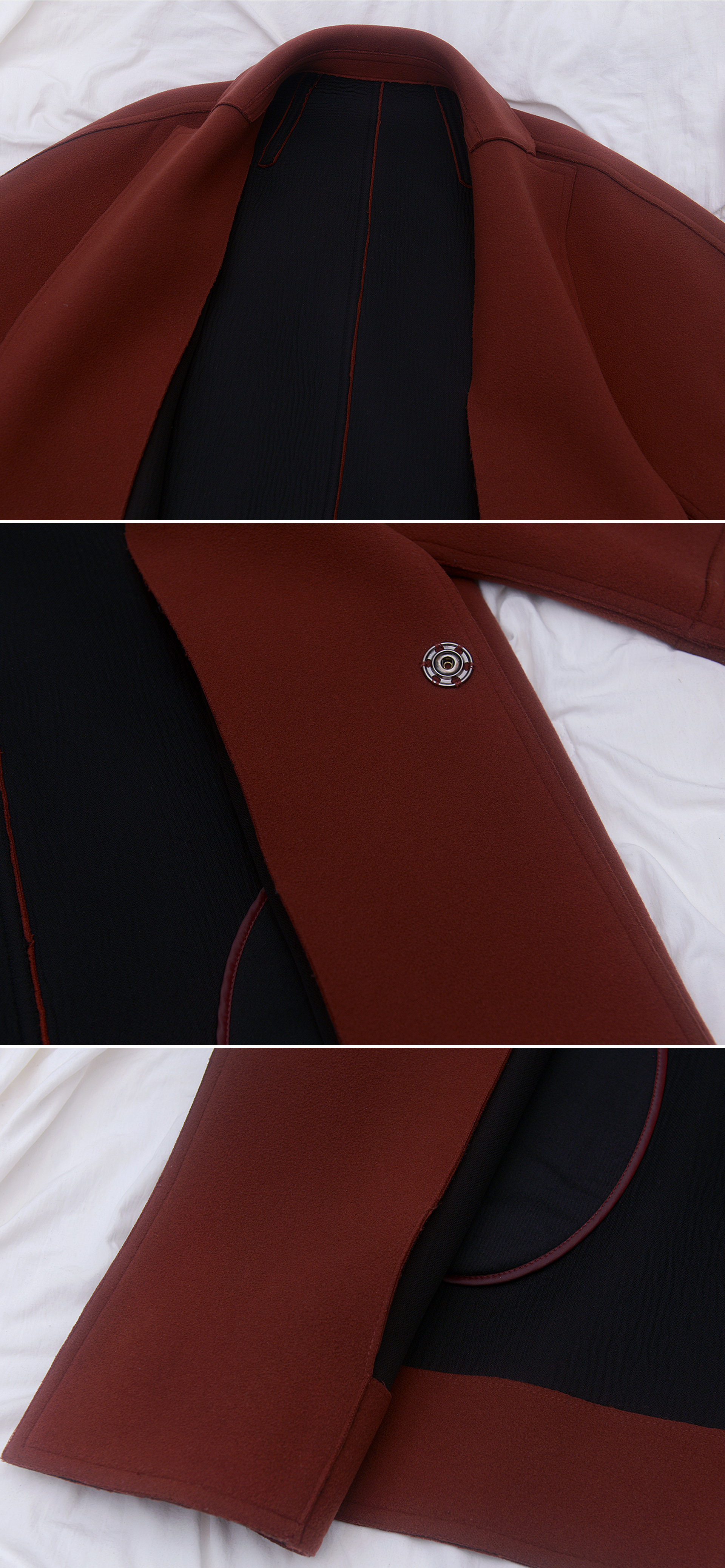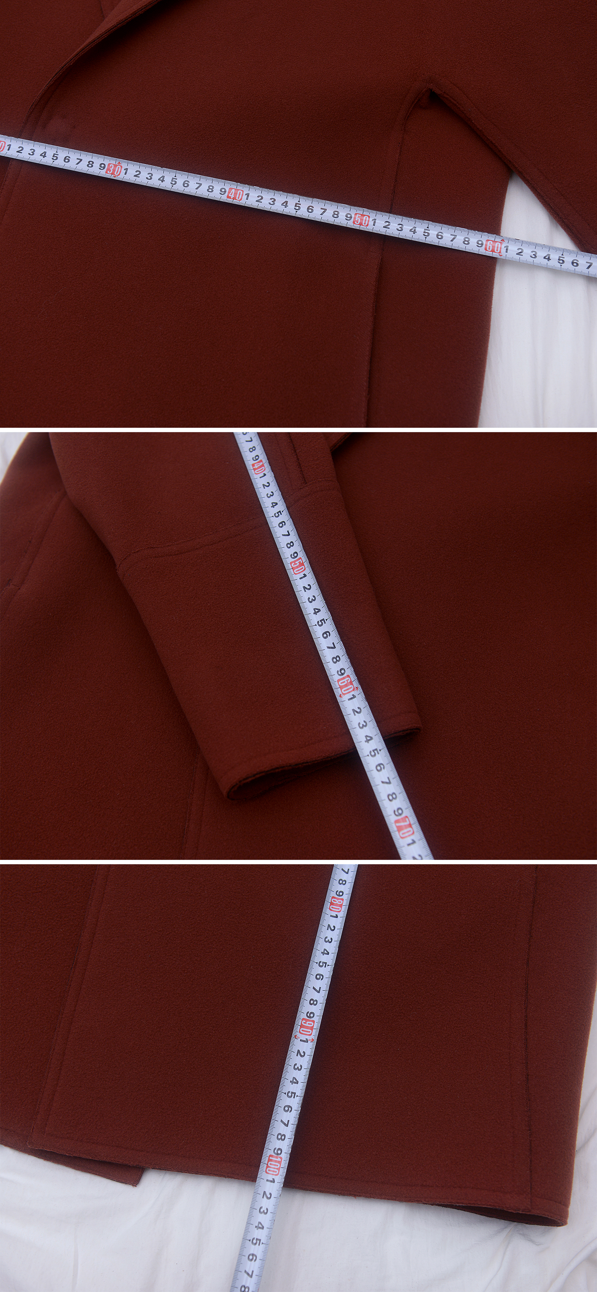 정도로 풀오버핏.맥시핏 스타일이라 일반 사이즈 기준 넉넉 100-105 오버핏 정도라고 보시면 될거 같습니다. 100-105 정도 입는 보통 체격 남성분들 입으면 딱 멋스러운 오버핏 스타일로 라인 정말 예술적으로 떨어지고 어느정도 키 크신 165-170 정도 보통 체격 여성분들이 막스마라 라브로 같은 느낌의 맥시핏으로 입어도 매우 잘 어울립니다. 자연스러운 착용감 정도 있으나 다른 겨울철 코트.아우터 많아 돌려가며 입는 편이고 주기적으로 드라이 클리닝해주며 관리해 눈에 띄는 파손.훼손없이 전체적인 상태 양호합니다.