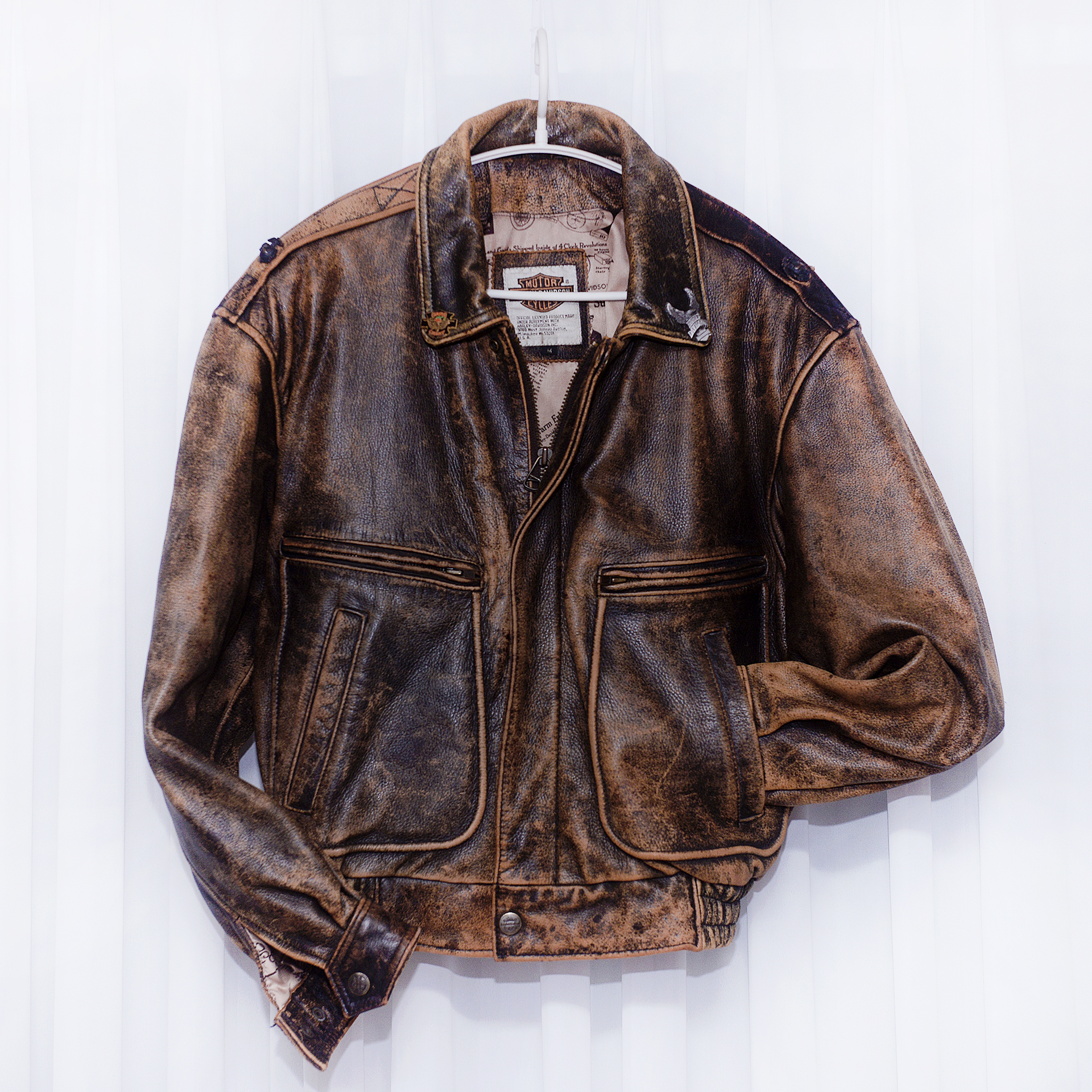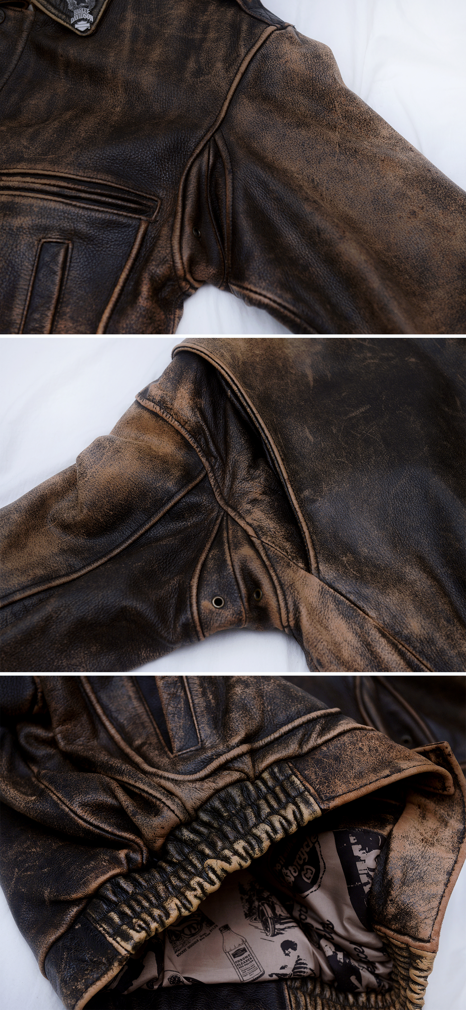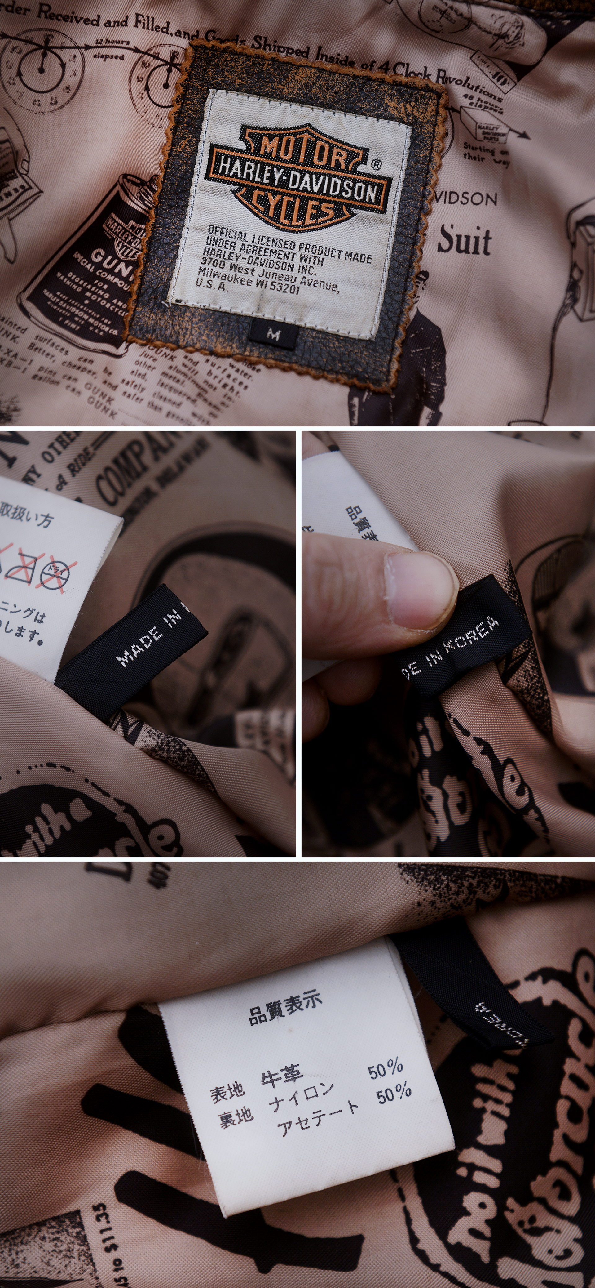 일본 할리 데이비슨 매장에서 보고 한눈에 반해 구입했던 자켓입니다. 할리 데이비슨 다운 독보적이고 유니크한 스타일과 두툼하고 탄탄한 풀그레인 소가죽 소재에 멋스러운 러스틱 워싱 가공되어 있고 안감에는 멋스러운 빈티지 스타일 카툰 프린트 되어 있어 멋스러움 가득한 가죽 라이더 숏자켓 입니다. 넓은 어깨선에 액션 플리츠 타입 이중 백플레인으로 활동성 매우 좋고 허리쪽으로 갈수록 좁아지는 패턴 라인에 밑단 밴딩 처리되어 있어 펄럭거리지 않고 딱 잡아줍니다. 두툼하고 탄탄한 풀레더 소재에 안쪽에 살짝 패딩처리 되어 있는 봄버 자켓으로 여름 제외하고 봄.가을부터 겨울철까지 멋스럽게 입기 좋습니다.