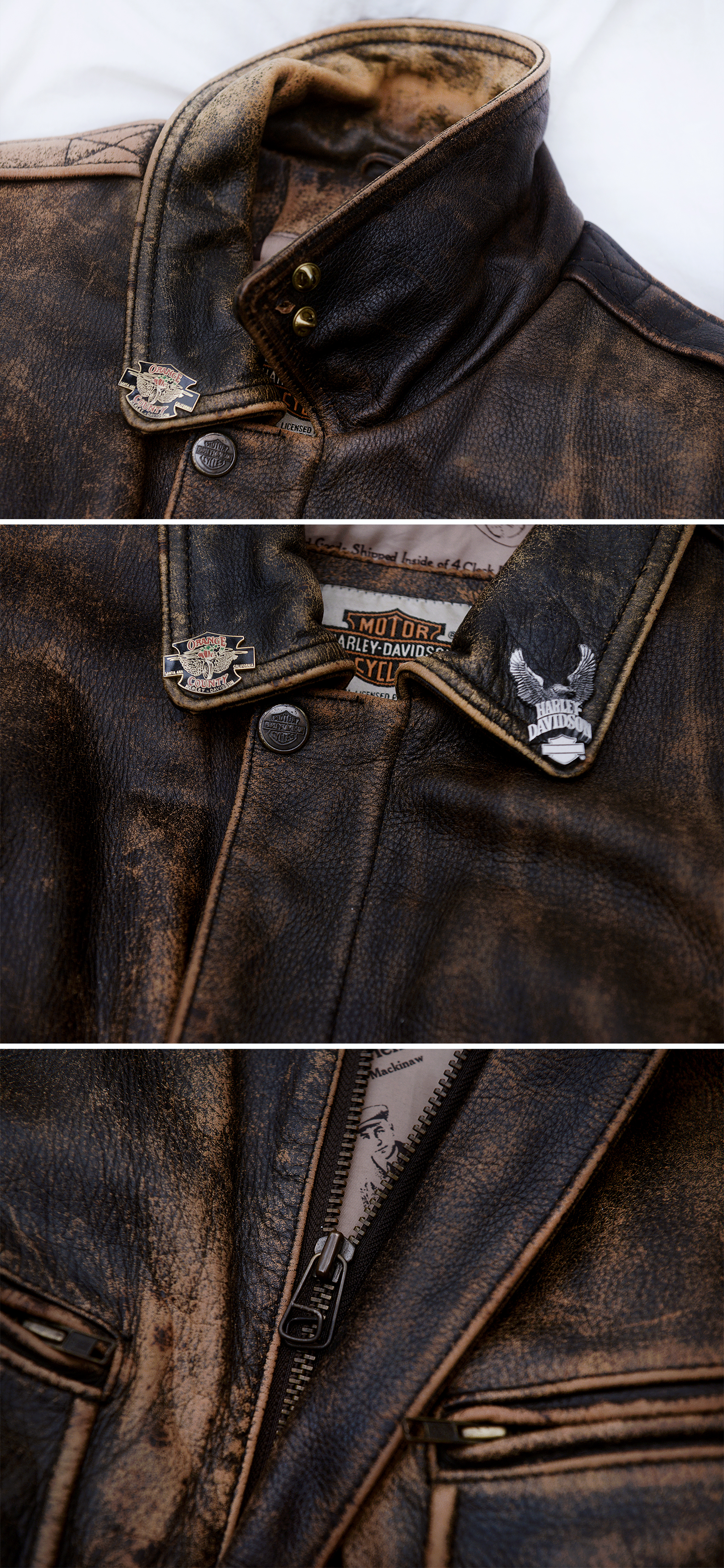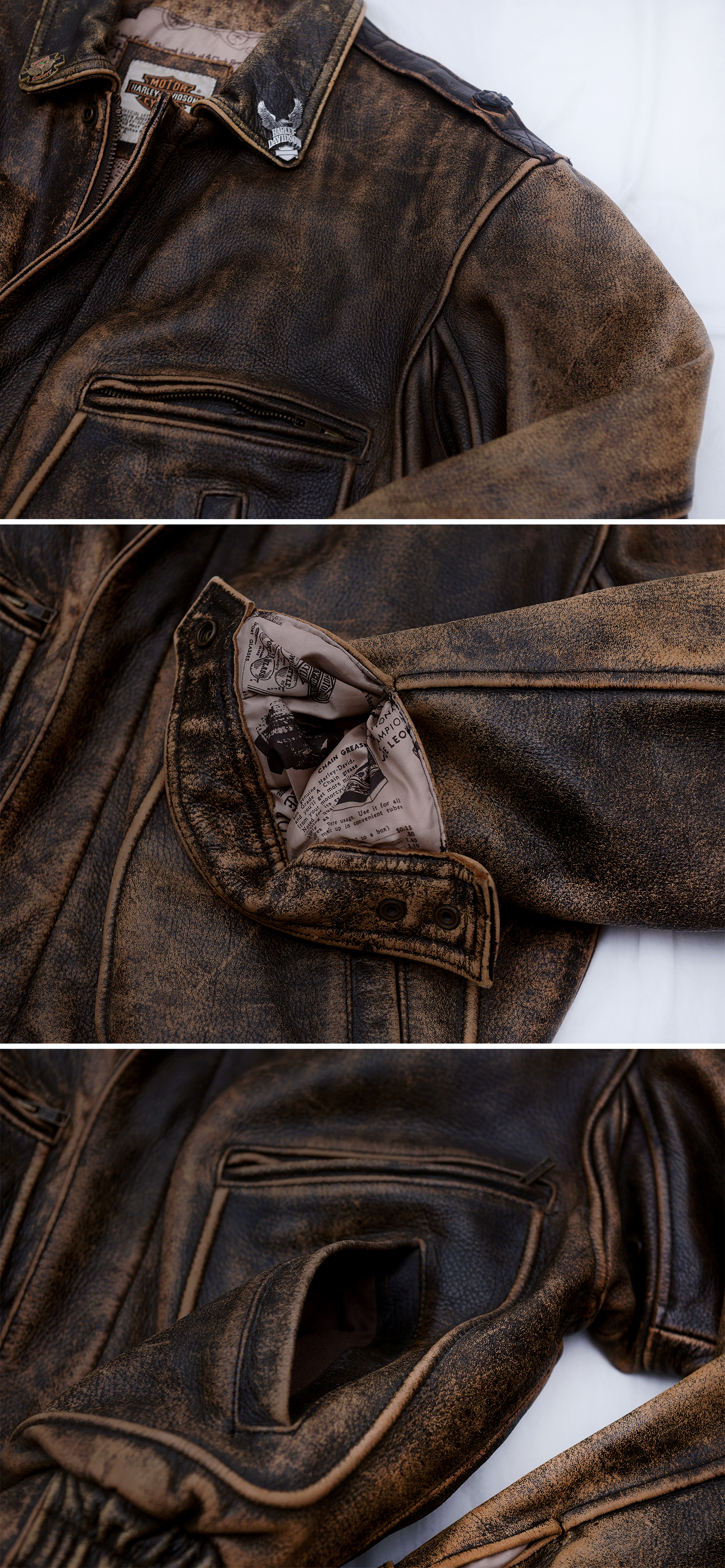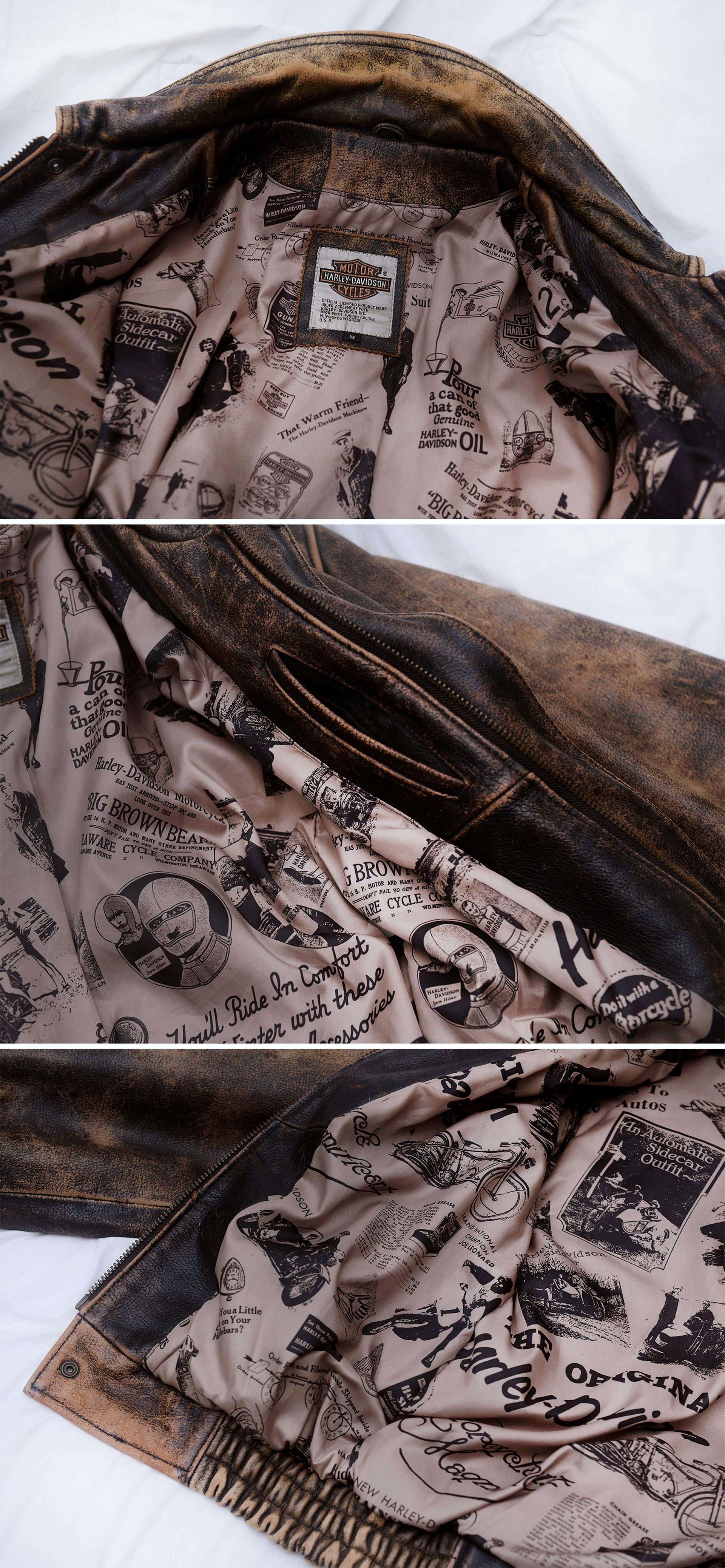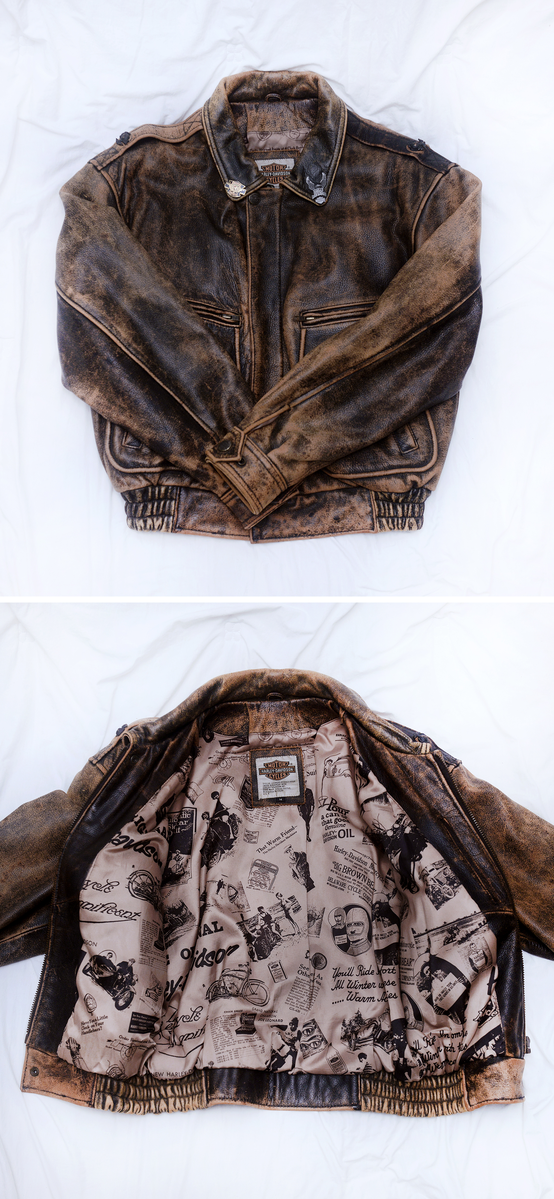 일본 할리 데이비슨 매장에서 보고 한눈에 반해 구입했던 자켓입니다. 할리 데이비슨 다운 독보적이고 유니크한 스타일과 두툼하고 탄탄한 풀그레인 소가죽 소재에 멋스러운 러스틱 워싱 가공되어 있고 안감에는 멋스러운 빈티지 스타일 카툰 프린트 되어 있어 멋스러움 가득한 가죽 라이더 숏자켓 입니다. 넓은 어깨선에 액션 플리츠 타입 이중 백플레인으로 활동성 매우 좋고 허리쪽으로 갈수록 좁아지는 패턴 라인에 밑단 밴딩 처리되어 있어 펄럭거리지 않고 딱 잡아줍니다. 두툼하고 탄탄한 풀레더 소재에 안쪽에 살짝 패딩처리 되어 있는 봄버 자켓으로 여름 제외하고 봄.가을부터 겨울철까지 멋스럽게 입기 좋습니다.