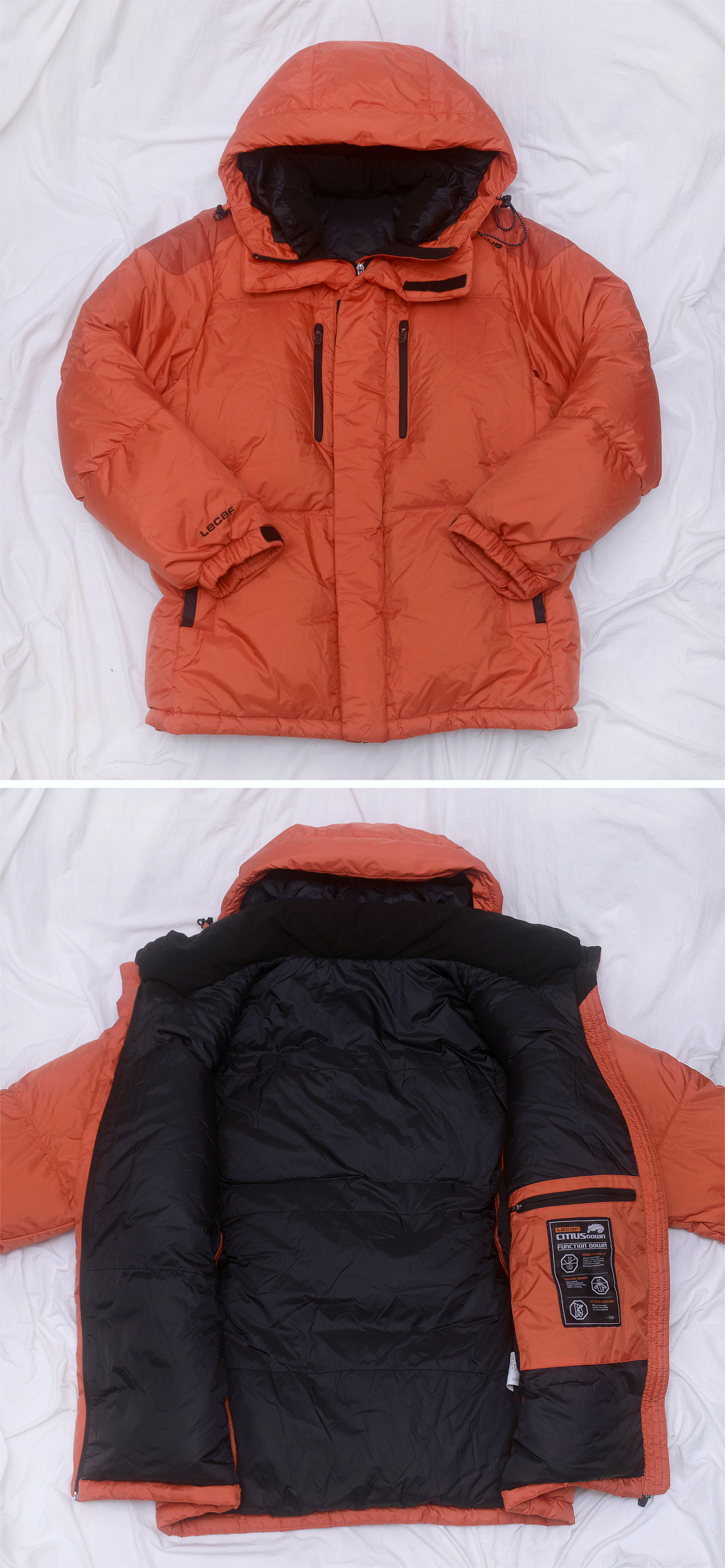 국산 스포츠 웨어 전문 브랜드 화승 르까프의 시티어스 펑션 헤비 구스다운 패딩 자켓 일명 르까프의 실수라고 불리는 최상급 대장급 패딩입니다. 후드 일체형에 풍성한 우모량 (450g 이상) 의 압도적인 헤비 구스다운으로 방수.방풍 기능성 발수.투습 소프트쉘 소재에 빠른 수분 건조로 불륨감 잘 유지되는 텔론 다운 소재 입체적인 패턴의 엑티브 모션 패턴등으로 가벼우면서도 방한성 압도적으로 따듯하고 포근하면서도 활동성 매우 좋습니다. 노스페이스나 파타고니아.콜롬비아등 다른 전문 산악용 패딩이나 몽클레어.캐나다구스등 유명 명품급 패딩들 많이 가지고 있지만 이만한 패딩 거의 보지 못한거 같을 정도로 역대급 가성비 헤비 구스다운 패딩입니다. 한겨울 야외에서 10시간 이상씩 일하는 영화.드라마 촬영 현장에서 스텝용으로 지급 받았던 패딩으로 방한성.기능성 확실히 보장합니다. 영하 10도 이하 한겨울 강추위에도 그야말로 포근하고 따듯합니다. 겨울철 등산.낚시.캠핑등 야외 활동용 방한 패딩으로 편하게 입기 좋습니다.