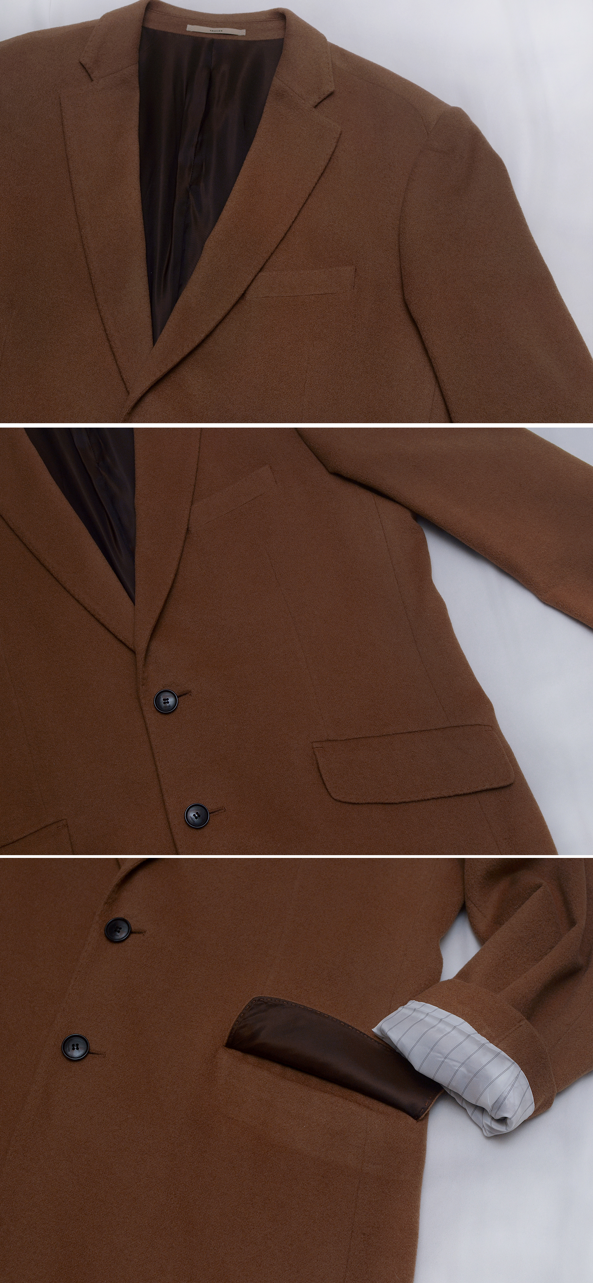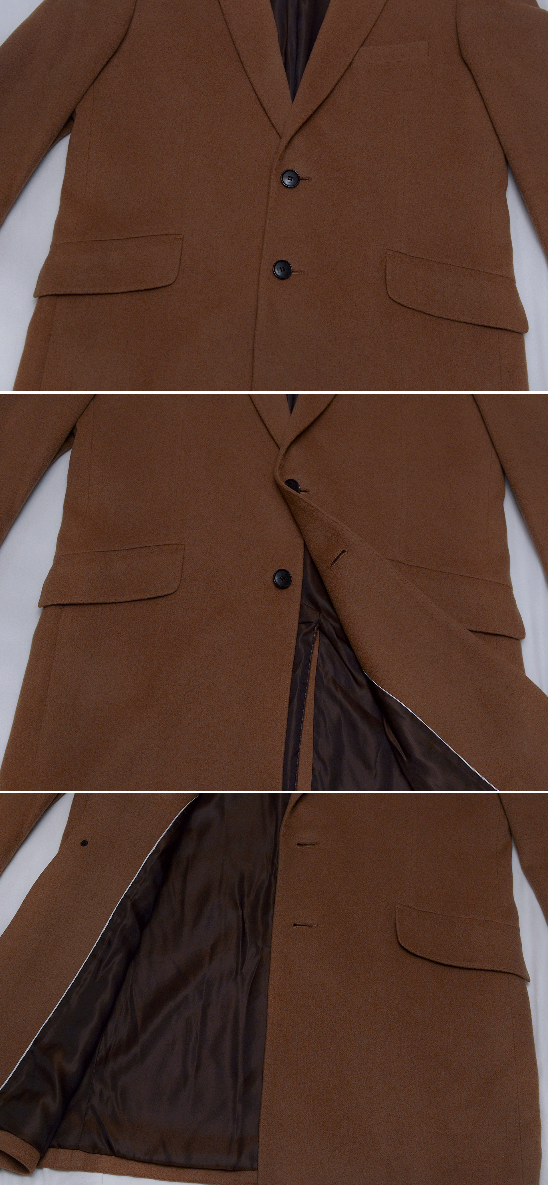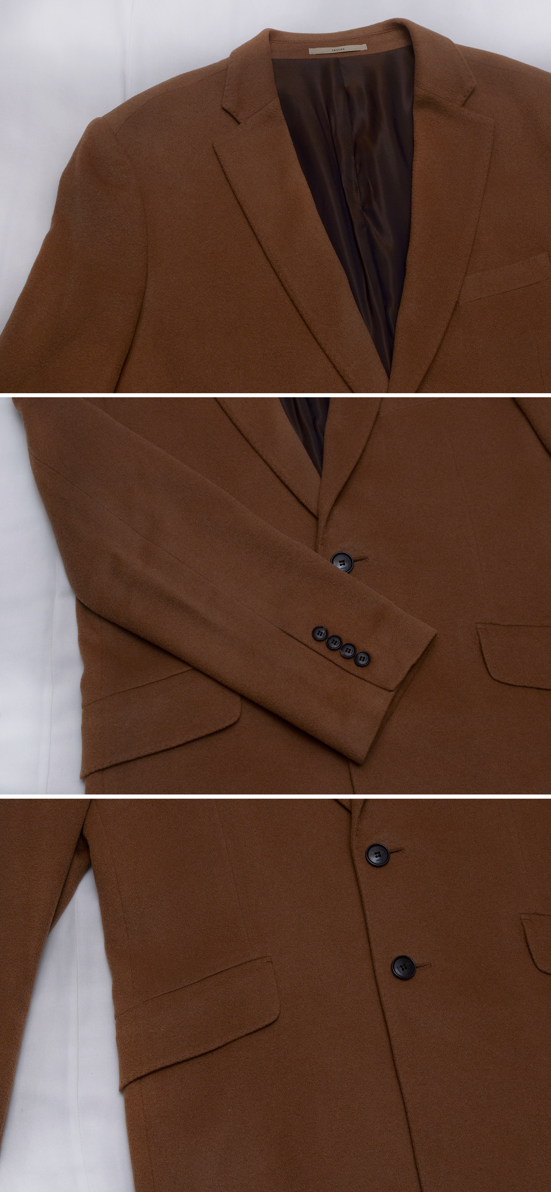 유러피안 스타일 하이 컨템포러리 남성복 브랜드 트루젠의 최고급형 백화점 매장판 캐시미어 클래식 핸드메이드 싱글 하프코트 자켓으로 깔끔하게 떨어지는 클래식 테일러드핏 스타일에 멋스러운 카라멜브라운 컬러의 캐시미어 51 울 49 혼용률로 고함량 캐시미어 특유의 고급스러운 지블링 광택과 흐르는 듯한 촉감 부드럽게 착 감기면서 가볍게 떨어지는 핏감 매우 좋고 가벼우면서도 보온성 높아 겨울철 포멀하고 깔끔한 스타일로 정장 위에 멋스럽게 걸치는 클래식 오버 코트부터 단독 코트자켓으로 멋스럽게 입기 좋습니다.