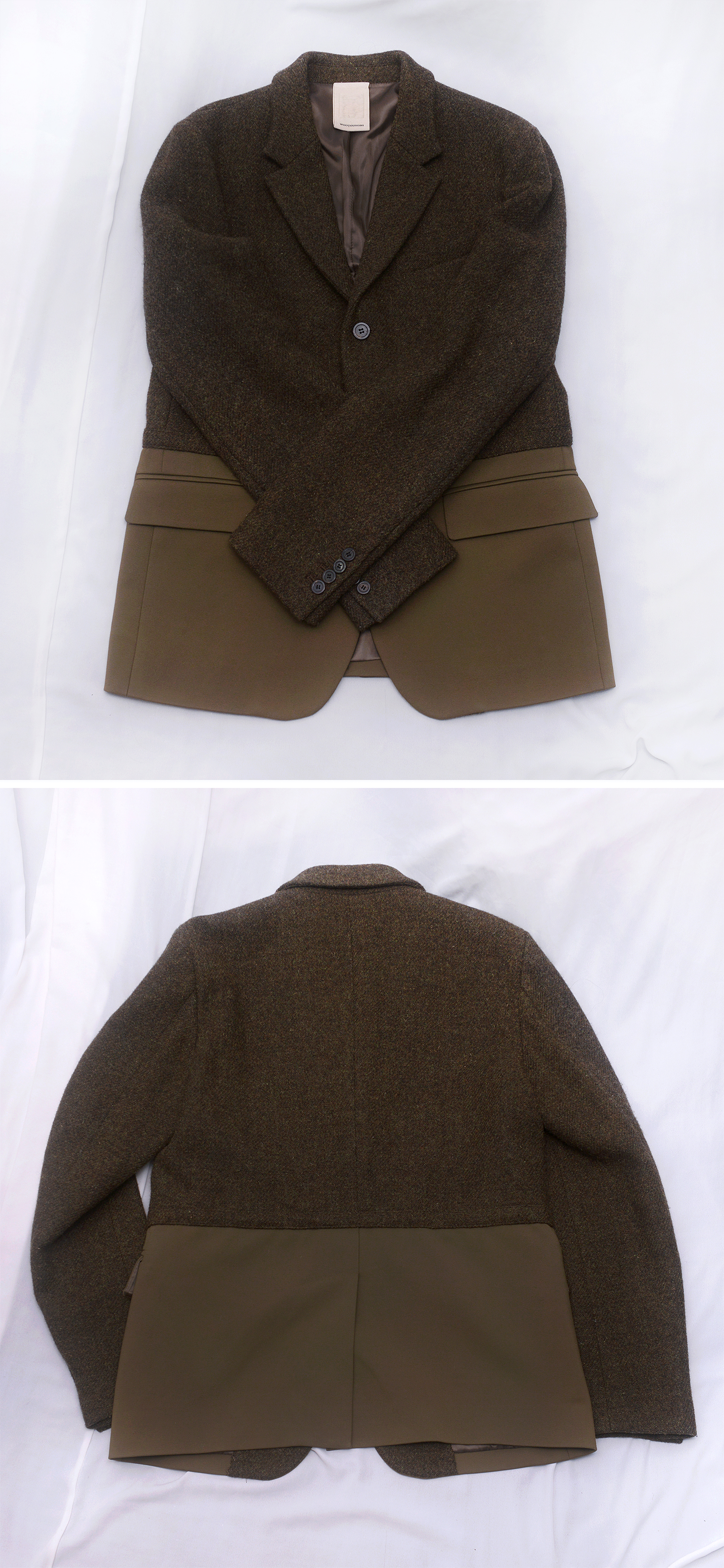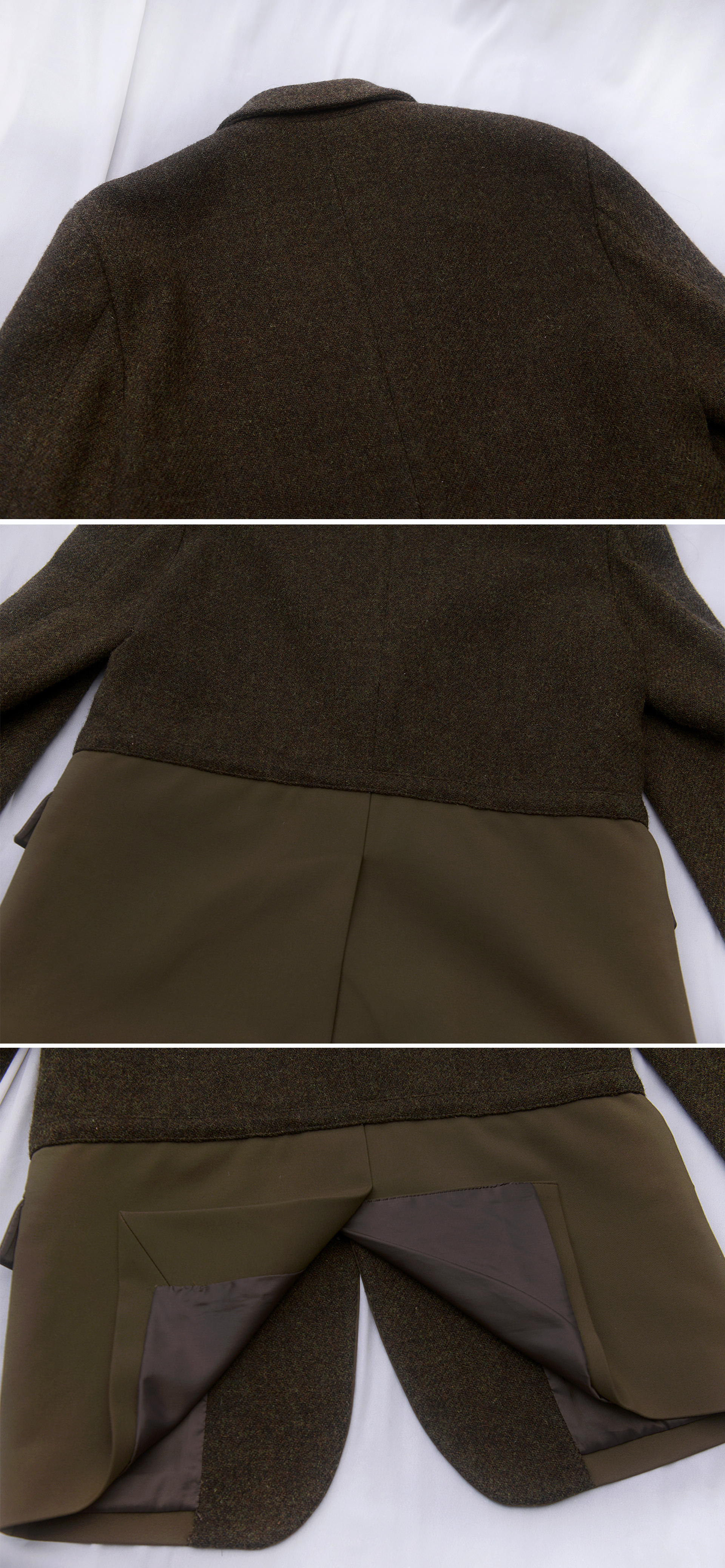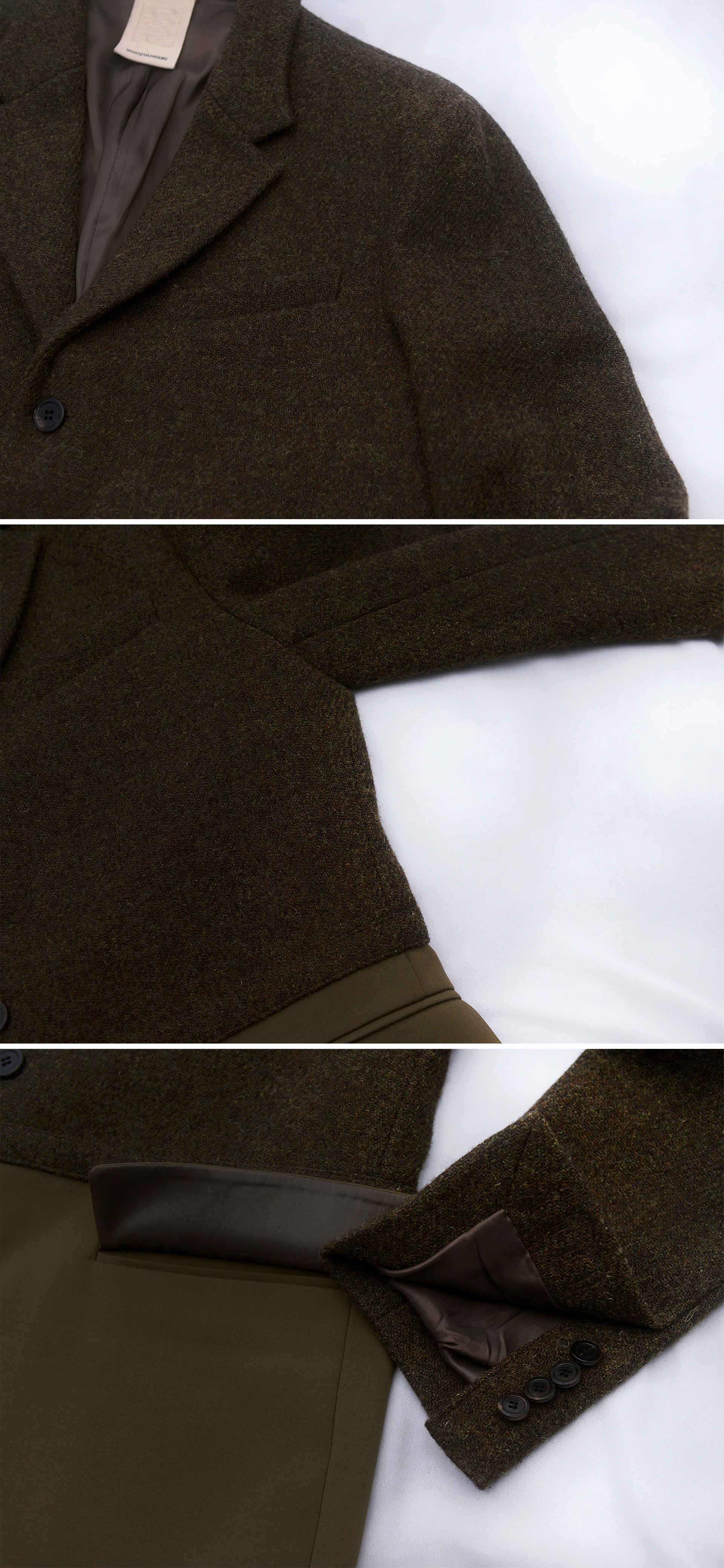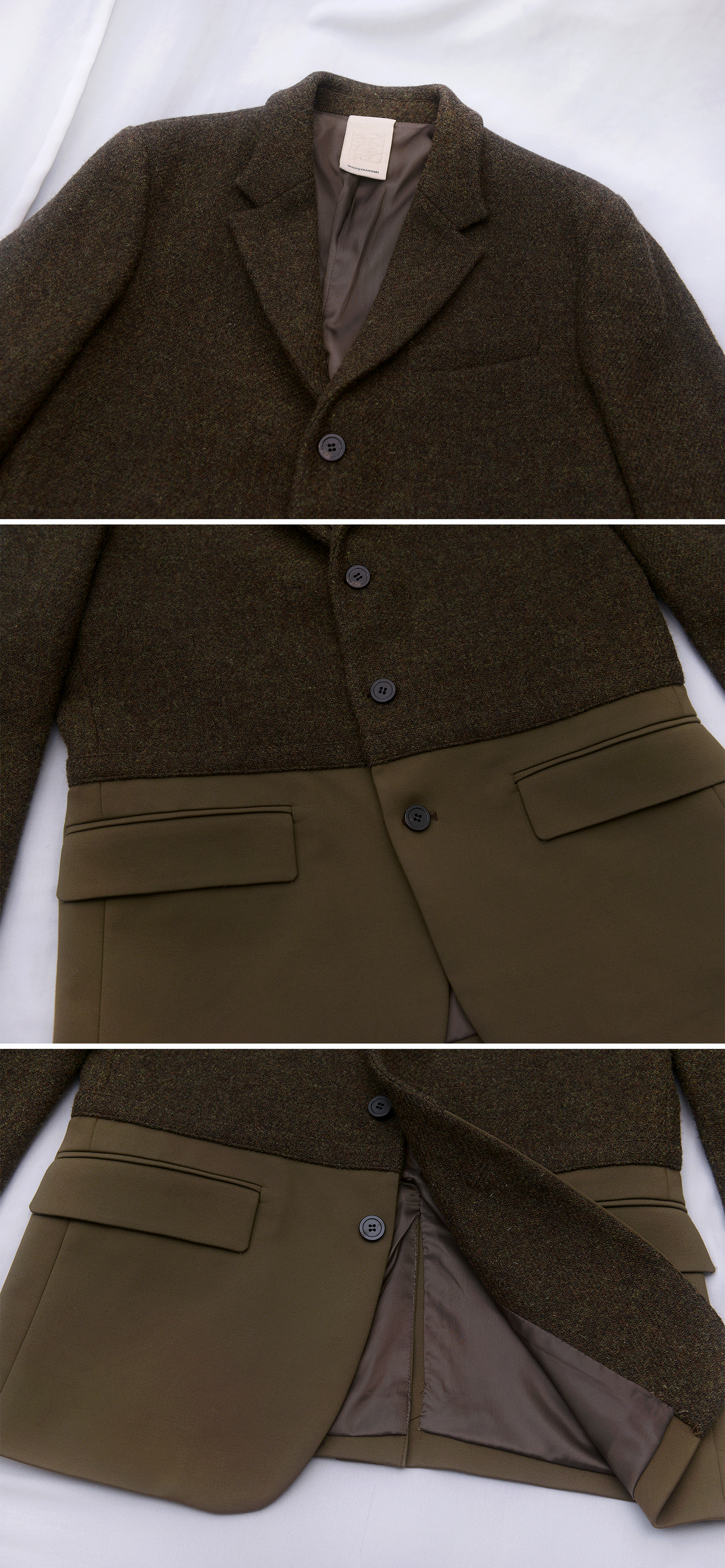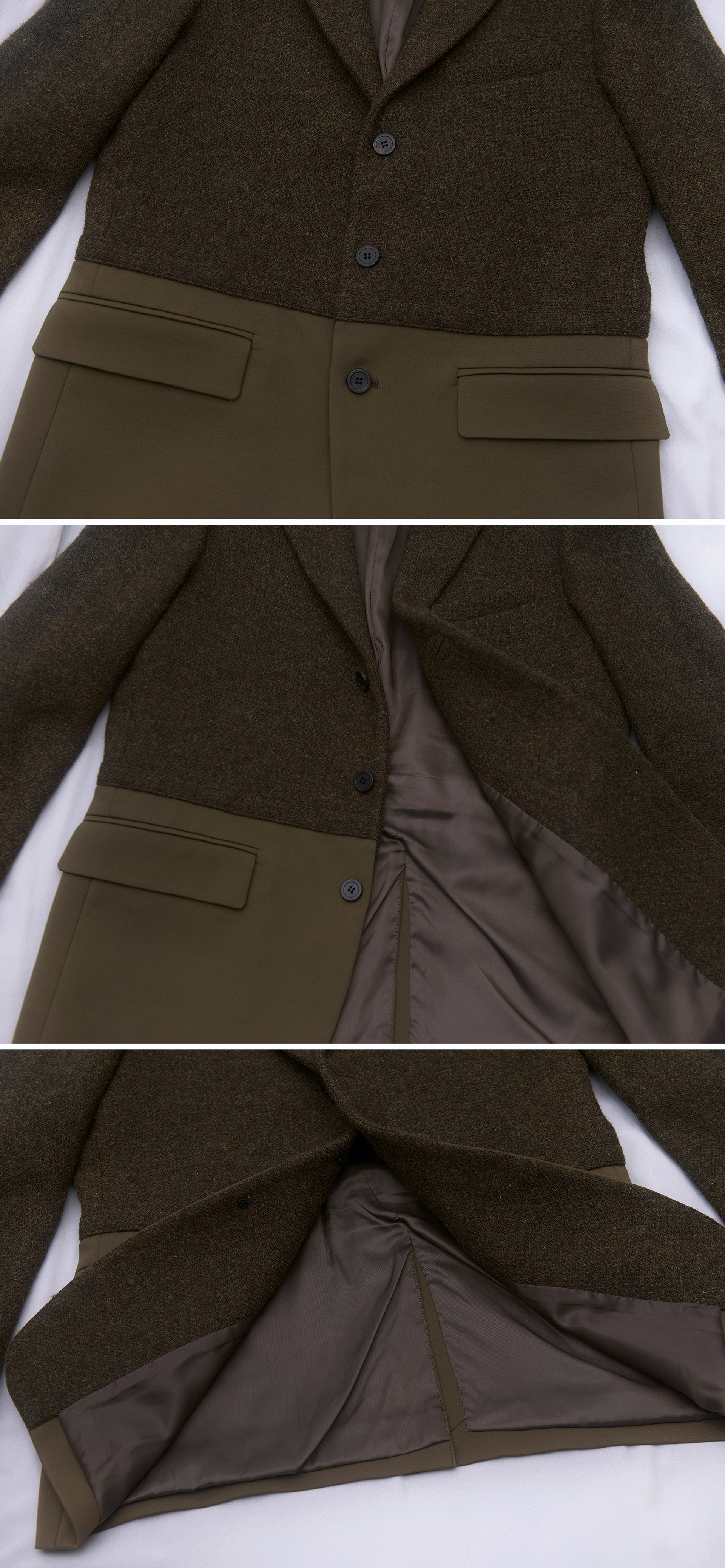 우영미다운 깔끔하고 우아한 라인에 최상급 핸드우븐 퓨어울 해리스 트위드 소재를 이용한 투블럭 스타일 컬러.소재가 결합된 유니크하고 멋스러운 가을.겨울철 블레이저 자켓 입니다. 우리나라를 대표하는 최고의 명품 남성복 패션 디자이너 브랜드답게 지나치게 과하지 않으면서도 눈길을 돌아보게 만드는 소재와 컬러가 멋스럽게 조합된 디자인이라 입고 나가면 늘 어디꺼냐고 질문 받던 자켓이네요. 적당히 두께감 있어 봄.가을철 단독 아우터로 입거나 겨울철 이너 자켓으로 코트안에 멋스럽게 입기 좋습니다.