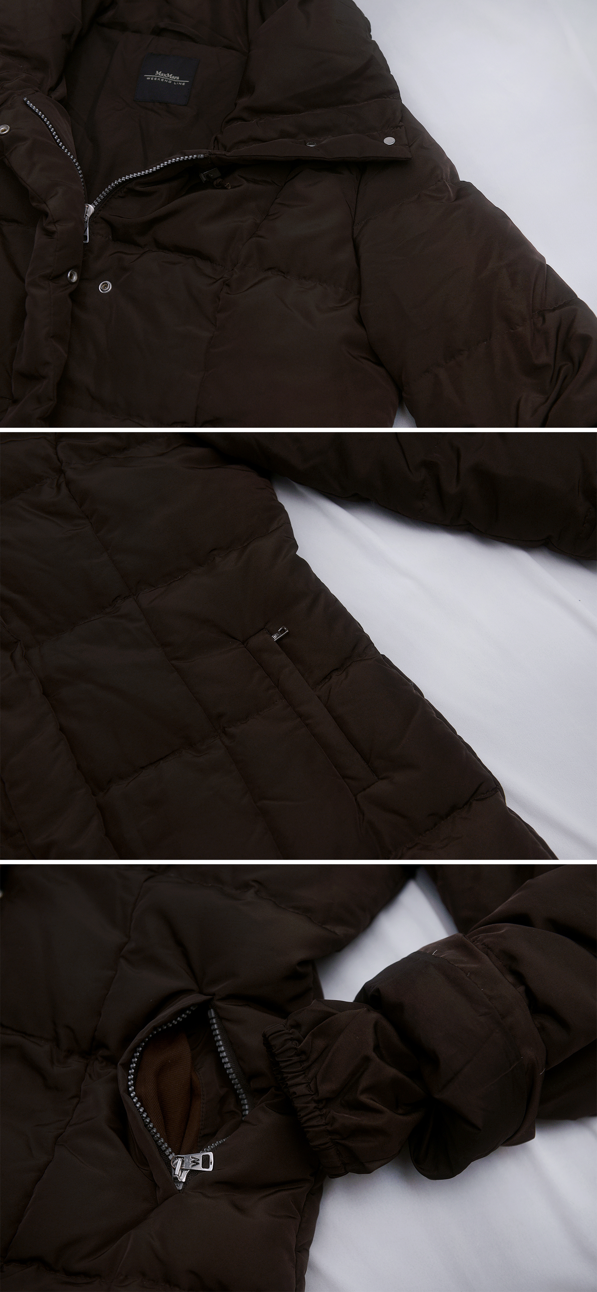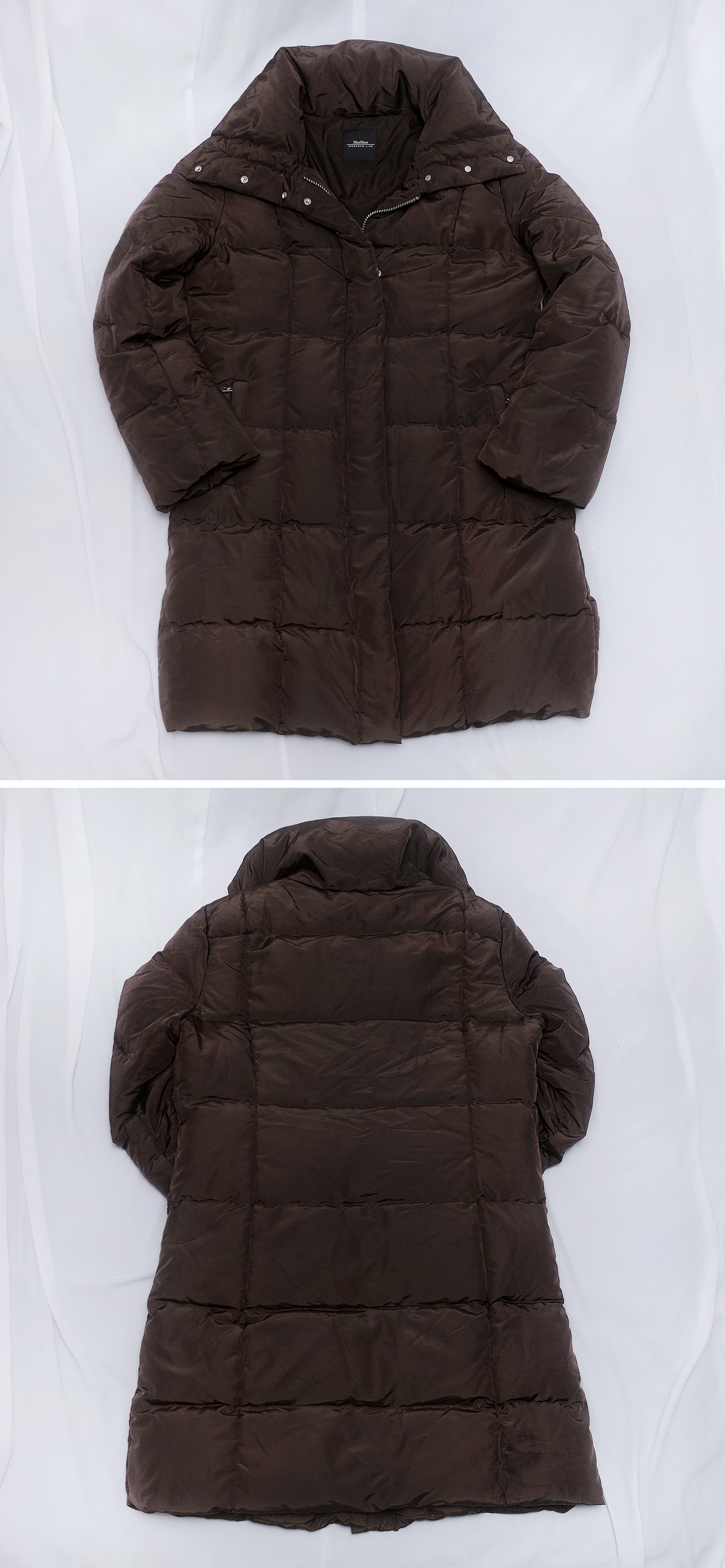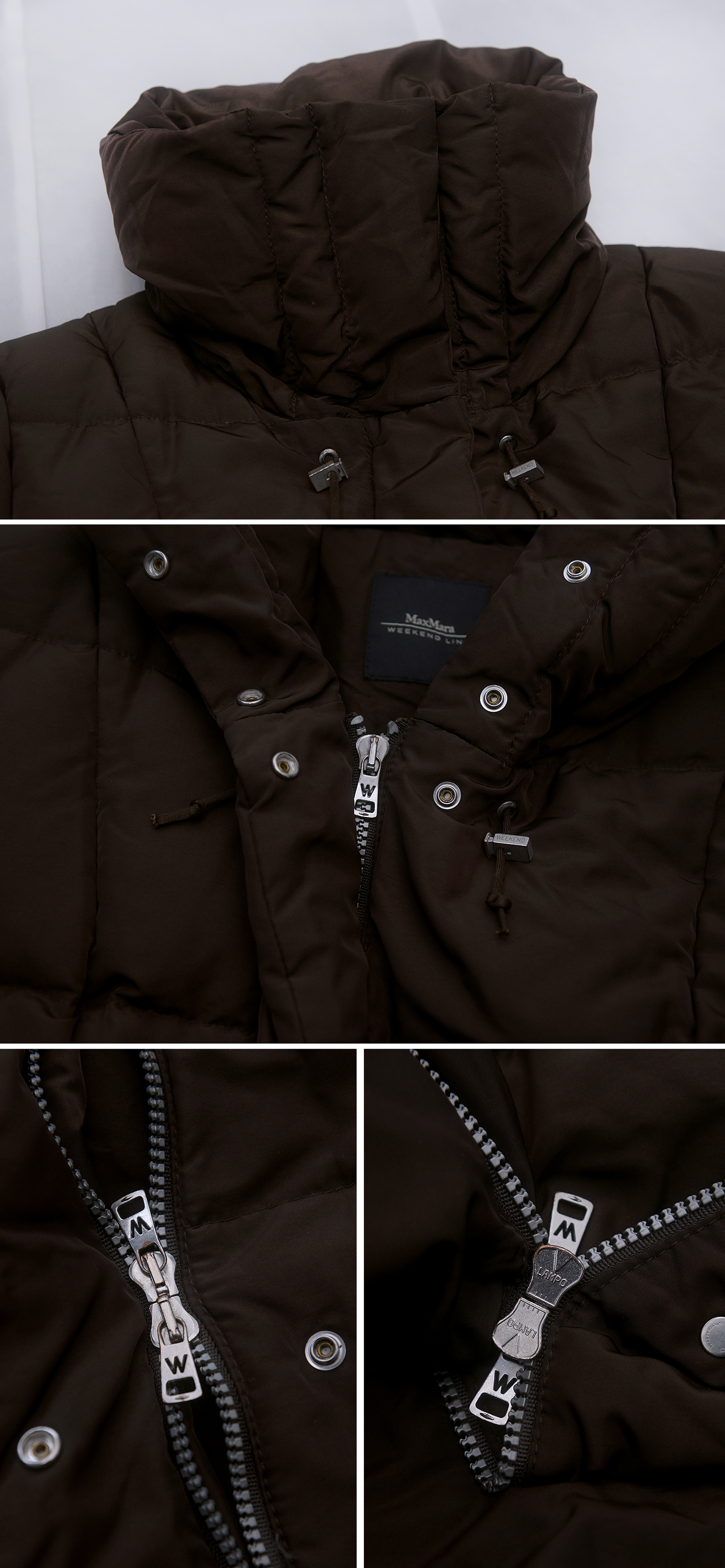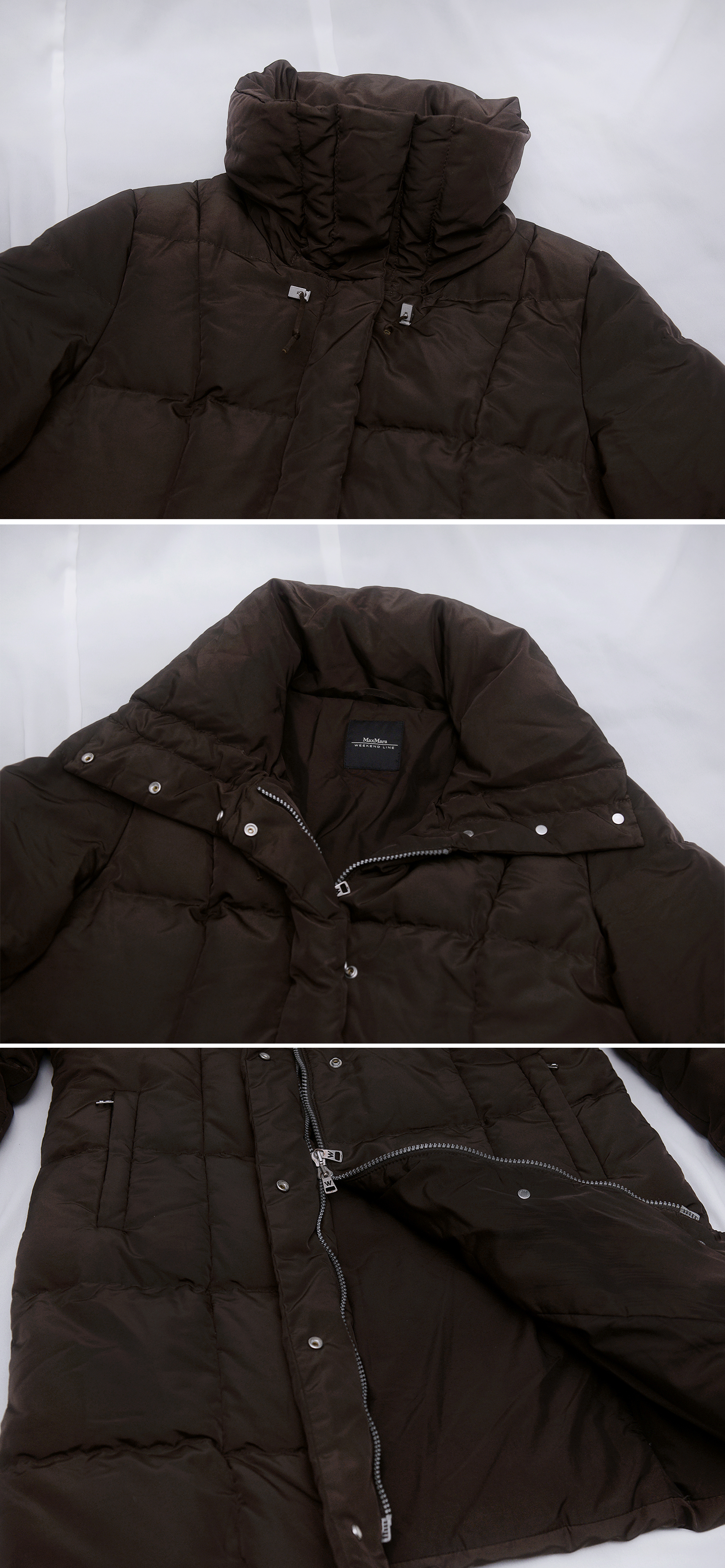 막스마라 위켄드 라인 하이넥 와이드카라 구스다운 롱패딩 코트 입니다. 몽클레어 탈레브나 아보세트와 비슷한 느낌으로 자연스럽게 우아한 A 라인으로 떨어지는 핏의 롱패딩 코트 타입 이면서도 막스마라다운 고급스러운 스타일 돋보이는 롱패딩 코트로 차분하고 고급스러운 다크 초코 컬러의 가볍고 광택감 있는 소위 말하는 프라다 포코노 방수방풍 나일론.폴리 소재 겉감 소재에 구스다운 충전재 풍성하게 채워져 있는 헤비다운 롱패딩 코트로 매우 가볍고 버튼.지퍼 이중 잠금 타입에 높게 하이넥으로 채워 올릴 수 있는 넓은 와이드 카라 형태로 되어있어 별도의 머플러등 필요없이 한겨울에도 충분히 멋스러우면서도 가볍고 따듯하게 입기 좋습니다. 막스마라 캐쥬얼 서브 위켄드 라인이지만 막스마라다운 뛰어난 만듬새와 람포 지퍼등 소재.부자재 퀄리티 훌륭합니다.