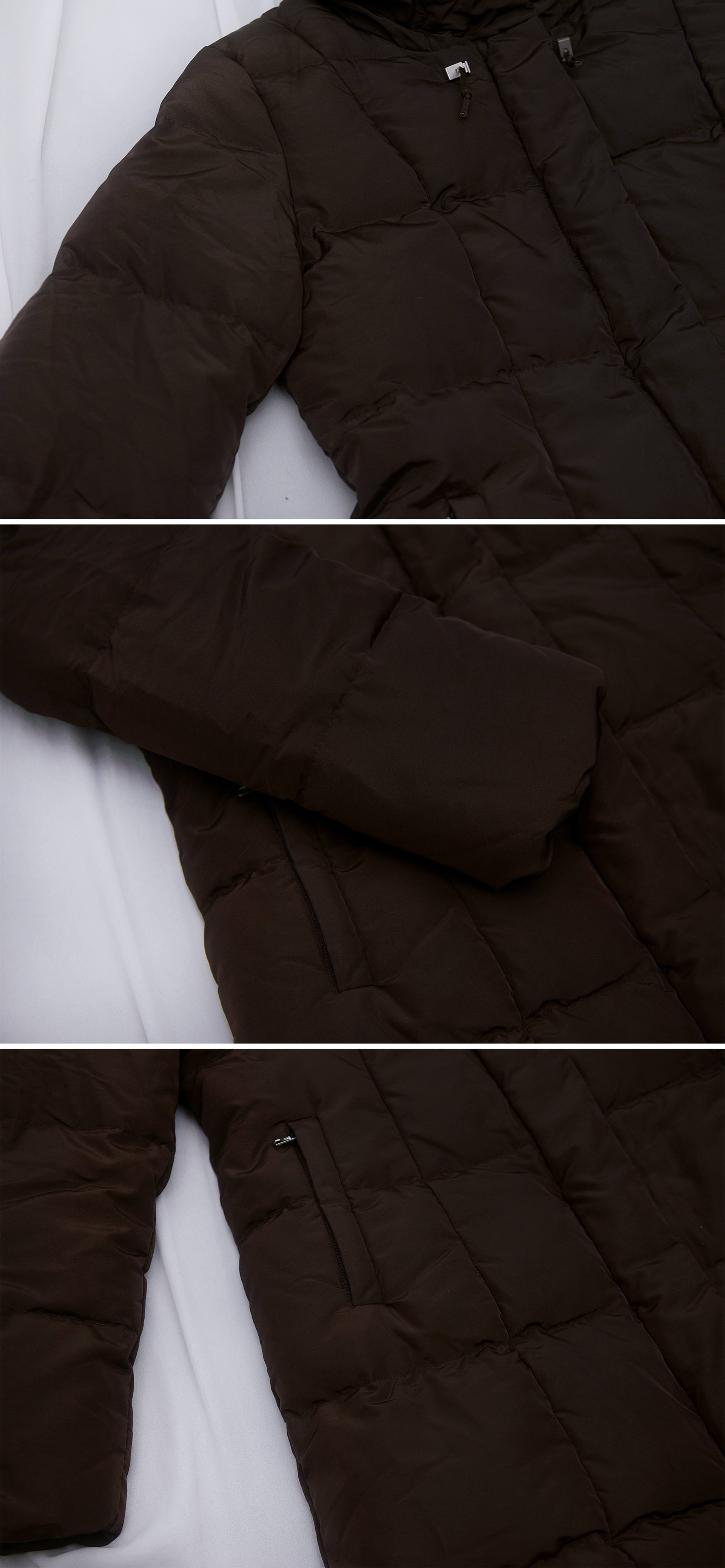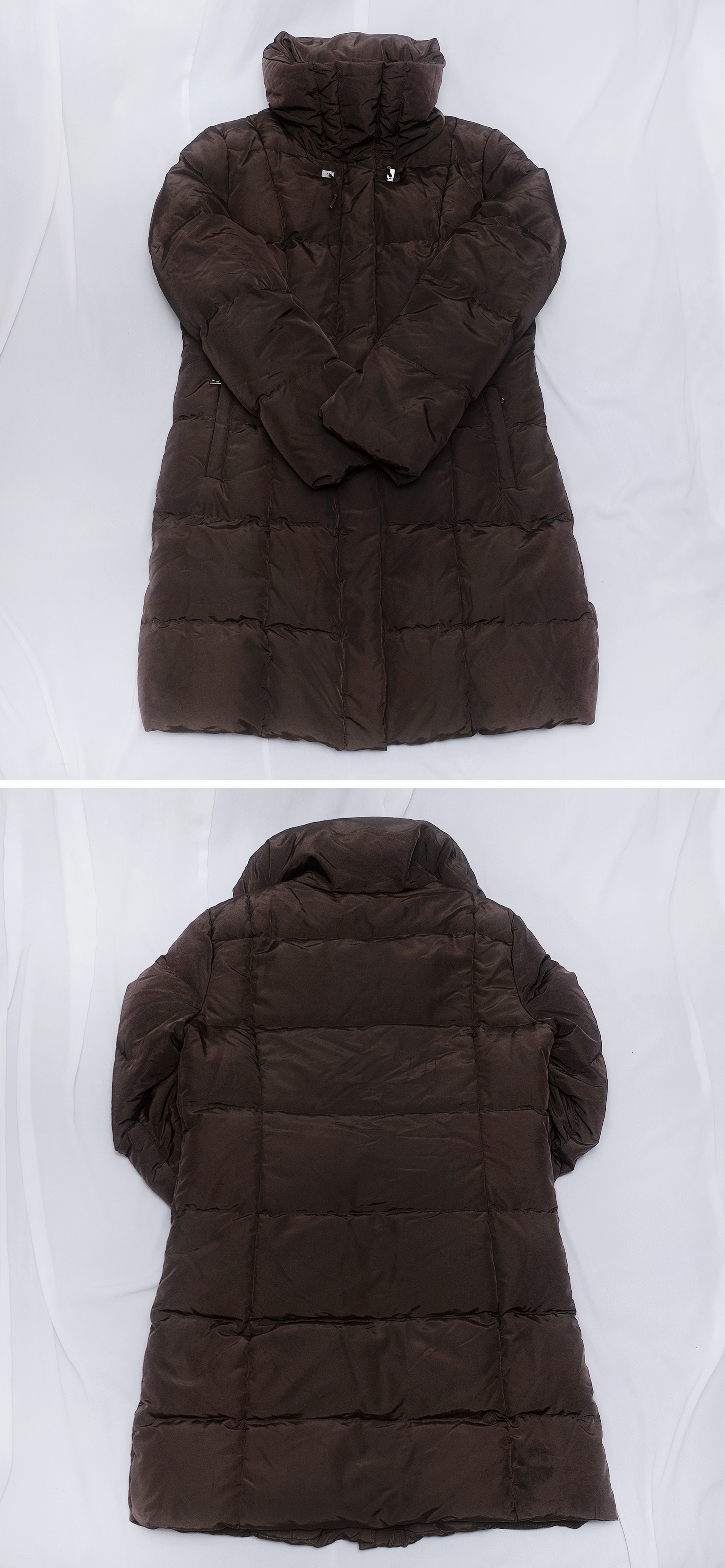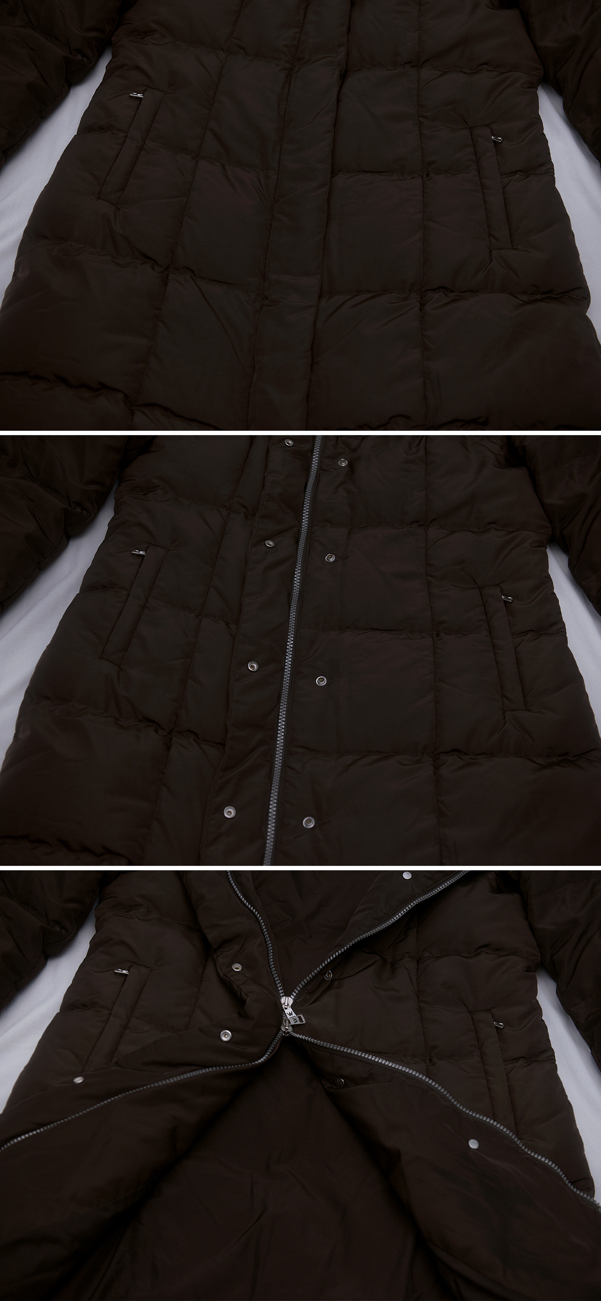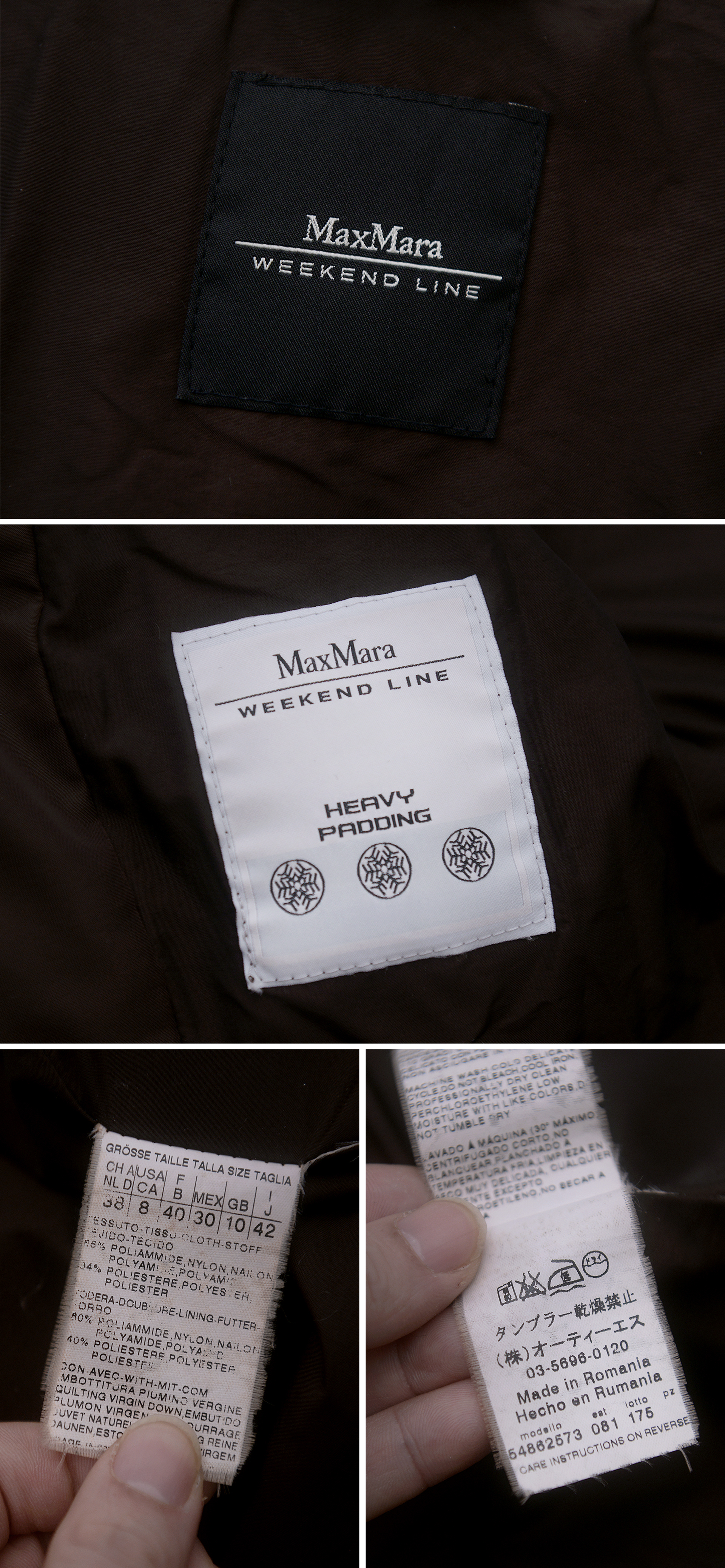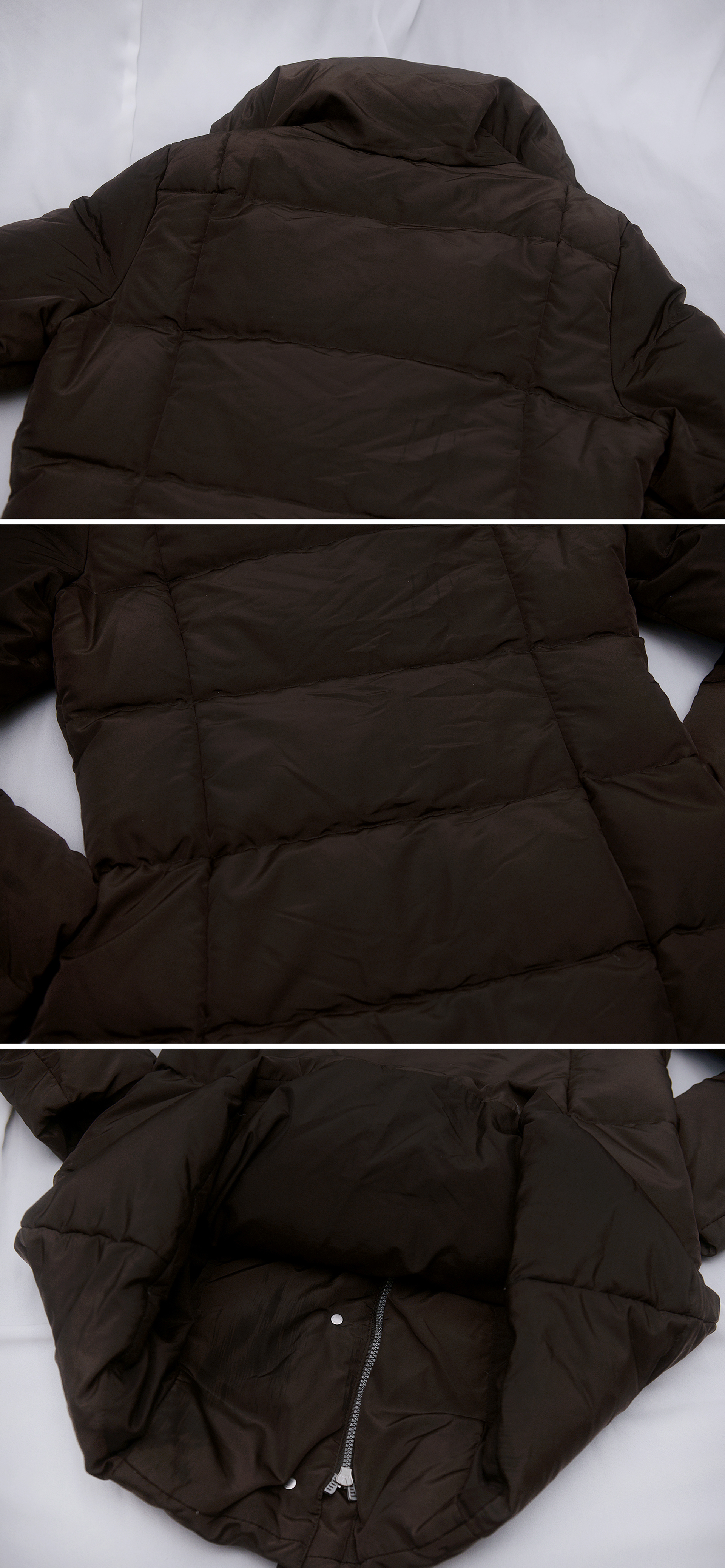 막스마라 위켄드 라인 하이넥 와이드카라 구스다운 롱패딩 코트 입니다. 몽클레어 탈레브나 아보세트와 비슷한 느낌으로 자연스럽게 우아한 A 라인으로 떨어지는 핏의 롱패딩 코트 타입 이면서도 막스마라다운 고급스러운 스타일 돋보이는 롱패딩 코트로 차분하고 고급스러운 다크 초코 컬러의 가볍고 광택감 있는 소위 말하는 프라다 포코노 방수방풍 나일론.폴리 소재 겉감 소재에 구스다운 충전재 풍성하게 채워져 있는 헤비다운 롱패딩 코트로 매우 가볍고 버튼.지퍼 이중 잠금 타입에 높게 하이넥으로 채워 올릴 수 있는 넓은 와이드 카라 형태로 되어있어 별도의 머플러등 필요없이 한겨울에도 충분히 멋스러우면서도 가볍고 따듯하게 입기 좋습니다. 막스마라 캐쥬얼 서브 위켄드 라인이지만 막스마라다운 뛰어난 만듬새와 람포 지퍼등 소재.부자재 퀄리티 훌륭합니다.