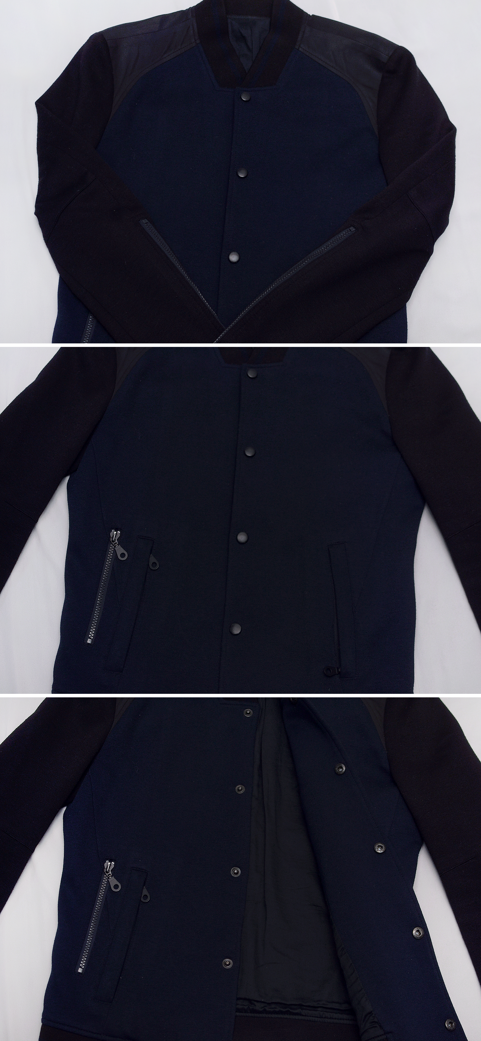 베이직 캐쥬얼 깔끔한 스타일의 네이비.블랙 컬러 배색 스태디움 자켓 디자인에 우측 더블 지퍼 포켓이나 소매 부분 롱지퍼 디테일등 멋스러운 포인트들 있어 심심하고 평범할 수 있는 베이직한 형태에도 지나치게 화려하지 않으면서 멋스럽습니다. 타임옴므.솔리드옴므 등과 함께 흔히 솔타시로 불리는 국내 대표 하이엔드 남성복 브랜드답게 소재.만듬새등 매우 좋고 입체적인 바디 라인 들어가 있어 실착시 부하지 않고 슬림하고 깔끔하게 딱 떨어지는 라인 역시 남다르고 멋스럽습니다.