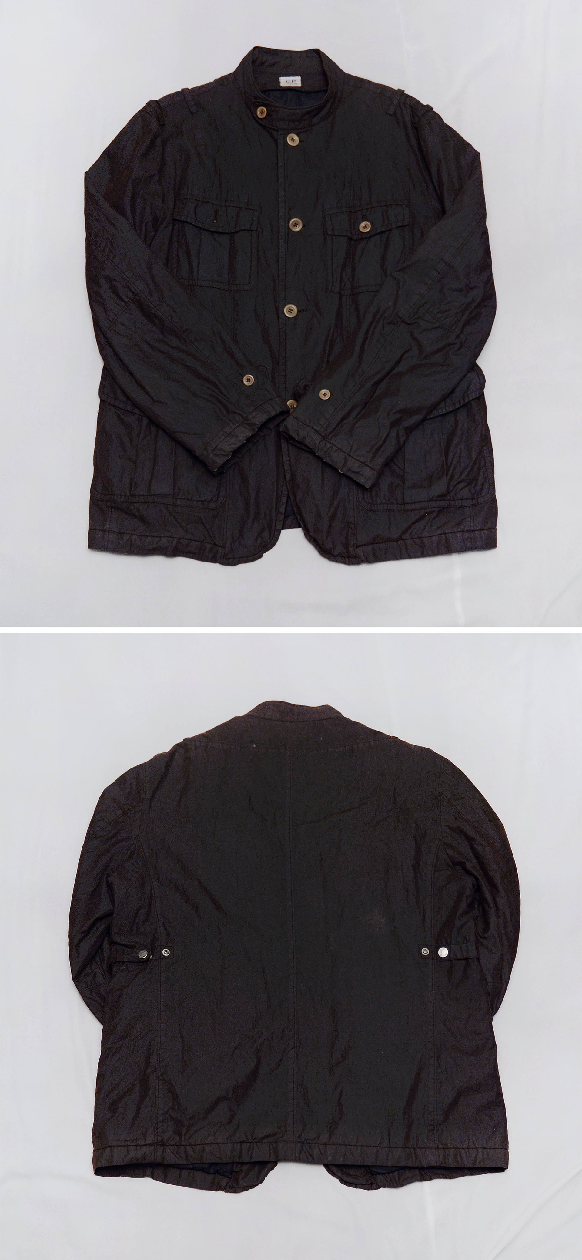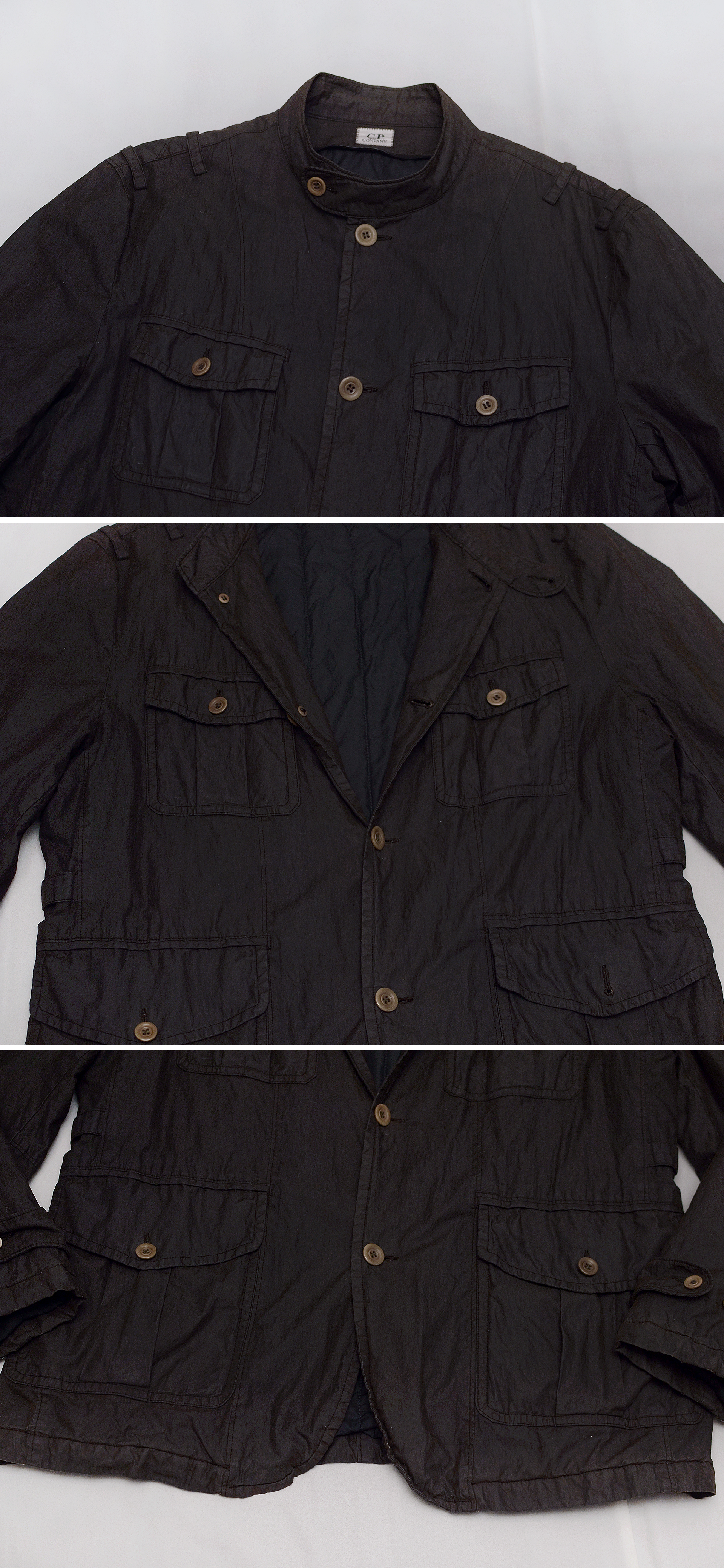 밀리터리 스타일 디자인과 염색.원단에 진심이었던 마스모 오스띠의 씨피컴퍼니 브랜드 근본 아이덴티티가 아주 잘 보여지는 코티드 워싱 4포켓 야상 버튼 자켓입니다. 특유의 가먼트다잉 워싱으로 톤다운된 짙은 우드카키톤 컬러감에 방수.방풍을 위한 우레탄 코팅처리된 겉감 소재로 마치 바버 왁스 자켓같은 느낌의 멋스러운 광택감과 독특한 질감이면서도 별도의 관리 없이도 코팅의 지속성 내구성 좋아 일상적 사용성 매우 좋습니다. 안쪽에 가볍게 패딩안감 되어있어 무겁지 않고 가벼운 자켓이면서도 어느정도 보온성 있어 봄.가을 간절기부터 초겨울 정도까지 멋스럽게 편하게 걸치는 일상용 아우터 자켓부터 여행용.캠핑용 자켓등으로 다용도로 두루 입기 좋습니다.