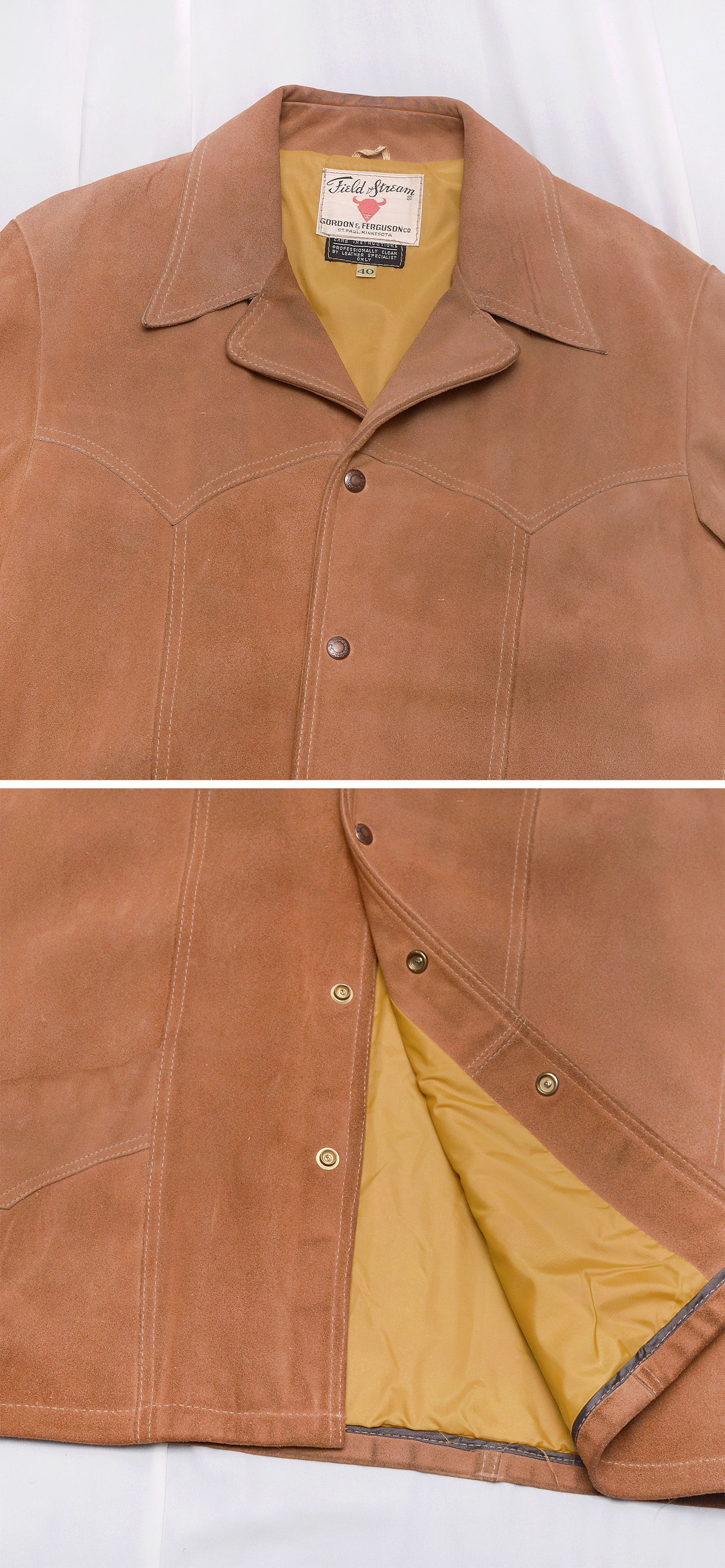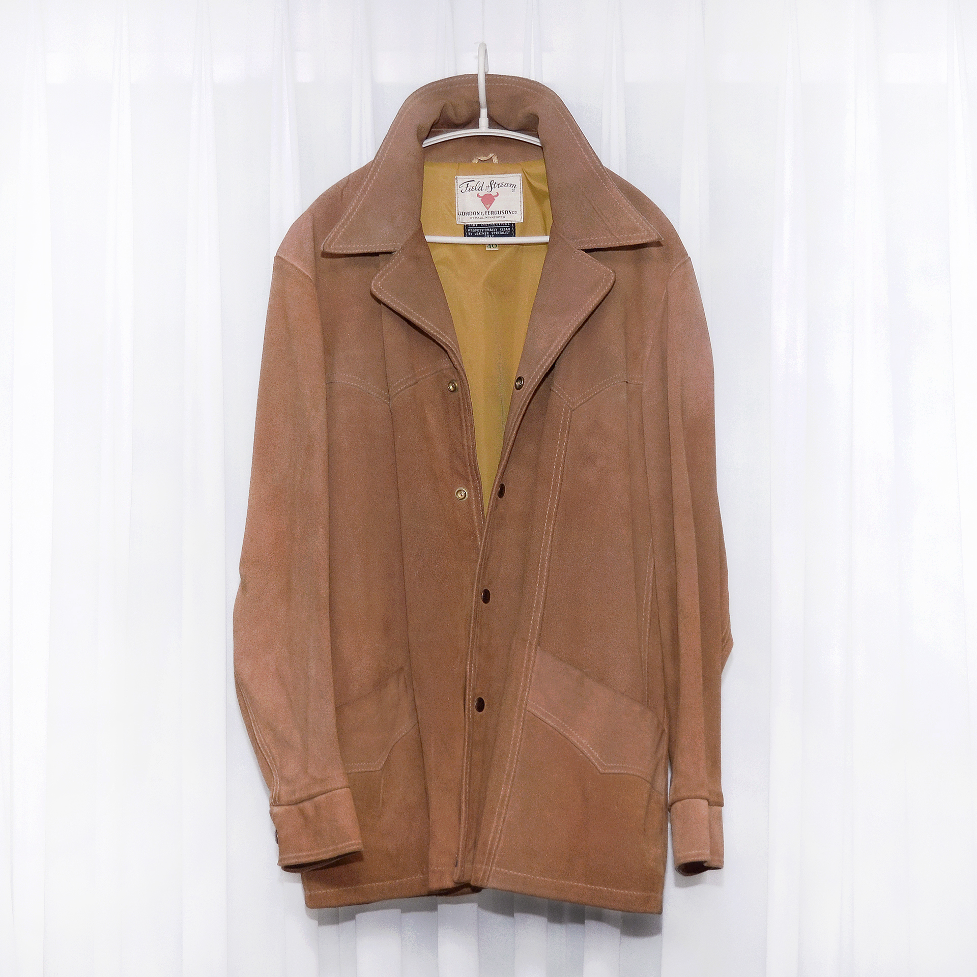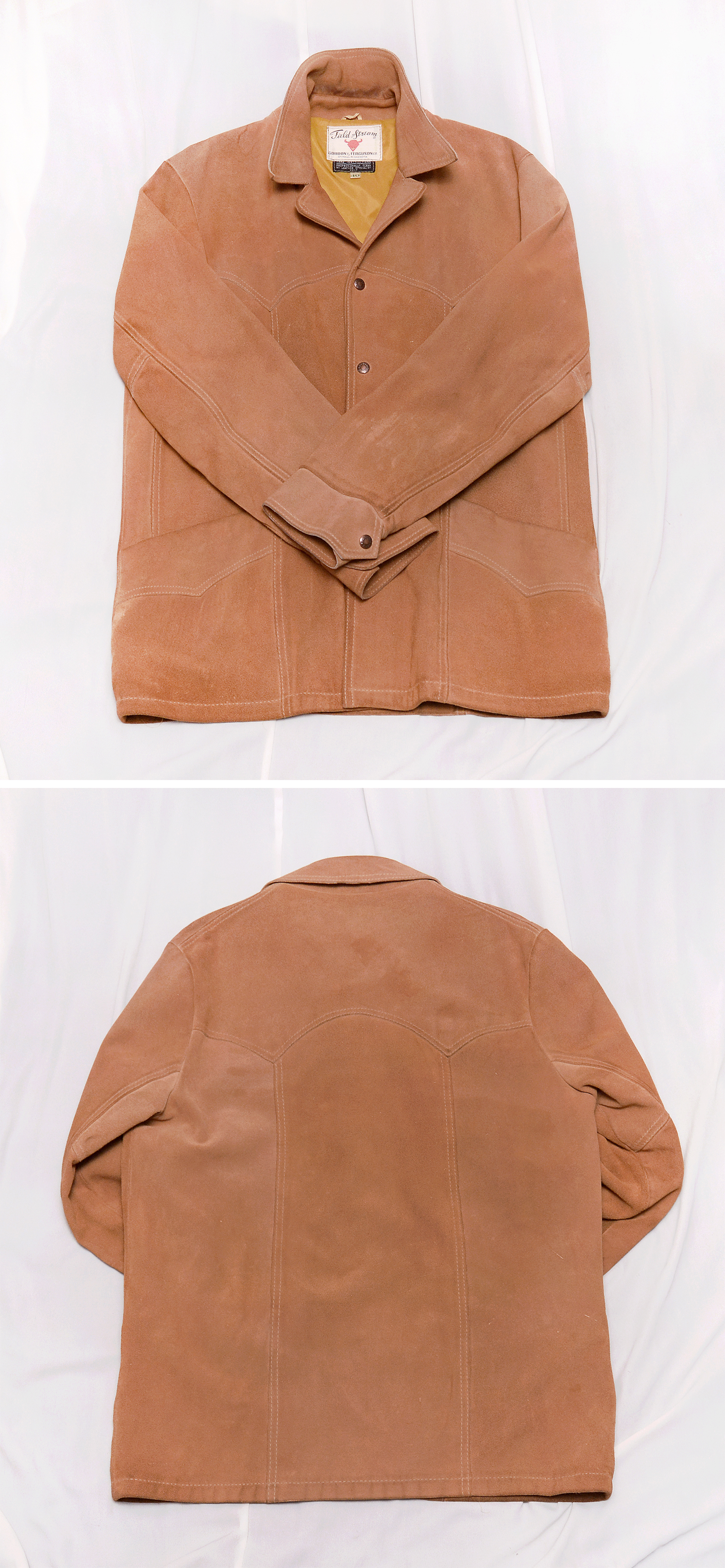 150년 역사의 미국 오리지널 웨스턴 스타일 아웃도어 브랜드 필드 앤 스트림의 클래식 아메카지 천연 소가죽 웨스턴 자켓 미국 출장시 시카고 현지 헌팅샵에서 구입했습니다. 서부 개척시대 카우보이들이 즐겨입던 웨스턴 스타일 스웨이드 레더 아우터 자켓의 원형을 거의 그대로 가지고 있는 아메리칸 클래식 스타일 멋스럽고 부드럽게 스웨이드 가공된 밝은 카멜 브라운 컬러 최상급 천연가죽 원피를 그대로 사용한 두툼한 풀그레인 레더 자켓으로 탄탄하고 무게감있어 착용시 몸을 착 잡아주는 든든한 착용감 매우 좋습니다. 말위에서 거친 움직임을 해야하는 카우보이들을 위한 웨스턴 헌팅 자켓답게 주요부위 절개 디테일과 여유로운 폼으로 튼튼한 내구성과 활동성 매우 좋습니다.