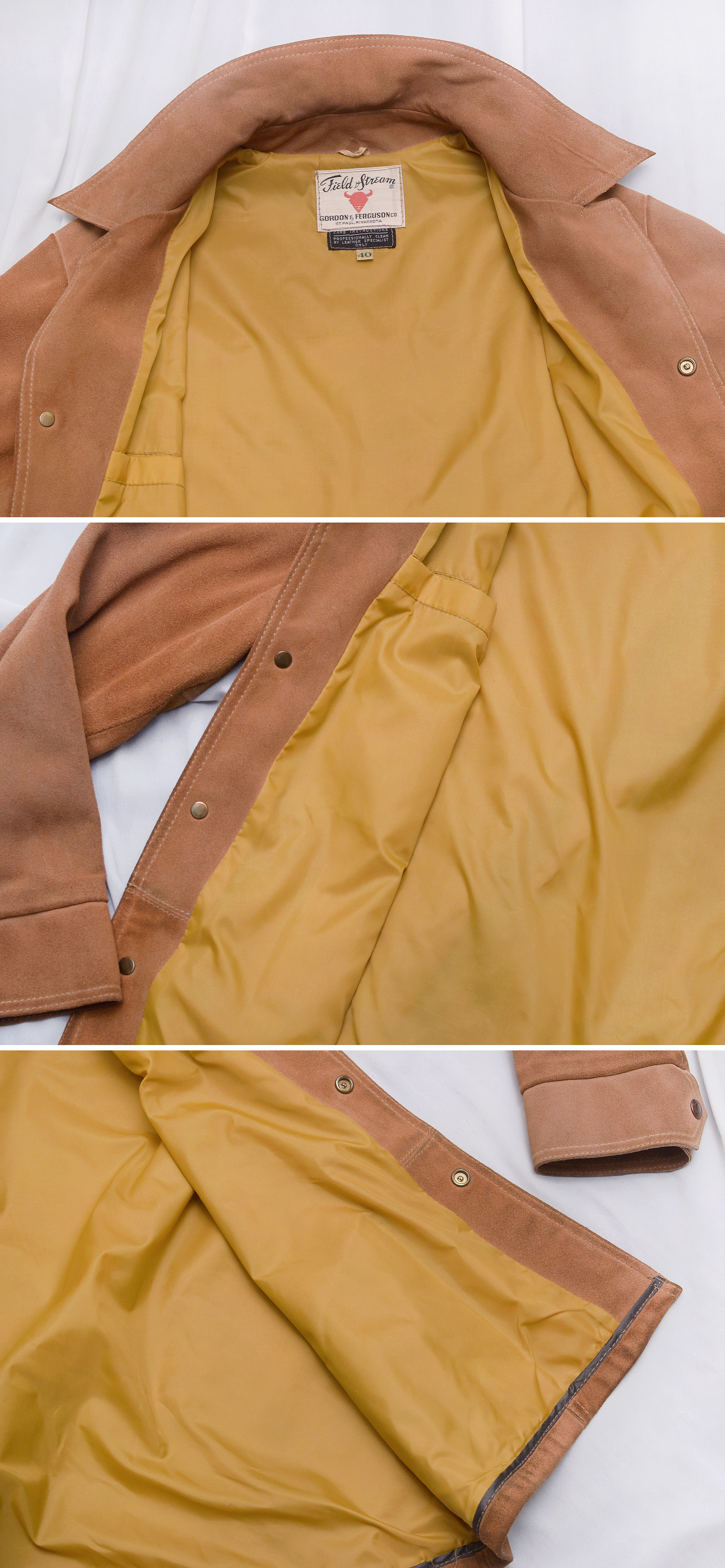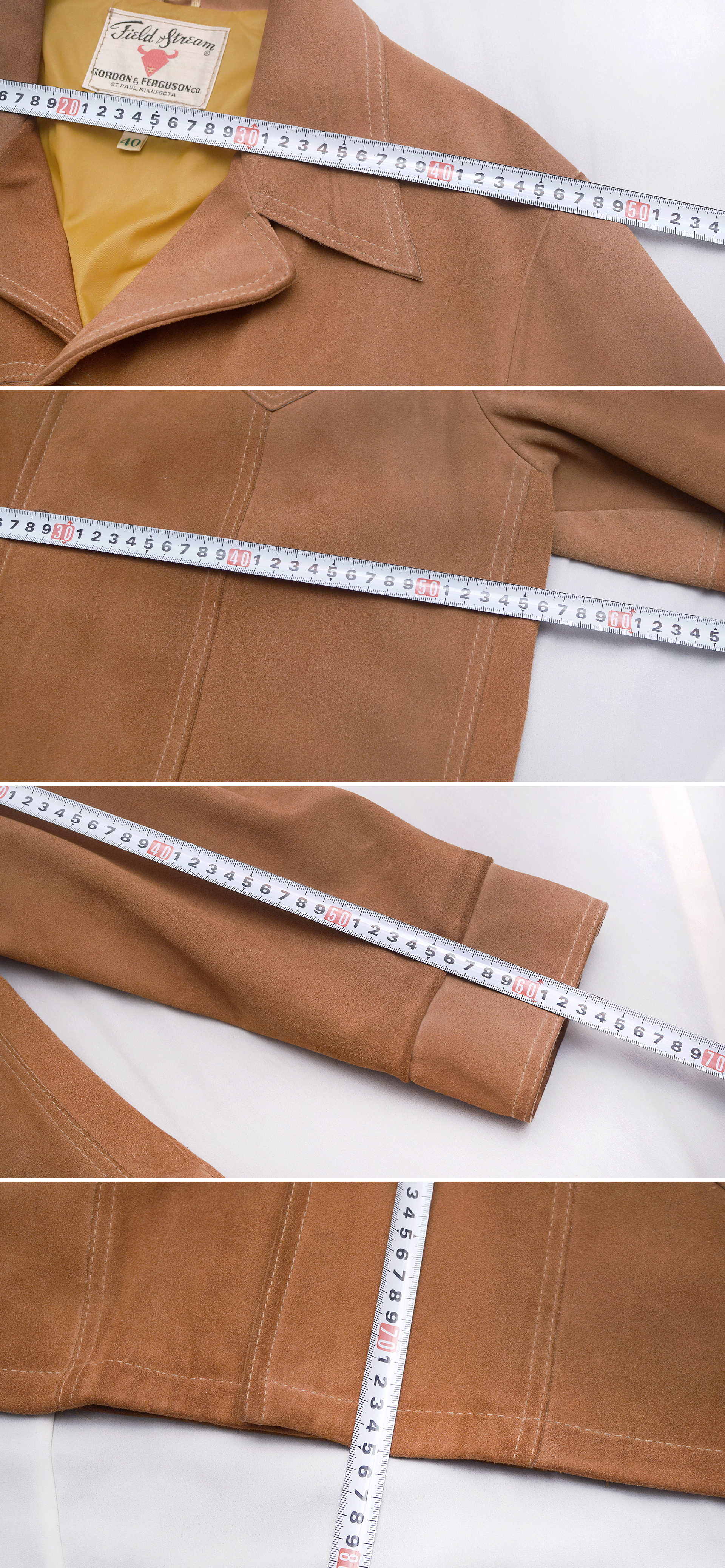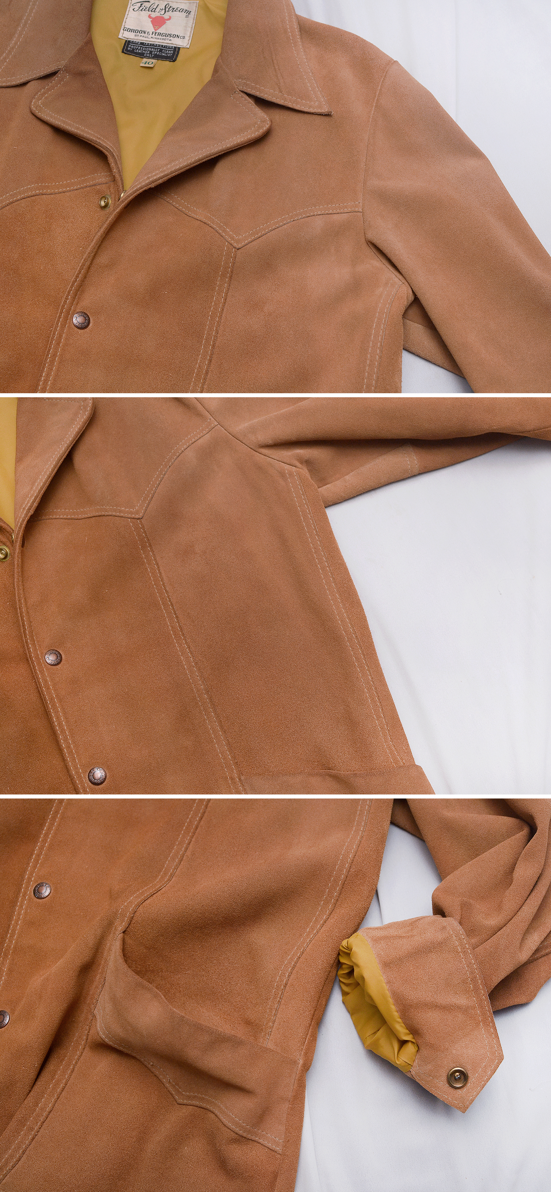 150년 역사의 미국 오리지널 웨스턴 스타일 아웃도어 브랜드 필드 앤 스트림의 클래식 아메카지 천연 소가죽 웨스턴 자켓 미국 출장시 시카고 현지 헌팅샵에서 구입했습니다. 서부 개척시대 카우보이들이 즐겨입던 웨스턴 스타일 스웨이드 레더 아우터 자켓의 원형을 거의 그대로 가지고 있는 아메리칸 클래식 스타일 멋스럽고 부드럽게 스웨이드 가공된 밝은 카멜 브라운 컬러 최상급 천연가죽 원피를 그대로 사용한 두툼한 풀그레인 레더 자켓으로 탄탄하고 무게감있어 착용시 몸을 착 잡아주는 든든한 착용감 매우 좋습니다. 말위에서 거친 움직임을 해야하는 카우보이들을 위한 웨스턴 헌팅 자켓답게 주요부위 절개 디테일과 여유로운 폼으로 튼튼한 내구성과 활동성 매우 좋습니다.