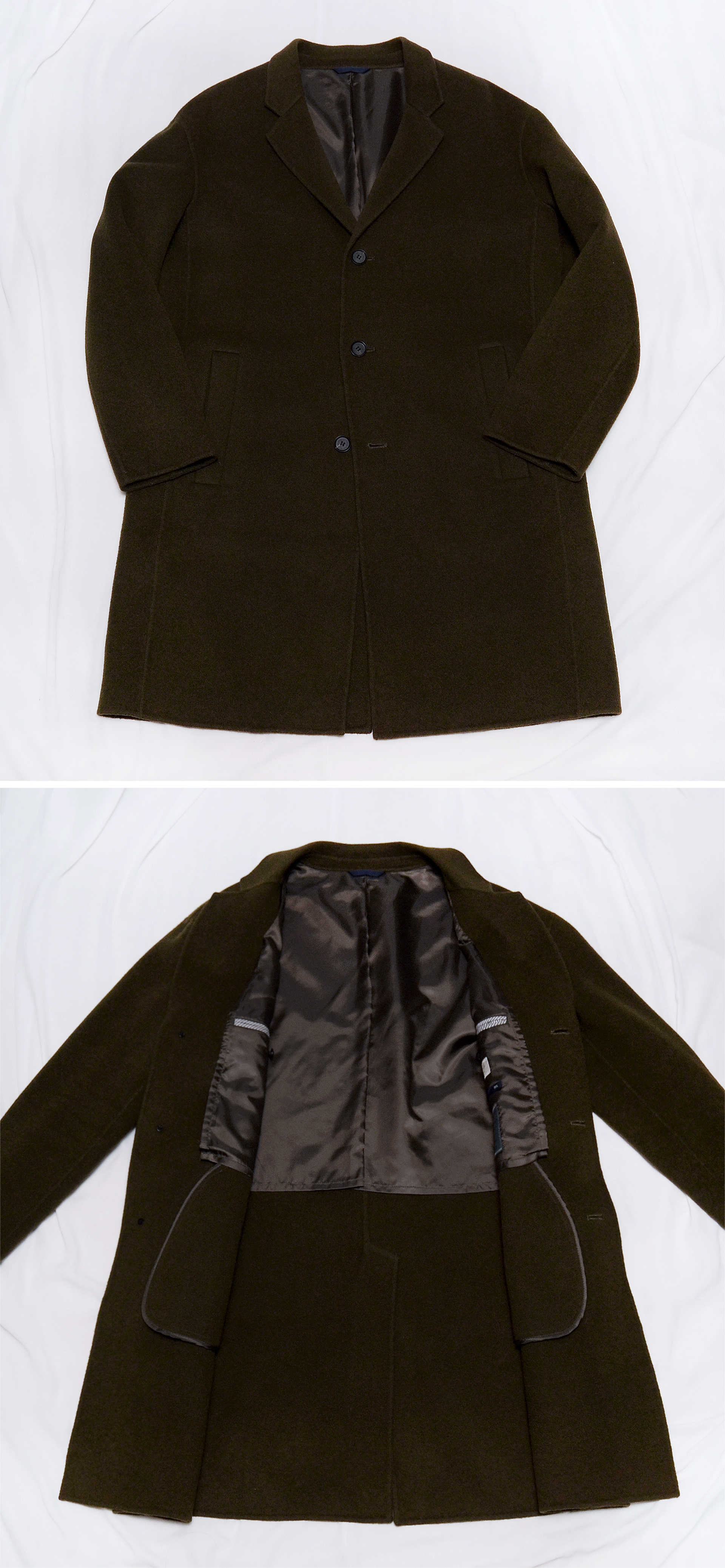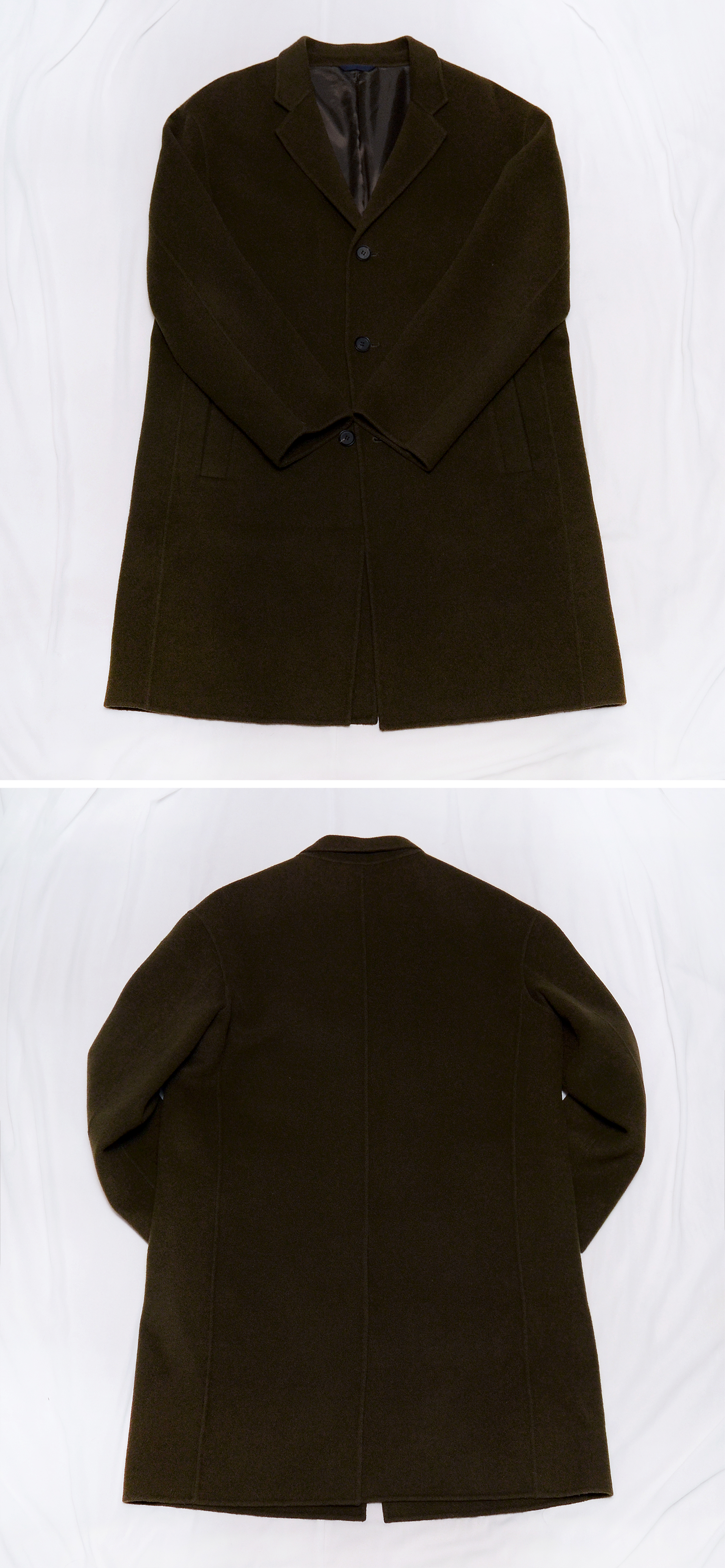 코오롱 패션 시리즈 에피그램 클래식 심플 오버 핸드메이드 울코트 입니다. 코오롱 고급 남성복 브랜드 시리즈의 비지니스 캐쥬얼 스타일 라인 에피그램의 겨울철 스테디셀러 아이템으로 도톰한 두께감과 탄탄하면서도 부드러운 텍스쳐의 짙은 올리브그린 카키톤 컬러 울혼방 소재로 지나치게 딱딱하지 않으면서 자연스럽게 흘러내리는 핸드메이드 방식으로 만들어진 이지한 핏과 클래식 테일러드 라펠 디자인으로 단정하고 깔끔한 베이직한 라인 패턴 멋스럽습니다. 후드티등과 함께 매치해서 클래식 캐쥬얼한 세미 오버핏 스타일로 입거나 정장 자켓위에 깔끔하게 걸치는 오버 코트로 멋스럽게 입기 좋아 유행 상관없이 두고 두고 겨울철 다양한 코디에 두루 편하게 활용하기 좋습니다.