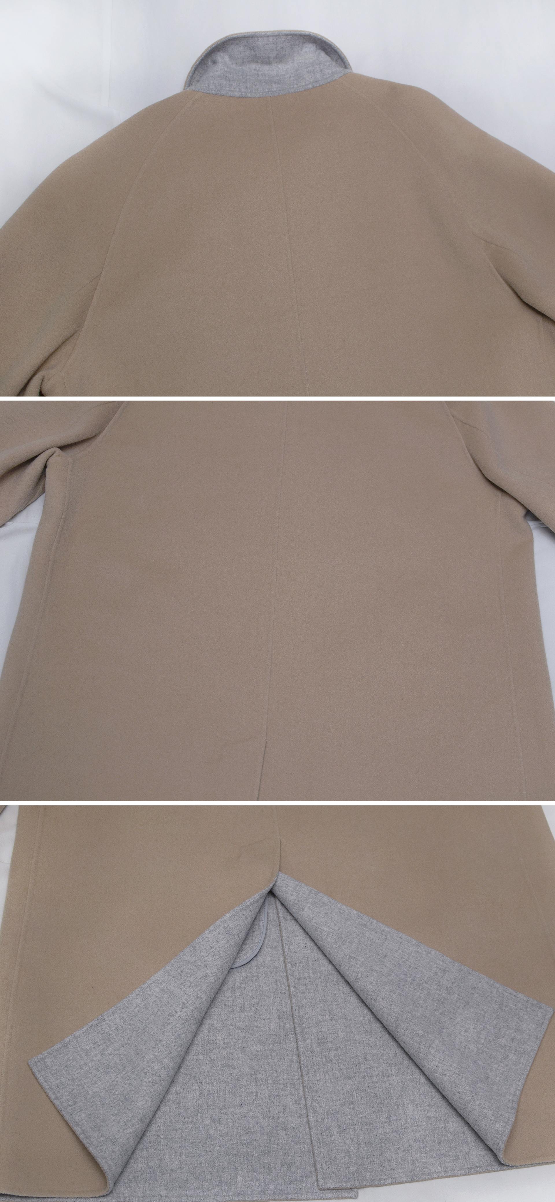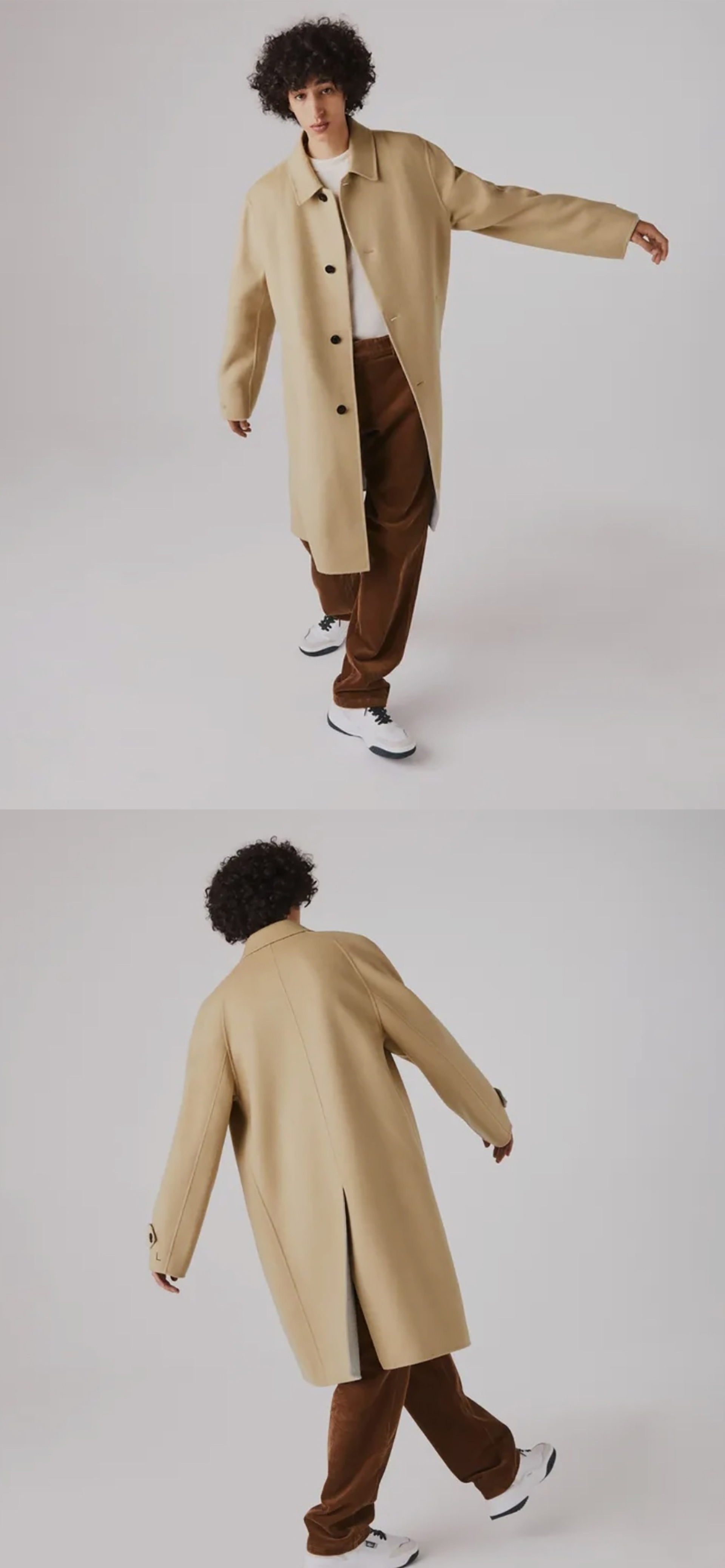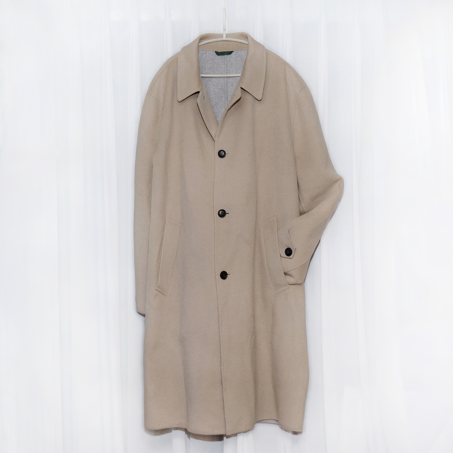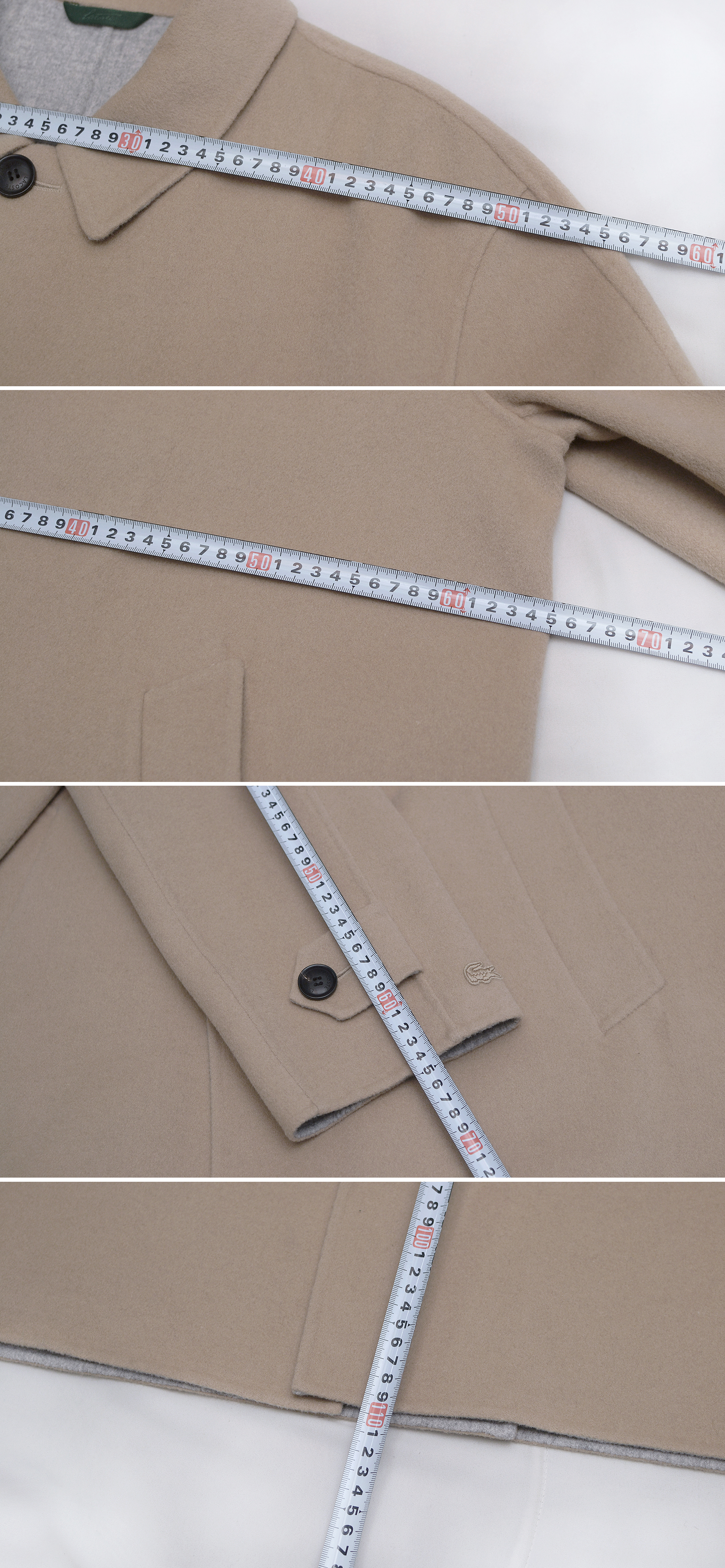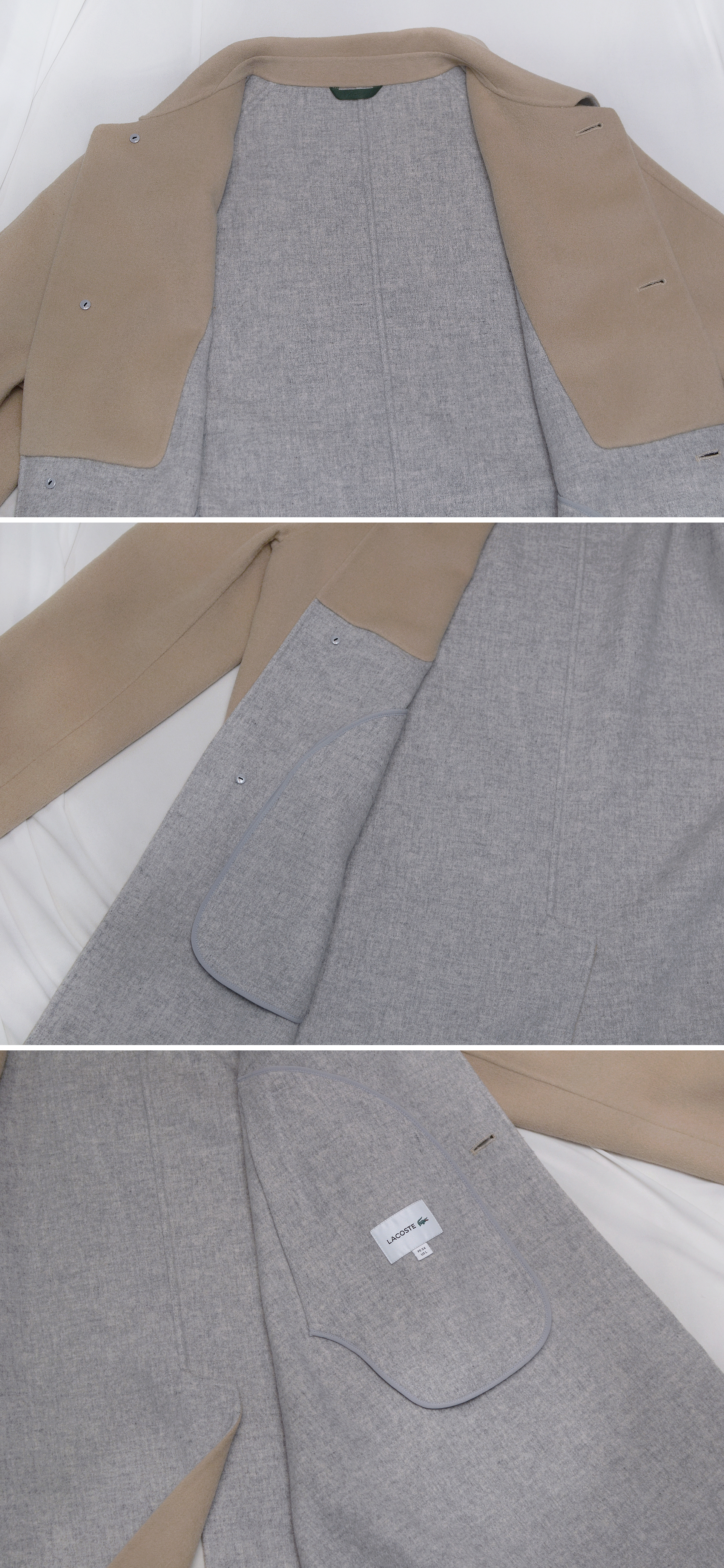 라코스테 최고급 라인 클래식 핸드메이드 싱글 발마칸 울펠트 오버 롱코트 입니다. 깔끔하고 멋스러운 밝은 허니 베이지 컬러에 팔부분 앞쪽은 일반적인 셋인 슬리브이면서 뒤쪽은 넥라인부터 부드럽게 떨어지는 네글런 타입의 입체적인 방식으로 되어있어 자연스럽게 몸을 따라 부드럽게 떨어지는 일자핏의 핸드메이드 테일러드 타입으로 너무 딱딱하지 않고 루즈한 프렌치 클래식 캐쥬얼 스타일로 실착시 부드럽고 멋스럽게 떨어지는 핏 매우 좋습니다. 부드러운 울블렌드 소재에 포근한 그레이 컬러 펠트 안감이 떨어지지 않고 딱 붙어있는 이중지 타입으로 되어있어 너무 두껍지 않으면서도 착용감.보온성 좋고 안에 받쳐입는 옷에 맞춰 촤르르 떨어지는 자연스러운 루즈핏 스타일 멋스럽습니다.