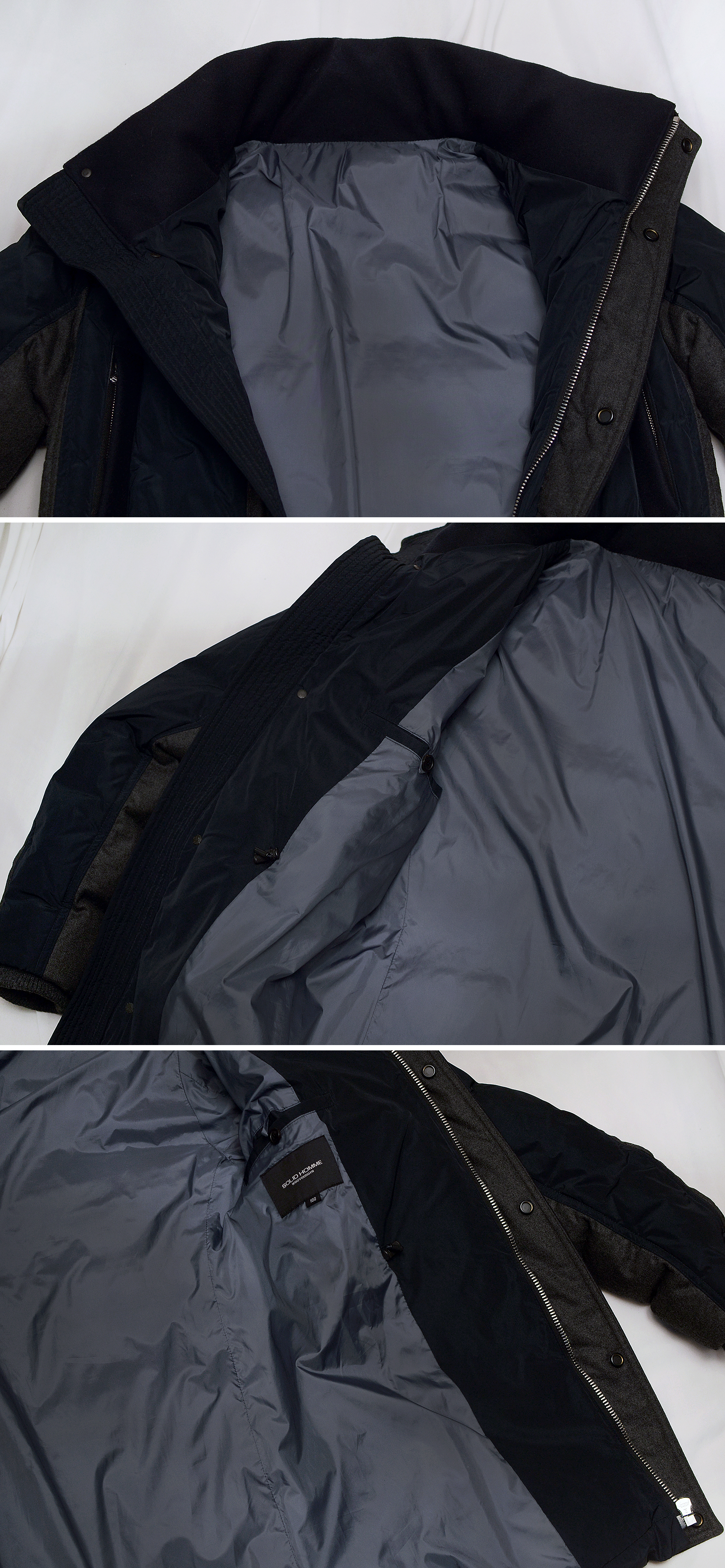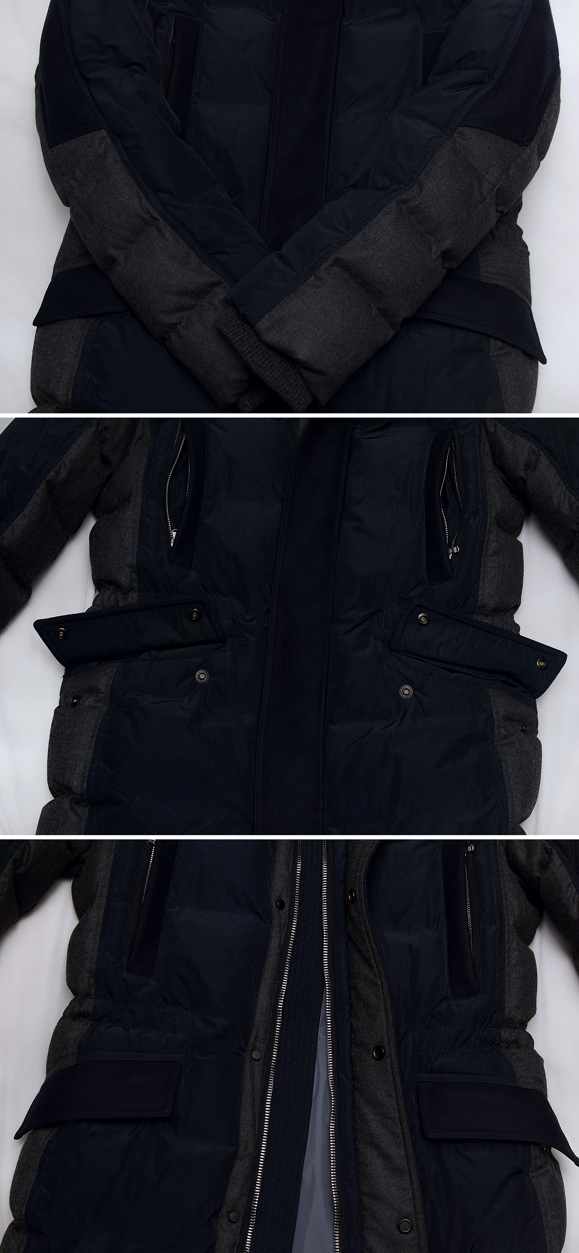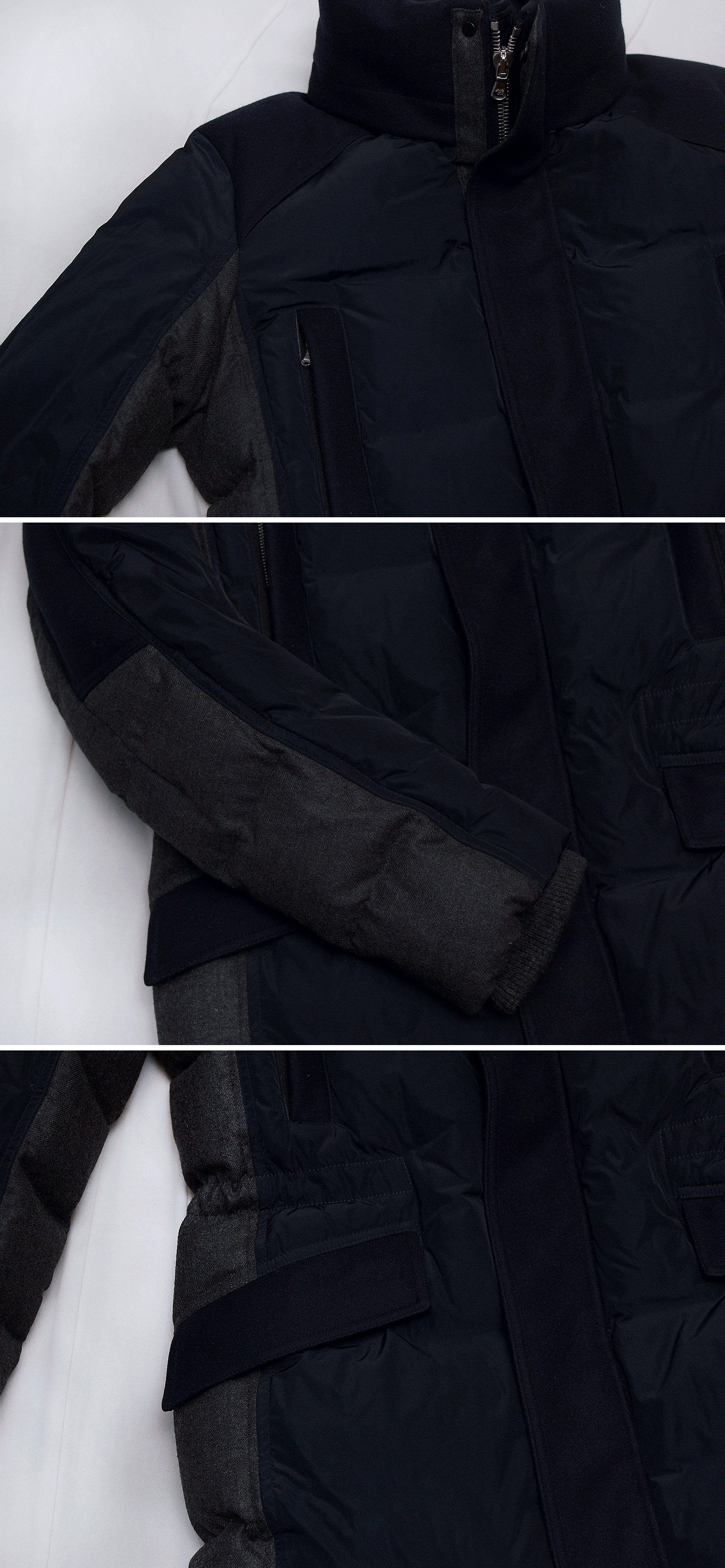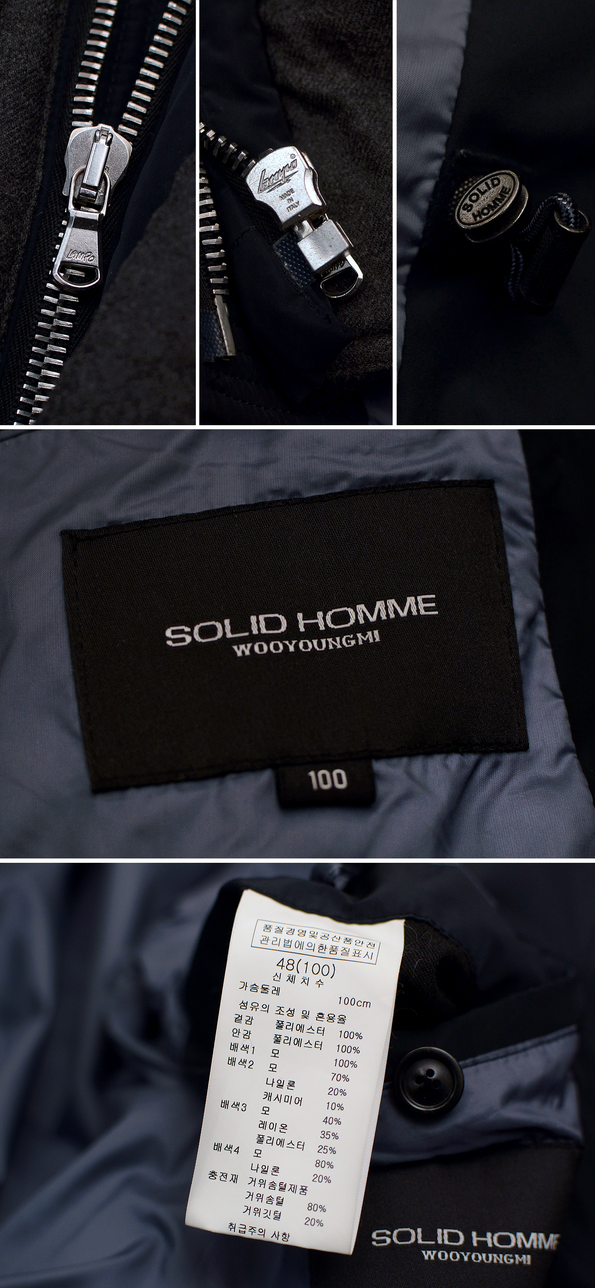준지 정욱준과 함께 우리나라를 대표하는 남성복 패션 디자이너 우영미의 솔리드 옴므 브랜드 최상급 우영미 라인 구스다운 패딩 코트 자켓 입니다. 왠만한 대장급 패딩만큼 풍성한 우모량의 헤비다운 패딩이면서도 딱 떨어지는 깔끔한 스타일 높게 하이넥으로 올라가는 와이드카라 형태 우영미다운 우아하고 멋스러운 스타일 돋보이는 패딩 코트 자켓으로 디자인 뿐 아니라 브랜드 최고급 제품답게 등 부분과 사이드 라인에 그레이톤 헤어라인 울 소재로 되어있고 주요 부위에는 고급스러운 광택감 돋보이는 짙은 네이비 컬러 울.캐시미어 배색 이태리 메이드 명품 람포 지퍼등 소재 및 부자재 왠만한 해외 명품급 이상으로 훌륭해 흔한 패딩 코트들과 확실히 차별화되는 존재감 돋보입니다.