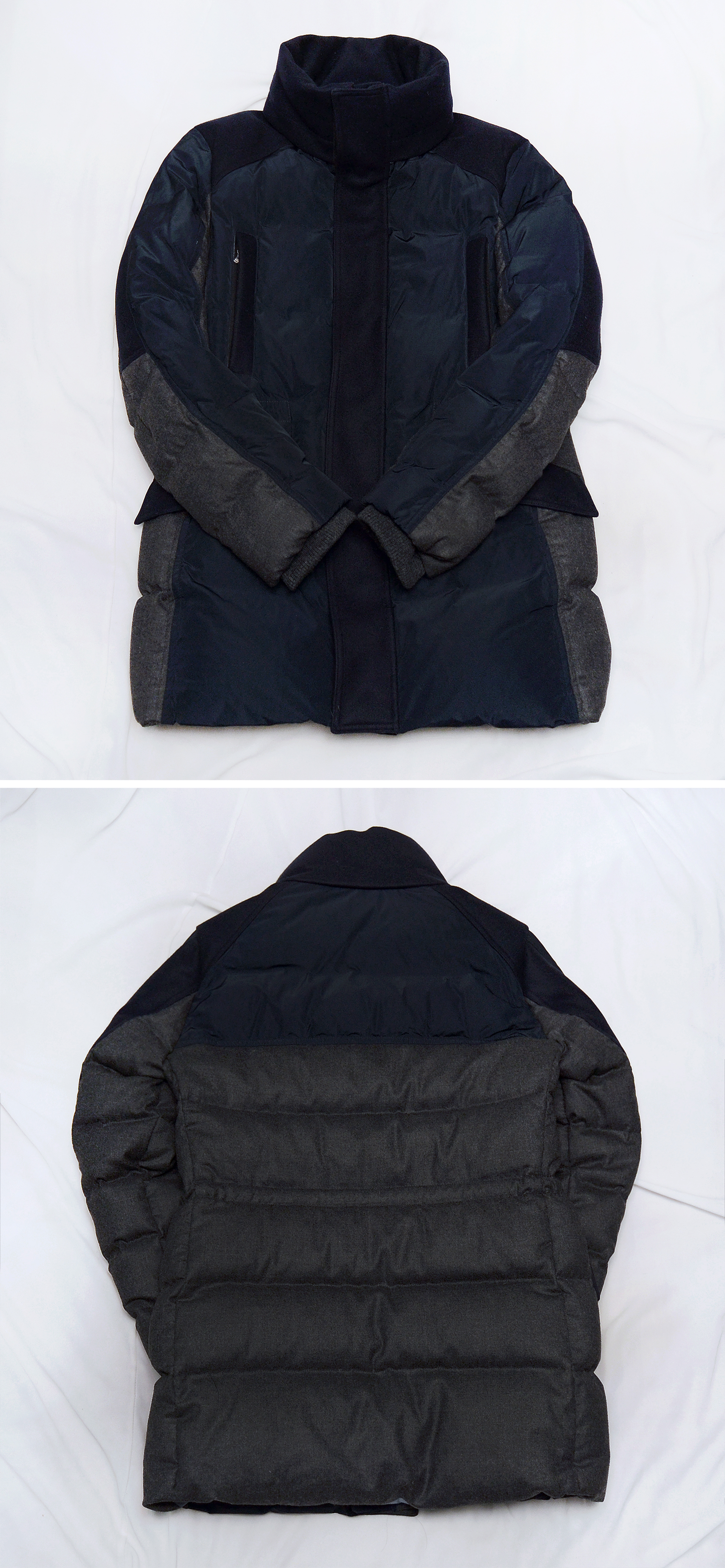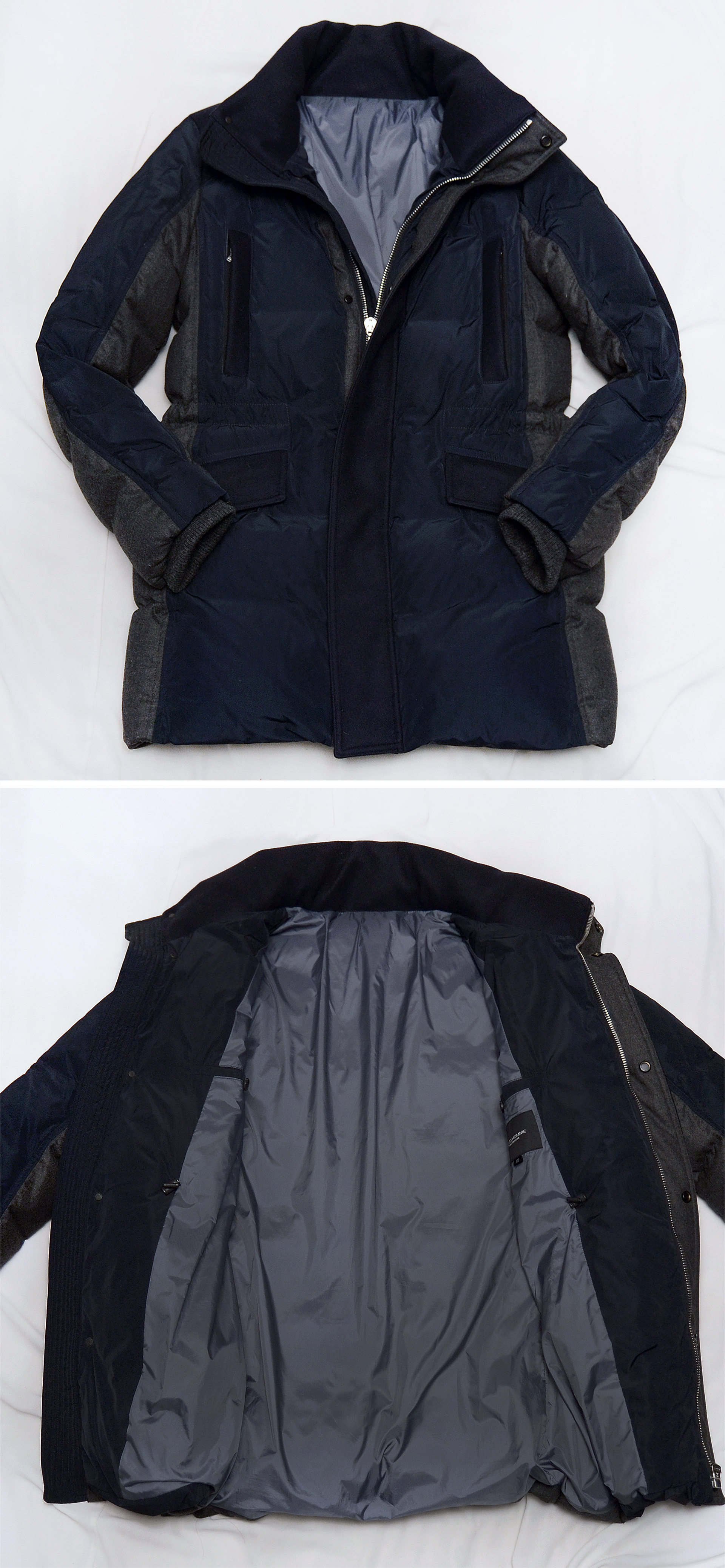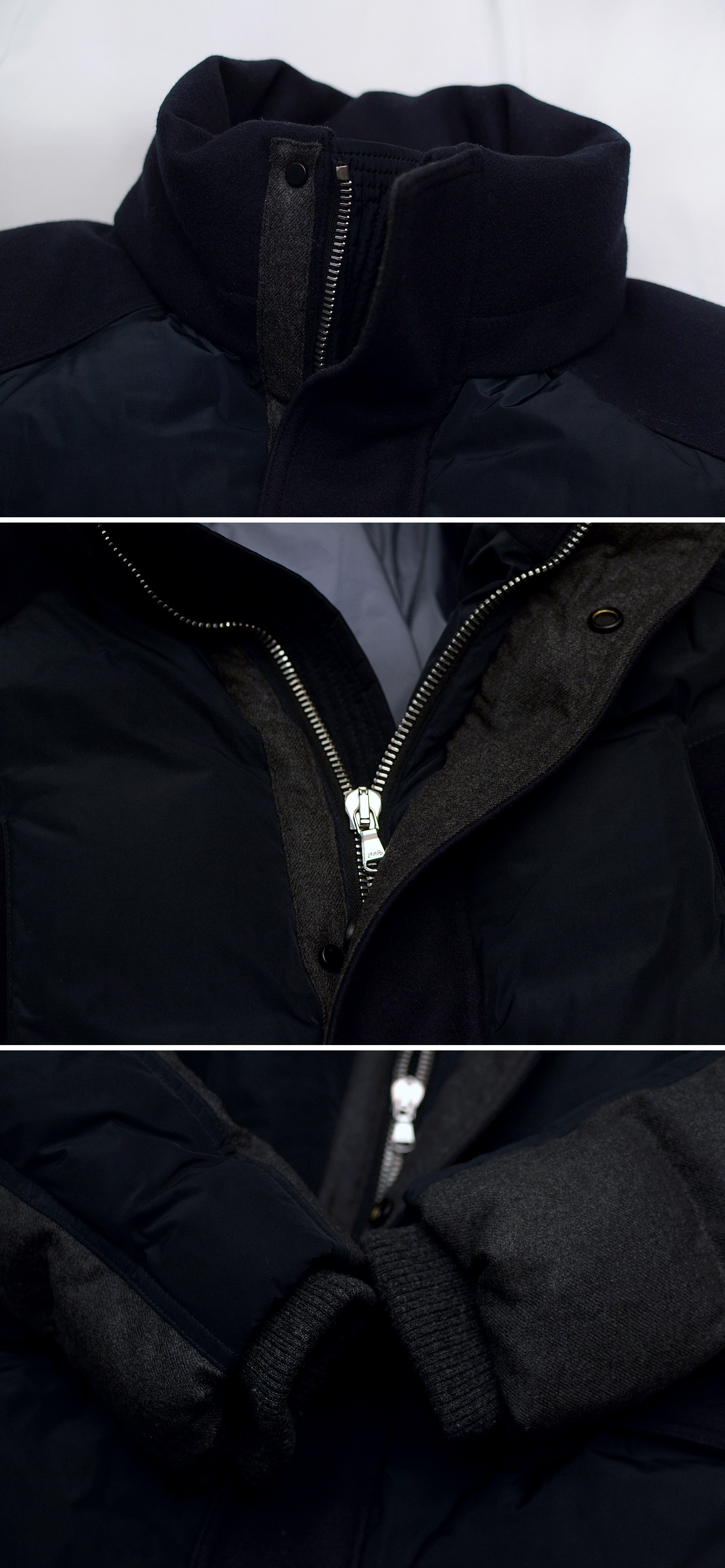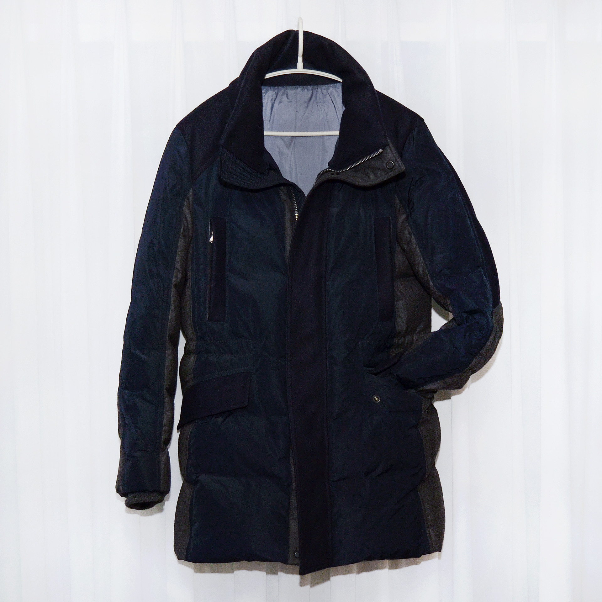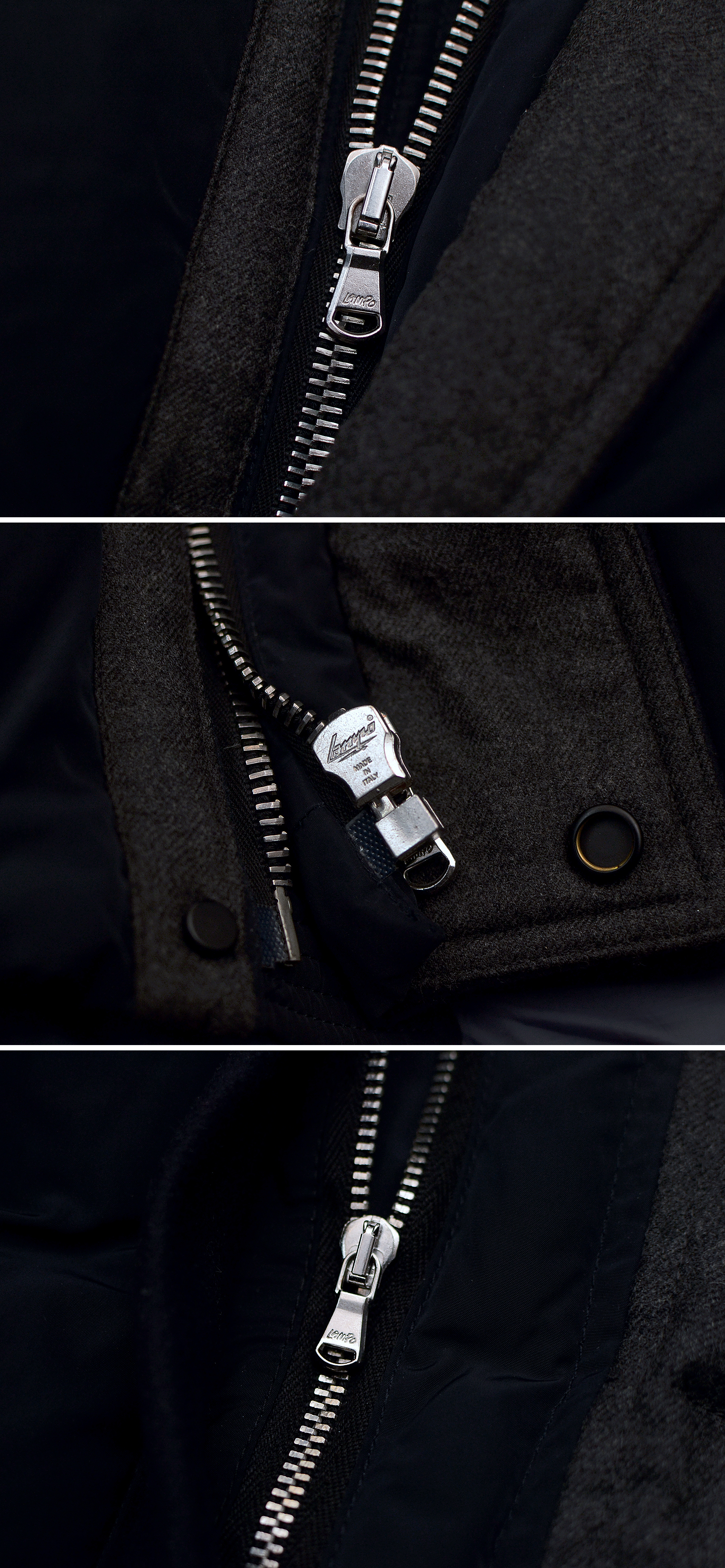 준지 정욱준과 함께 우리나라를 대표하는 남성복 패션 디자이너 우영미의 솔리드 옴므 브랜드 최상급 우영미 라인 구스다운 패딩 코트 자켓 입니다. 왠만한 대장급 패딩만큼 풍성한 우모량의 헤비다운 패딩이면서도 딱 떨어지는 깔끔한 스타일 높게 하이넥으로 올라가는 와이드카라 형태 우영미다운 우아하고 멋스러운 스타일 돋보이는 패딩 코트 자켓으로 디자인 뿐 아니라 브랜드 최고급 제품답게 등 부분과 사이드 라인에 그레이톤 헤어라인 울 소재로 되어있고 주요 부위에는 고급스러운 광택감 돋보이는 짙은 네이비 컬러 울.캐시미어 배색 이태리 메이드 명품 람포 지퍼등 소재 및 부자재 왠만한 해외 명품급 이상으로 훌륭해 흔한 패딩 코트들과 확실히 차별화되는 존재감 돋보입니다.