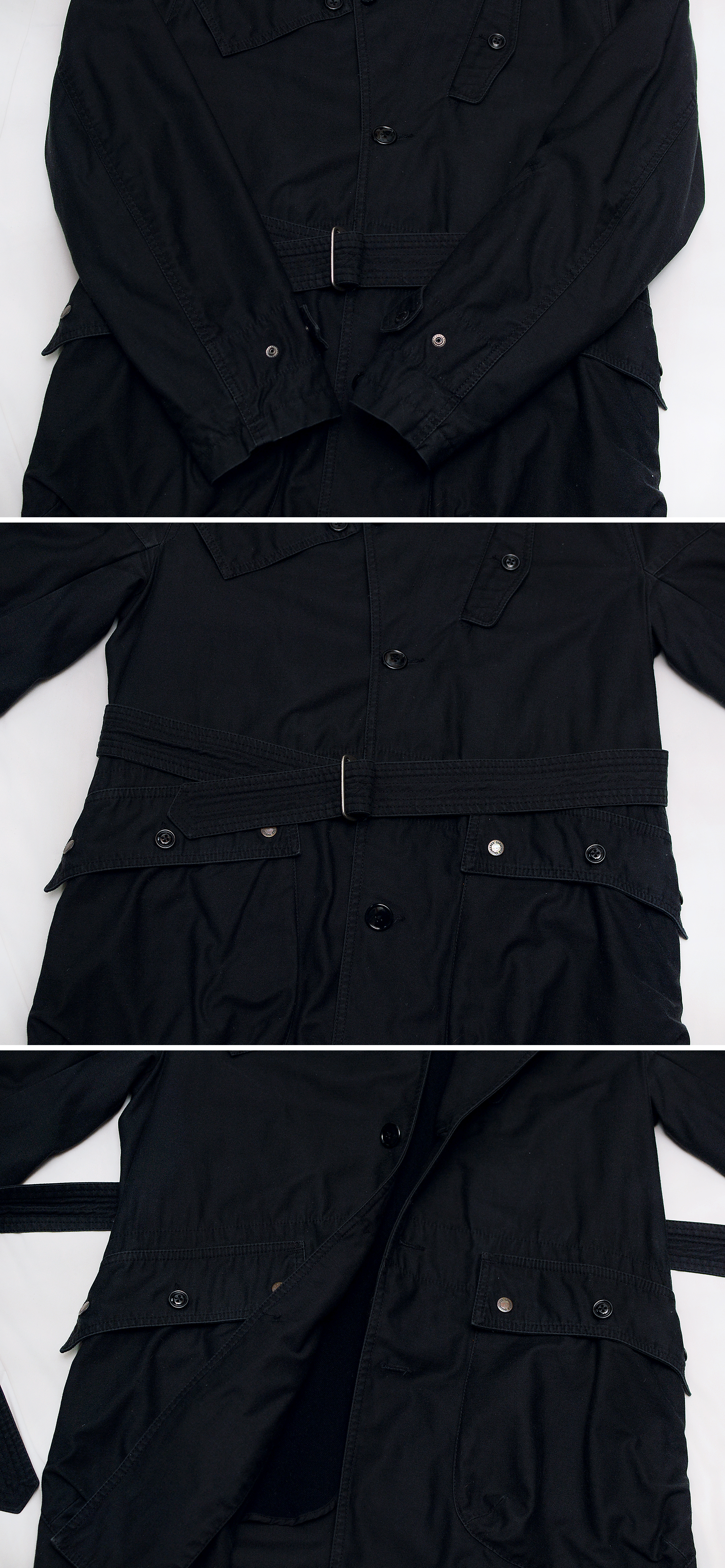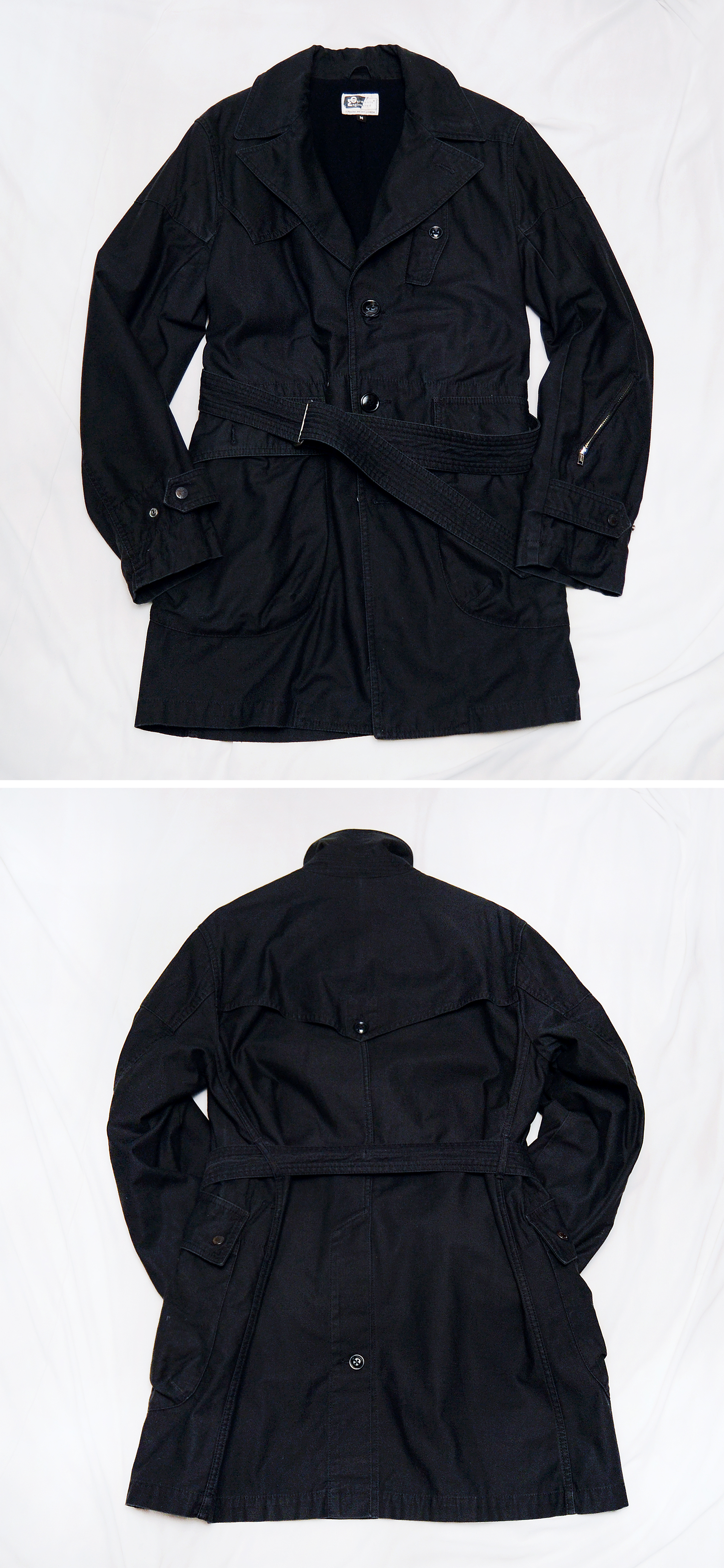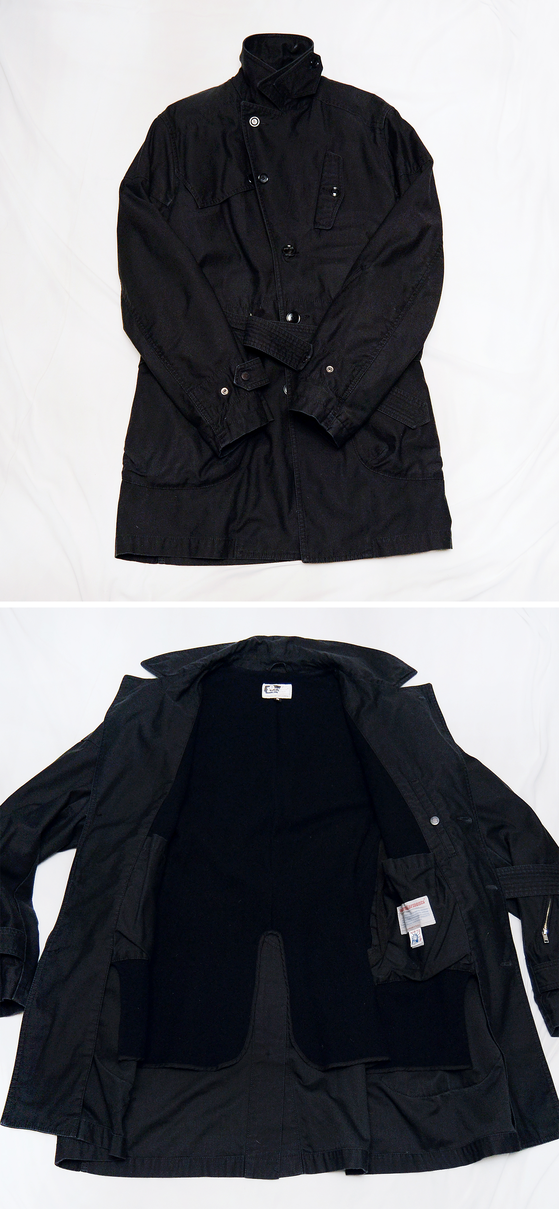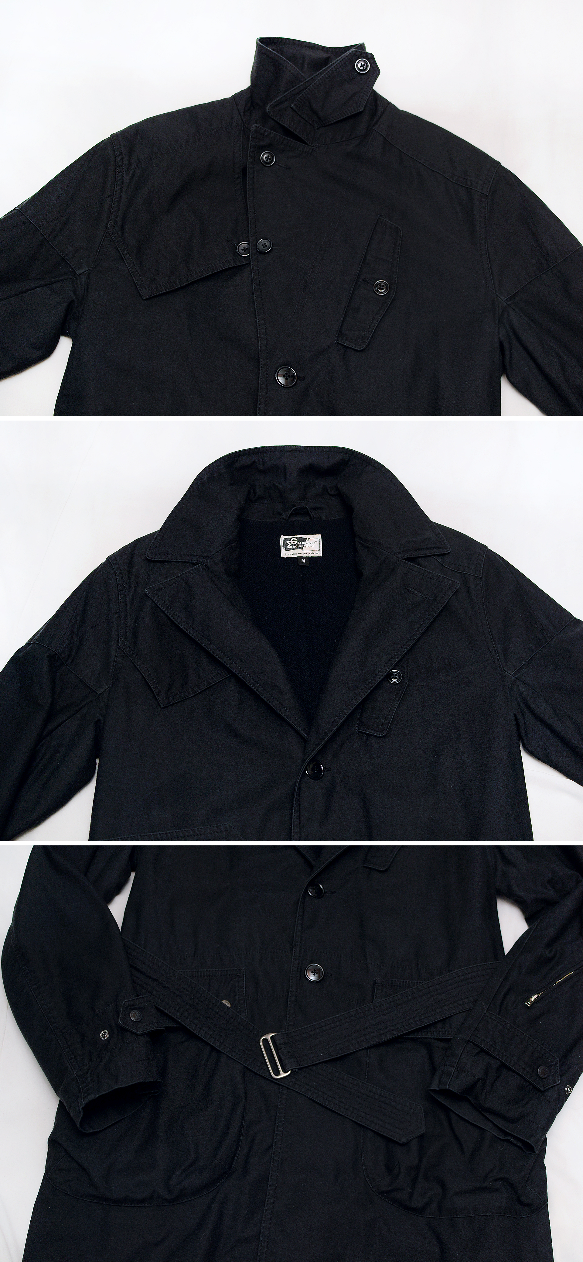투박하고 거친 느낌이면서도 뛰어난 소재와 클래식한 테일러링 정교한 디테일의 만듬새등 20세기초 가장 빛나던 미국의 부흥기 아메리칸 클래식 캐쥬얼을 기반으로 하며 메이드인 뉴욕 제조를 고집하는 가장 '미국적인' 브랜드로 손꼽히는 엔지니어드 가먼츠의 헤비코튼 하드쉘 울웜파일 벨티드 모즈 트렌치 코트 스톰코트 입니다. 브랜드 네이밍처럼 디자인된 제품이 아닌 마치 설계되었다 (Engineered) 할 정도로 보이지 않는 세세한 부분까지 치밀하게 만들어진 엔가다운 뛰어난 만듬새에 클래식한 탈론 지퍼나 엔틱 금속 버튼 가먼트다잉 피그먼트 워싱의 톤다운된 블랙 컬러의 코튼.나일론 혼방 탄탄한 헤비코튼 하드쉘 겉감과 울웜파일 소재 내피 안감등으로 되어있어 방풍.방한.보온성 꽤 좋은 편이라 봄.가을 간절기부터 초겨울까지 두루 편하고 멋스럽게 입기 좋습니다.