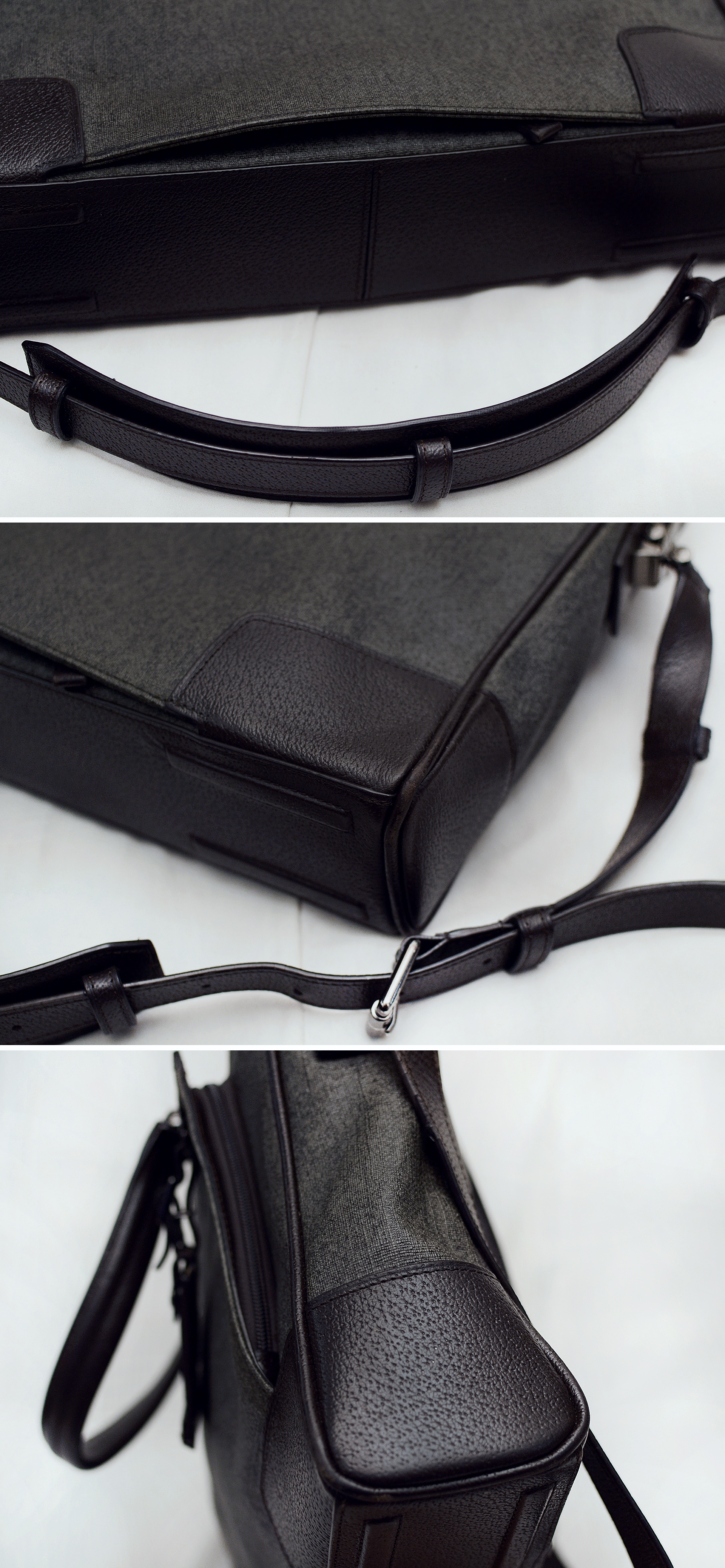 정도의 슬림형 타입 라지 사이즈로 A4 서류파일 및 14-15인치급 노트북까지 여유롭게 수납 가능해 깔끔하고 멋스러운 남여공용 일상용 가방부터 정장에 잘 어울리는 비즈니스용 서류 가방등으로 두루 편하게 쓰기 좋습니다. 자연스러운 사용감 정도 있으나 다른 가방들 많아 돌려가며 쓰는 편이라 눈에띄는 큰 파손.훼손없이 전체적인 상태 양호합니다.