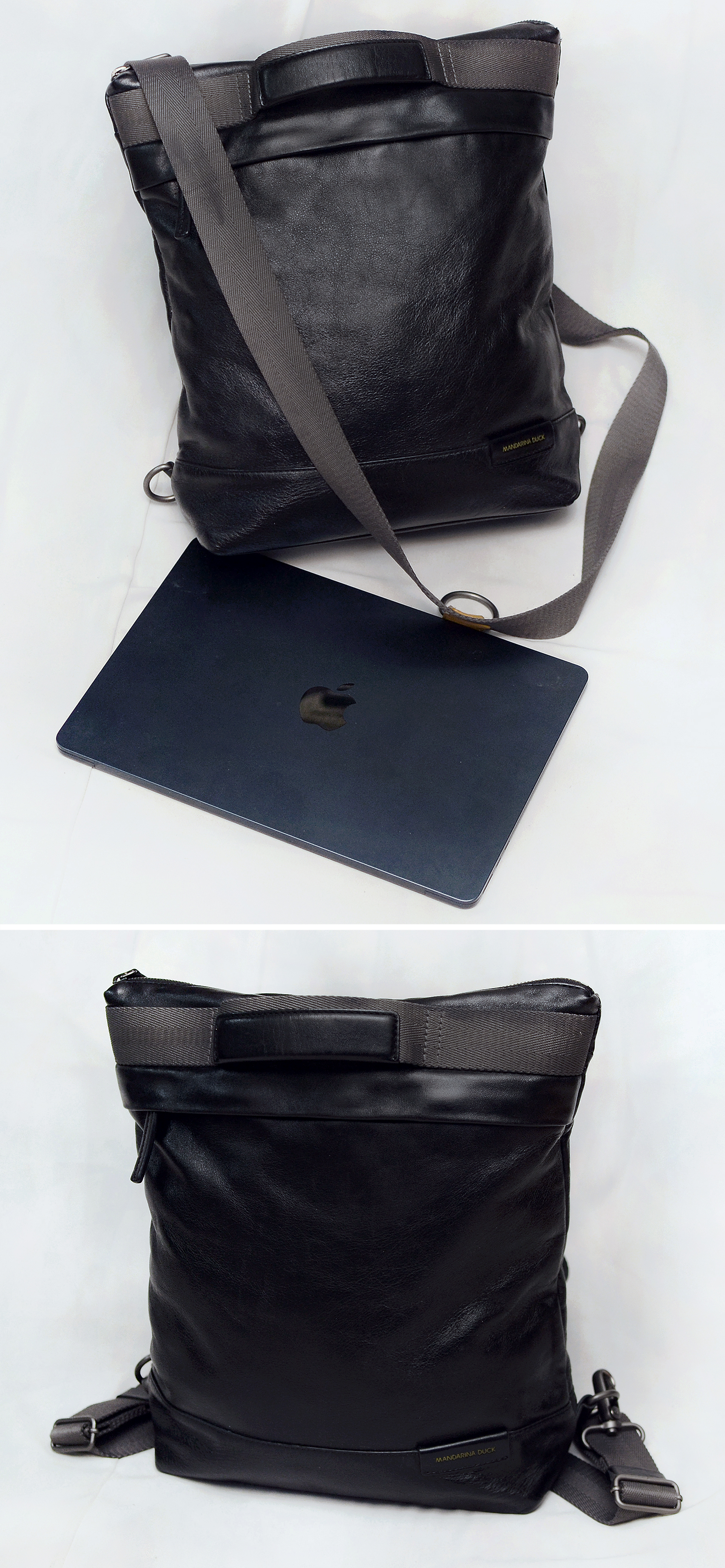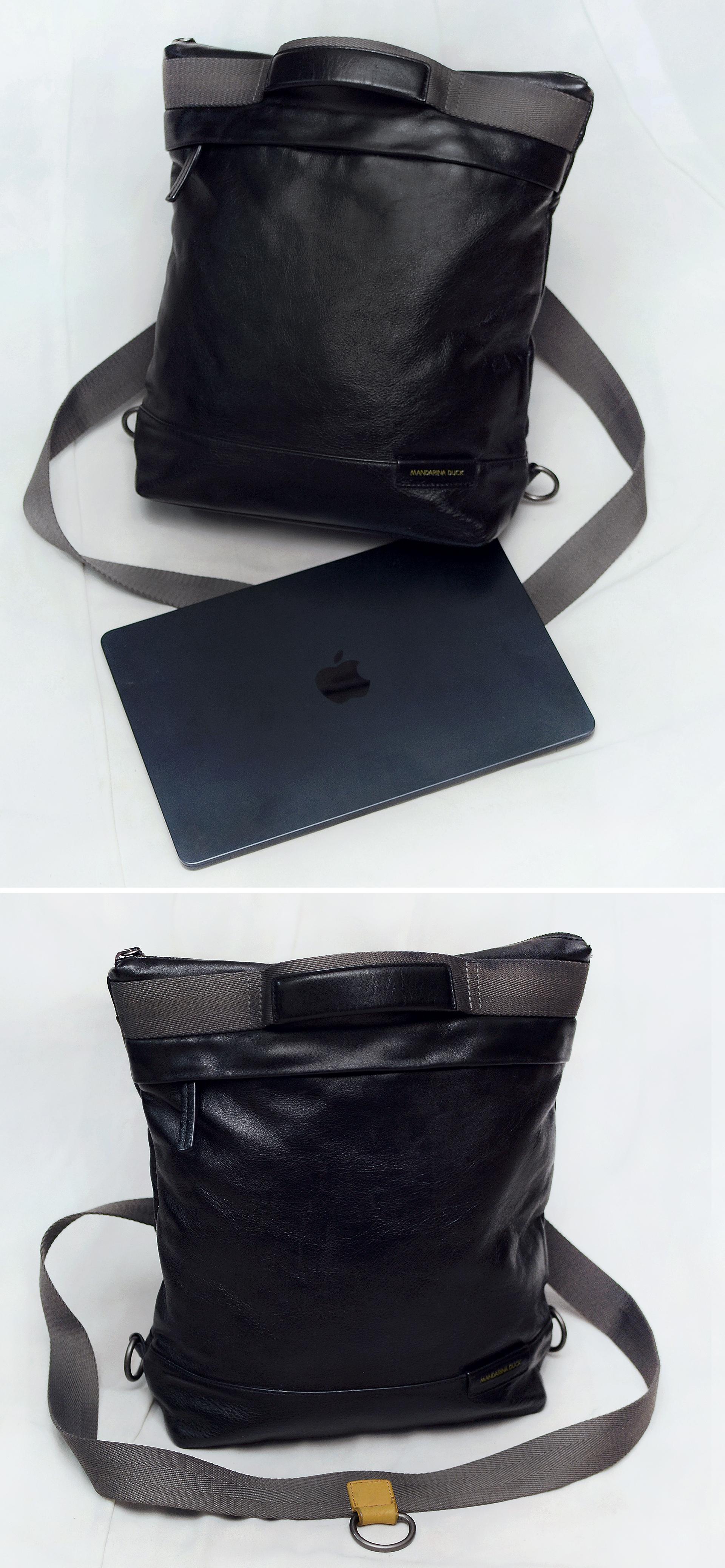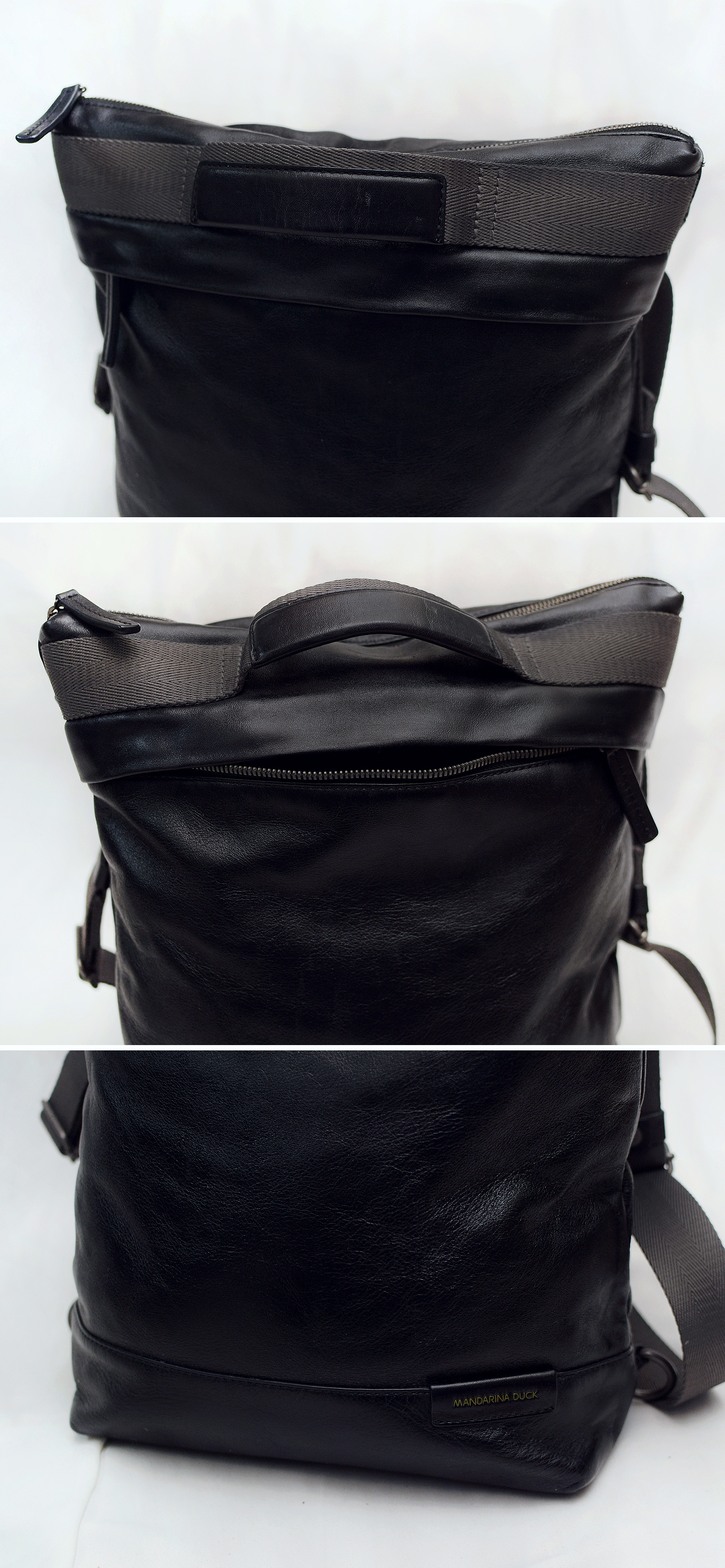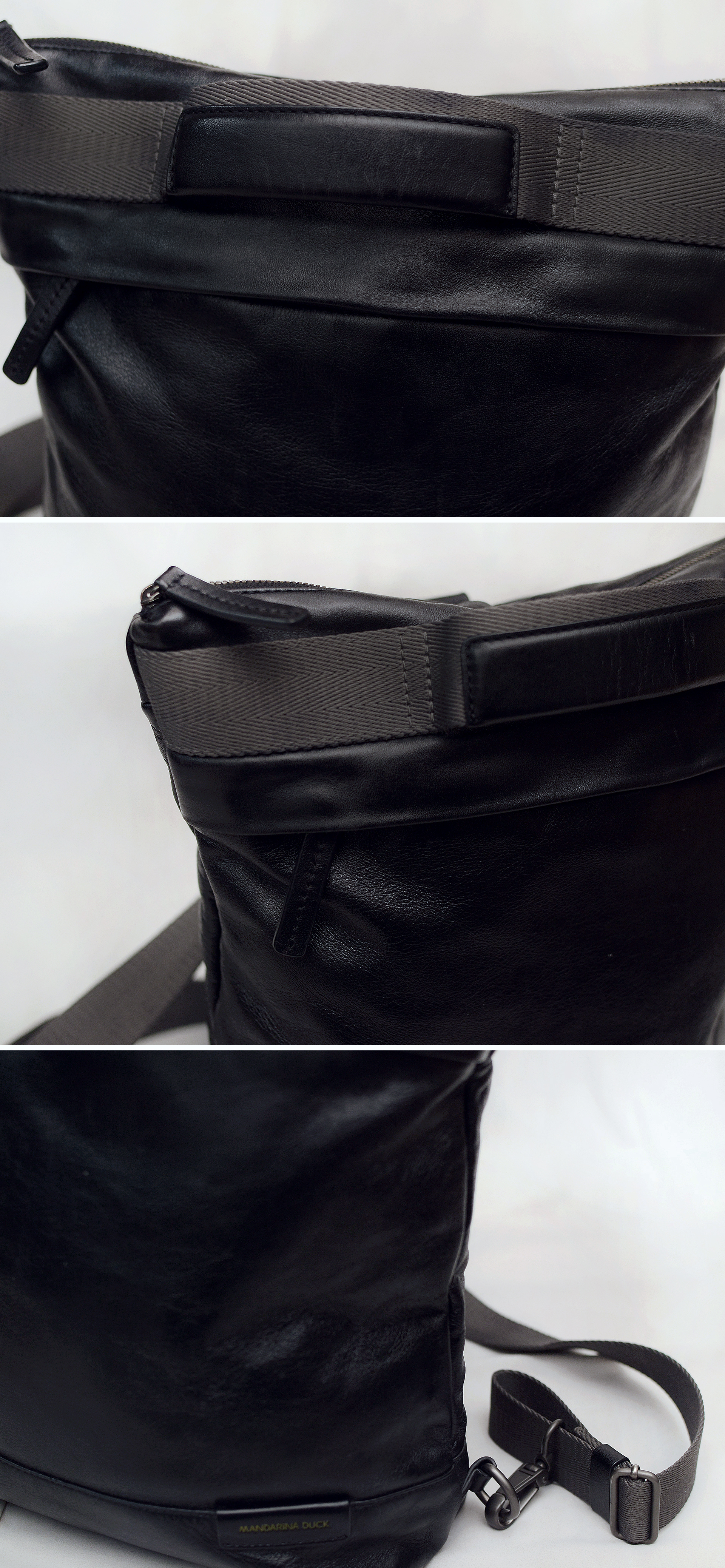 요즘 나오는 원가절감한 폴리소재 인조가죽이나 나일론 캔버스 가방이 아닌 만다리나덕 브랜드 정말 제대로 이탈리안 무드의 디자인과 최고급 소재로 잘 만들던 시절의 가방으로 톤다운된 블랙 컬러 이태리 카프스킨 (송아지 가죽) 복스레더 소재 특유의 실키하고 부드러운 촉감과 광택 매우 좋은 최상급 퀄리티 가죽에 탄탄한 그레이 컬러 멀티웨이 우븐 스트랩 스틸 그레이컬러 단조 금속링등 디자인.소재.만듬새등 모든 부분에서 뛰어나게 잘 만들어진 가방입니다. 드는 방식이나 스트랩 매는 형태에 따라 토트.숄더.크로스.백팩등 어떠한 형태로도 자유롭게 들 수 있는 멀티웨이 스타일로 다양하게 활용하기 좋습니다. 유니크한 디자인과 좋은 만듬새로 잘 안써도 소장용으로 가지고 있을까 했지만 다른 가방들 너무 많아 앞으로도 계속 안쓰고 보관만 할거 같아 잘 써주실 분에게 보내봅니다.