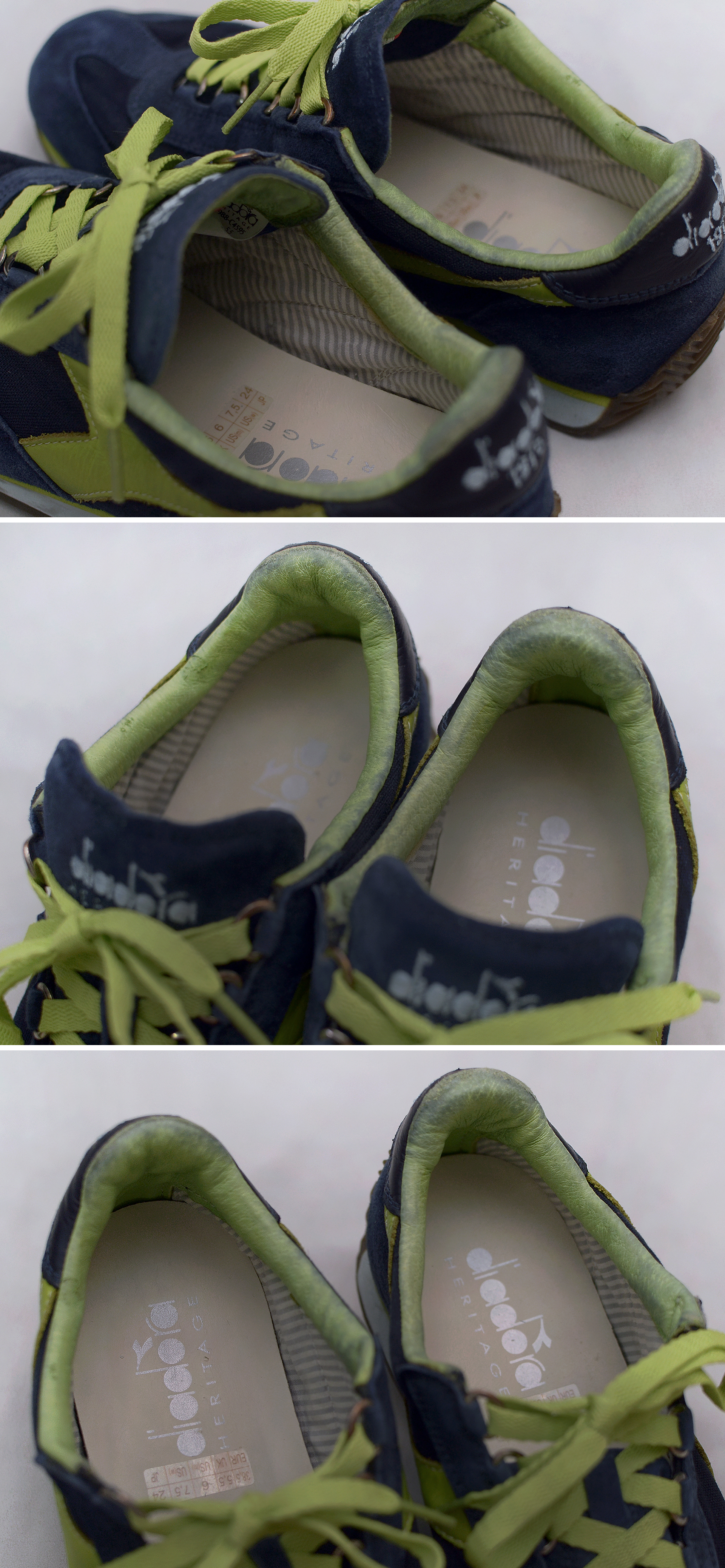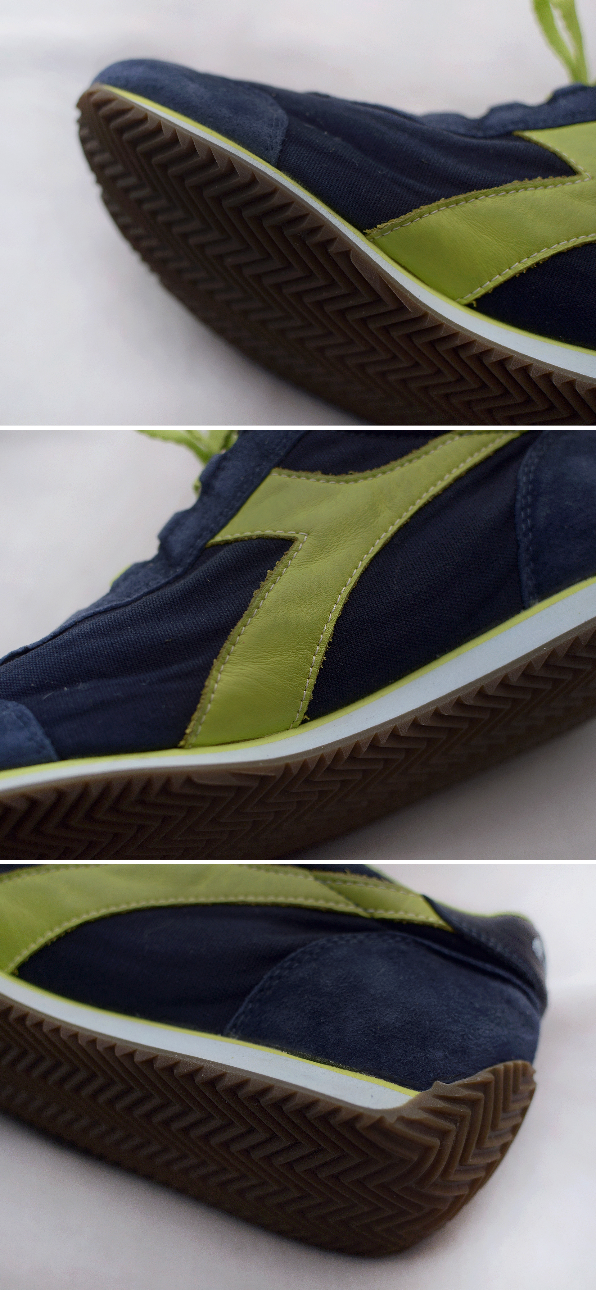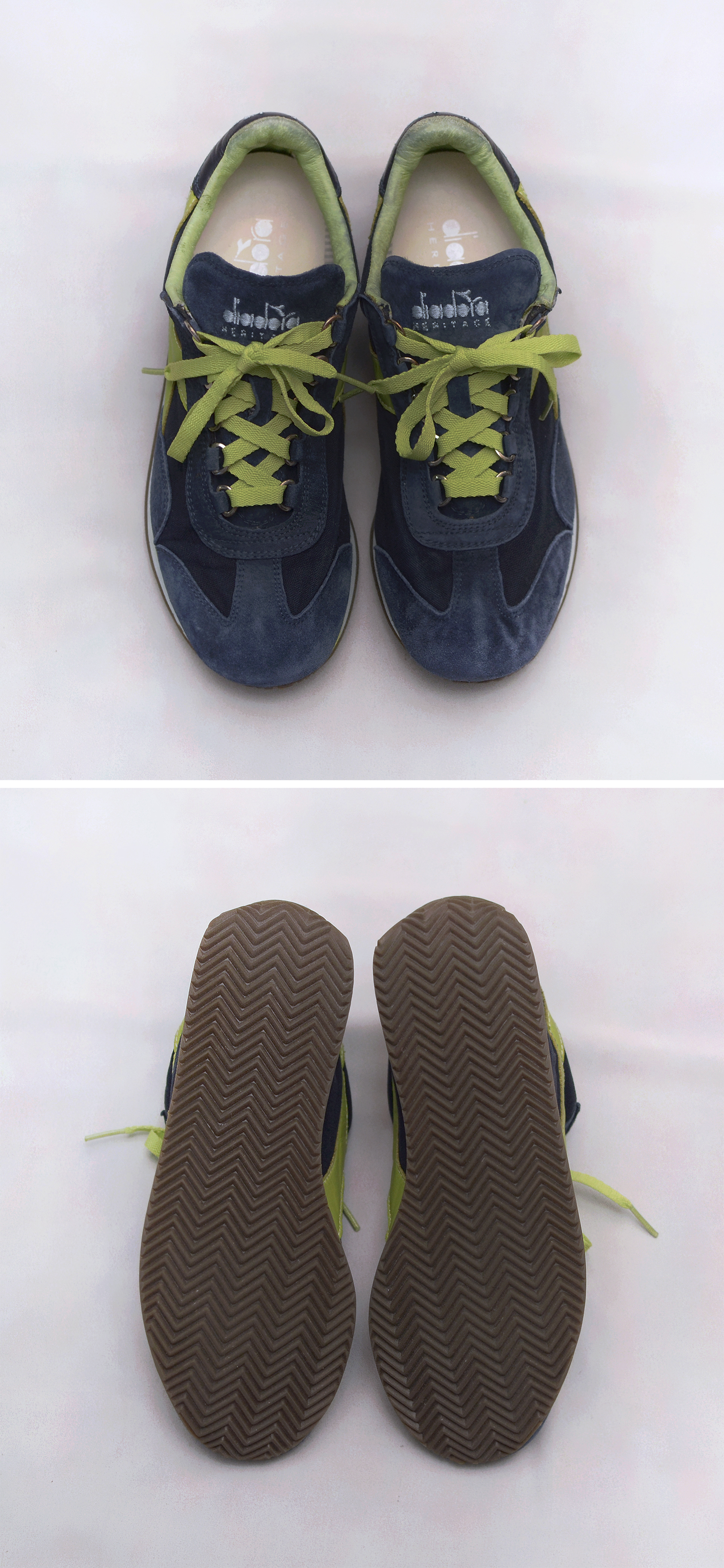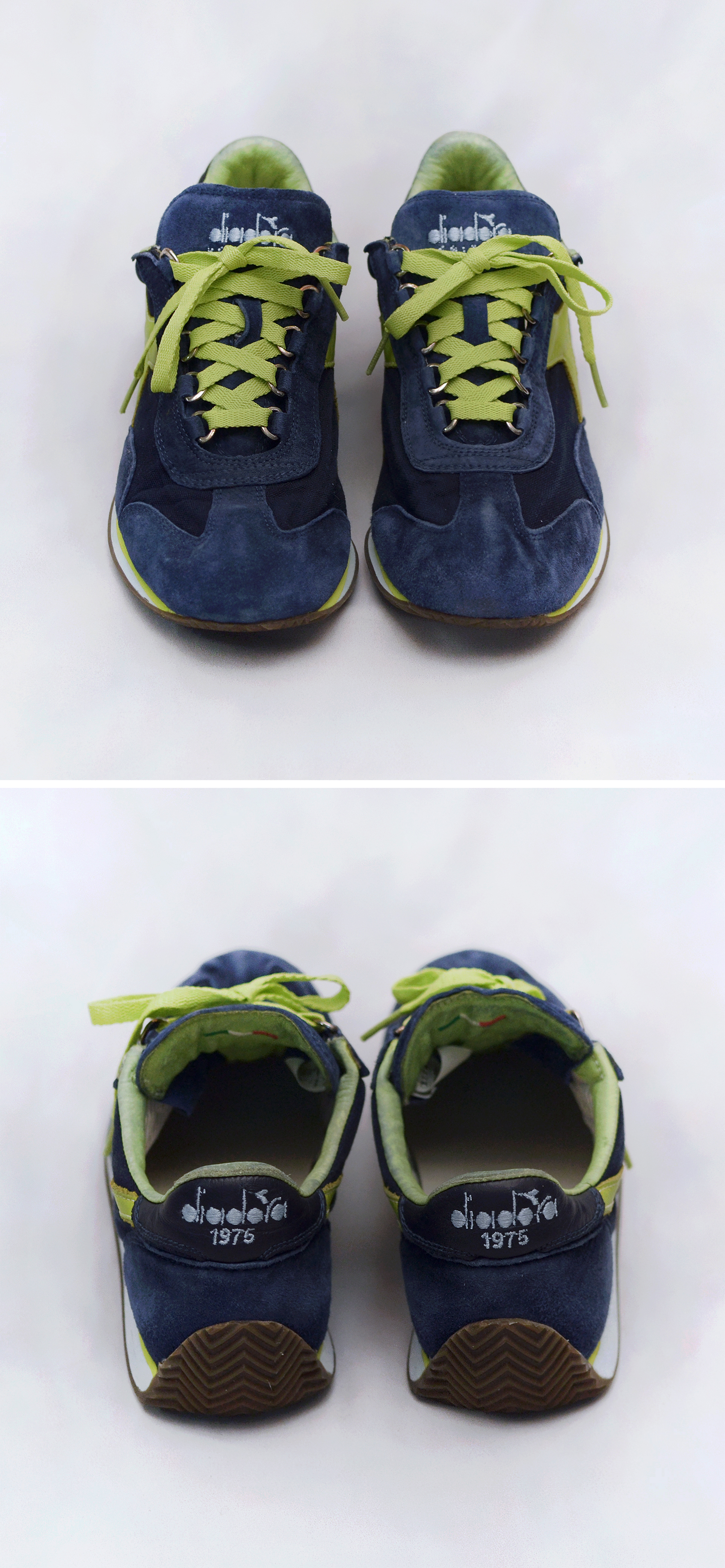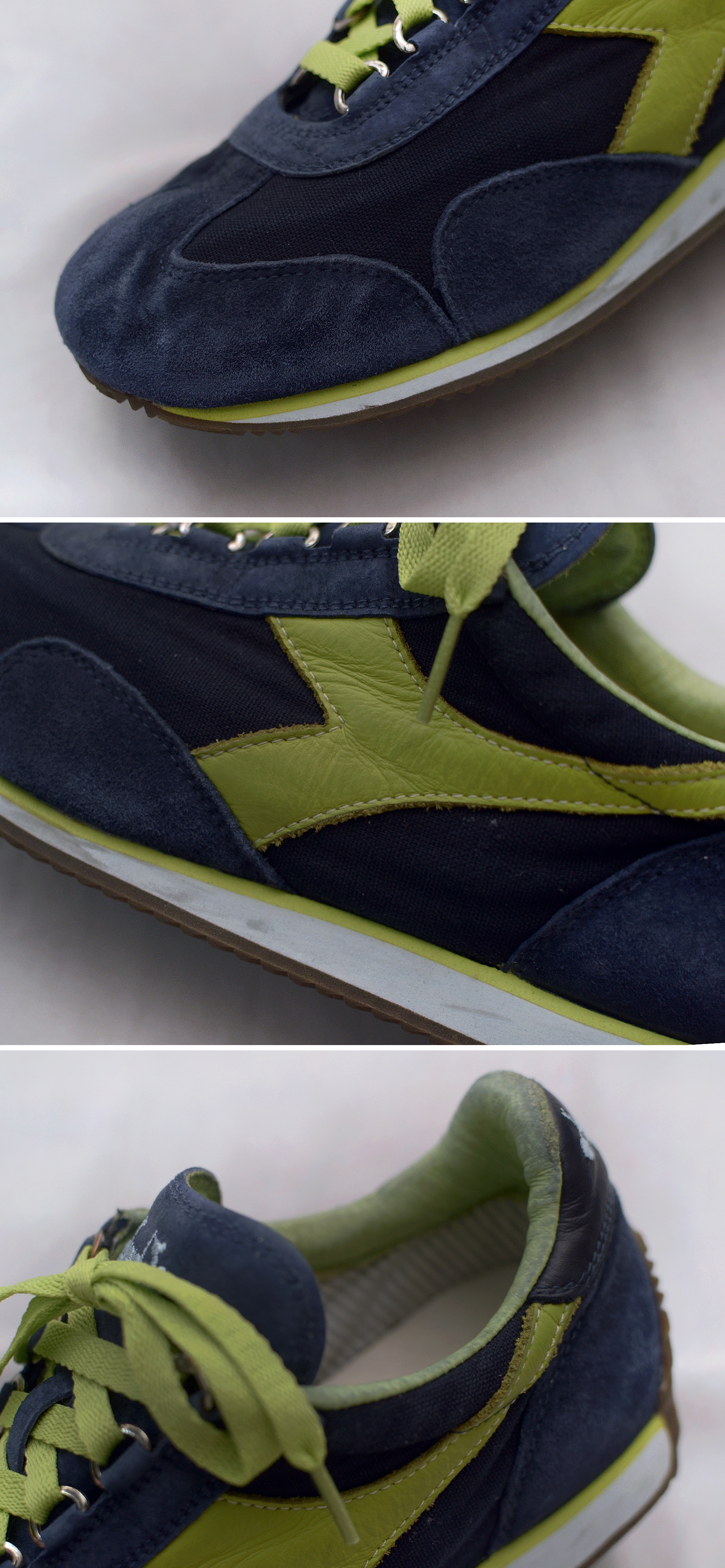 이탈리아의 국민 스포츠웨어 브랜드 디아도라의 헤리티지 이큅 스톤워시 빈티지 레더 가죽 스니커즈 입니다. 축구의 나라 이탈리아 브랜드답게 축구화.축구용품을 가장 주력으로 하는 브랜드지만 런닝화.마라톤화등 조거계열 스니커즈에서도 꽤 높은 평가를 받는 디아도라의 일상화 캐쥬얼 스니커즈 라인으로 네이비 블루컬러 (플름 블루) 베이스에 애시드 그린 컬러 포인트 배색된 클래식한 스타일의 스웨이드 레더 가죽 스니커즈 스타일에 짙은 스톤워시 가공으로 빈티지한 느낌을 더해 실착하며 시간 지날수록 러기지한 스타일 더해져 더욱 멋스럽게 변해가는 신발입니다. 뉴발란스 327처럼 아웃솔 바닥부분이 뒤축 힐컵까지 올라오는 형태로 되어있어 견고함 높이고 지면에 닿았을때 자연스러운 쿠셔닝 더해주고 슈레이스 일반적인 펀칭홀 타입 아니고 D형 금속링으로 되어있어 줄꼬임등 없이 착용감 매우 좋습니다.