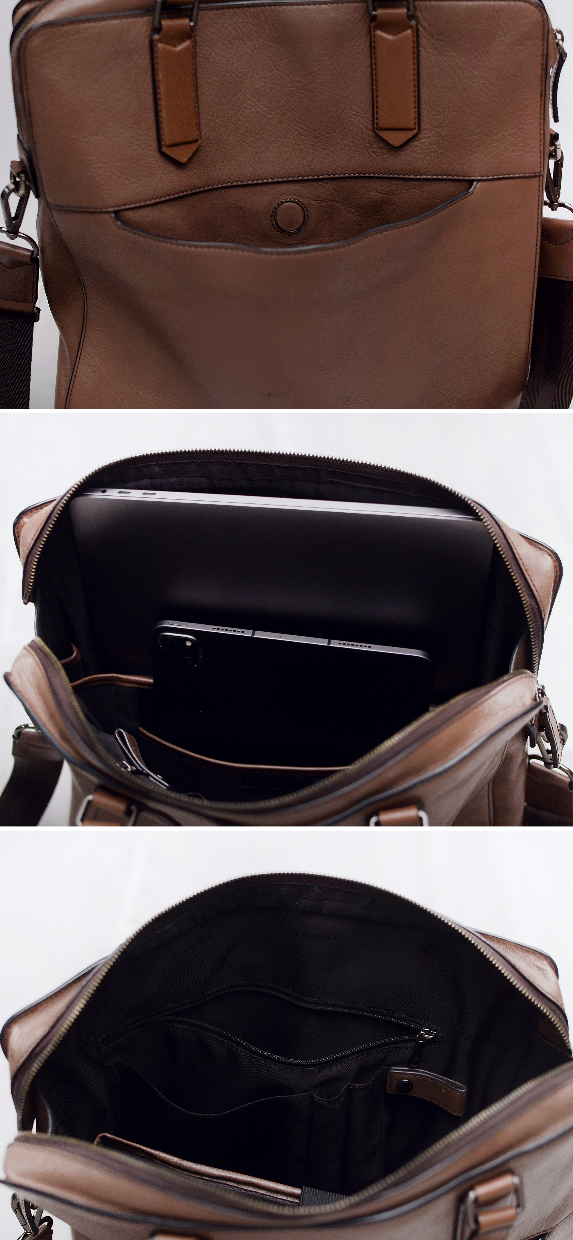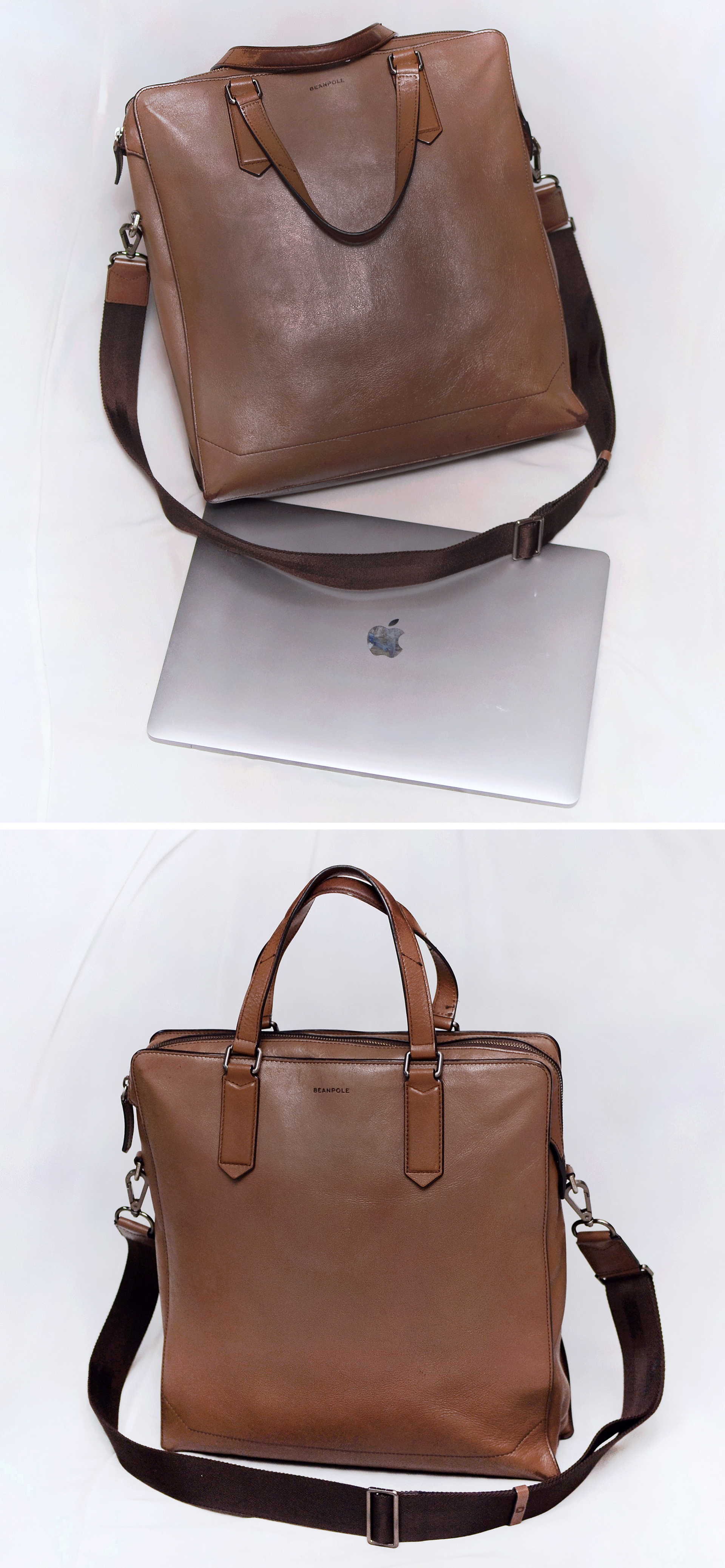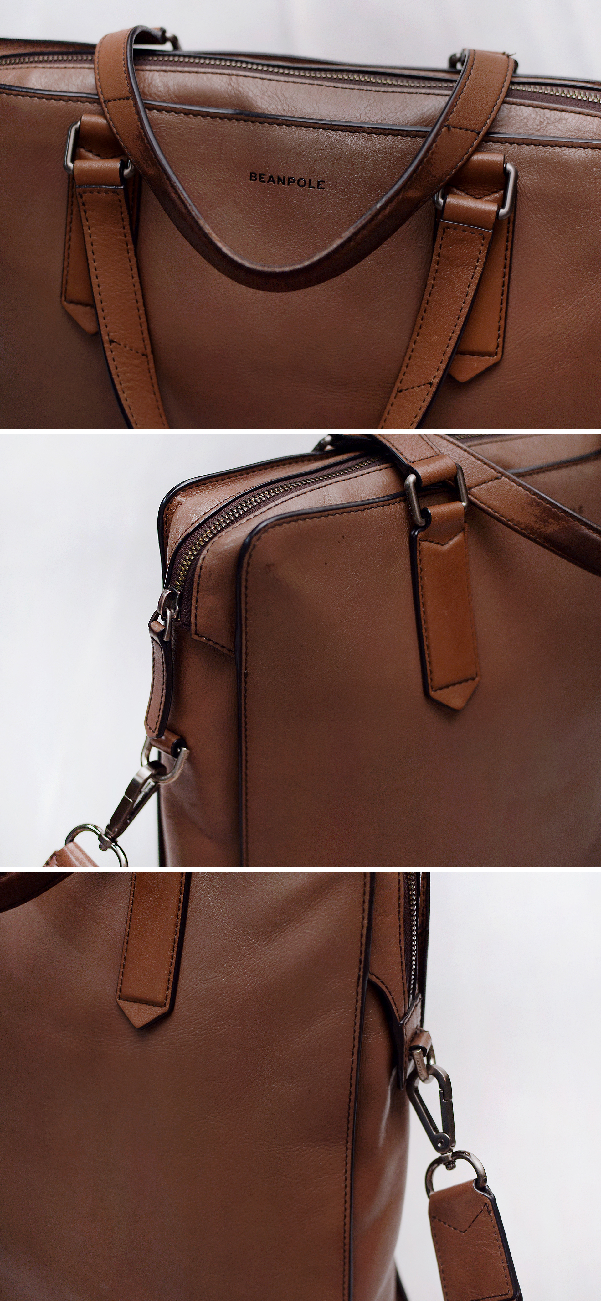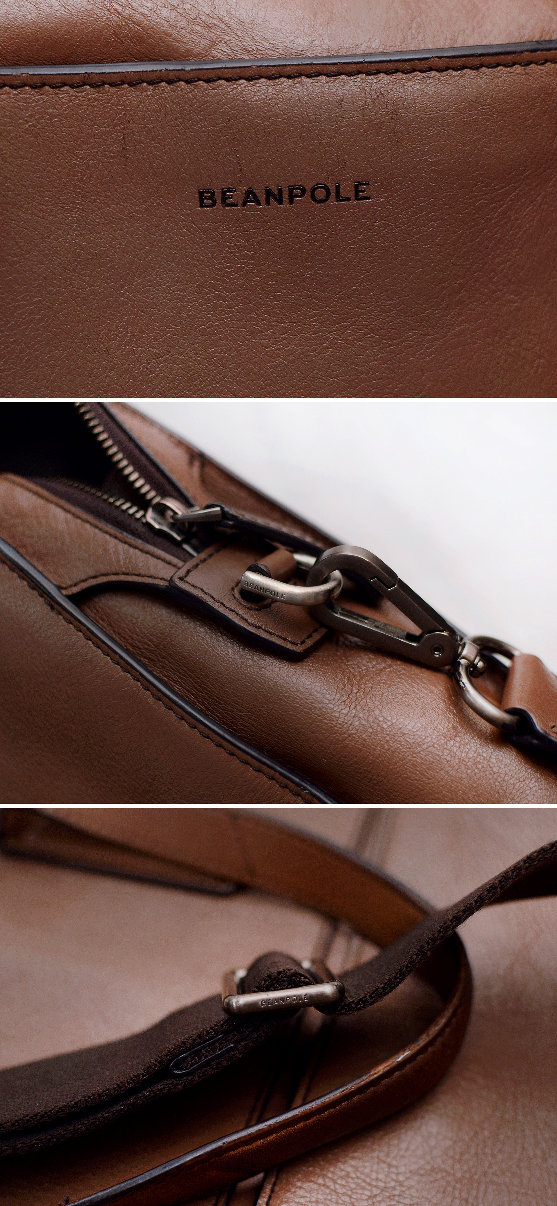 삼성물산.제일모직의 클래식 캐쥬얼 스타일 국산 컨템포러리 대표 브랜드 빈폴의 가죽 브리프케이스.서류가방 입니다. 유러피안 클래식 캐쥬얼 스타일을 기반으로 하는 깔끔한 스퀘어 타입 가죽 투핸들 토트백 형태에 톤다운된 브라운 컬러 천연가죽 탑그레인 복스코팅 레더 소재로 부드러운 촉감과 은은한 광택감 좋고 지나치게 무겁지 않아 편하게 들기 좋습니다. 뒤쪽에 부드러운 마그네틱 오픈되는 퀵포켓 있어 휴대폰이나 지갑등 자주 사용하는 물품들 넣고 쓰기 좋고 지퍼 오픈되는 메인 포켓 안쪽으로 15-16인치급 랩탑.노트북 딱맞게 들어가는 수납칸과 9.7-11인치 아이패드.타블렛 수납칸등 수납 구성 다채롭게 잘 되어 있어 수납 효율성 매우 좋습니다. 탈착 가능한 스트랩 있어 숄더.크로스 자유롭게 착용 가능하고 호불호 없이 멋스러운 컬러감으로 정장.캐쥬얼 어떤 스타일에도 두루 잘 어울립니다.