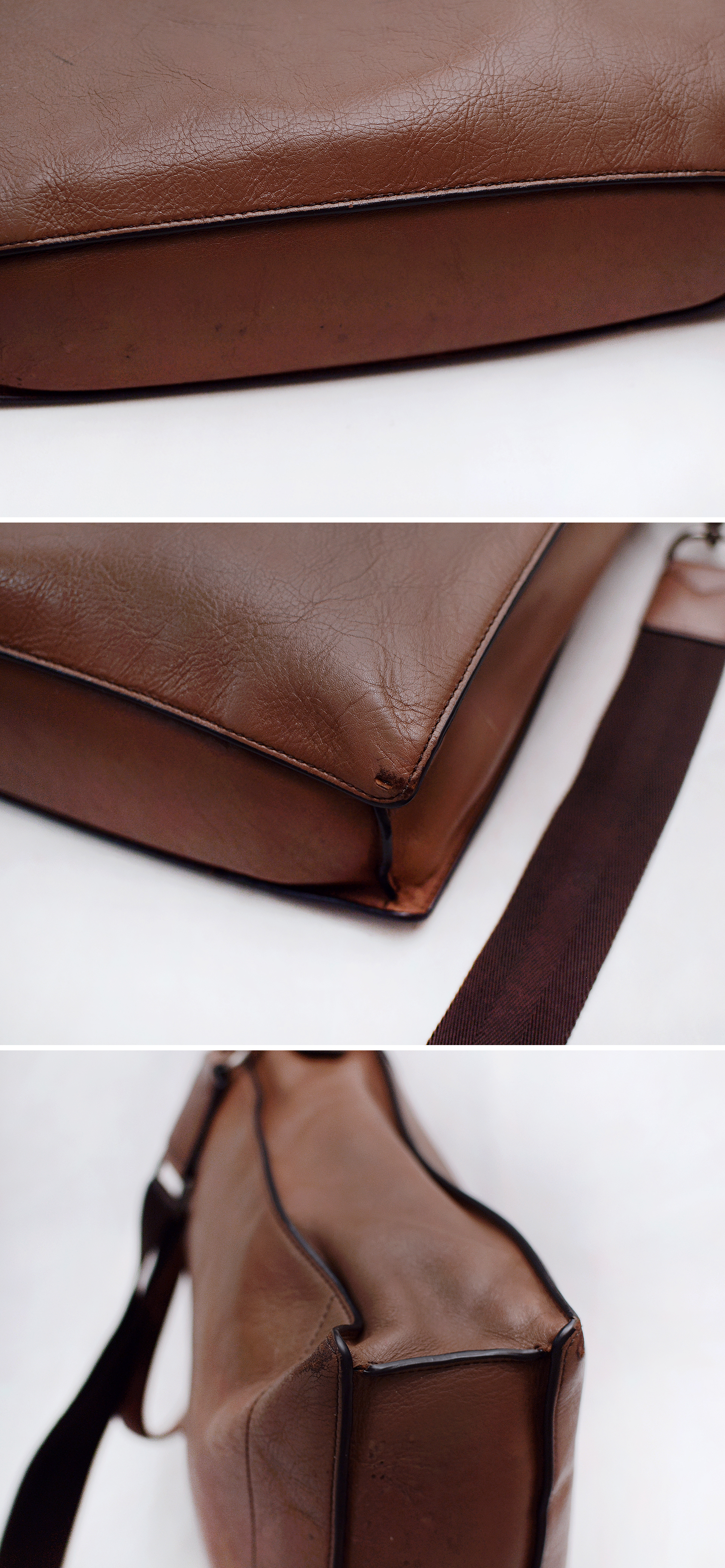 정도의 미디움 라지 사이즈로 A4 서류파일 15-16인치급 노트븍 충분히 수납 가능해 멋스러운 일상용 데일리백부터 출퇴근용 서류가방 비즈니스백으로 두루 편하게 쓰기 좋습니다. 소재 형태 특성상 자주 손닿는 가죽 핸들 부분이나 코너 엣지 부분등에 태닝.에이징등 자연스러운 사용감 정도 있으나 다른 가방들 많아 돌려가며 쓰는 편이라 찢김.뜯김등 눈에띄는 큰 파손.훼손없이 상태 양호합니다.