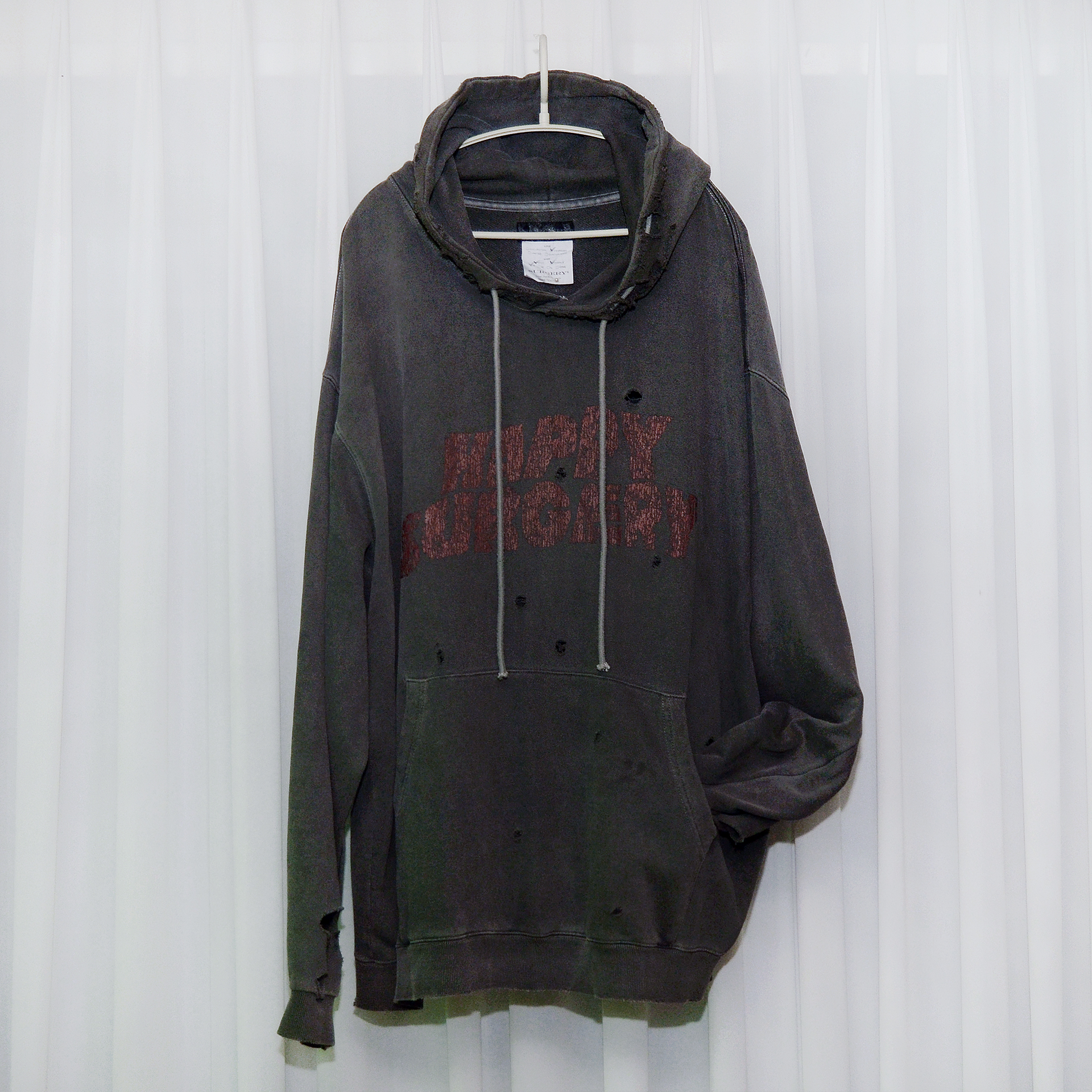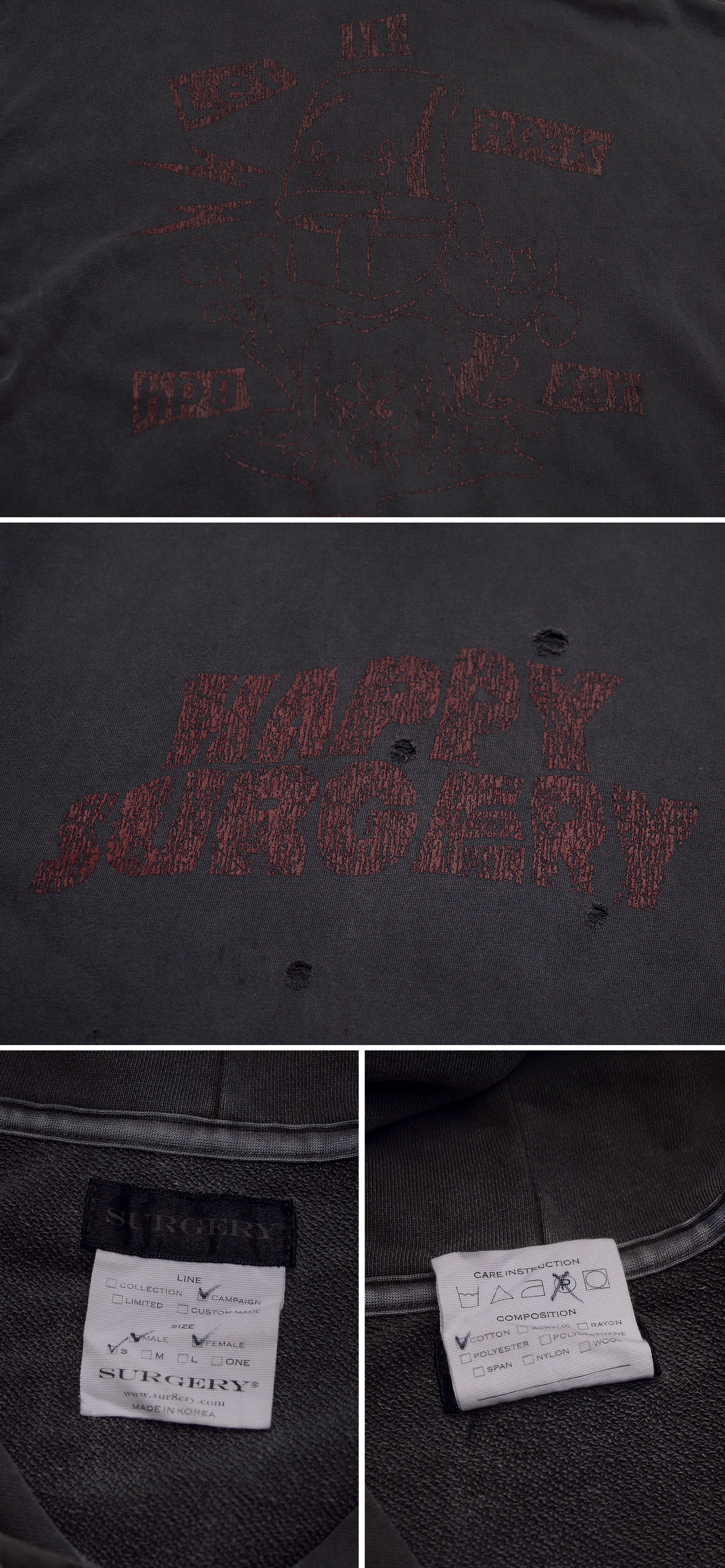 써저리 (수술) 라는 브랜드 네이밍답게 해제주의 디자인을 기반으로한 커스텀 리메이크 스타일로 한국의 마틴 마르지엘라로 불리는 김서준 디자이너의 하이 스트릿 브랜드 써저리와 블랙핑크 제니등이 착용해 화제가된 개인화된 커스텀 페인팅 스타일로 유명한 해피피플갤러리의 콜라보 한정판으로 발매되었던 락 피그먼트 코튼 오버 후드티셔츠 입니다. 써저리다운 리메이크 스타일의 빈티지 러스틱한 느낌의 톤다운된 컬러감과 의도적인 페이딩 강조된 피그먼트 워싱의 묵직하면서도 지나치게 무겁지 않은 코튼 소재에 러기지한 데미지 디테일들에 해피피플갤러리 다운 전면에 해피서저리 커스텀 레터링 로고 페인팅과 캐릭터 일러스트 백프린팅으로 유니크하고 멋스럽습니다.