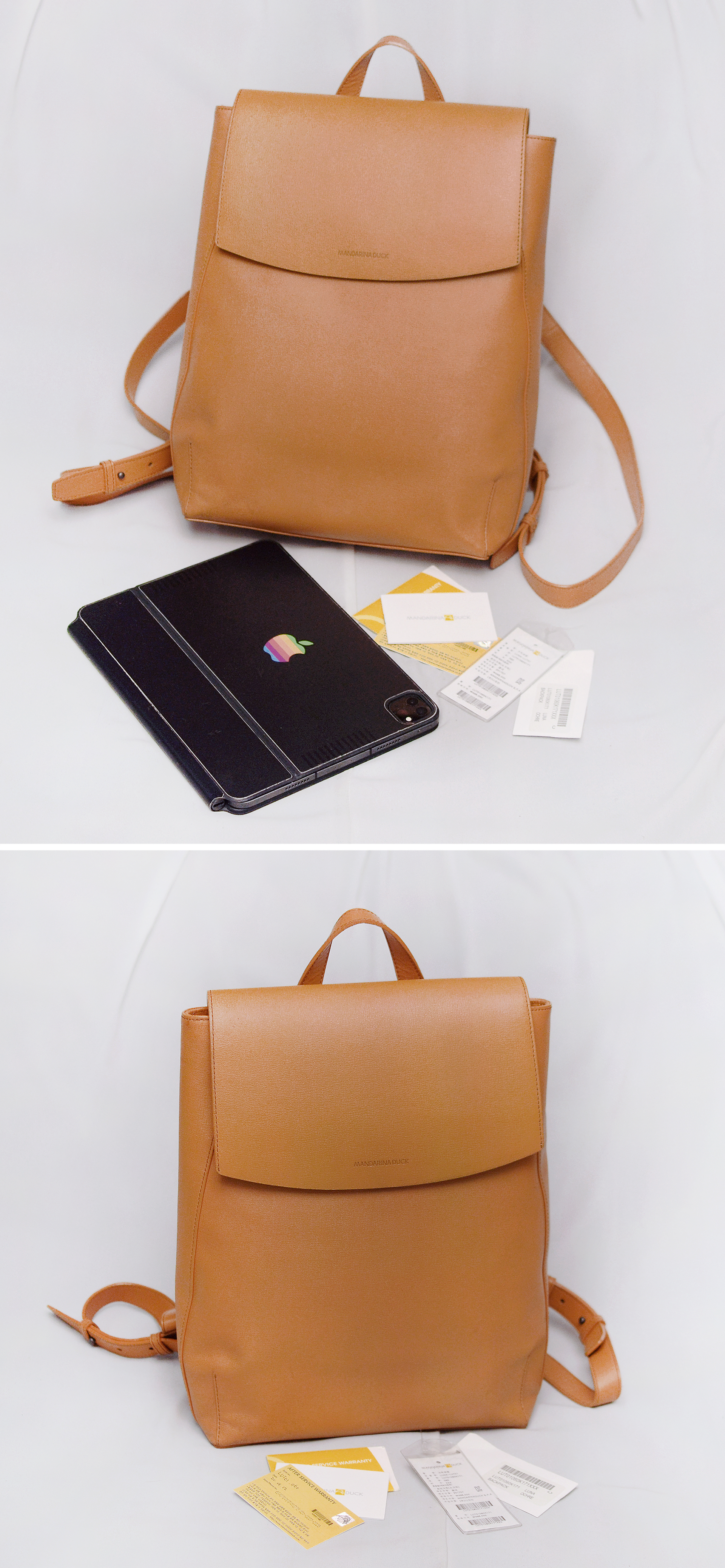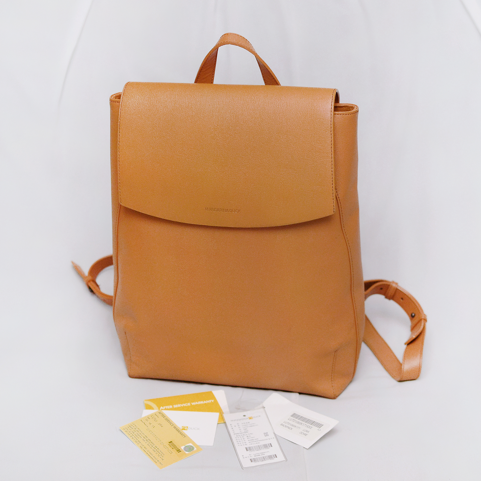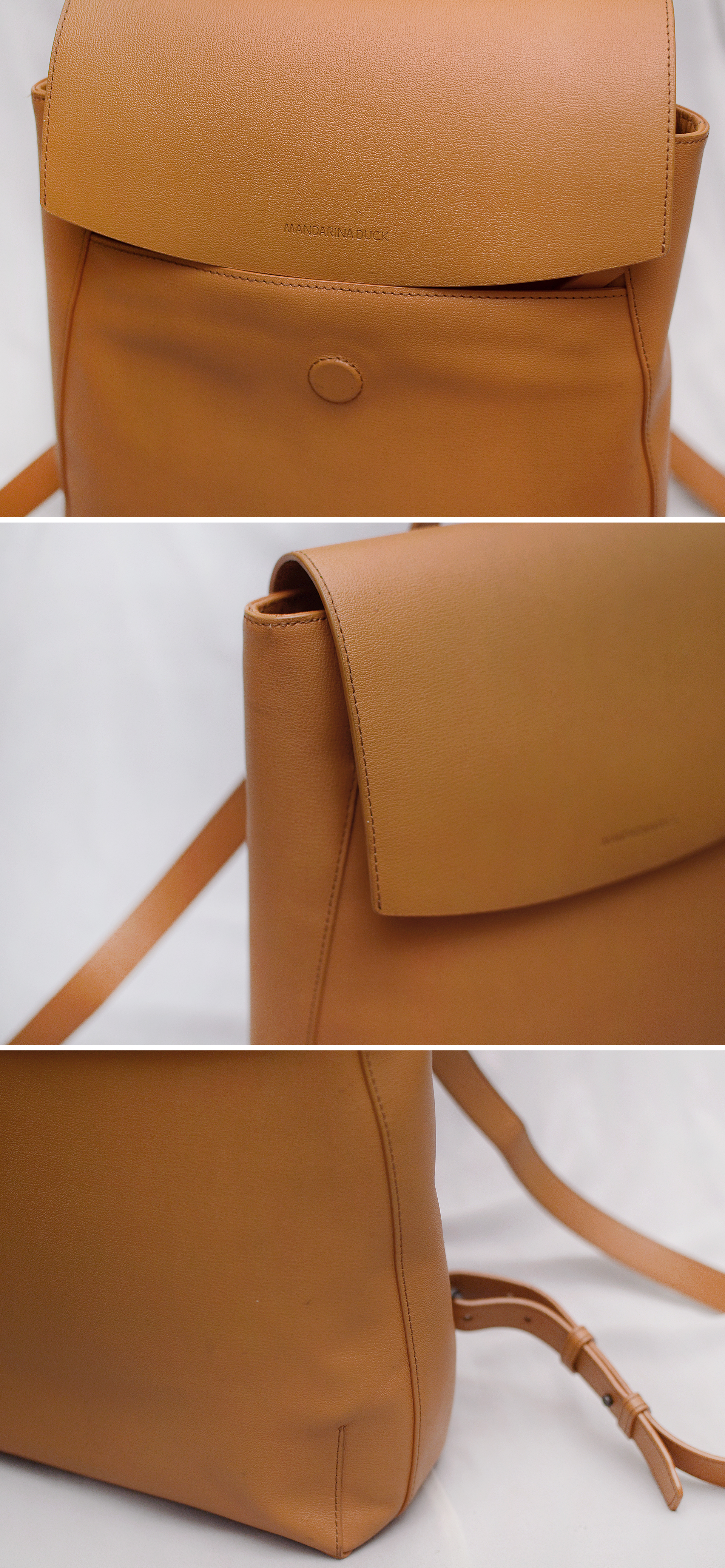 만다리나덕 루나 사피아노 레더 올가죽 백팩 오커 브라운 컬러입니다. 화사하면서도 깔끔한 오렌지톤 브라운 컬러에 사피아노 엠보의 풀그레인 레더 소재에 딱 떨어지는 탄탄하고 포멀한 스퀘어 타입 가죽 백팩으로 바디뿐 아니라 어깨끈 부분들까지 전부 동일한 가죽 소재로 되어있는 올가죽 타입의 고급형 가죽 백팩입니다. 만다리나덕다운 군더더기없이 깔끔한 미니멀하고 유니크한 스타일 이면서도 전면 자석 접착식 플랩 안쪽에 히든 타입 포켓과 등부분 지퍼 퀵포켓등 내.외부 포켓 구성 다채롭게 잘 되어있어 수납성.실용성도 매우 좋습니다.
