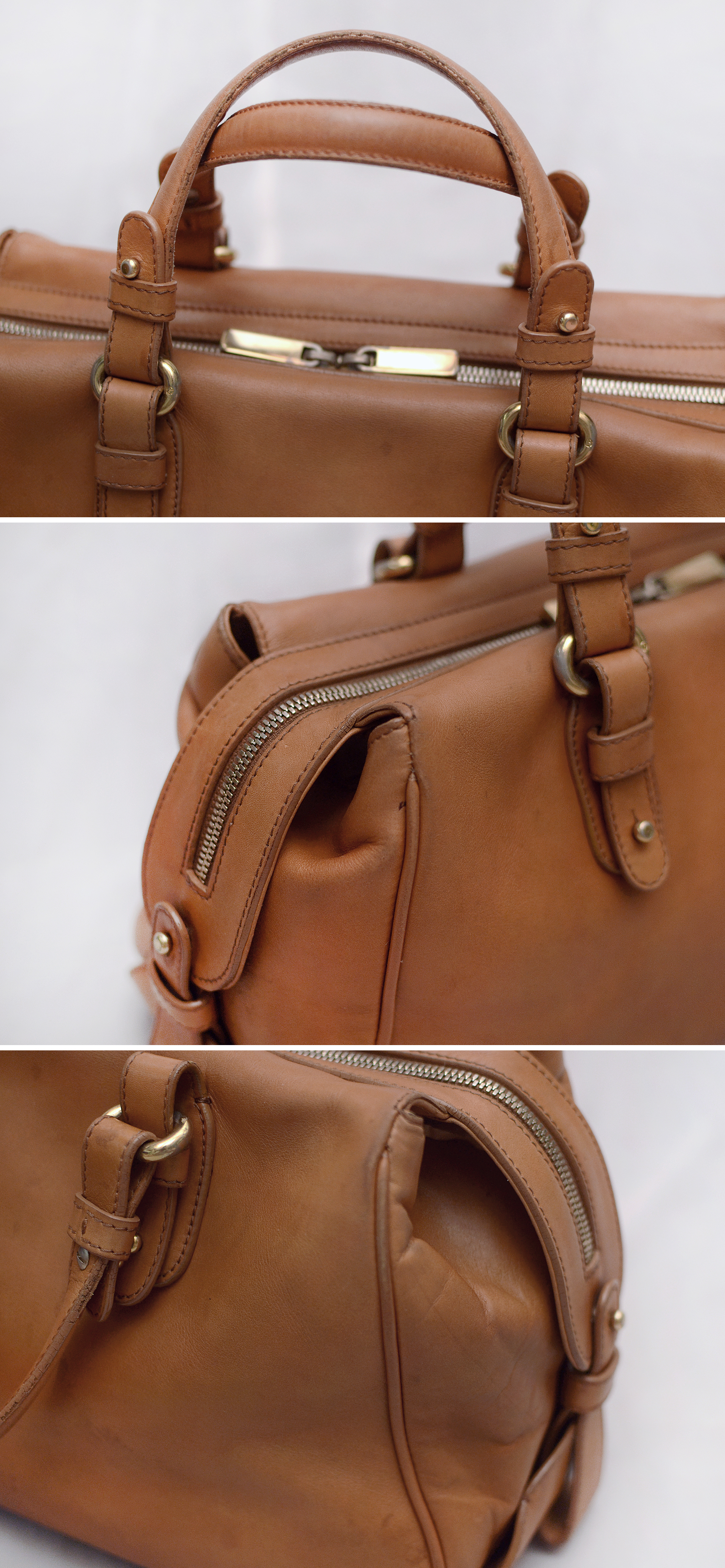 정도의 미디움 사이즈로 측면까지 넓고 시원하게 열리는 더블 지퍼 오픈 방식에 크기에 비해 바닥폭 넓은 보스턴백 형태라 수납품 넣고 찾기 편하고 실용적입니다. 다양한 물품들 편하게 넣고 다니는 일상용 데일리백부터 간단한 1박 정도의 여행가방 등으로 쓰기 좋습니다. 천연 베지터블 레더 특유의 경년변화에 따른 멋스러운 태닝.에이징과 가죽 핸들 부분이나 바닥 부분등에 자연스러운 사용감 정도 있으나 사용전후로 꾸준히 가죽 에센스로 관리해줘 가죽 상태 잘 유지했고 큰 파손.훼손없이 상태 양호합니다. 워낙 멋스러운 최고급 클래식 가죽 가방이라 잘 안써도 소장할까 했으나 다른 가방들 너무 많아 앞으로도 잘 안쓸거 같아 잘 써주실 분에게 보내봅니다.