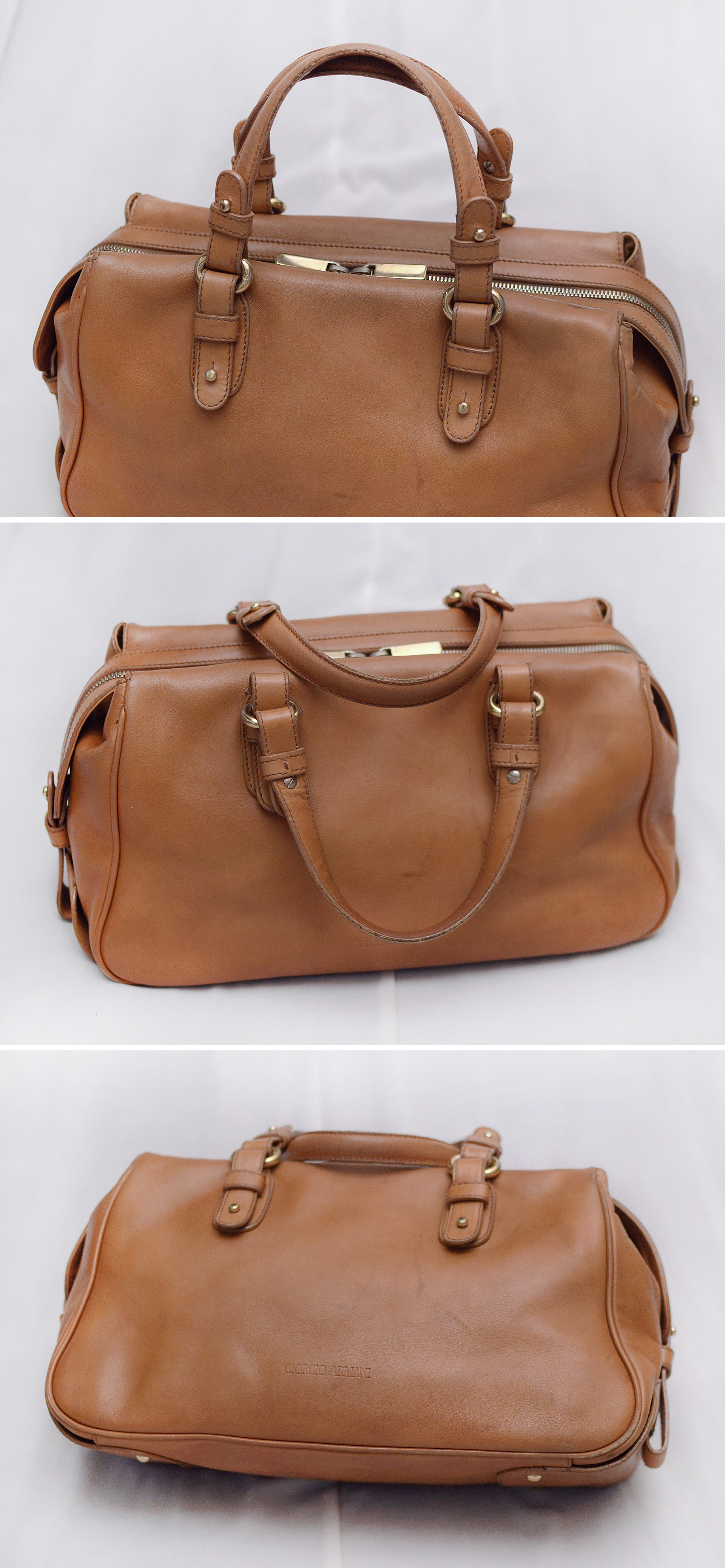 알마니 브랜드 최상급 플래그쉽 레이블인 메인 명품 브랜드 조르지오 알마니 (G.A) 의 클래식 스타일 투핸들 가죽 토트백 보스턴백 입니다. 가장 이탈리아 스러운 명품 브랜드로 손꼽히는 아르마니다운 깔끔하고 심플하면서도 클래식한 정통 유러피안 스타일 돋보이는 토트백.보스턴백으로 최고급 이탈리안 베지터블 비텔로 바케타 (vacchetta) 레더의 아름다운 컬러감과 매트한 광택감에 부드러운 촉감 매우 좋고 접히는 형태나 시간 지남에 따라 자연스럽게 태닝.에이징으로 만들어지는 고품스러운 가죽 피타냐 아릅답게 익어가는 소재감 훌륭합니다.