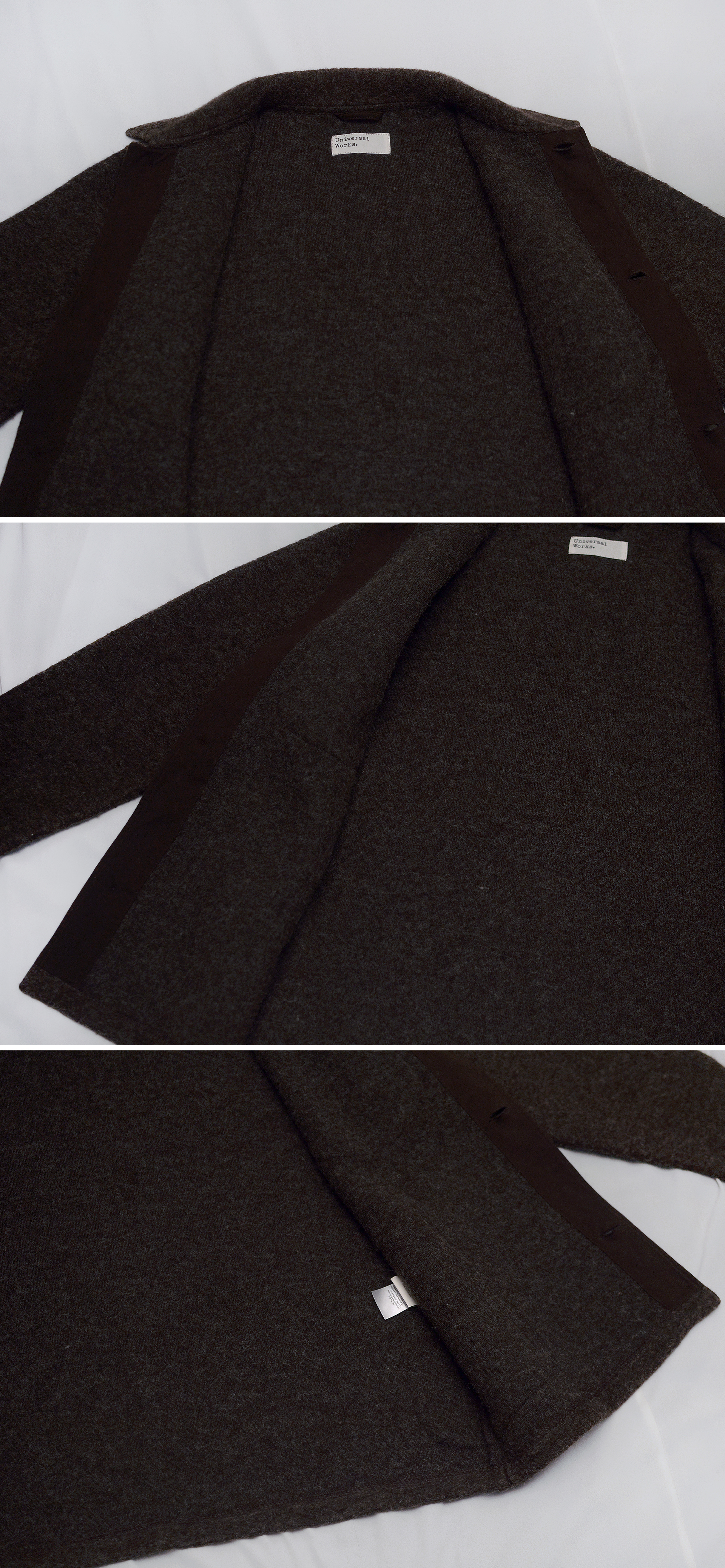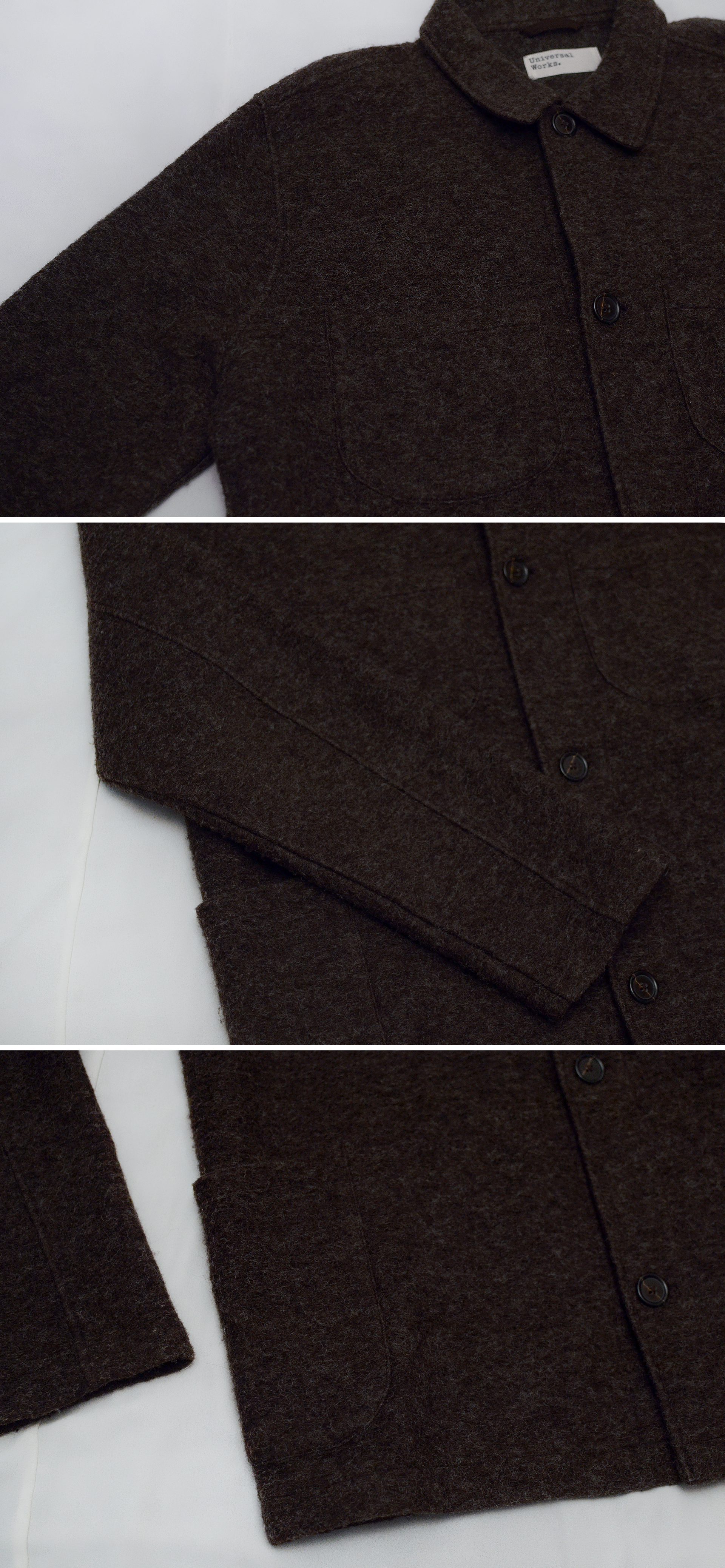 영국 워크웨어 스타일 하이 컨템포러리 브랜드 유니버셜 웍스의 펠트울 플리스 럼버 워크웨어 자켓 입니다. 심플한 스타일에 편안함 착용감을 기본으로 하는 실용적인 워크웨어 형태 기반으로 하는 브랜드 스타일 잘 드러나는 여유롭고 루즈한 핏에 가볍고 편안한 착용감 매우 좋은 자켓으로 울펠트 특유의 가볍고 튼튼한 소재감에 부드럽고 따듯한 느낌의 헤어리한 텍스쳐 느낌 독특하고 멋스럽습니다. 프렌치 워크웨어 스타일을 기반으로 하는 단톤과 전체적인 스타일 느낌은 비슷하면서도 영국 특유의 좀 더 심플하고 무심하게 꾸미지 않으면서 멋스러운 느낌으로 유니크해 봄.가을 간절기 가벼운 아우터 자켓부터 초겨울 겨울철 이너 자켓등으로 다양하게 두루 편하게 입기 좋습니다.