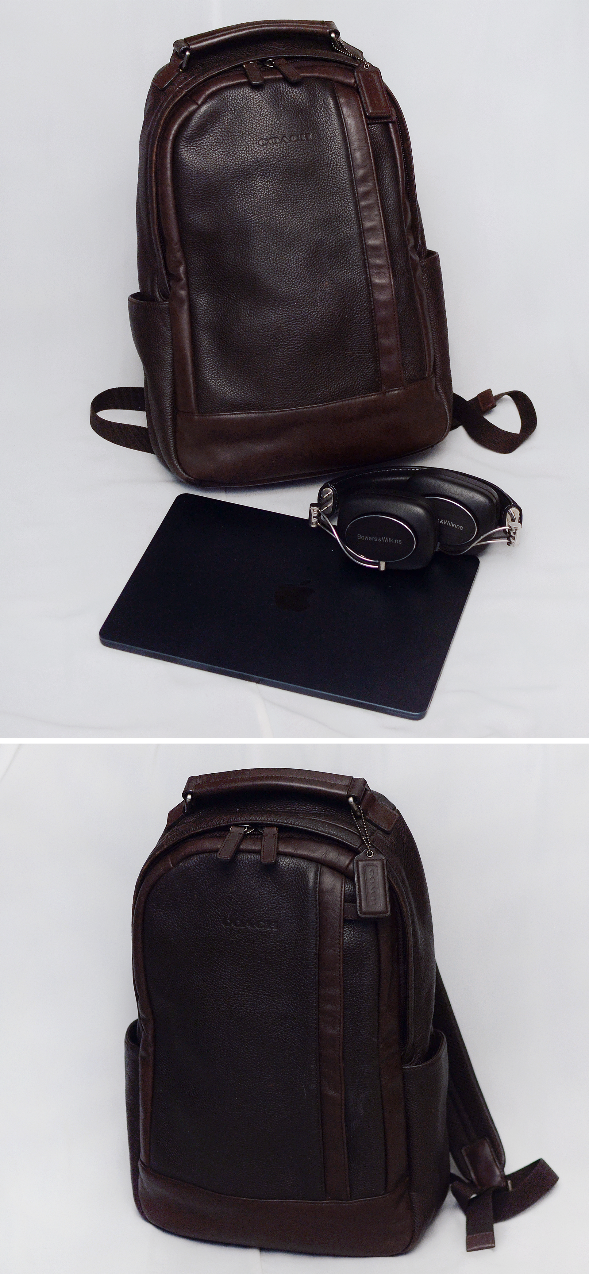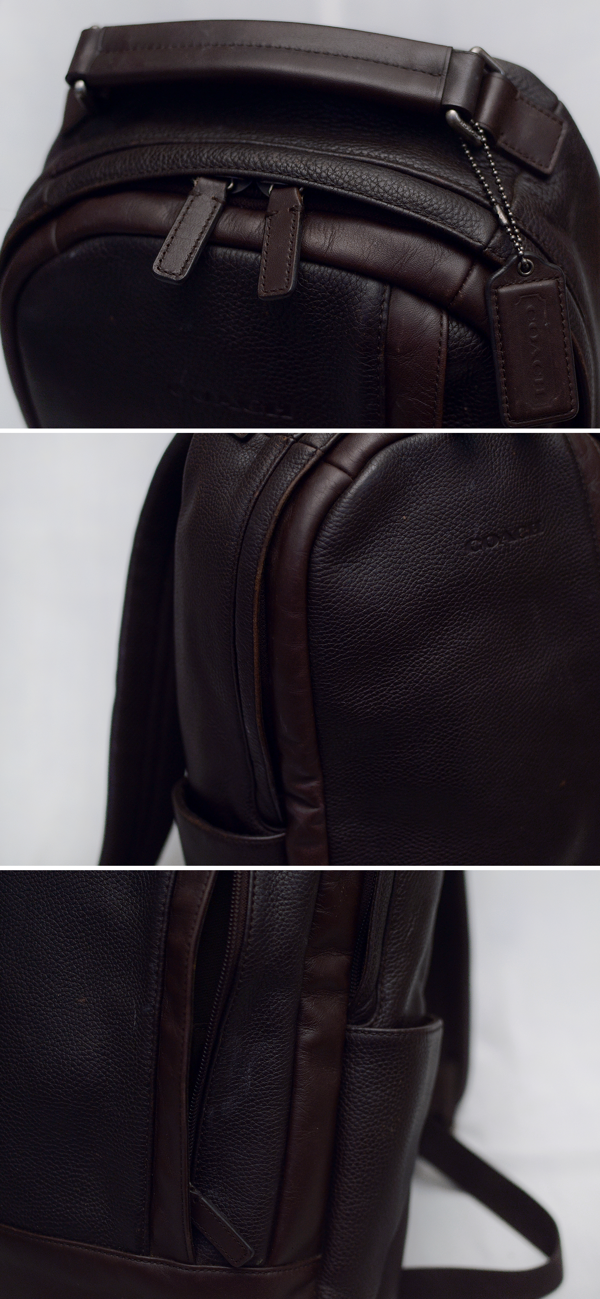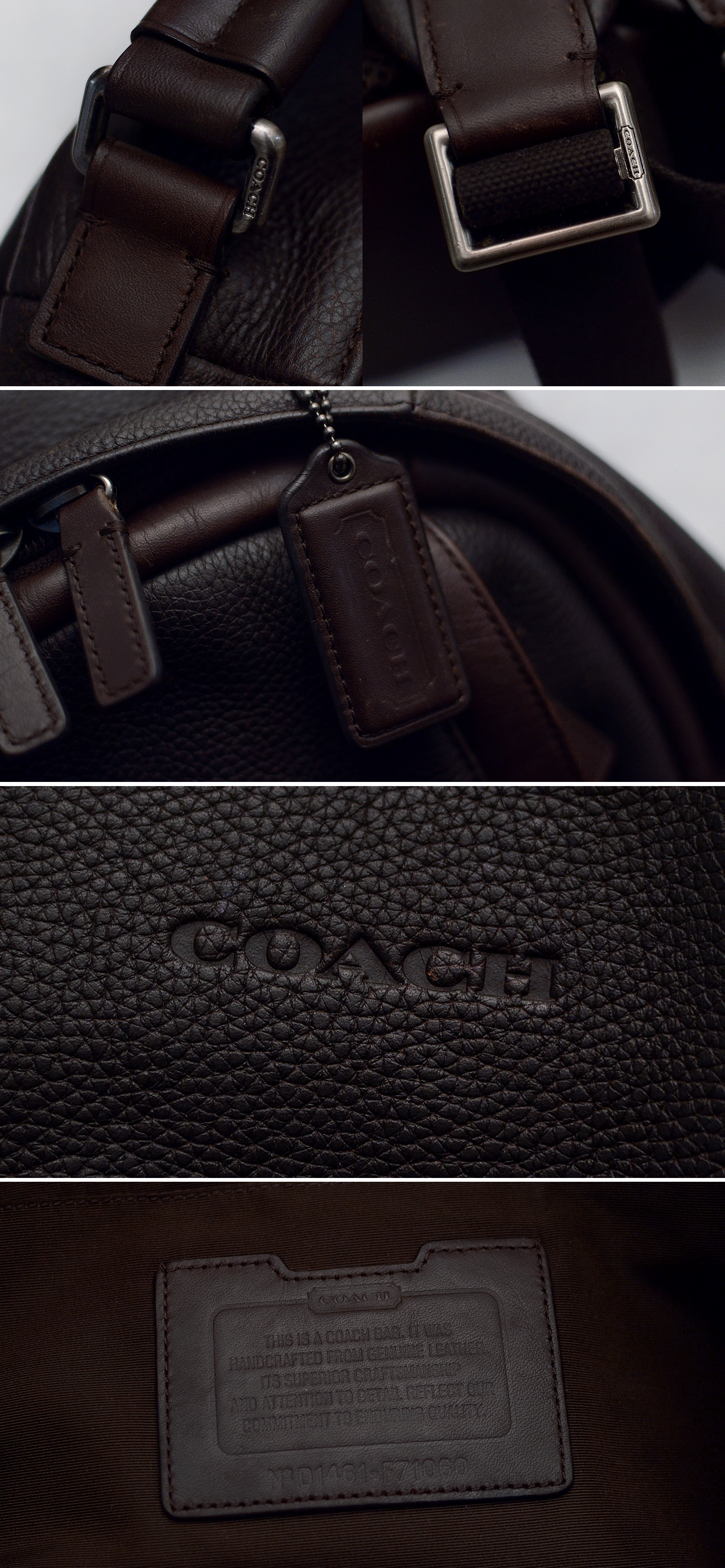 코치 캠든 (Camden) 딥브라운 풀그레인 레더 믹스 핸드크래프트 천연가죽 백팩입니다. 가죽 백팩으로 유명한 코치에서도 대표적인 고급 라인 핸드크래프트 (수작업) 풀레더 라이딩 백팩으로 날렵하고 깔끔한 디자인에 다양한 내.외부 포켓들로 효율적인 수납 가능해 기능성 뛰어난 다용도 백팩입니다. 바디 메인 소재는 도톰한 천연가죽 풀그레인 레더 특유의 가죽 엠보 무늬 돋보이는 다크 브라운 컬러 가죽에 자주 손 닿는 핸들 및 엣지 라이닝 부분에는 톤온톤 컬러의 부드러운 카프스킨 복스레더 소재로 되어있고 어깨끈과 등판 부분에는 패딩 처리된 매쉬 소재로 되어 있어 오래 착용해도 착용감 좋고 쾌적합니다.
