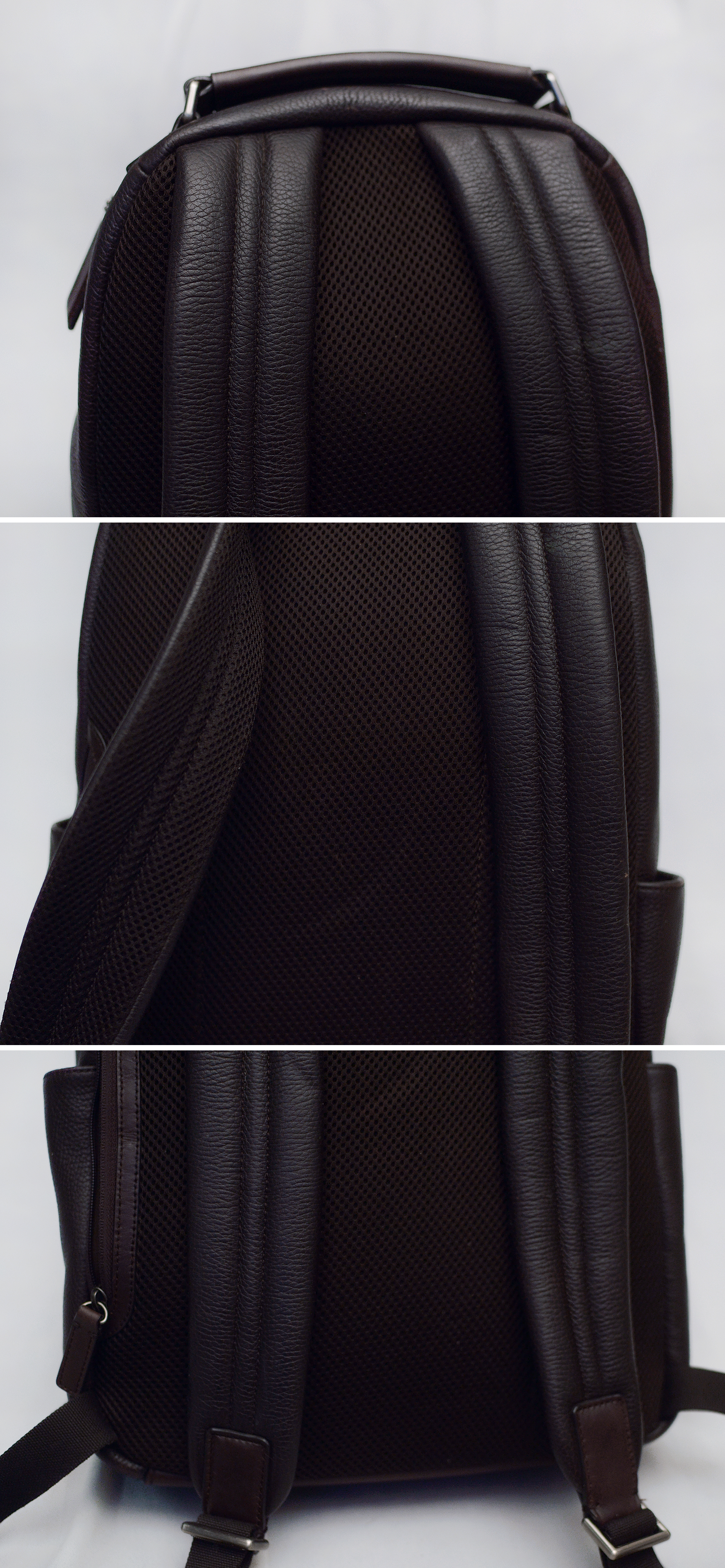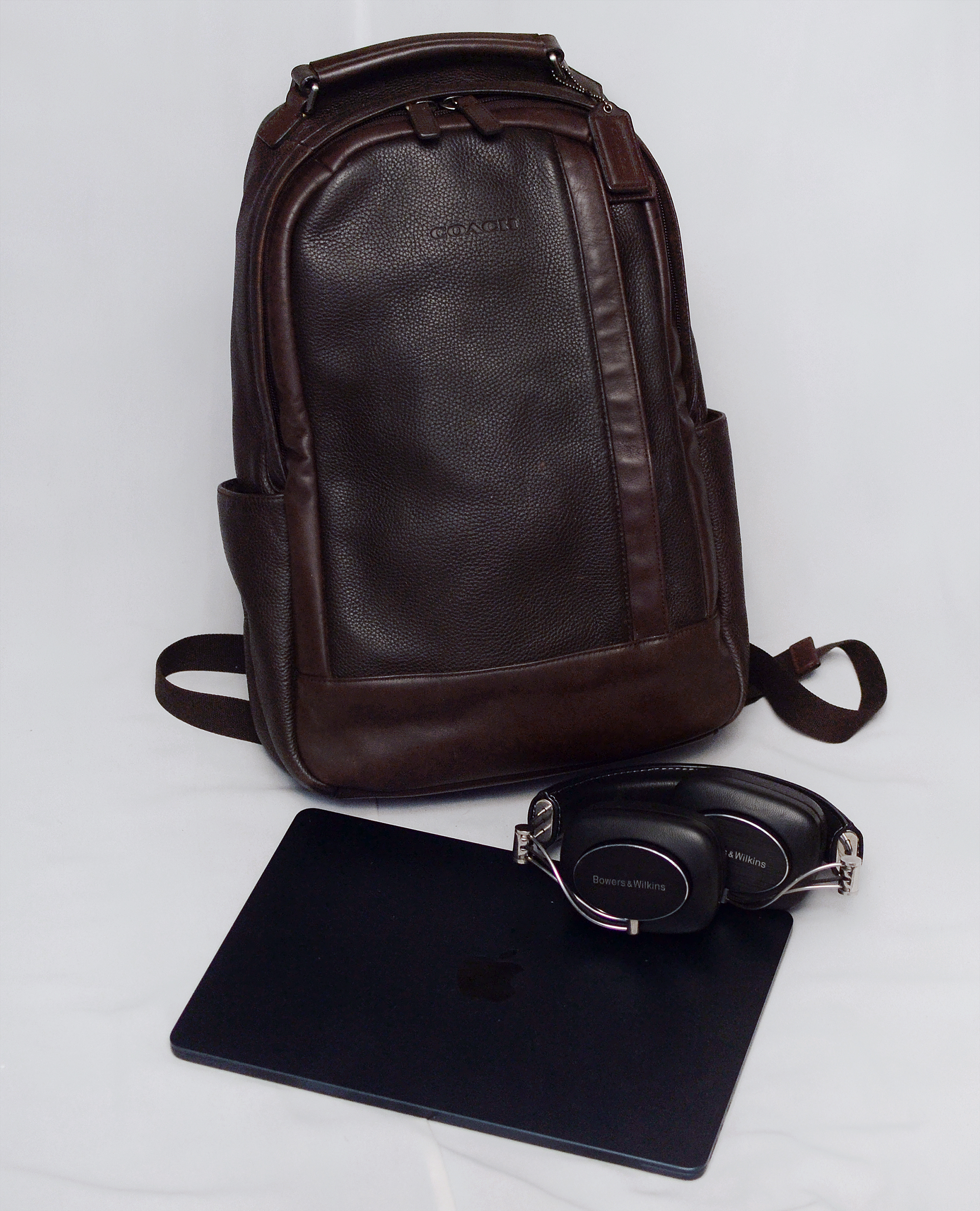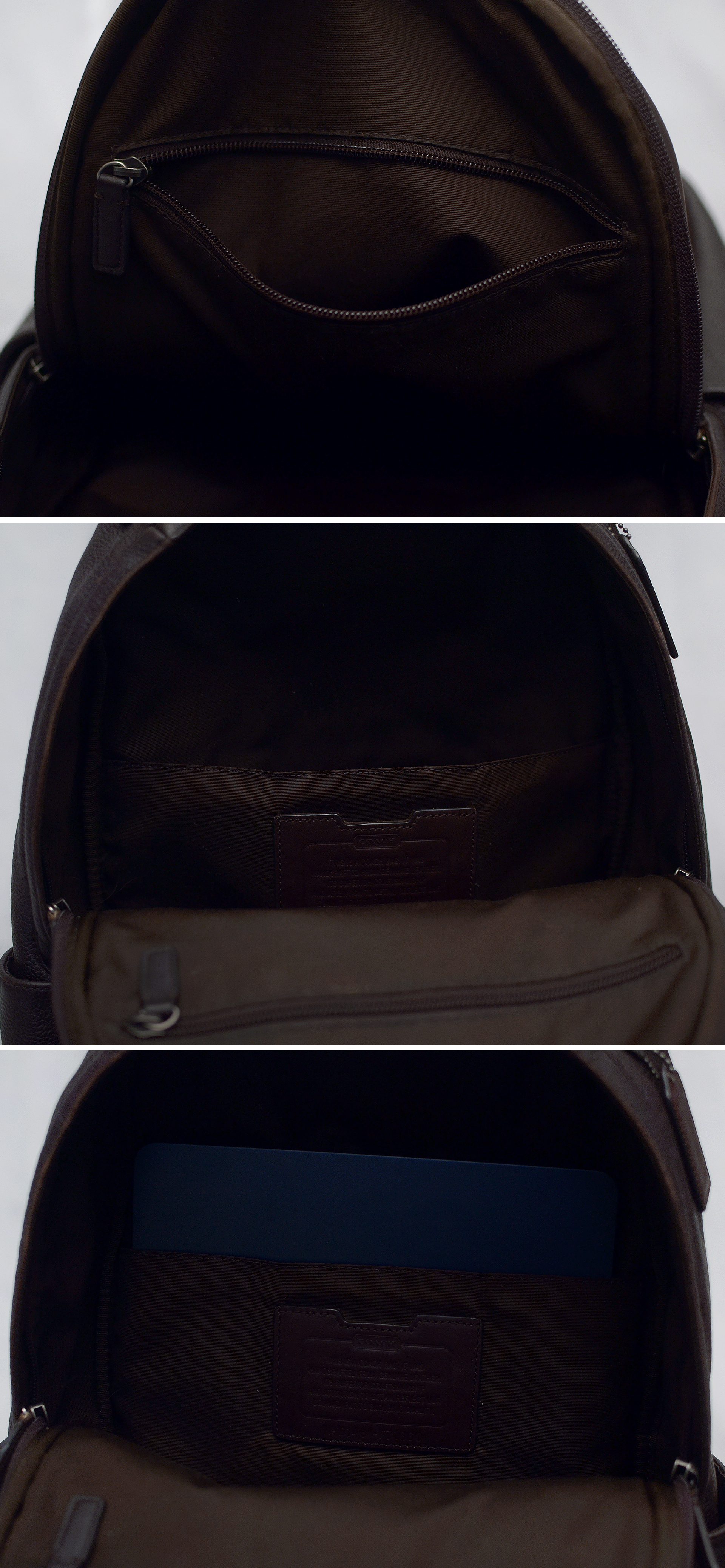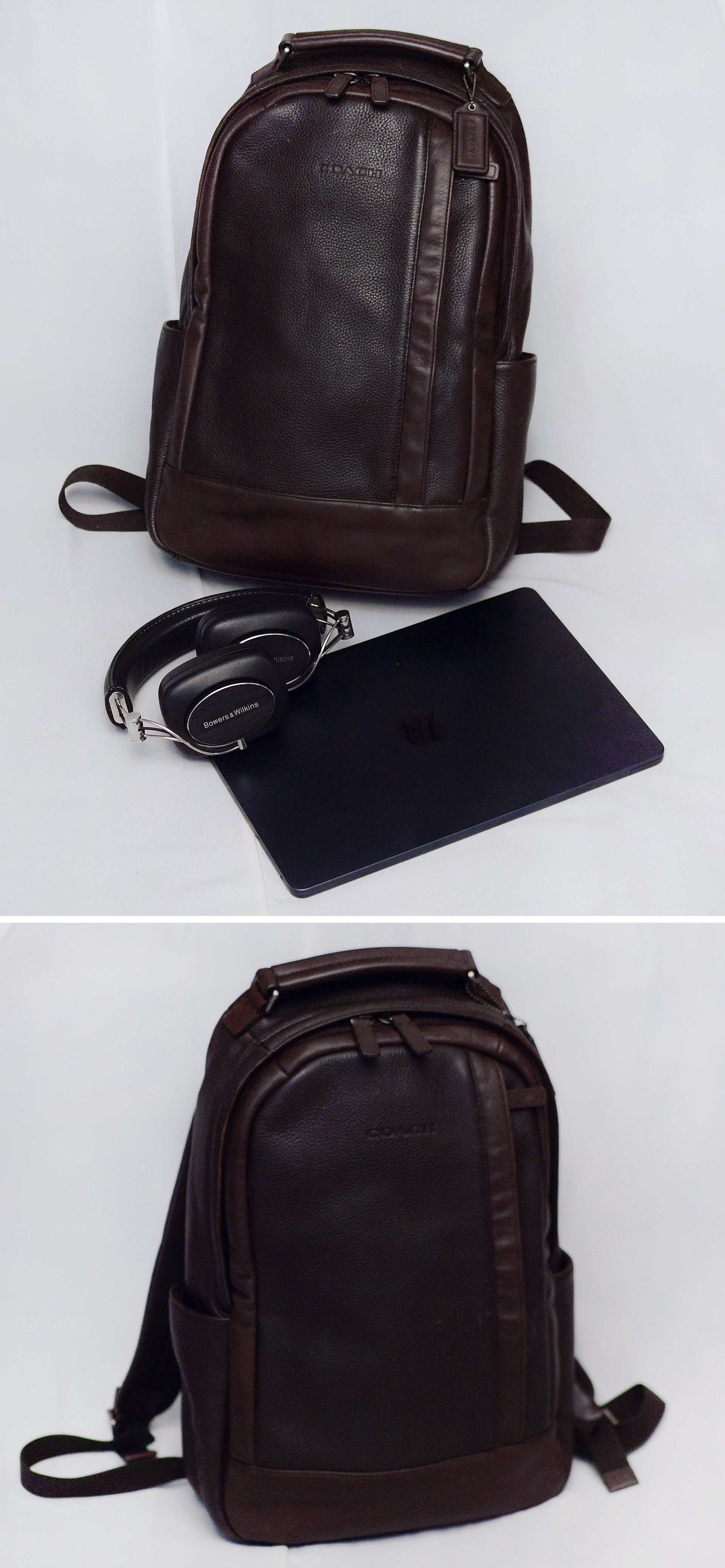 코치 캠든 (Camden) 딥브라운 풀그레인 레더 믹스 핸드크래프트 천연가죽 백팩입니다. 가죽 백팩으로 유명한 코치에서도 대표적인 고급 라인 핸드크래프트 (수작업) 풀레더 라이딩 백팩으로 날렵하고 깔끔한 디자인에 다양한 내.외부 포켓들로 효율적인 수납 가능해 기능성 뛰어난 다용도 백팩입니다. 바디 메인 소재는 도톰한 천연가죽 풀그레인 레더 특유의 가죽 엠보 무늬 돋보이는 다크 브라운 컬러 가죽에 자주 손 닿는 핸들 및 엣지 라이닝 부분에는 톤온톤 컬러의 부드러운 카프스킨 복스레더 소재로 되어있고 어깨끈과 등판 부분에는 패딩 처리된 매쉬 소재로 되어 있어 오래 착용해도 착용감 좋고 쾌적합니다.