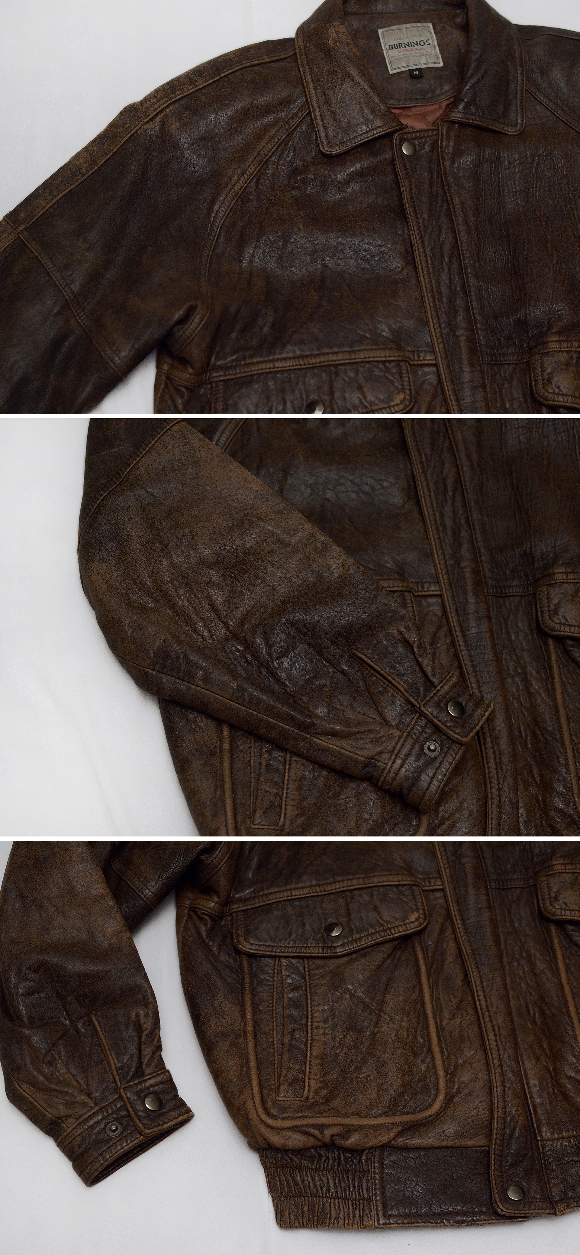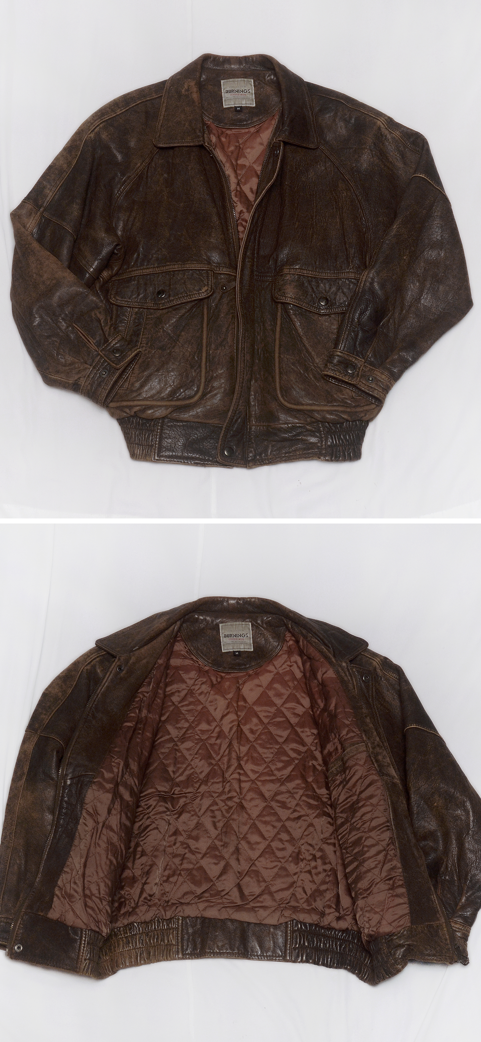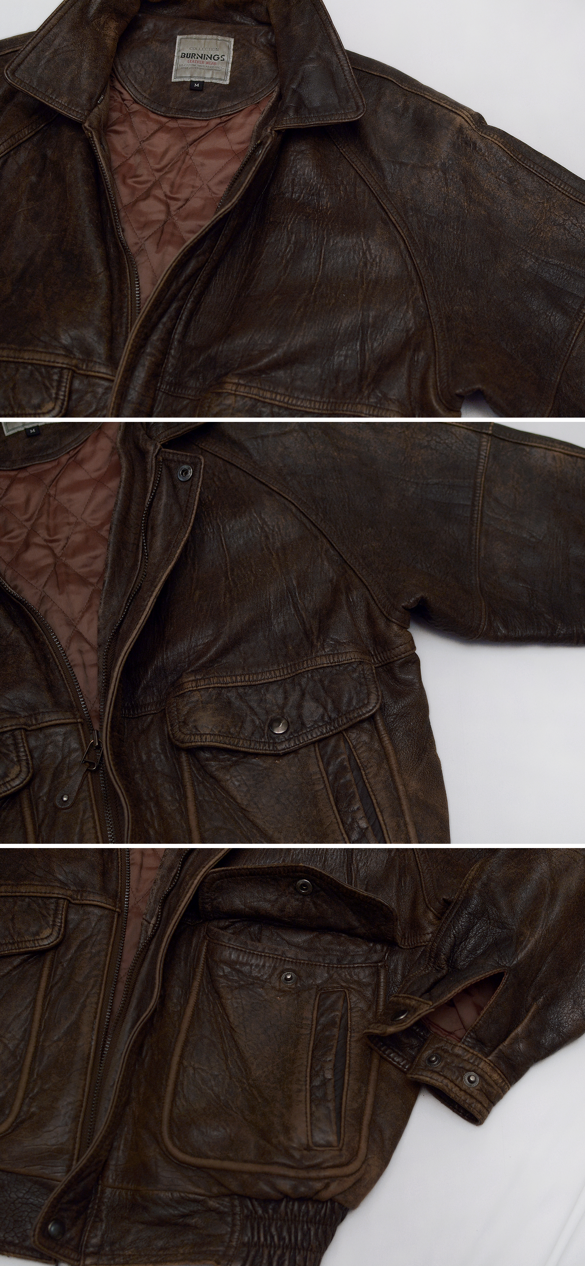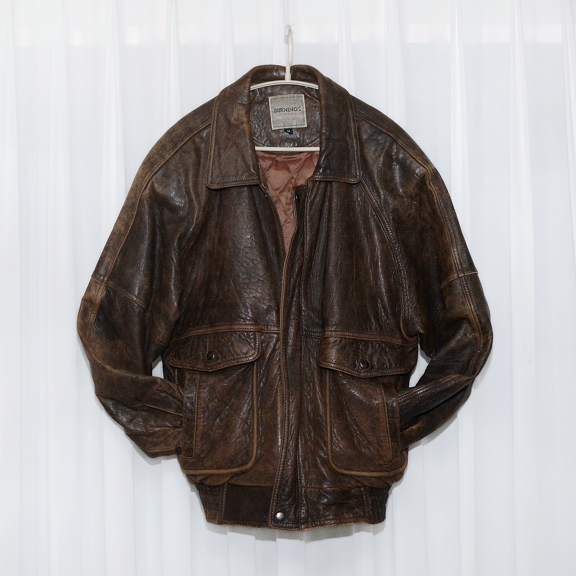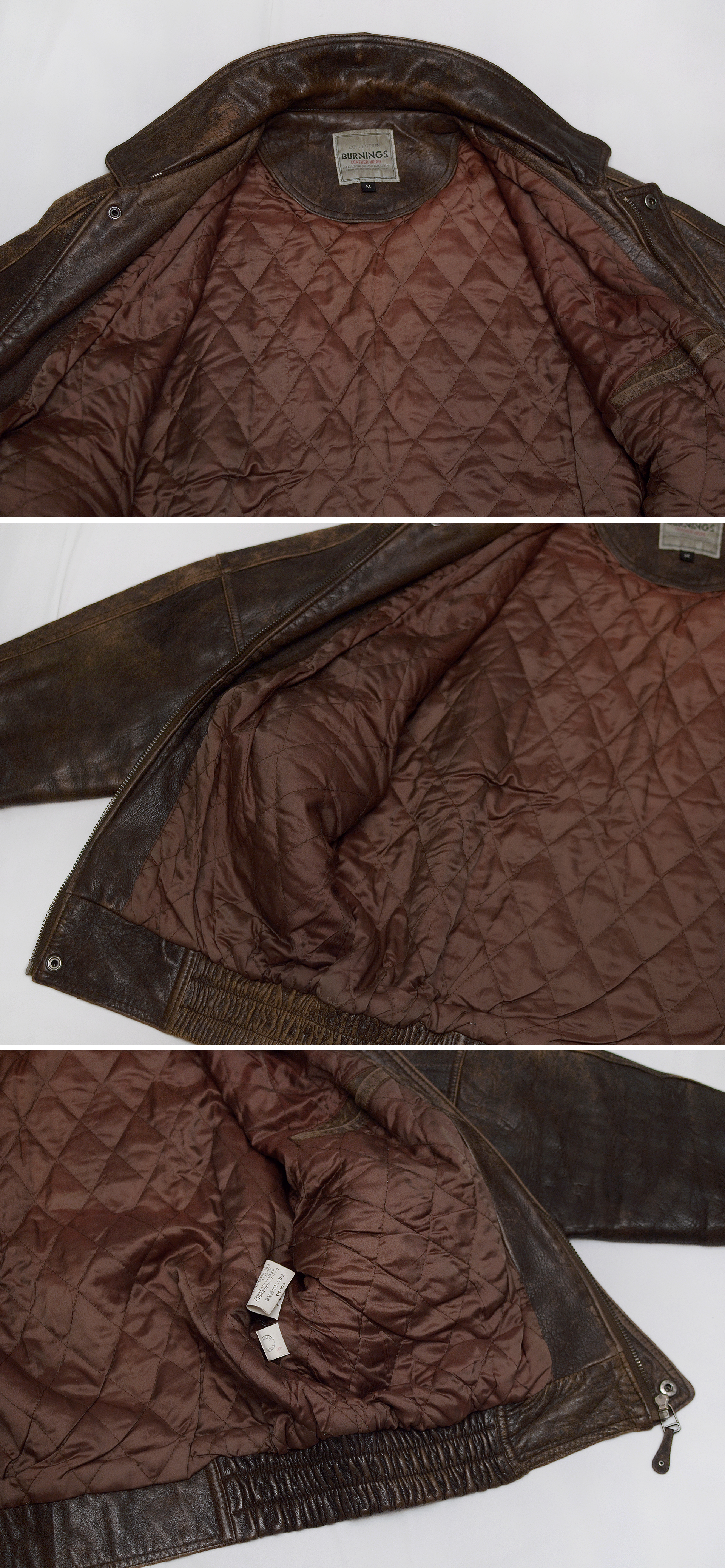 일본 가죽 바이크웨어 전문 브랜드 버닝 컬렉션의 올드 빈티지 워싱 레더 양가죽 쉽스킨 A2 가죽 봄버 자켓입니다. 부드러우면서도 탄탄하고 특유의 멋스러운 가죽 그레인 무늬가 잘 보여지는 양가죽 쉽스킨 소재에 가장 대표적인 가죽 항공자켓인 A-2 플라이트 봄버 자켓의 클래식한 원형을 그대로 잘 살리면서 빈티지한 느낌의 러스틱 워싱 가공으로 더욱 멋스러운 스타일 매우 좋고 90년대 일본 수출용으로 제작된 메이드인 코리아 국내 제조품으로 가죽 품질 및 워싱 컬러감등 만듬새 훌륭합니다. 도톰한 풀레더 소재에 안쪽으로 퀼팅 누빔 패딩 처리되어 있어 보온성 꽤 좋아 봄.가을 간절기 단독 아우터 자켓부터 후드티등과 함께 레이어드해서 겨울철까지 멋스럽게 입기 좋습니다.