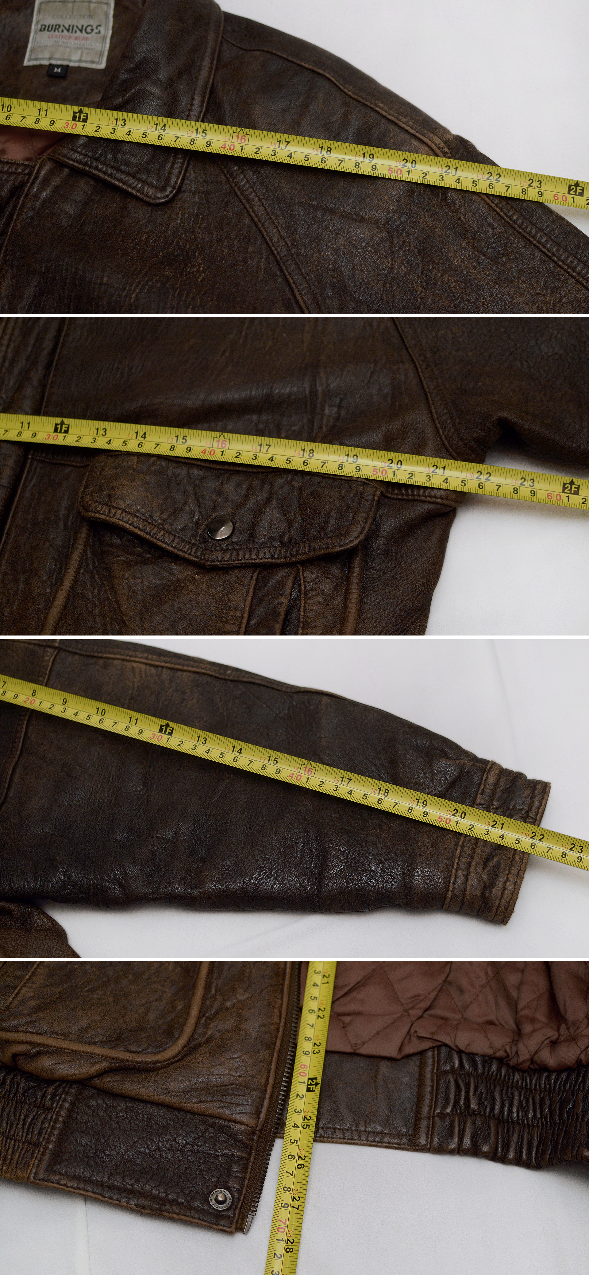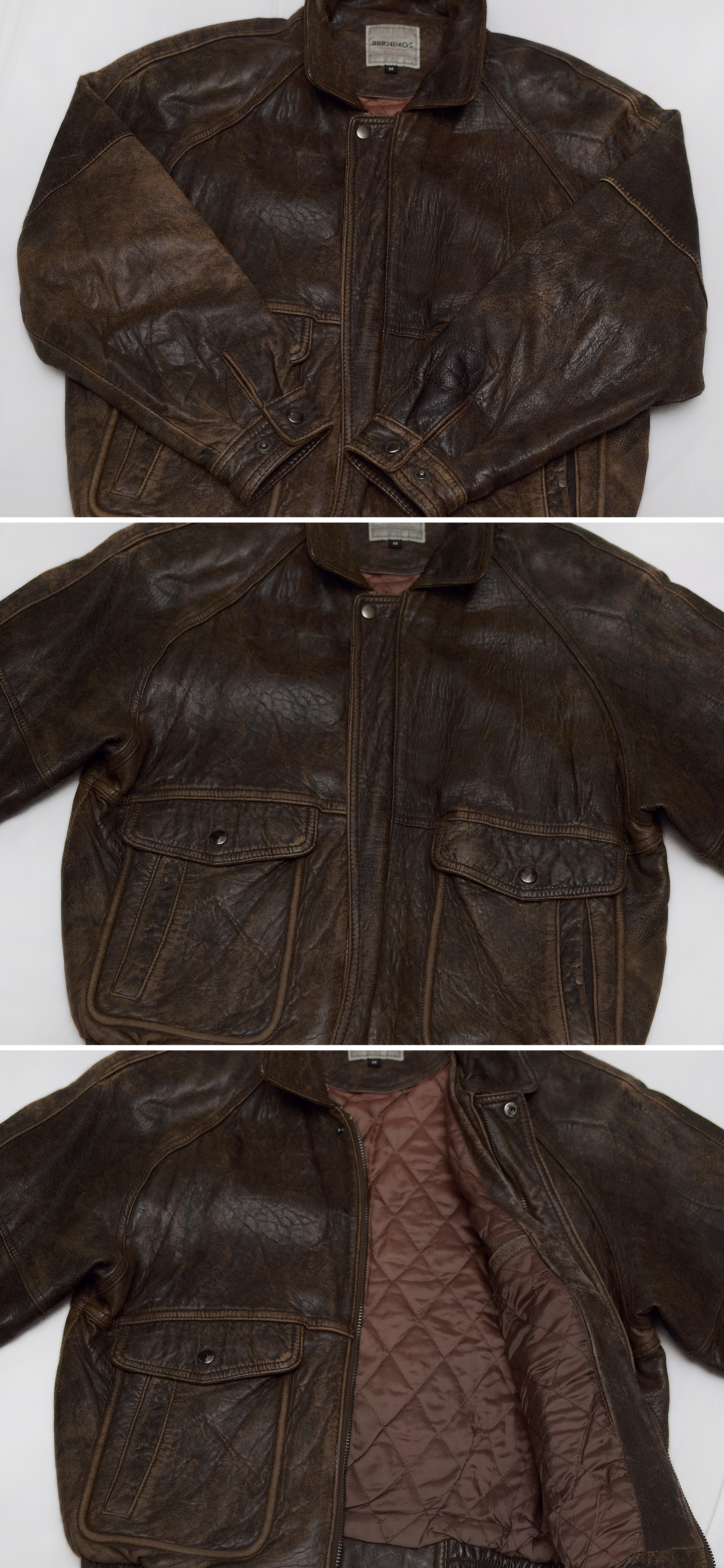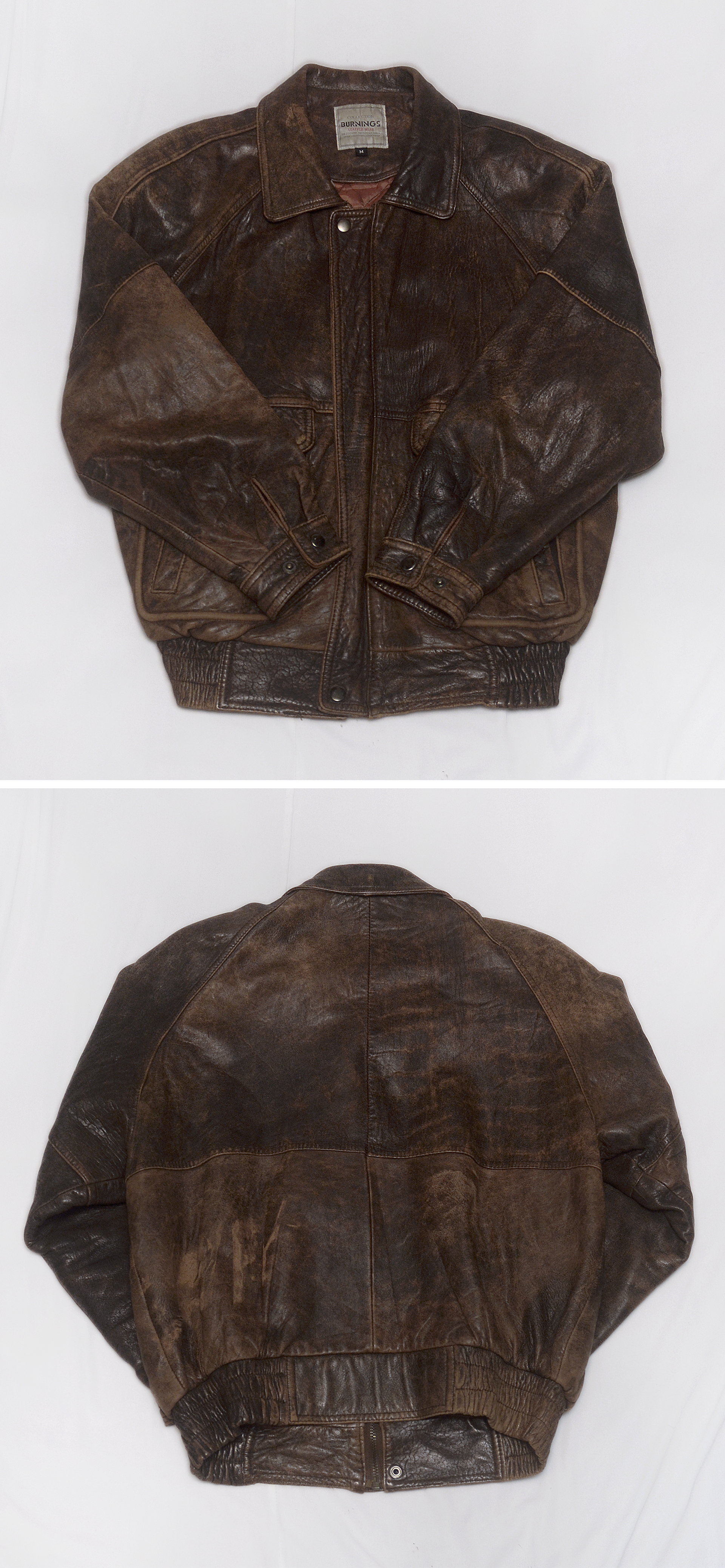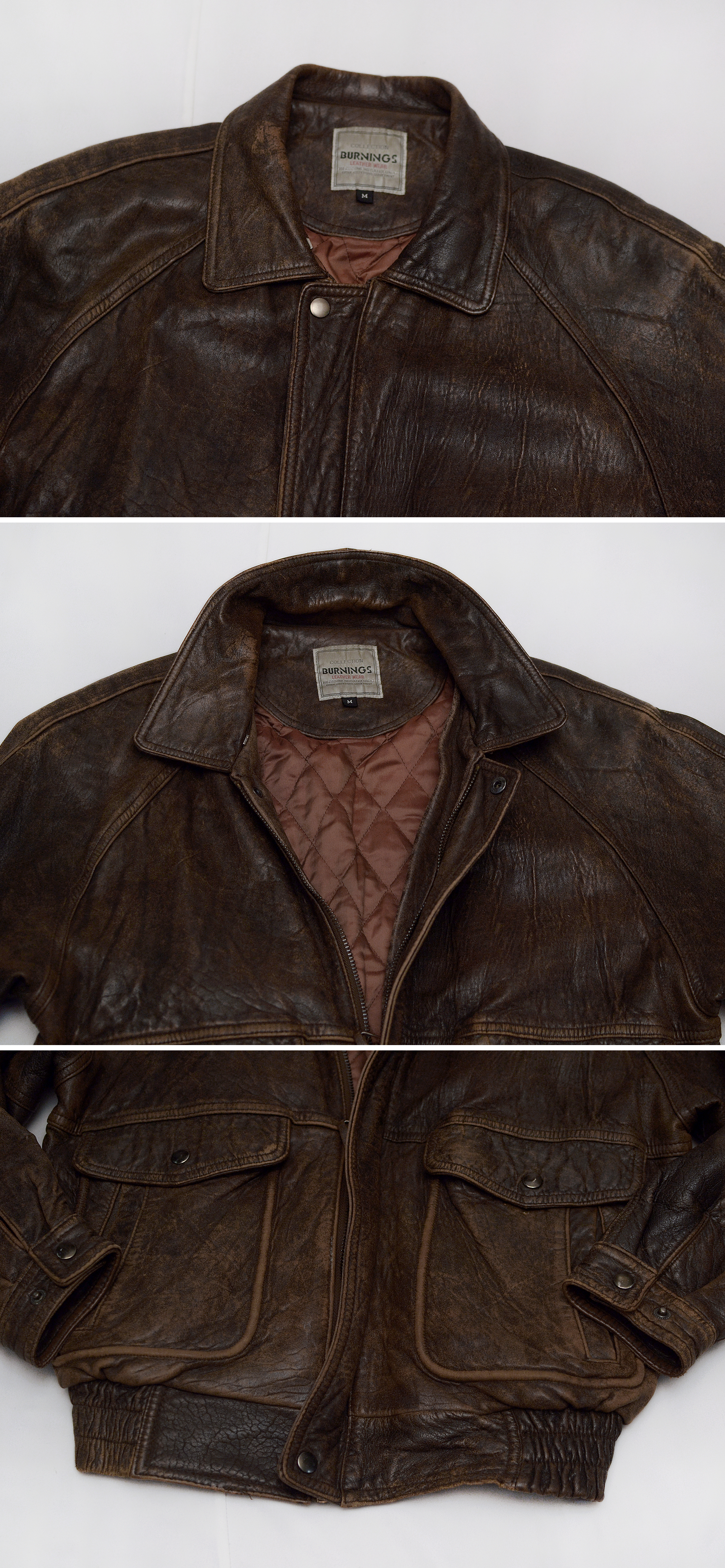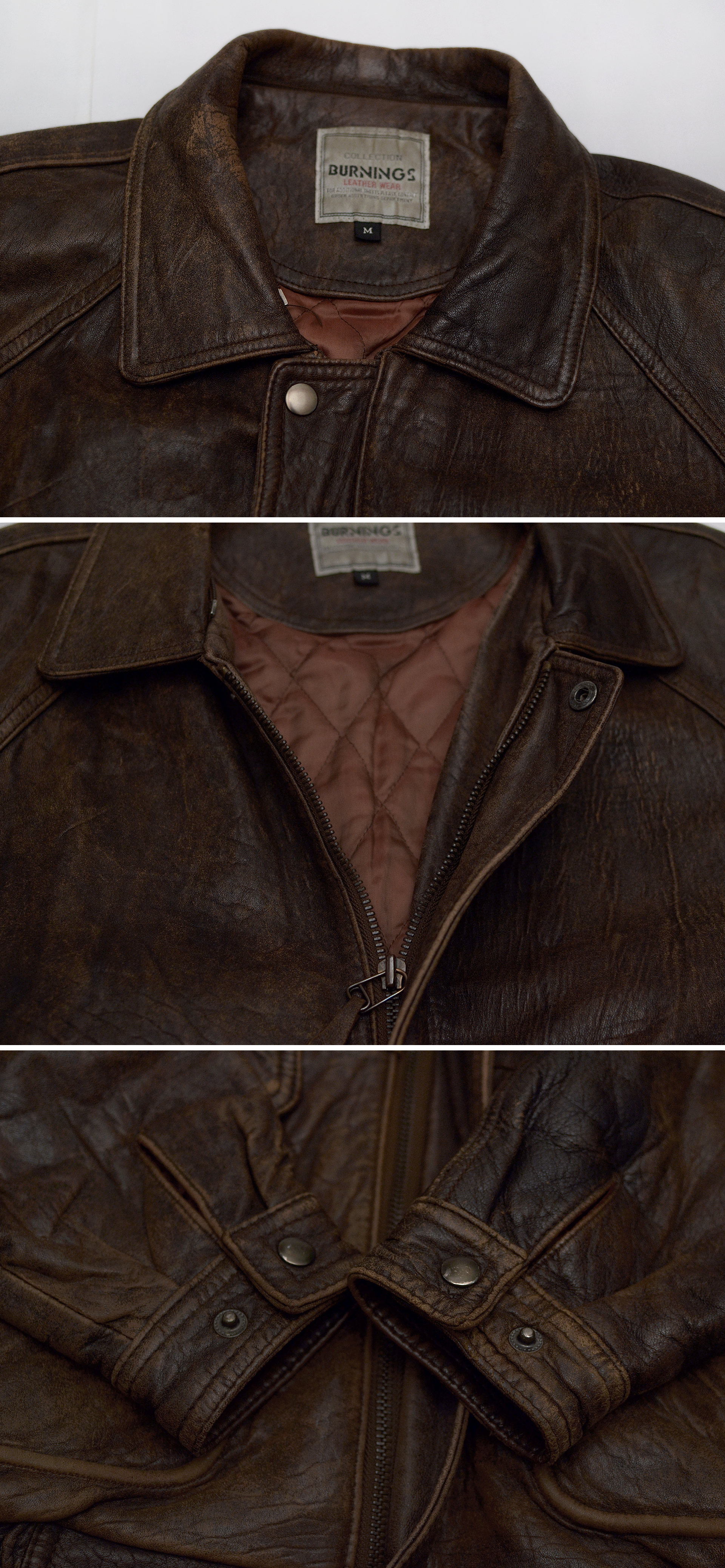 일본 가죽 바이크웨어 전문 브랜드 버닝 컬렉션의 올드 빈티지 워싱 레더 양가죽 쉽스킨 A2 가죽 봄버 자켓입니다. 부드러우면서도 탄탄하고 특유의 멋스러운 가죽 그레인 무늬가 잘 보여지는 양가죽 쉽스킨 소재에 가장 대표적인 가죽 항공자켓인 A-2 플라이트 봄버 자켓의 클래식한 원형을 그대로 잘 살리면서 빈티지한 느낌의 러스틱 워싱 가공으로 더욱 멋스러운 스타일 매우 좋고 90년대 일본 수출용으로 제작된 메이드인 코리아 국내 제조품으로 가죽 품질 및 워싱 컬러감등 만듬새 훌륭합니다. 도톰한 풀레더 소재에 안쪽으로 퀼팅 누빔 패딩 처리되어 있어 보온성 꽤 좋아 봄.가을 간절기 단독 아우터 자켓부터 후드티등과 함께 레이어드해서 겨울철까지 멋스럽게 입기 좋습니다.