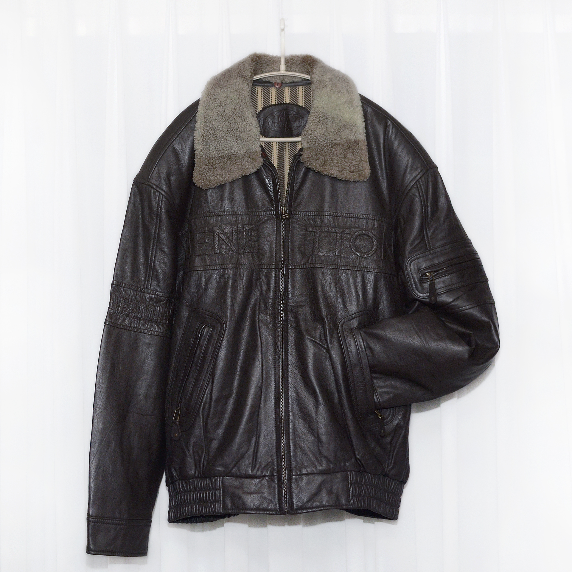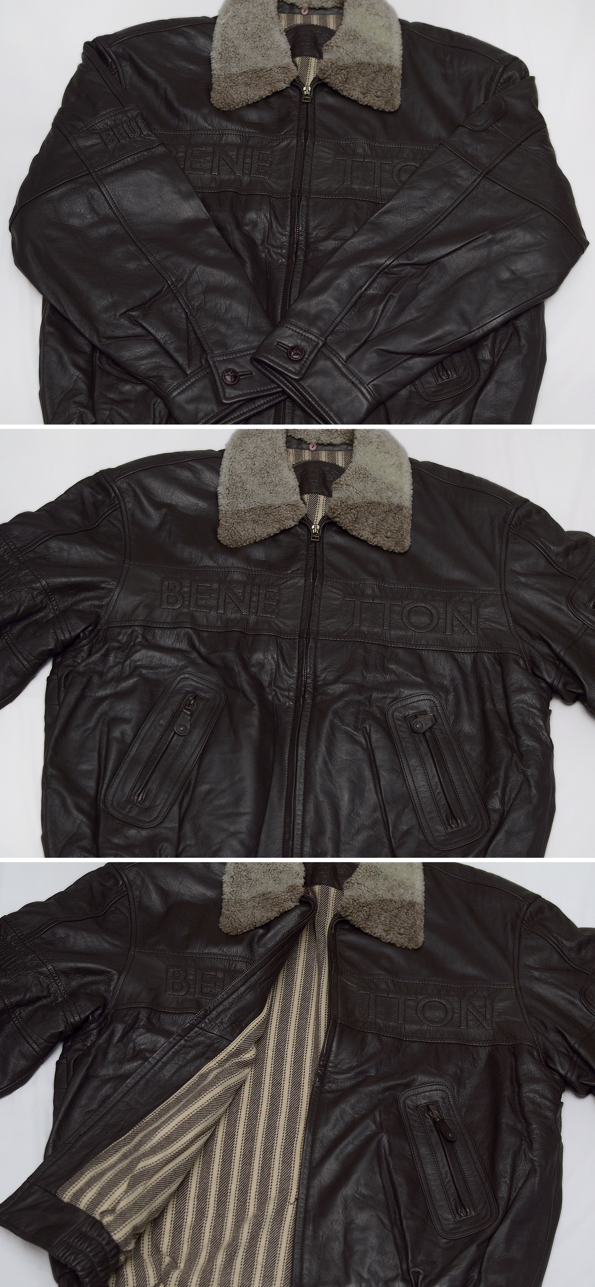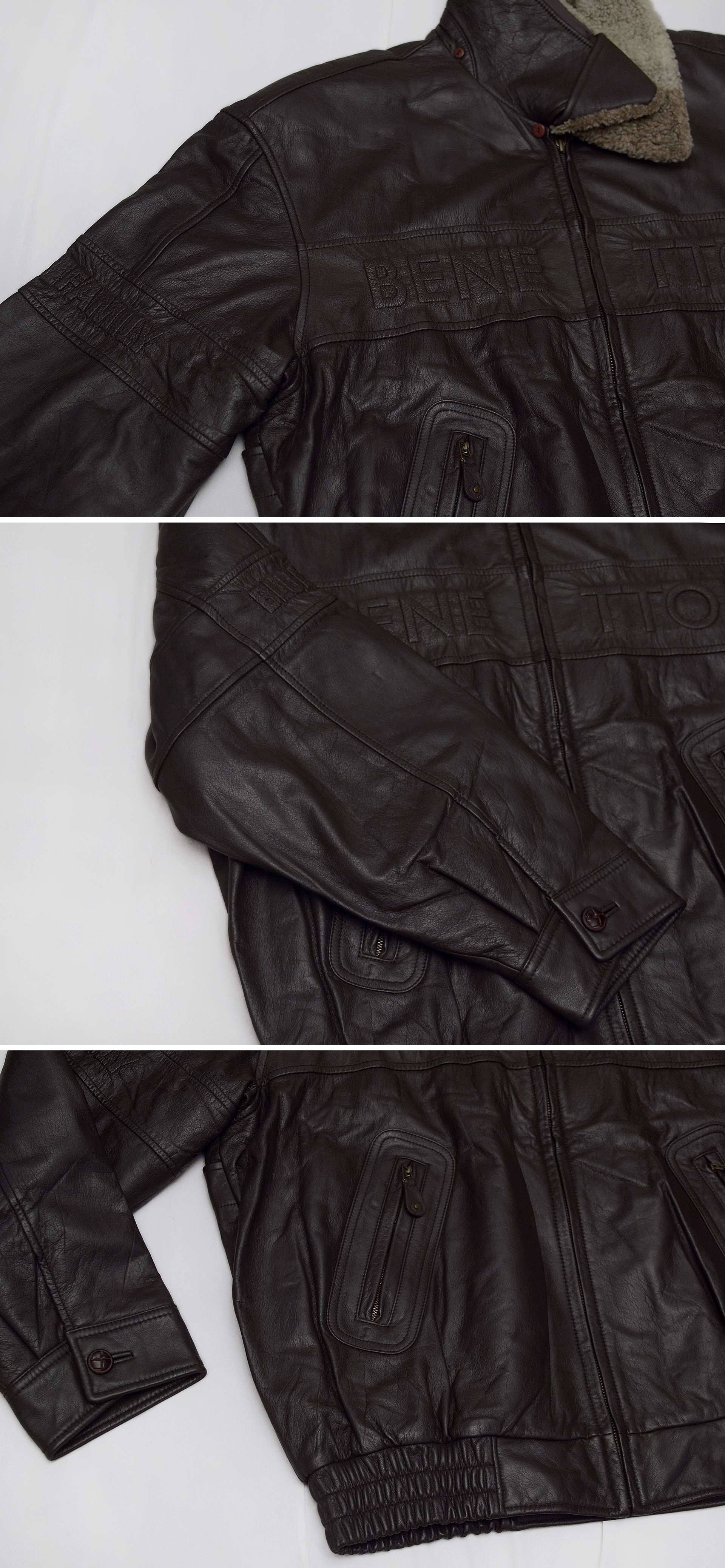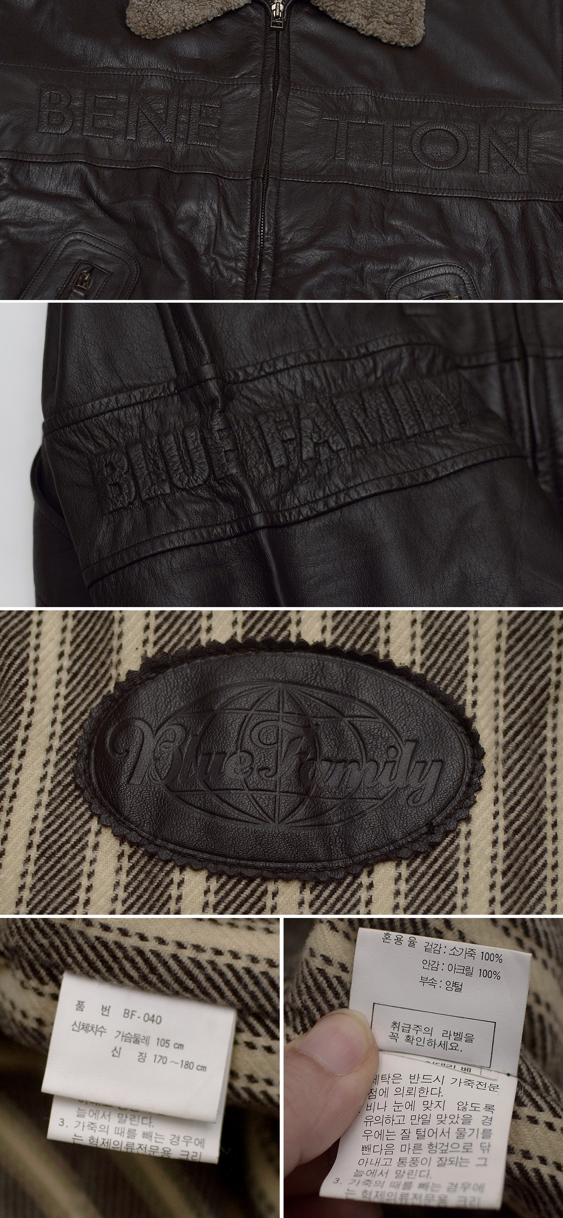 베네통 이태리 메이드 블루패밀리 라인 양털 시어링 카라 레더 봄버 자켓입니다. 90년대 베네통 전성기 시절 만들어진 이태리 메이드 블루패밀리 최고급 라인 국내 정식 수입품으로 매우 희귀한 레어템 입니다. 클래식한 A-2 레더 봄버 플라이트 자켓 스타일을 기반으로 베네통 특유의 유니크한 포인트 멋스러운 8-90년대 레트로한 오버핏하고 루즈한 스타일 여전히 너무나 멋스럽습니다. 짙은 다크초코 컬러에 부드러운 촉감의 최고급 카프스킨 레더 (송아지가죽) 소재에 탈착 가능한 천연 양털 시어링 카라 넉넉한 폼에 넓은 어깨라인 드롭숄더 타입이면서 허리 밴딩으로 라인 깔끔하게 딱 잡아줘 그야말로 남성적 테스토스테론이 흘러넘치는 듯한 멋스러움 훌륭합니다.
