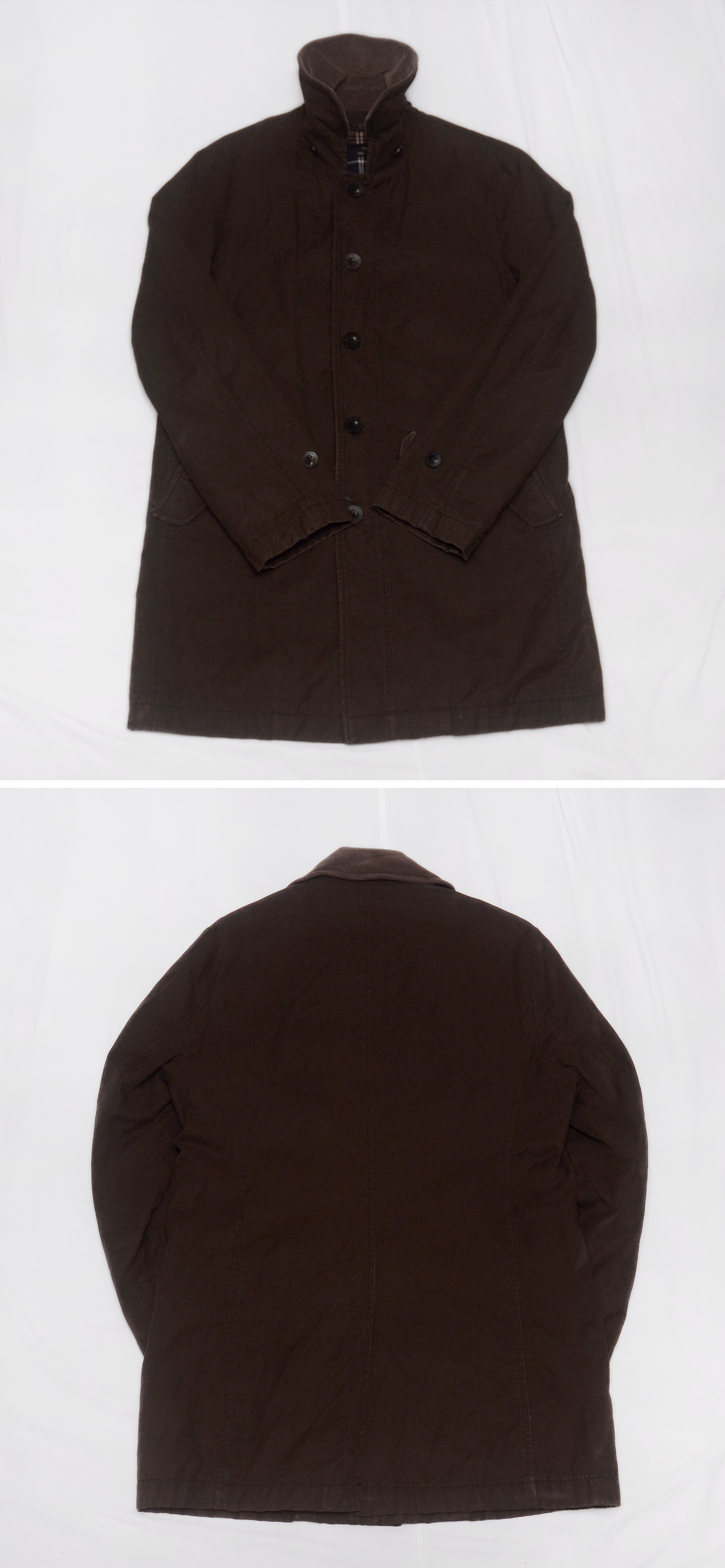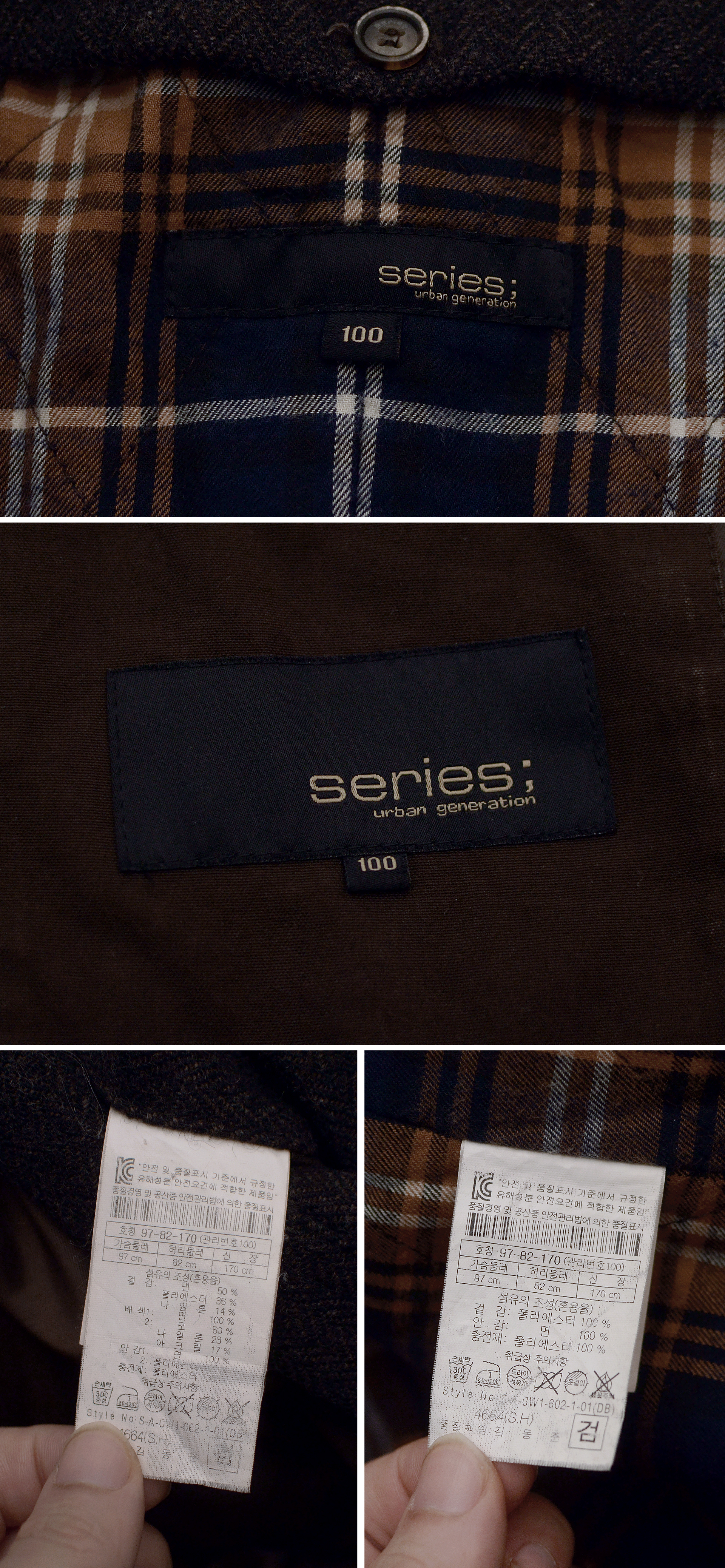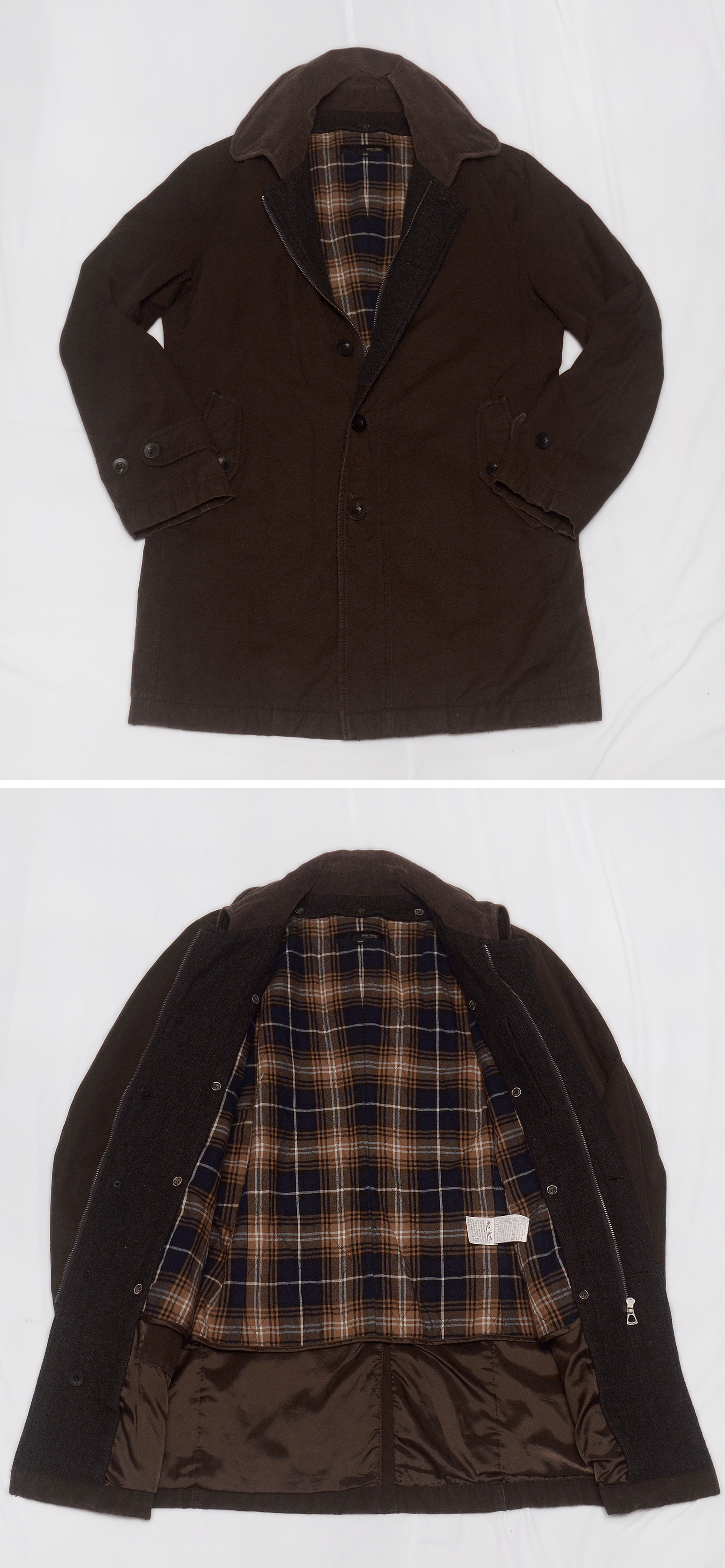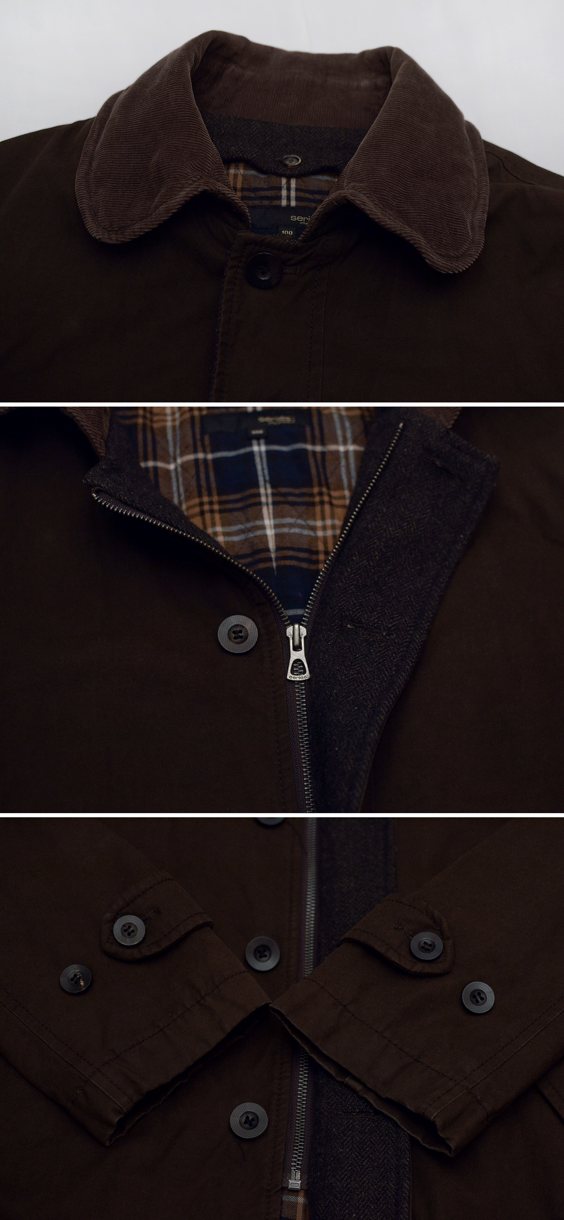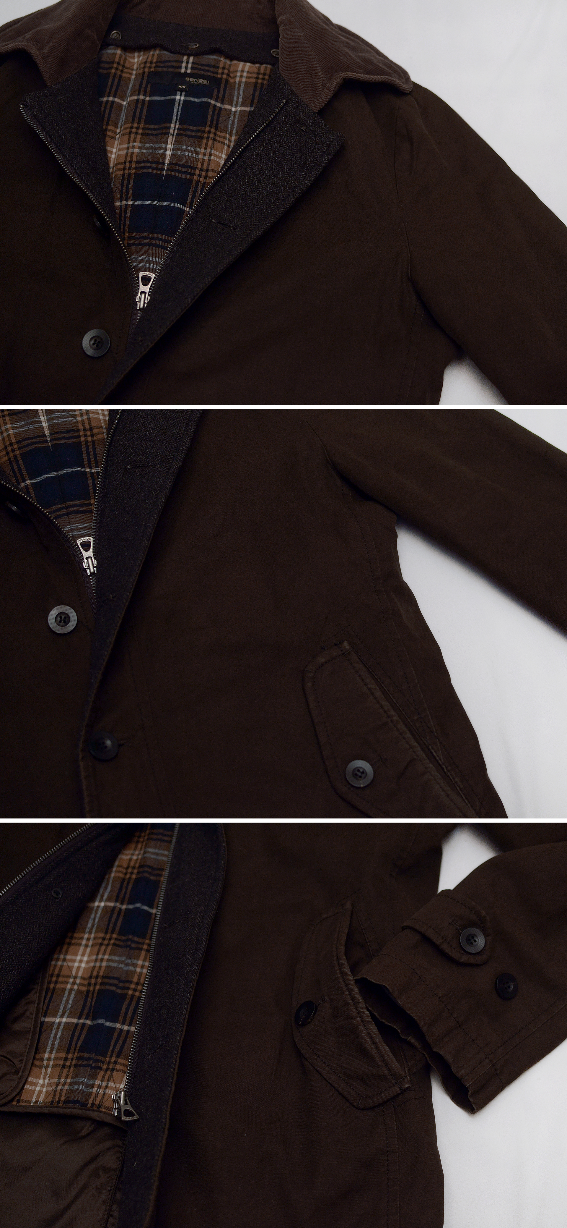 코오롱의 클래식 아메카지 어반스타일 고급형 남성복 브랜드 시리즈의 투인원 타입 헌팅 코트 자켓입니다. 시리즈 브랜드 특유의 멋스러운 빈티지 러스틱한 아메카지 느낌의 꾸민듯 꾸미지 않은 남성적인 멋스러운 브랜드 아이덴티티를 잘 보여주는 헌팅 자켓스타일 코트자켓으로 피그먼트 워싱된 톤다운된 묵직한 컬러감의 우드브라운톤 탄탄한 트윌코튼 소재 겉감에 지퍼라인 안쪽으로 울헤링본 덧댐 배색이나 내부에 와이어 들어있어 멋스럽게 모양 잡을 수 있는 코듀로이 카라 클래식한 체크무늬 내부 안감등으로 유행 상관없이 시대를 초월하는 멋스러운 스타일 매우 좋습니다. 내부 탈착형 라이너 있어 봄.가을 간절기부터 초겨울 정도까지 날씨에 따라 두루 활용하기 좋습니다.