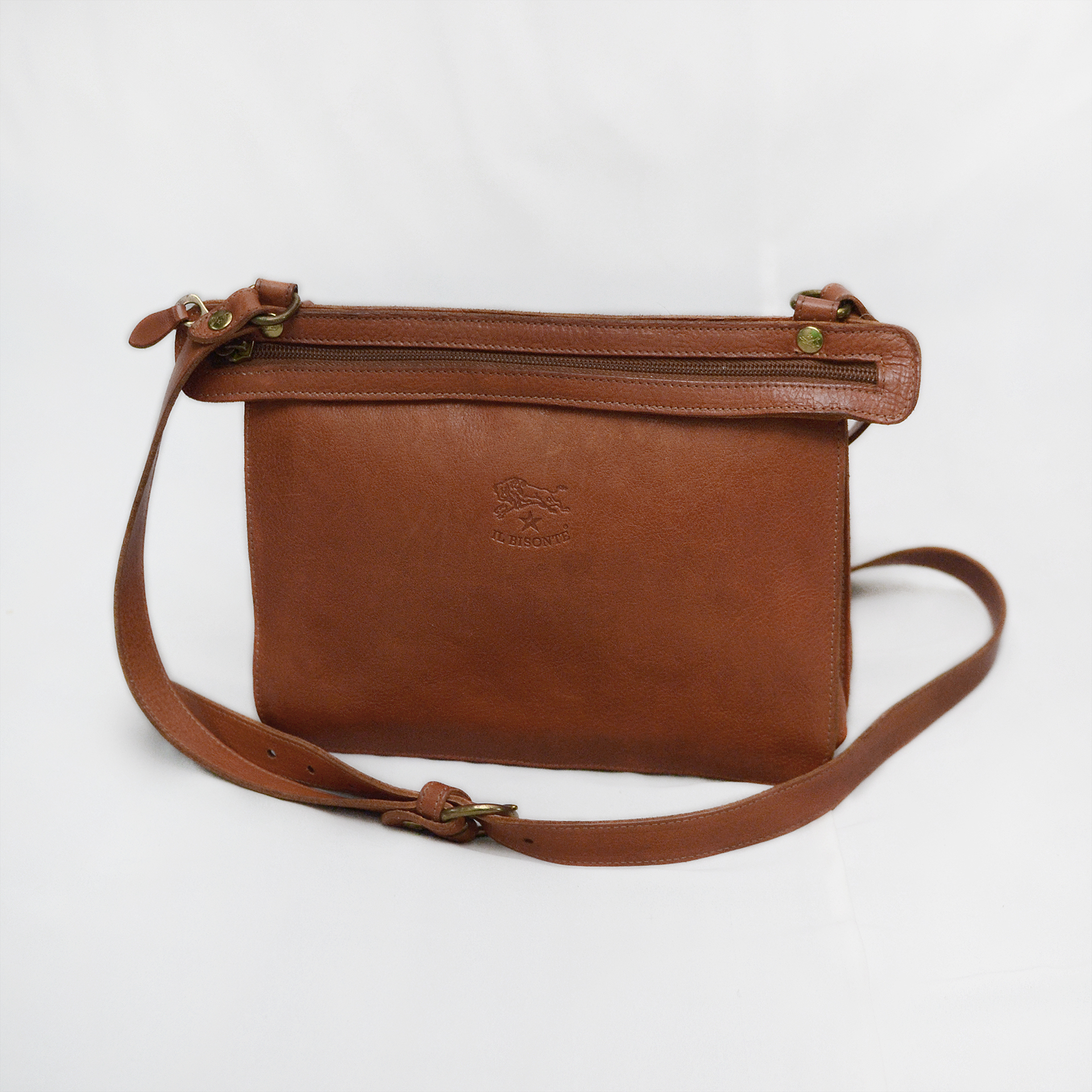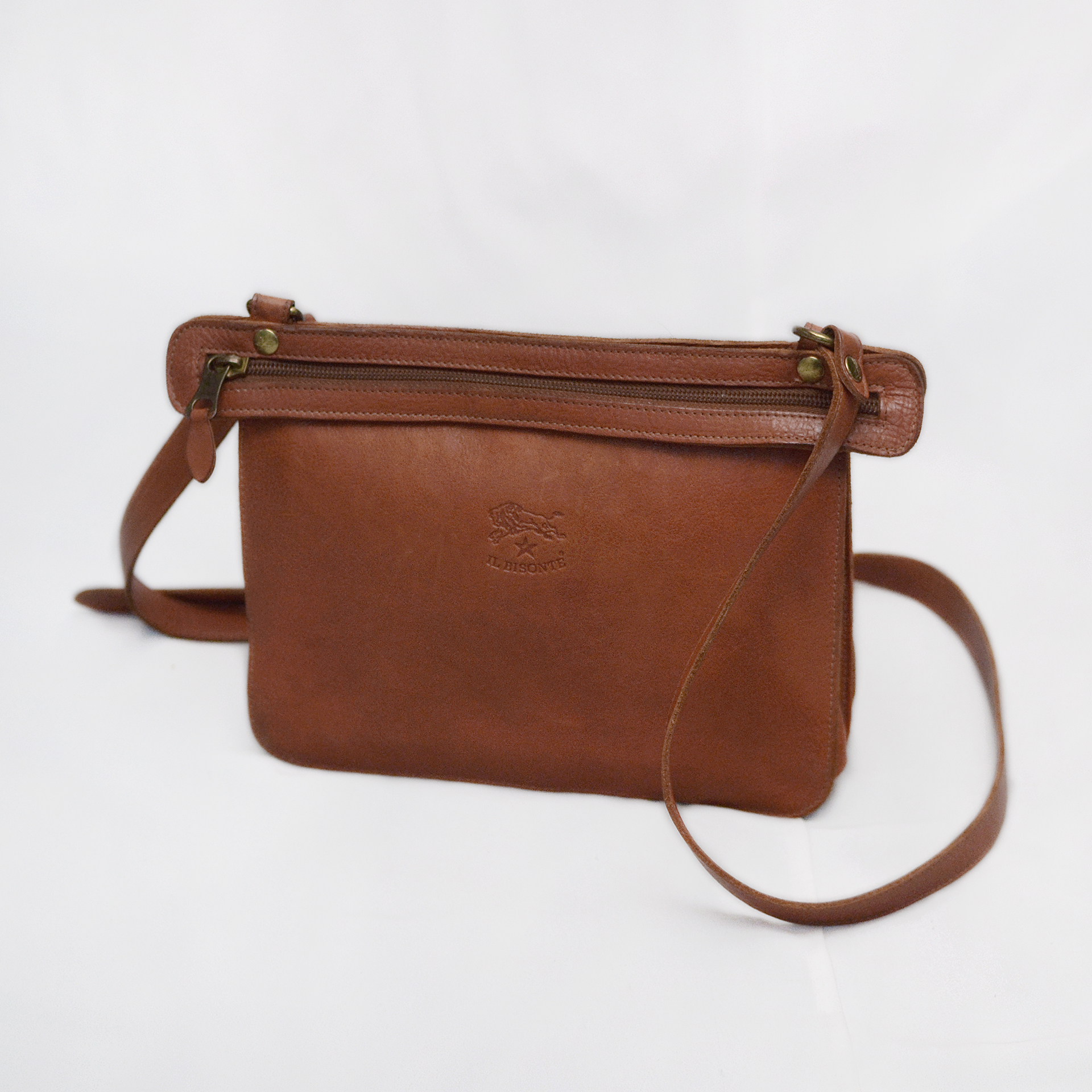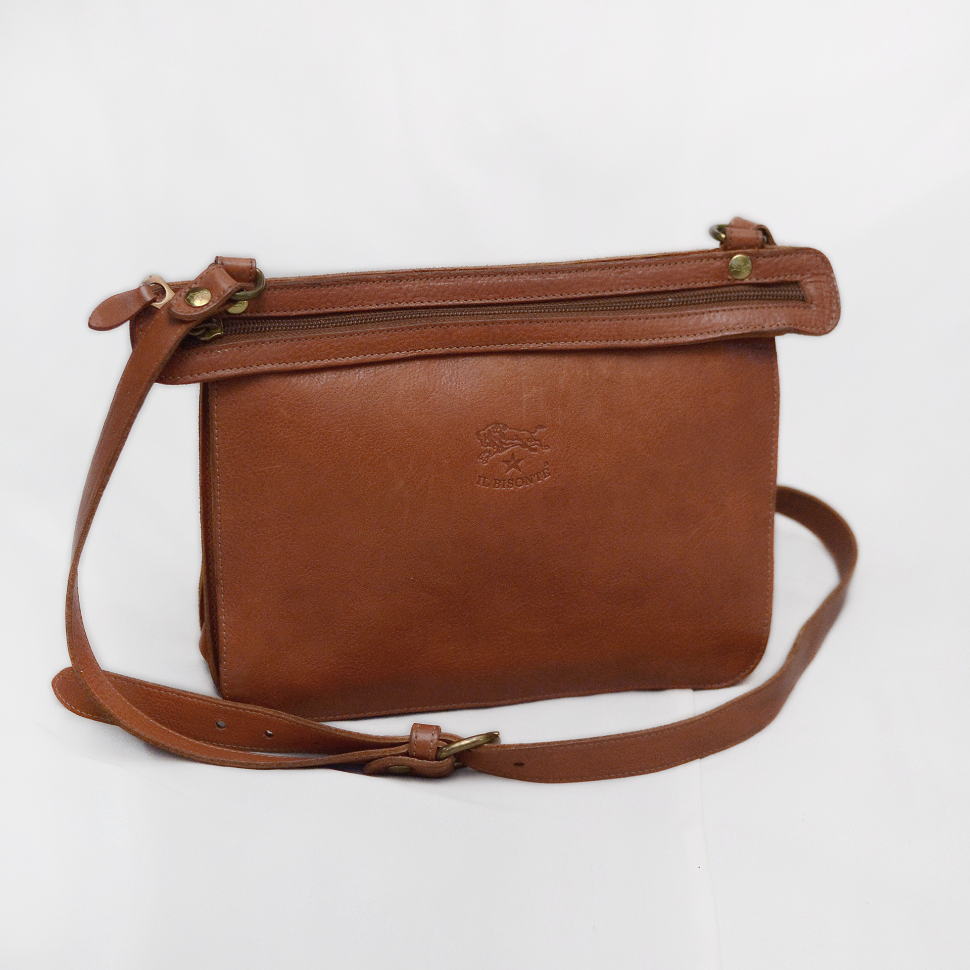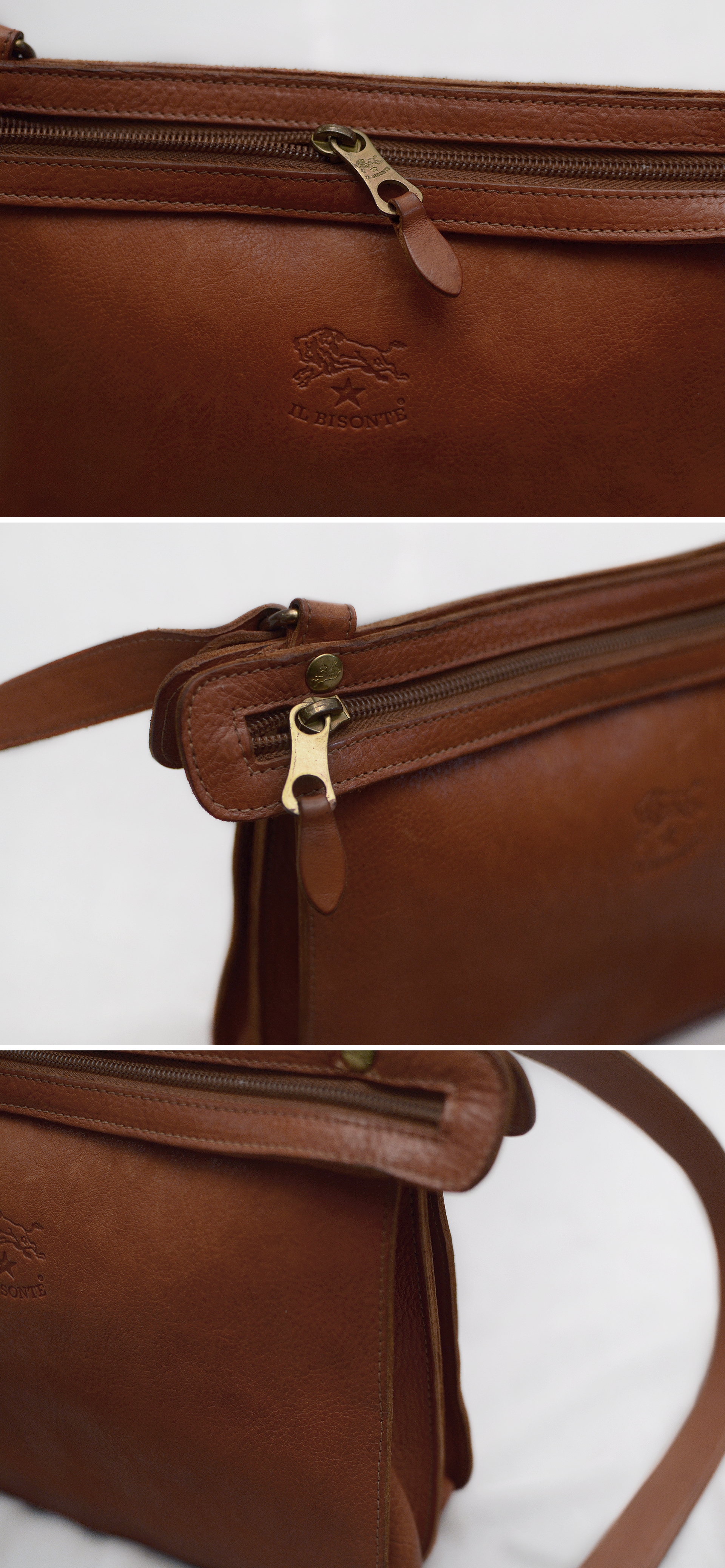 일비종떼 (IL BISONTE) 로니 이탈리안 바게타 풀그레인 레더 더블지퍼 트리오 포켓 가죽 숄더.크로스백 당연히 정품