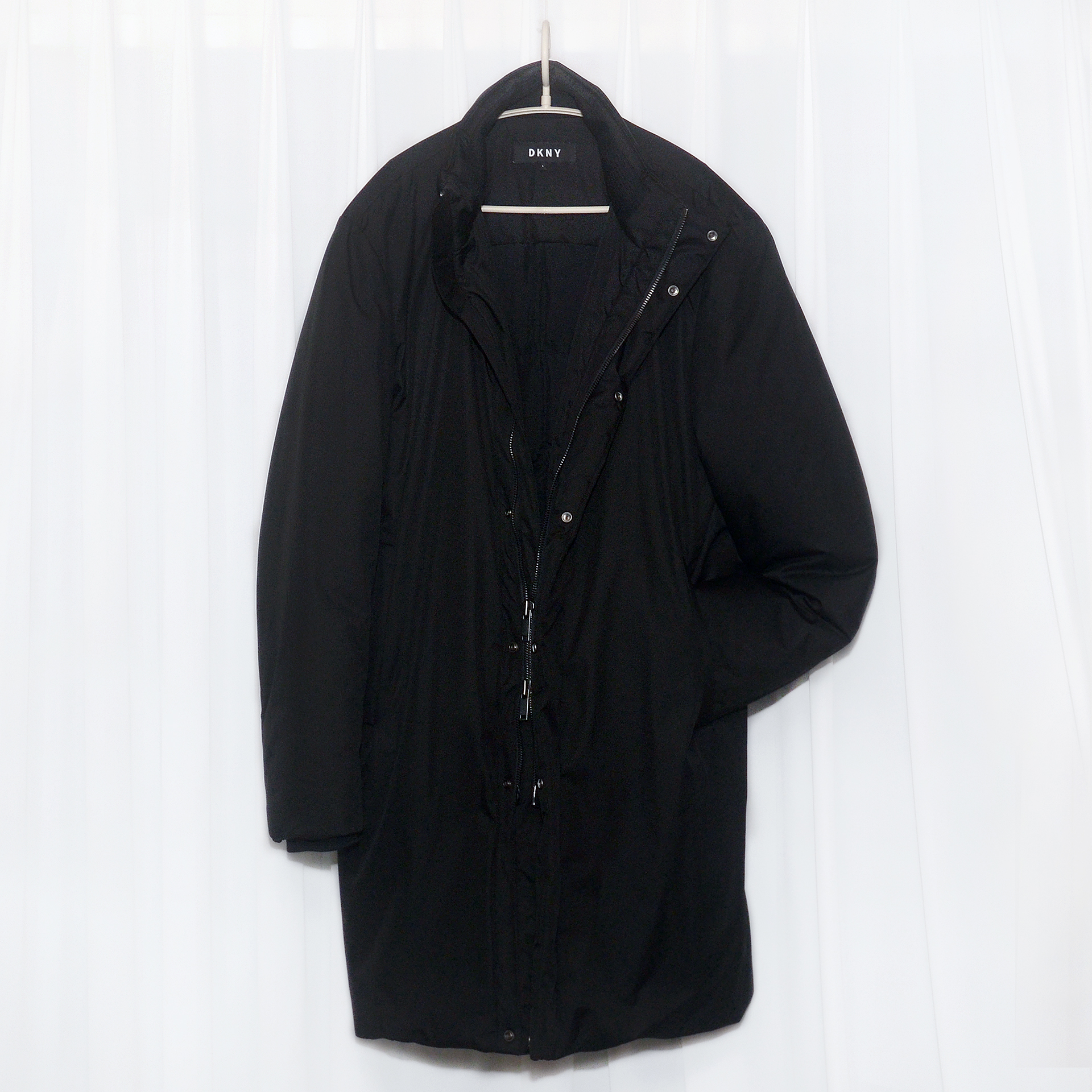모던 클래식 스타일을 대표하는 명품 하이 컨템포러리 브랜드 DKNY 도나카란 뉴욕의 헤비 구스다운 패딩 코트 입니다. DKNY 다운 불필요한 장식요소 거의 없는 깔끔한 미니멀리즘 스타일에 1893년부터 150여년 역사의 고기능성 고밀로 원단을 전문으로 하는 이태리 리몬타 (LIMONTA) 사의 초경량 원단을 사용한 헤비 구스다운 롱코트 자켓으로 왠만한 전문 아웃도어 브랜드 대장급 롱패딩 이상으로 꽉 채워져 있는 구스다운 우모량으로 한겨울 한파에도 마치 침낭을 두르고 있는 듯한 느낌마저 들 정도로 압도적으로 따듯하고 포근하면서도 무게감 거의 느껴지지 않아 착용감 매우 뛰어나며 깔끔한 올블랙 컬러로 겨울철 어떤 착장이나 상황에도 두루 편하게 입기 좋습니다.