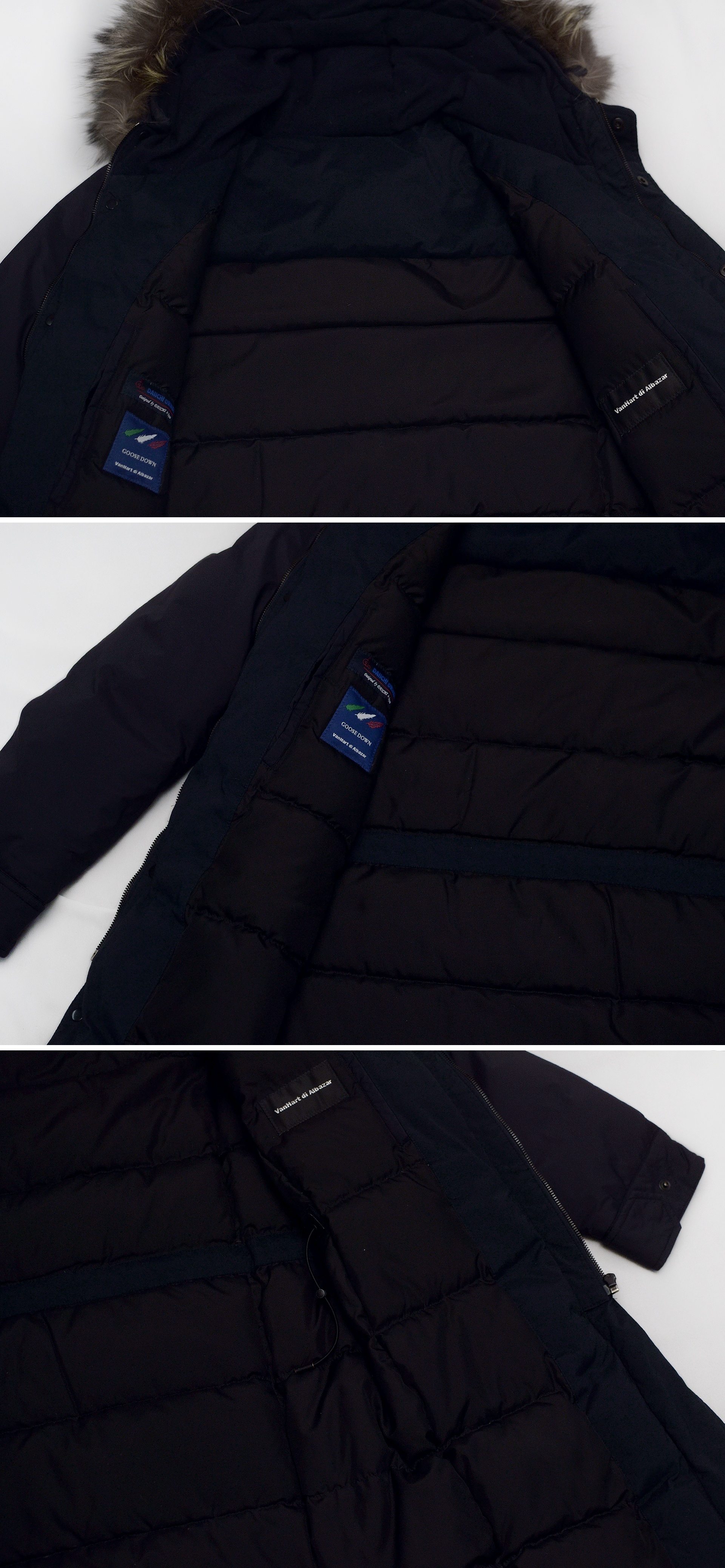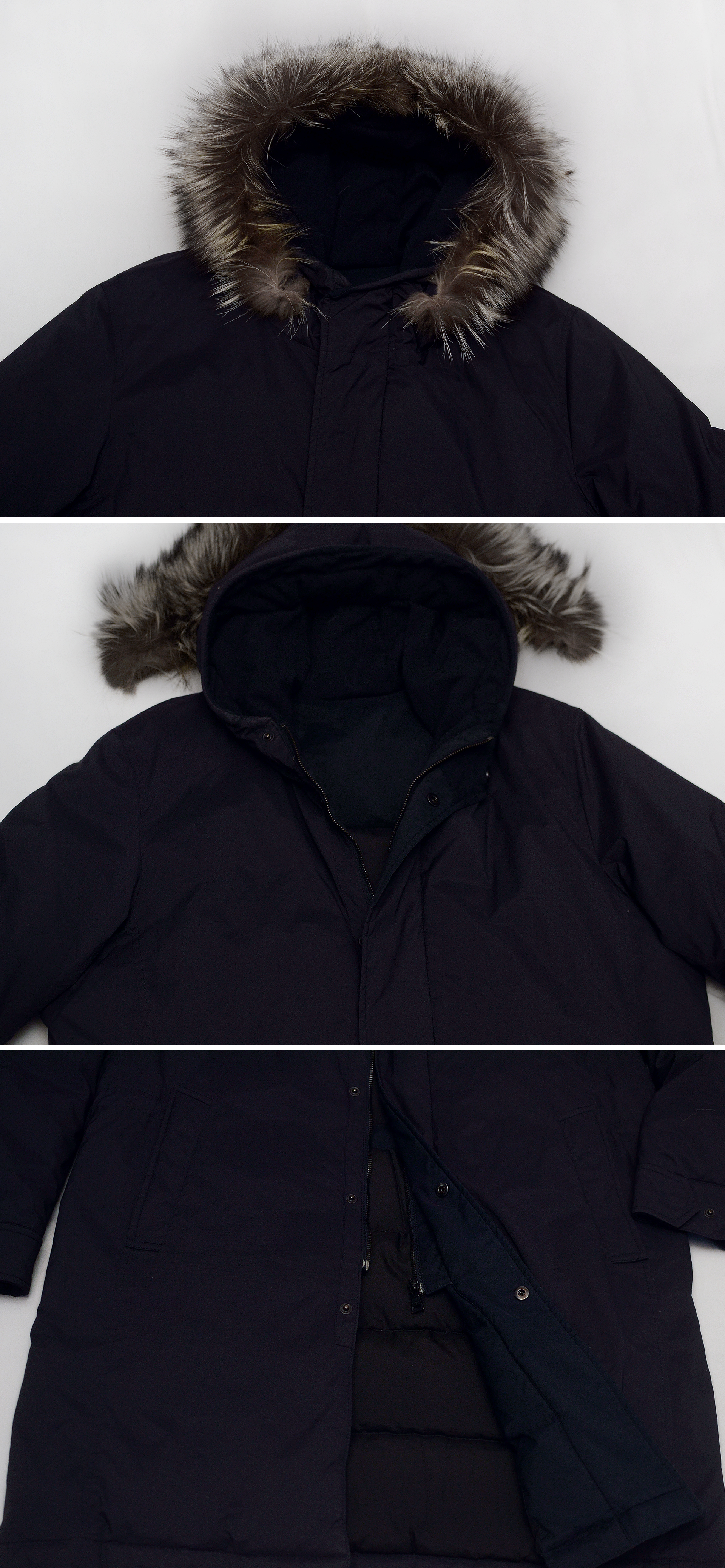 반하트 디 알바자 최고급 컬렉션 라인 폭스퍼 후드 구스다운 패딩 코트자켓입니다. 고급스럽고 세련된 이탈리안 모던 클래식 스타일을 지향하는 고급형 컨템포러리 브랜드 반하트 브랜드에서도 가장 최상위 럭셔리 레벨의 컬렉션 라인으로 출시한 겨울철 패딩 코트자켓으로 반하트다운 블랙에 가까운 짙은 다크 네이비 컬러의 심플하고 깔끔하게 떨어지는 모던 클래식하면서도 세련된 현대적 감성의 후디드 다운 패딩 코트에 히든타입 버튼.지퍼와 탈착 가능한 천연모피 폭스퍼 후드 장식등으로 정장 수트위에 걸쳐입는 포멀한 스타일에 잘 어울리는 멋스럽고 우아한 스타일과 뛰어난 방한성에 전세계 낙하산.패러글라이딩등에 사용되는 초경량 나일론.폴리에스터 기능성 특수소재 시장의 70%를 차지하는 고밀도 소재 전문기업인 다이이찌 오리모노의 나일론.폴리우레탄 디크로 원단을 사용해 우모량 풍성한 헤비급 구스다운 코트이면서도 실착용시 무게감 거의 느껴지지 않을 만큼 극도의 경량감 놀라울만큼 기분좋은 착용감 매우 좋습니다.